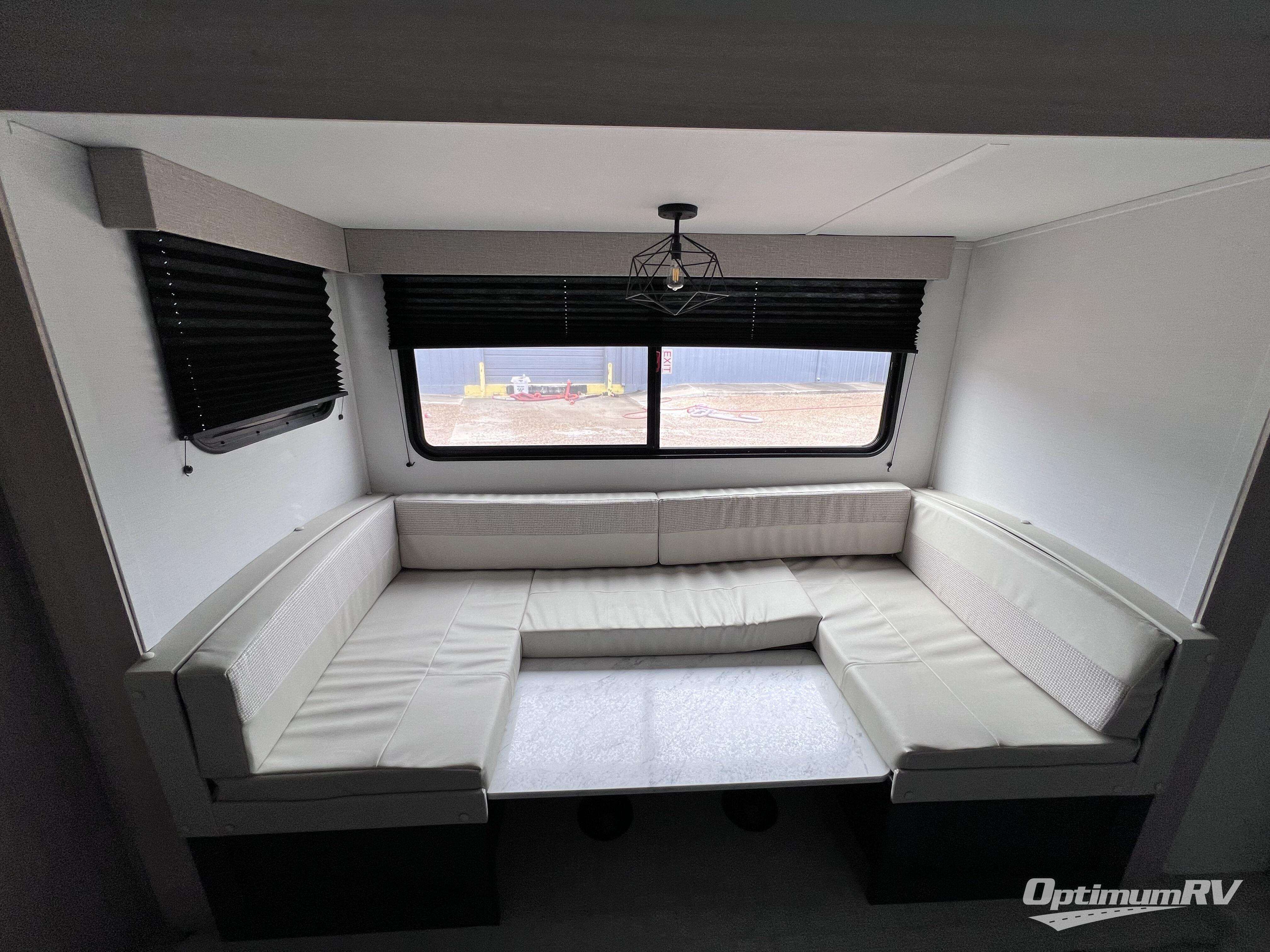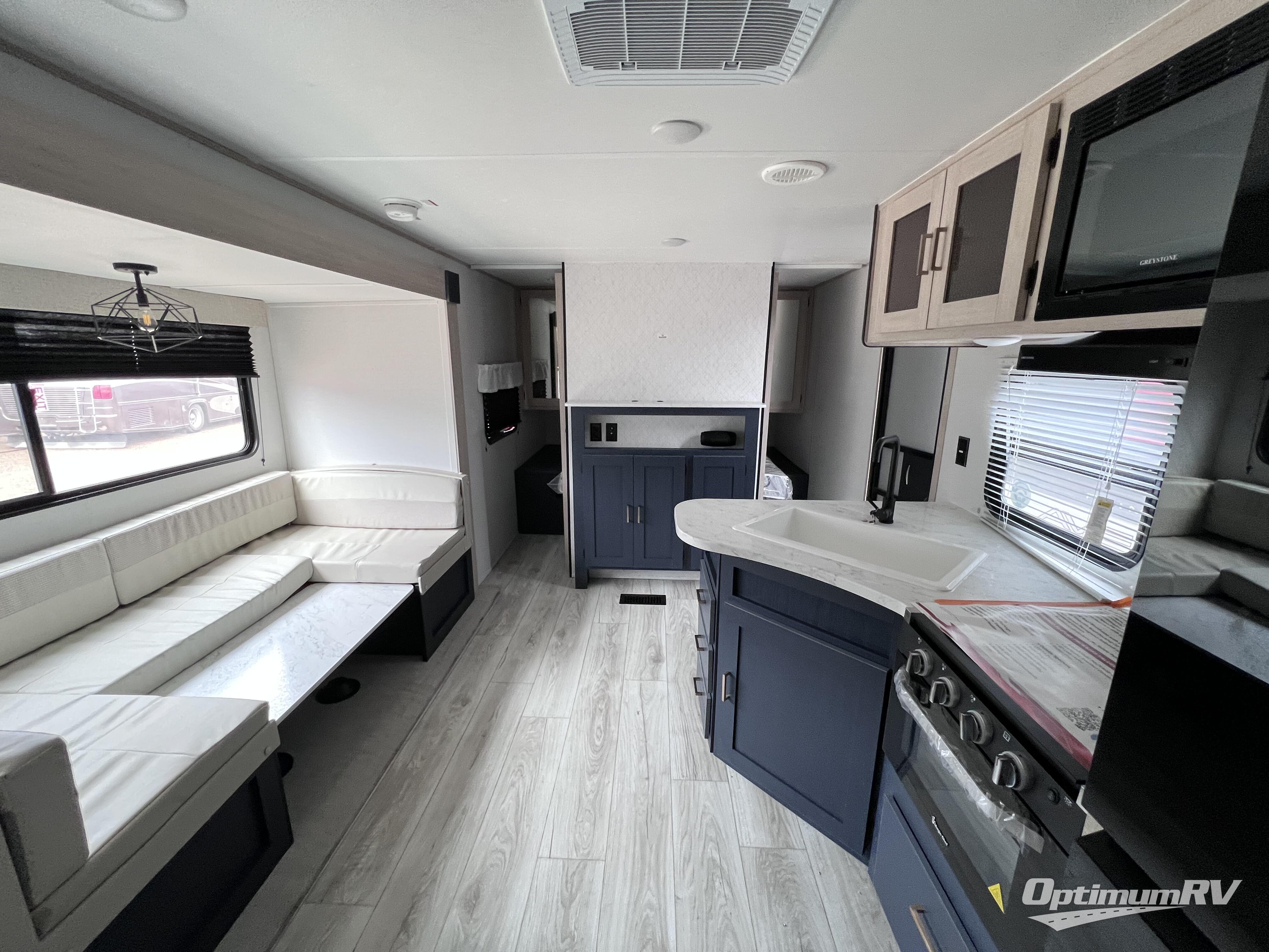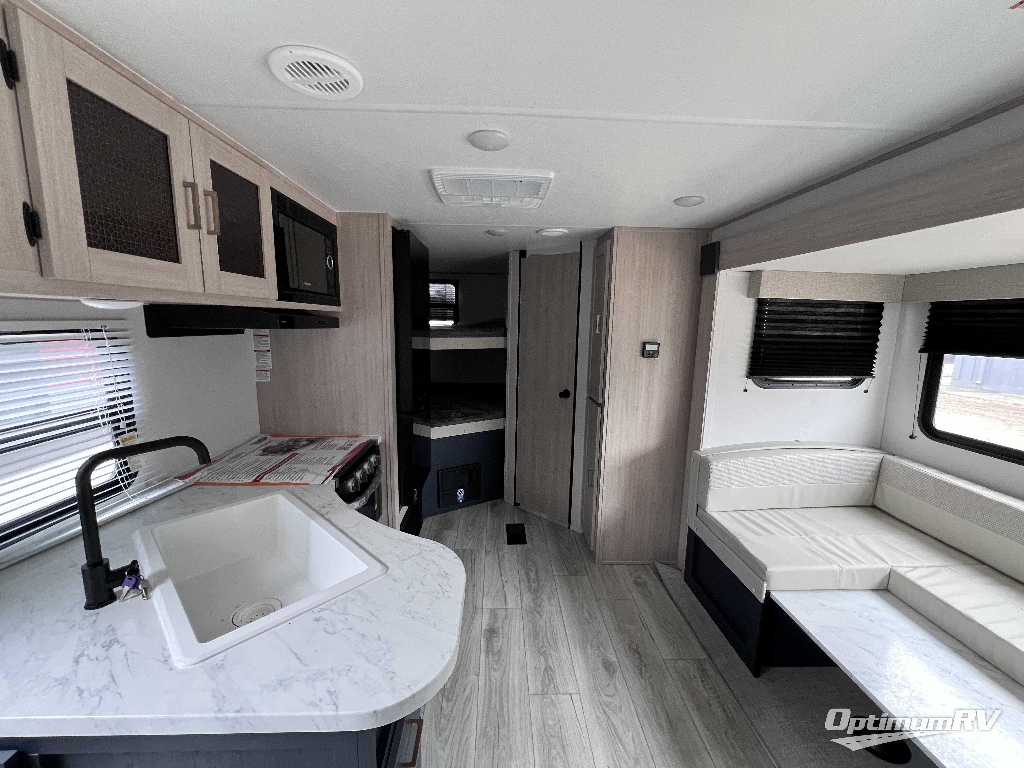 Gather the crew, load up and head out to enjoy a long-weekend at the state park! This trailer offers sleeping accommodations for eight because of the double-size bunks, the U-shaped dinette, and the queen bed. There is a rear corner full bathroom with a medicine cabinet to store personal belongings. You will find full kitchen amenities inside, as well as an outdoor kitchen where you can watch the kids play while making dinner. The single slide provides more living space in the interior, as well as extra sleeping space on the U-shaped dinette.