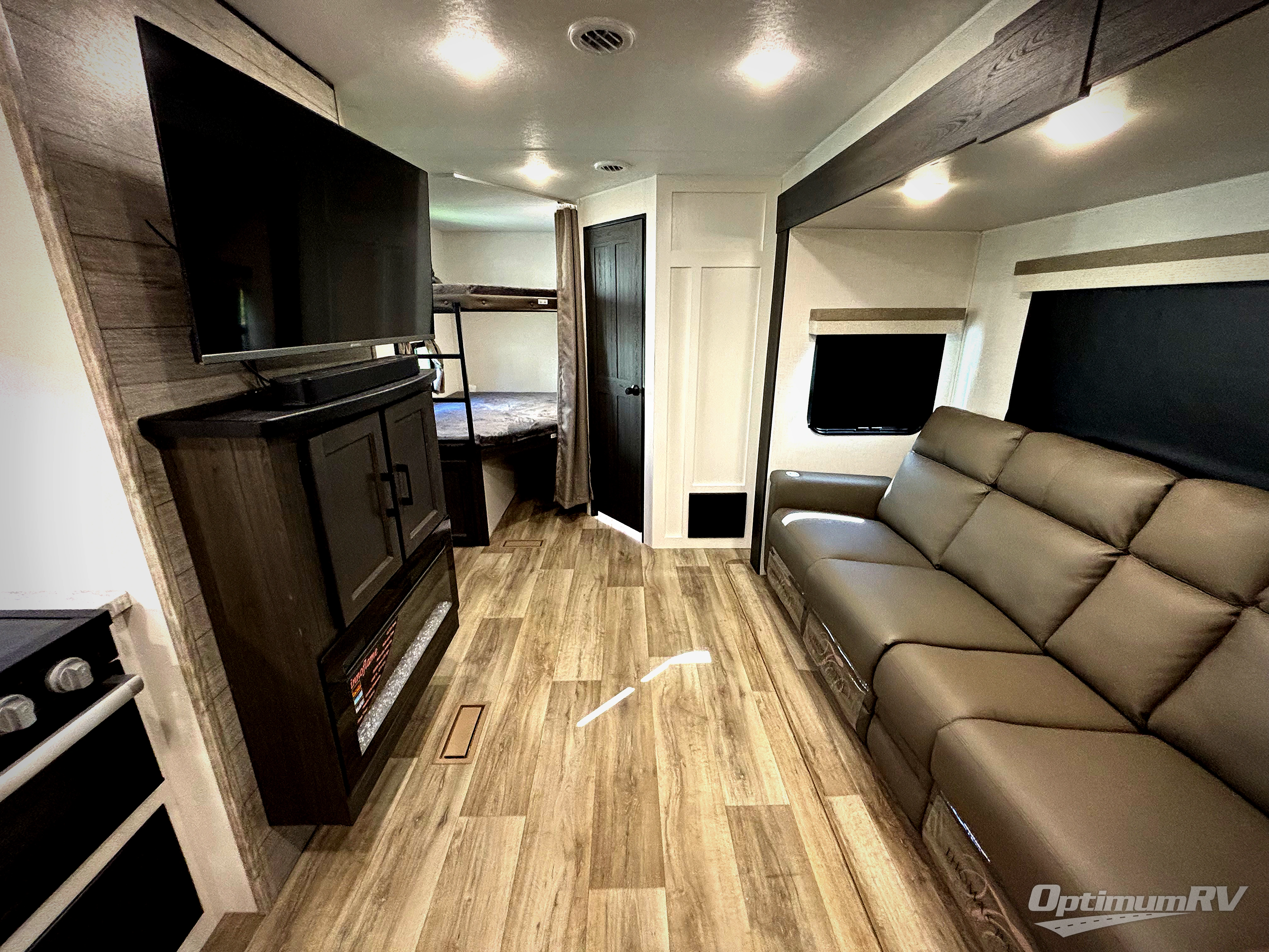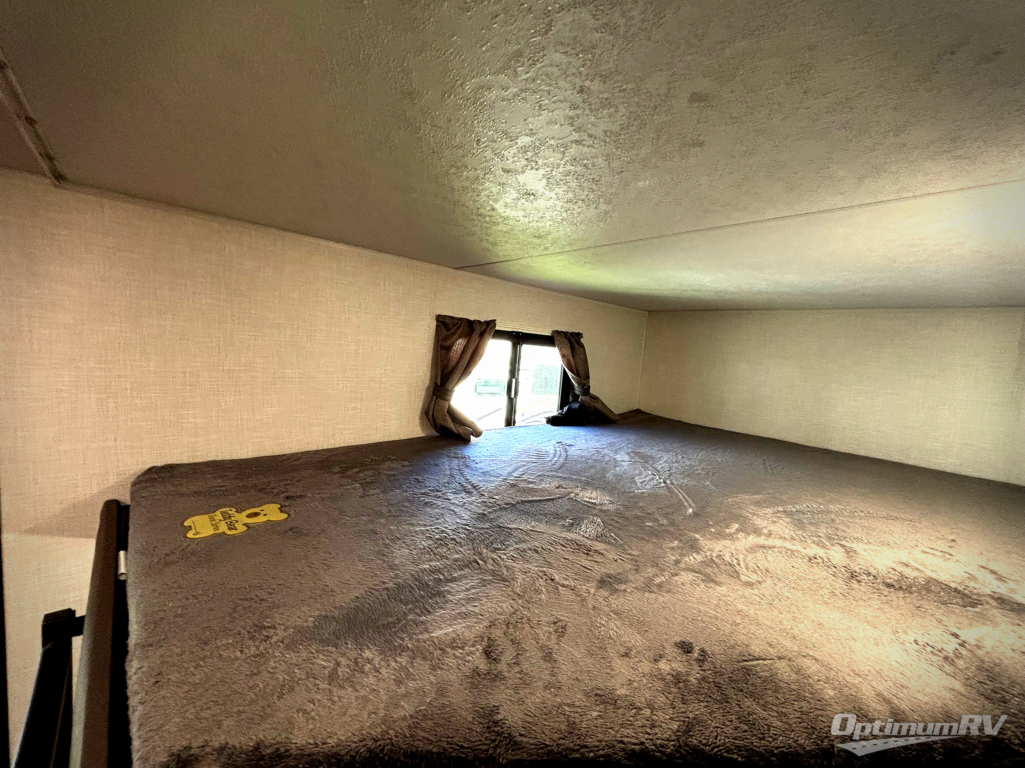 A front private bedroom with a Sleep Tight queen bed is sure to make you feel at home, while your guests take the double-size bunks in the back. There is a full bath right next to the bunks for easy nighttime use, and any other guests can sleep on the U-shaped dinette with flipside reversible cushions. There is plenty of storage space, including a walk-in pantry with coat hooks, dual bedside closets to keep clothes wrinkle-free, and an exterior pass-thru storage for camp gear! A full kitchen inside will let you cook in comfort when the weather isn't cooperating, and an exterior campfire cafe includes an outdoor refrigerator, sink, and griddle for a sunrise breakfast!