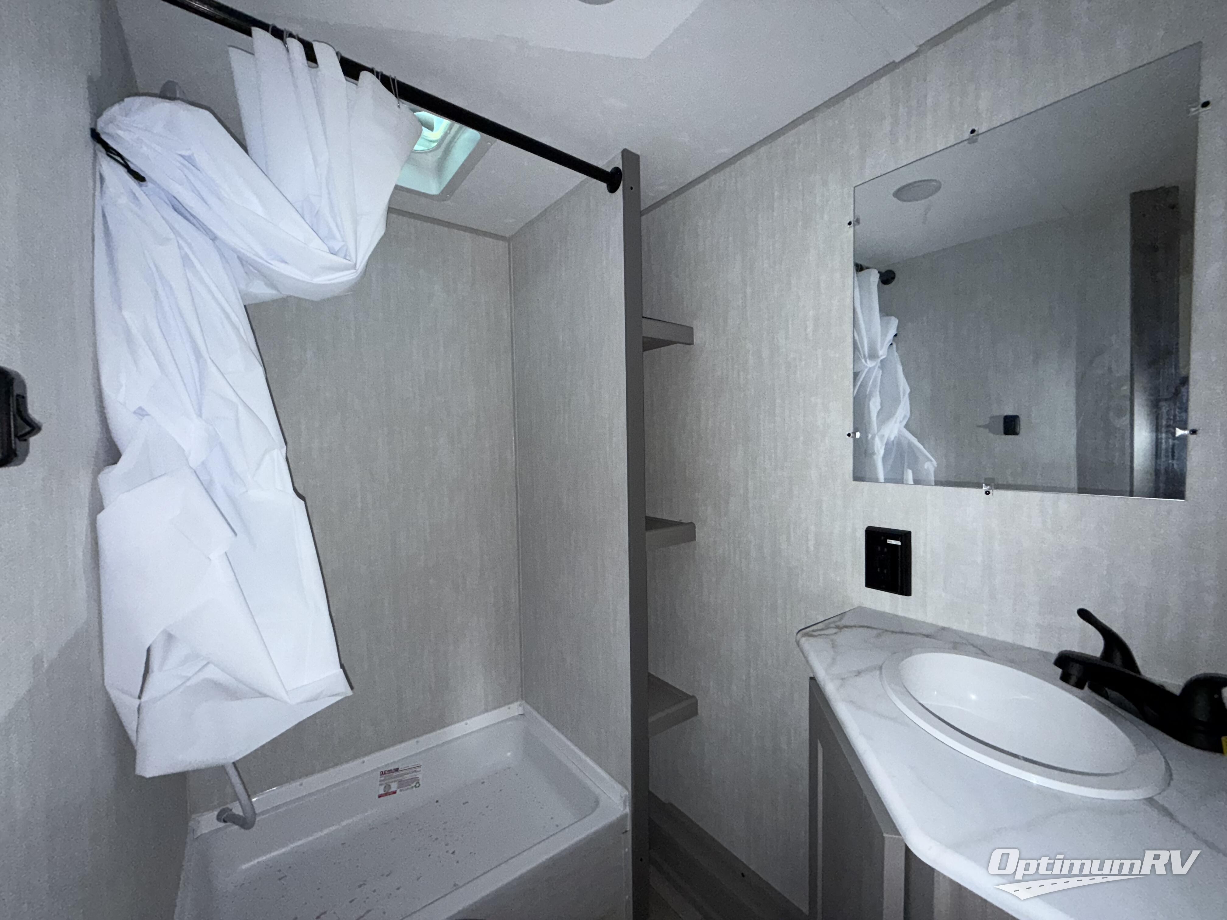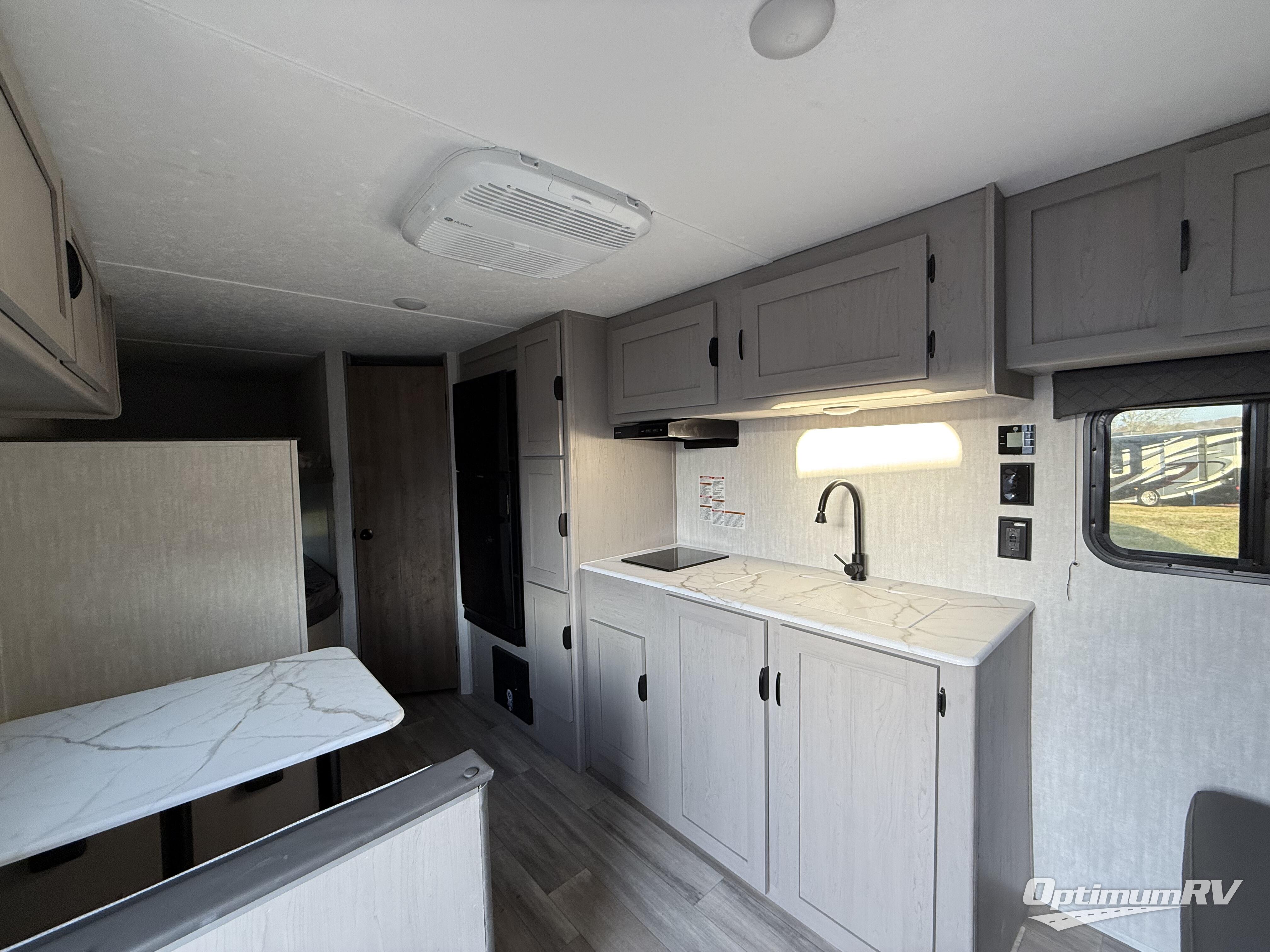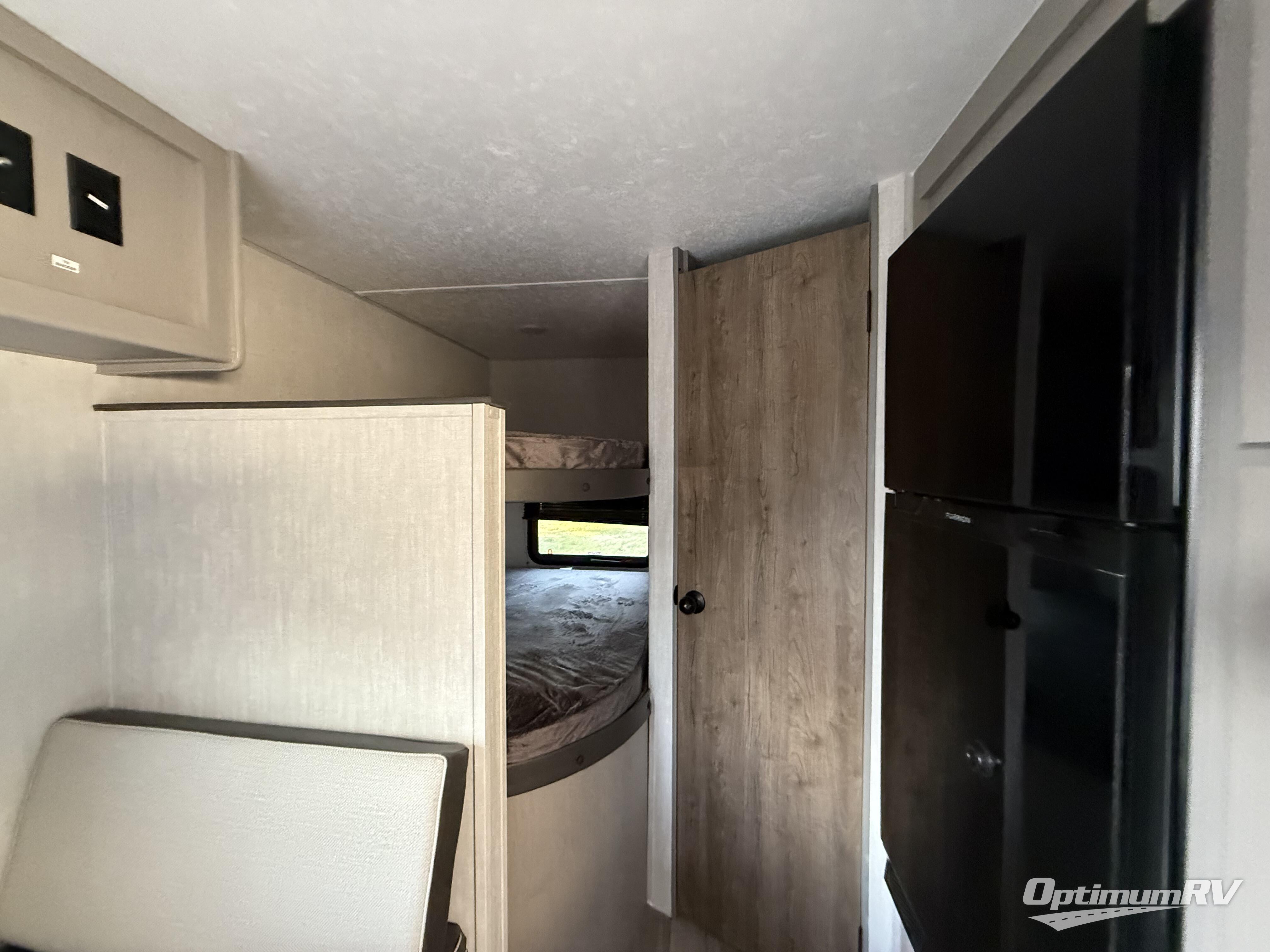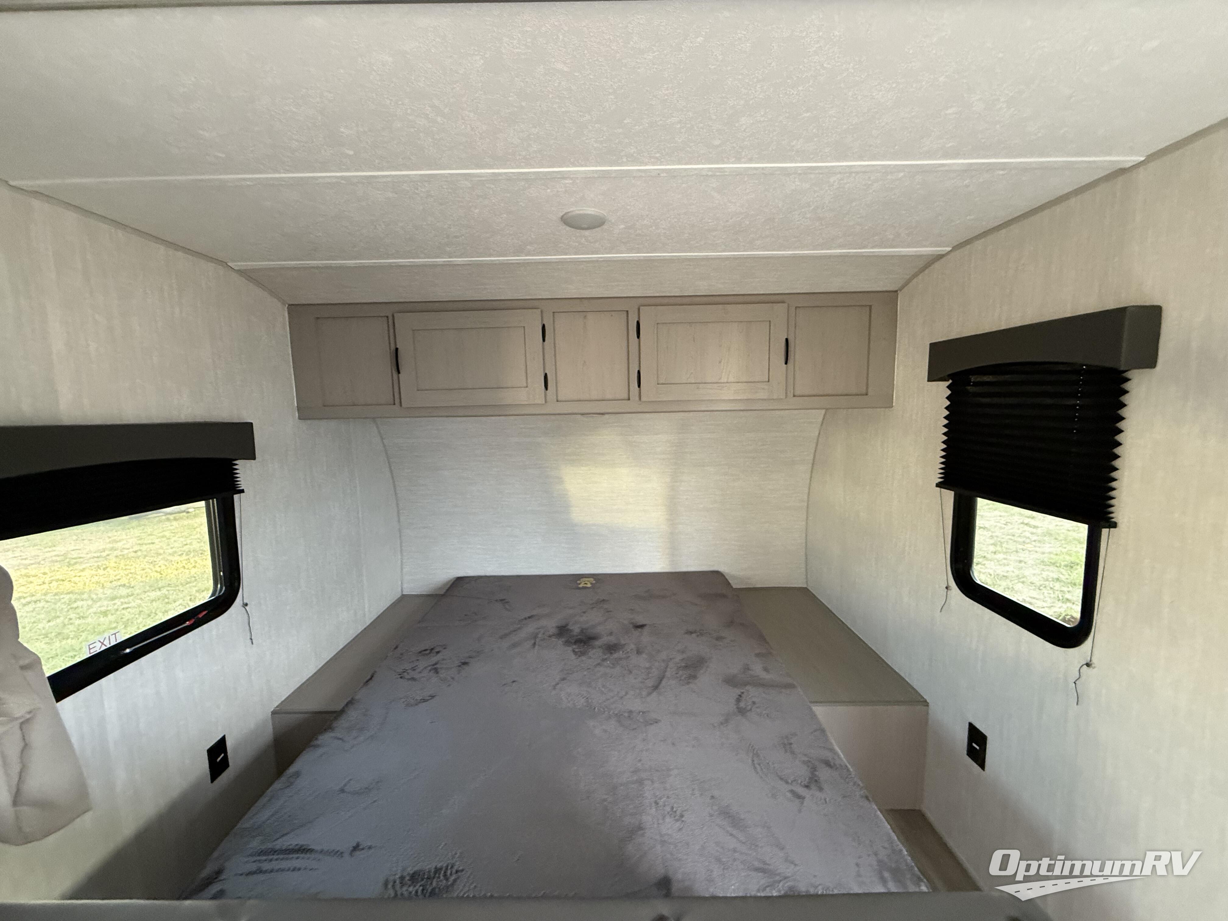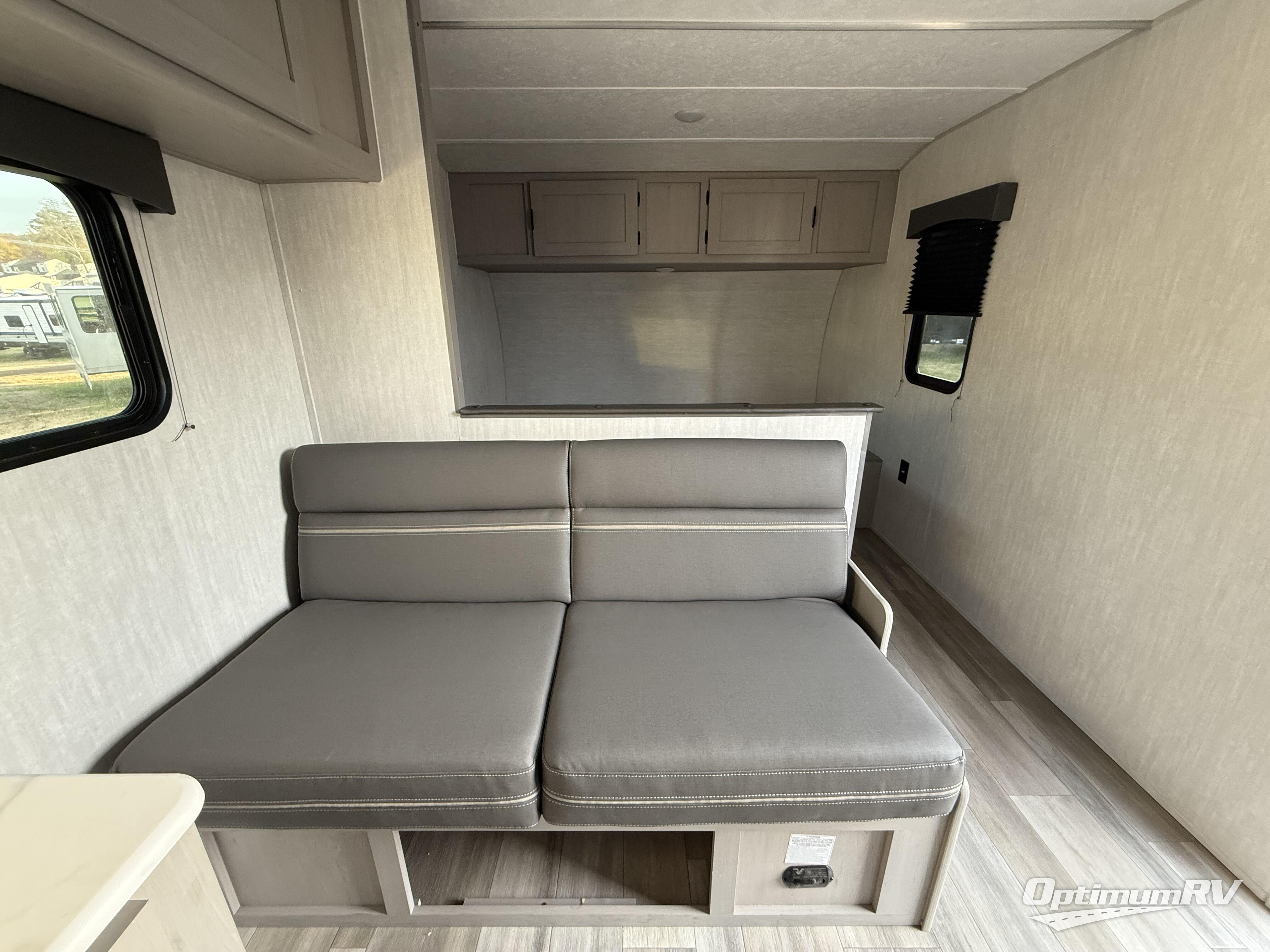 Bring the whole family with you in this travel trailer! The kiddos can sleep on the rear corner set of double bed bunks. The opposite rear corner features a full bath including a 24" x 36" shower, linen cabinet, toilet, and vanity with medicine cabinet overhead. In the main living space, you will find plenty of seating with a booth dinette and jackknife sofa which can also transform into an extra sleeping space if needed. Everyone's bellies will stay full with the two burner cooktop, 11 cu. ft. 12-volt refrigerator, and microwave which you can use to pop a bag of popcorn for movie night. You will enjoy the front bedroom for a bit of privacy including a queen bed and large overhead cabinet for your things. On the outside, a large front pass-through for lawn chairs and camp gear. There is more storage beneath the double bed bunks in back and a nice 10' awning to provide protection from the elements when outdoors.