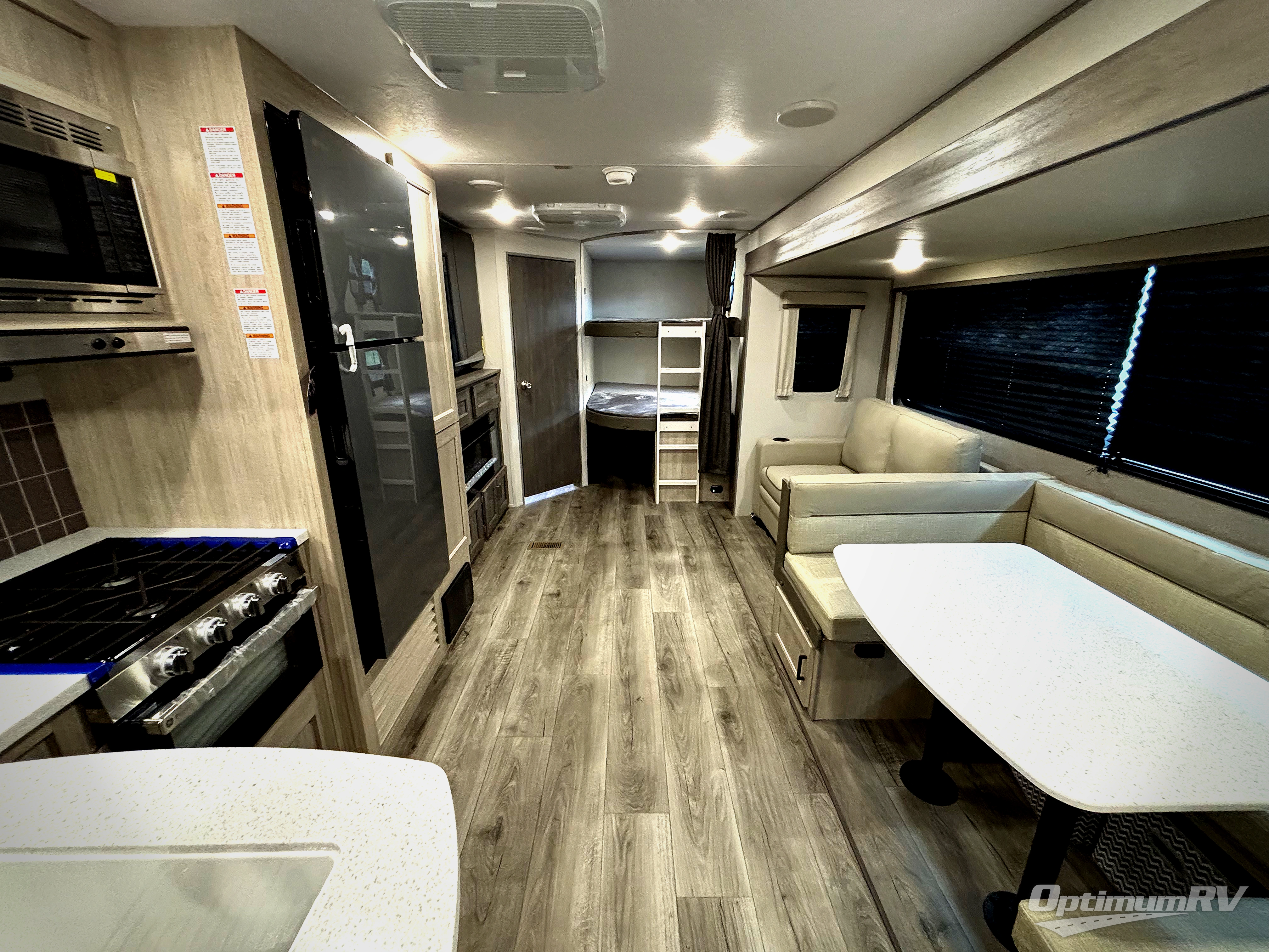 This travel trailer is perfect for your whole crew! Once you arrive at the campground, you can put out the 21' electric awning and start lunch on the exterior camper kitchen with a griddle and mini fridge. There is also a pass-thru storage plus additional exterior storage with a fold-down table and a TV hookup for added convenience. And since there are dual entry doors found on this unit, you can enter in through the full bath in the back, or the main living area towards the front! A large slide provides ample space to move about, and you'll find a trundle sofa and U-shaped dinette here for cozy seating and sleeping space. Speaking of sleeping, there is a front RV queen bed in the bedroom plus double-size bunks in the back for guests!