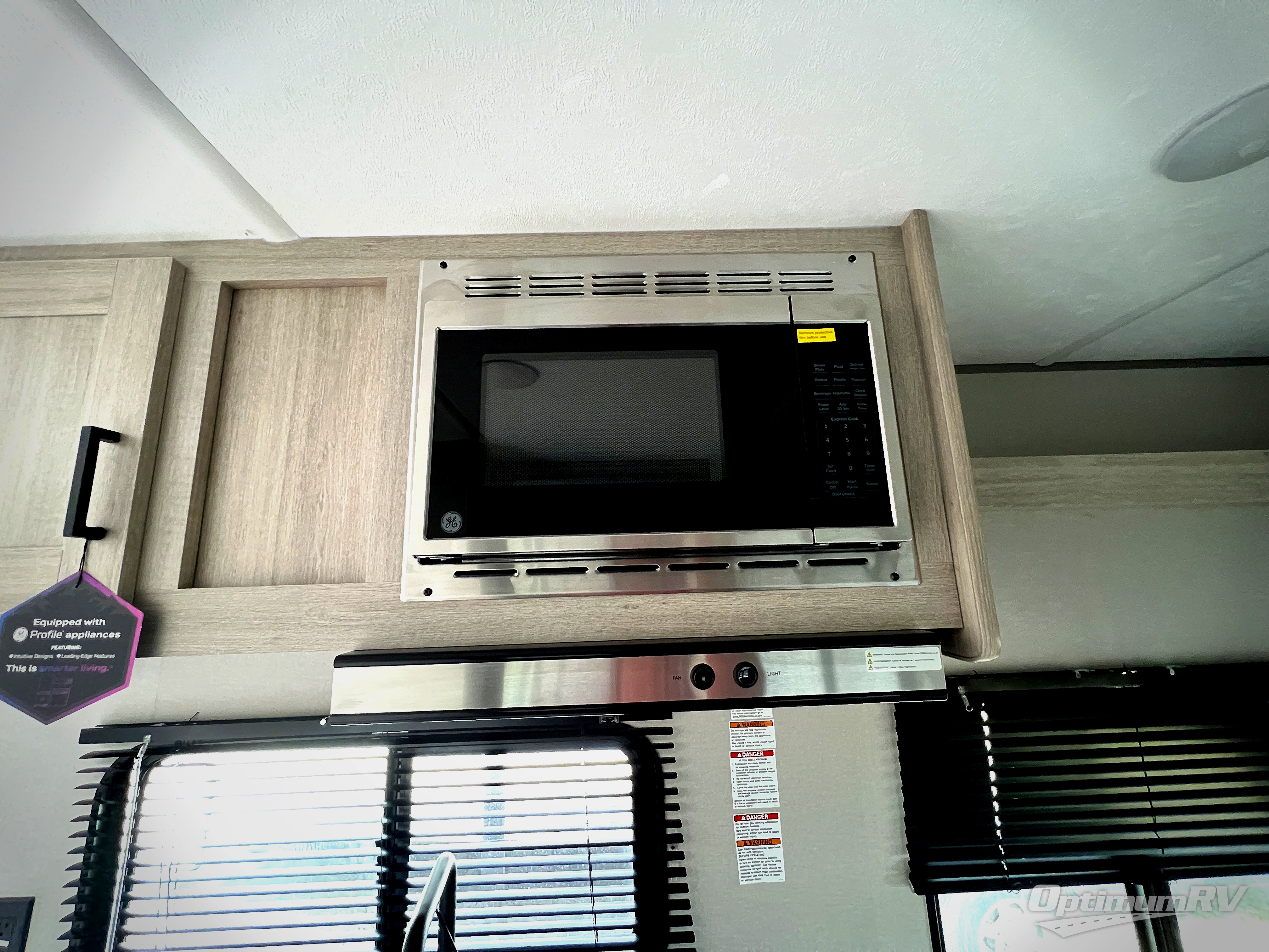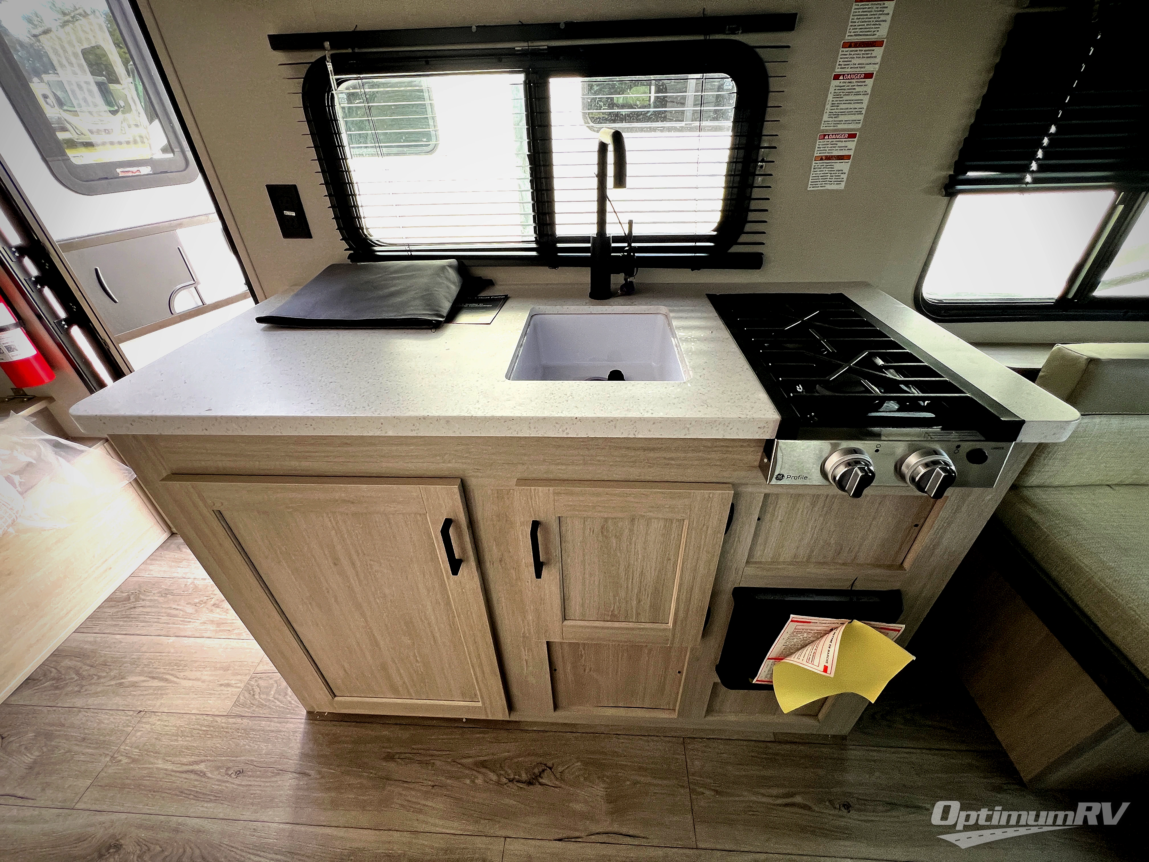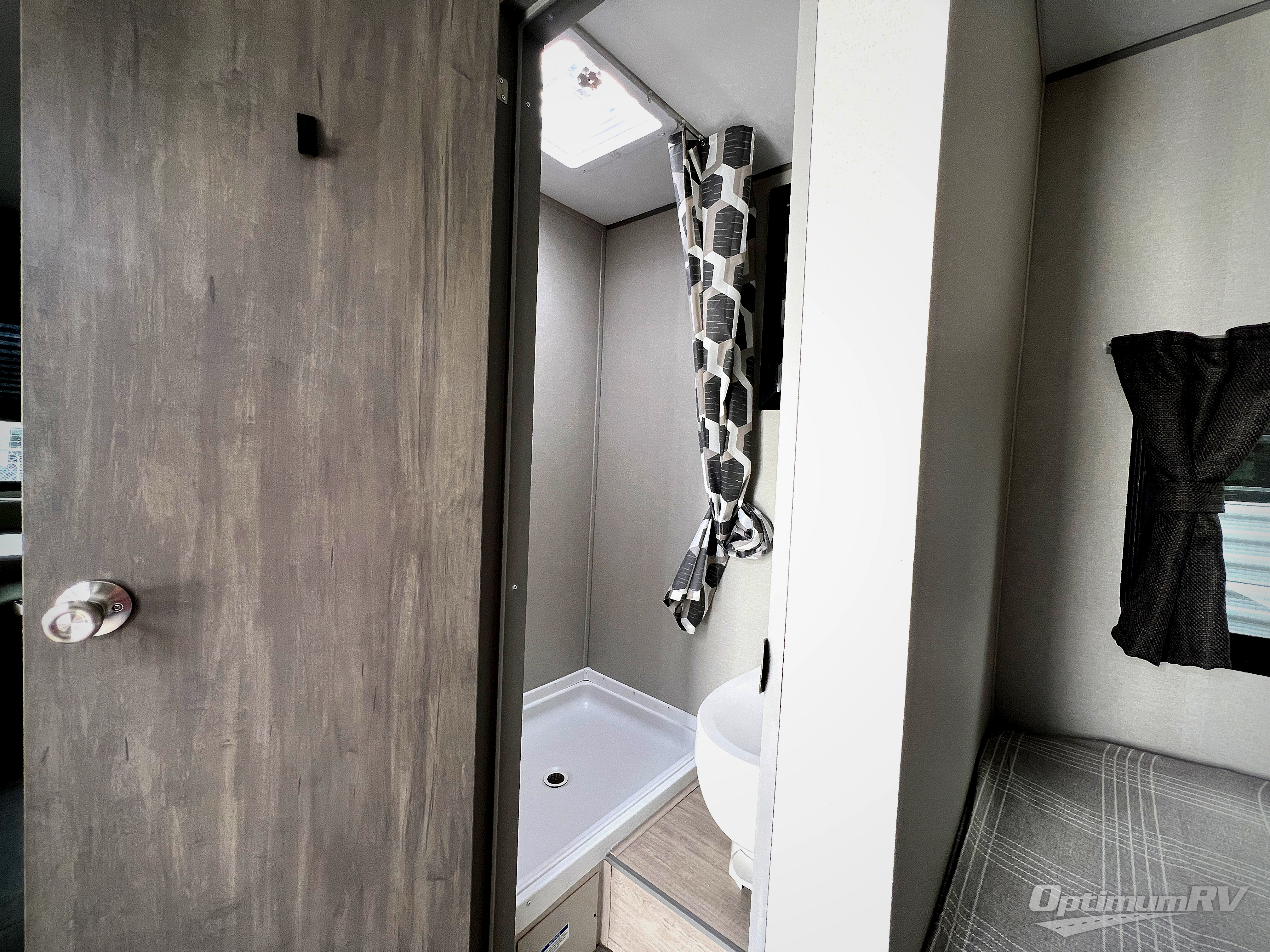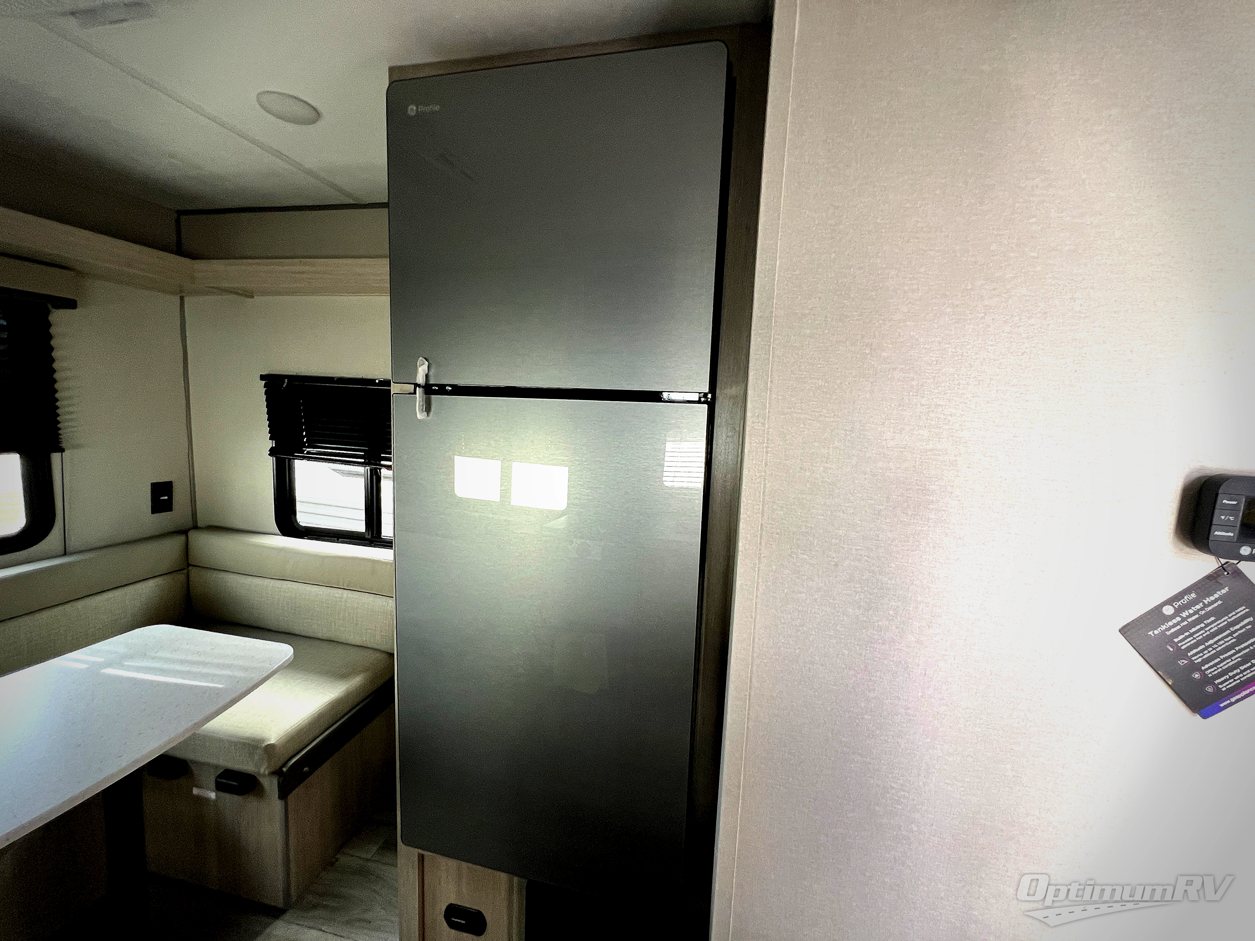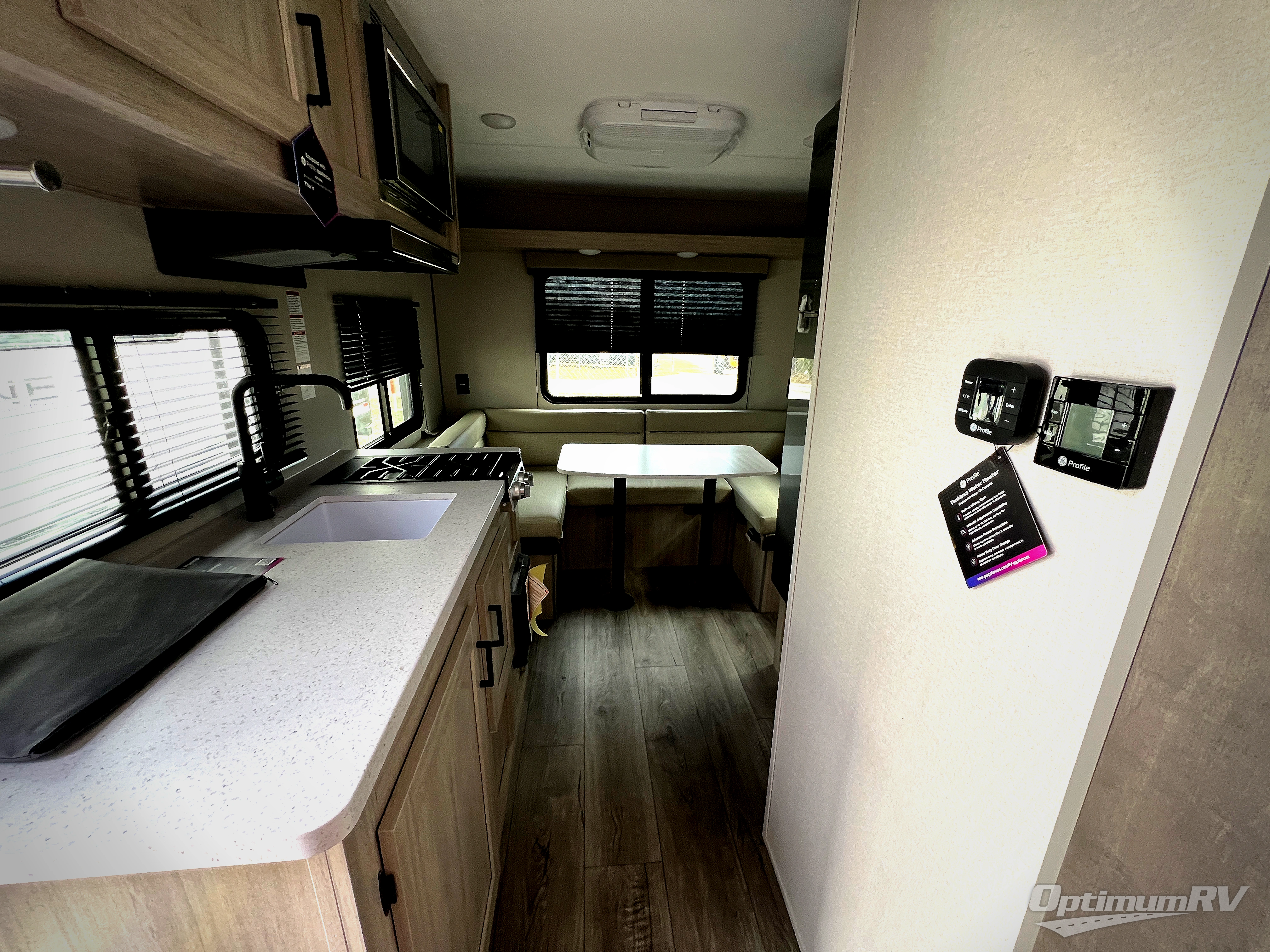 The perfect unit for a cozy weekend retreat for two or three! There is a queen bed up front with overhead storage and more at the foot of the bed to keep your things tidy. The rear of the unit offers a U-shaped dinette that is great for watching TV or playing cards and games, plus it has an end table and a handy overhead shelf. A mid-coach bath includes a 36" x 30" shower and toilet with foot flush, and a mirror. This model also includes a GE two burner cooktop, a GE stainless microwave oven, plus a 3.3 cu. ft. 12V refrigerator to keep food fresh!