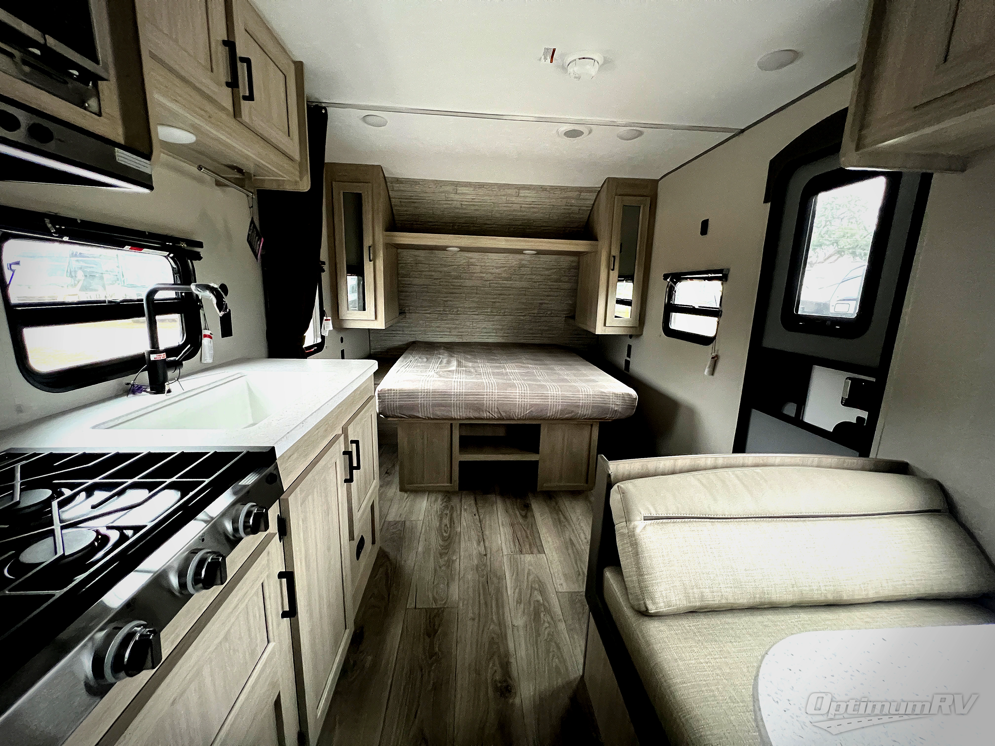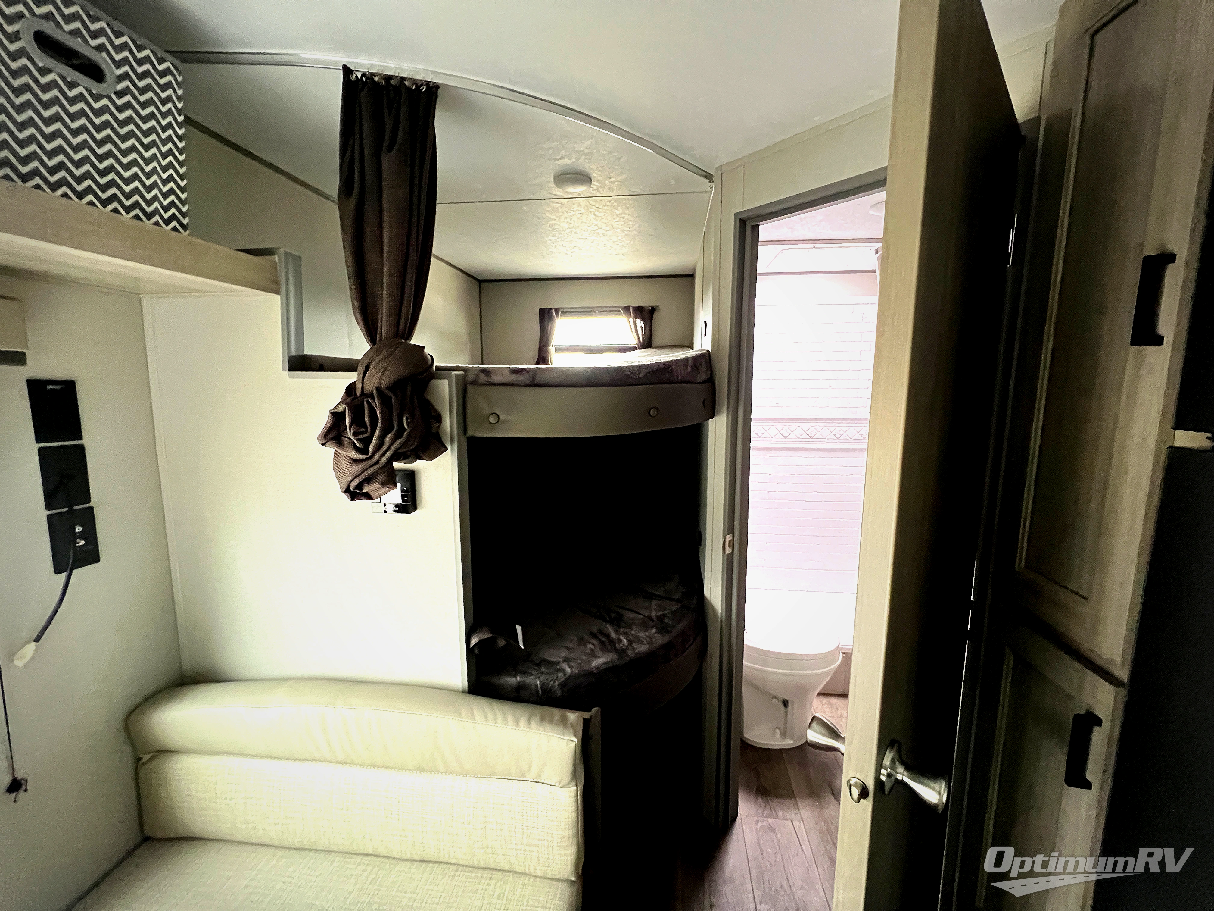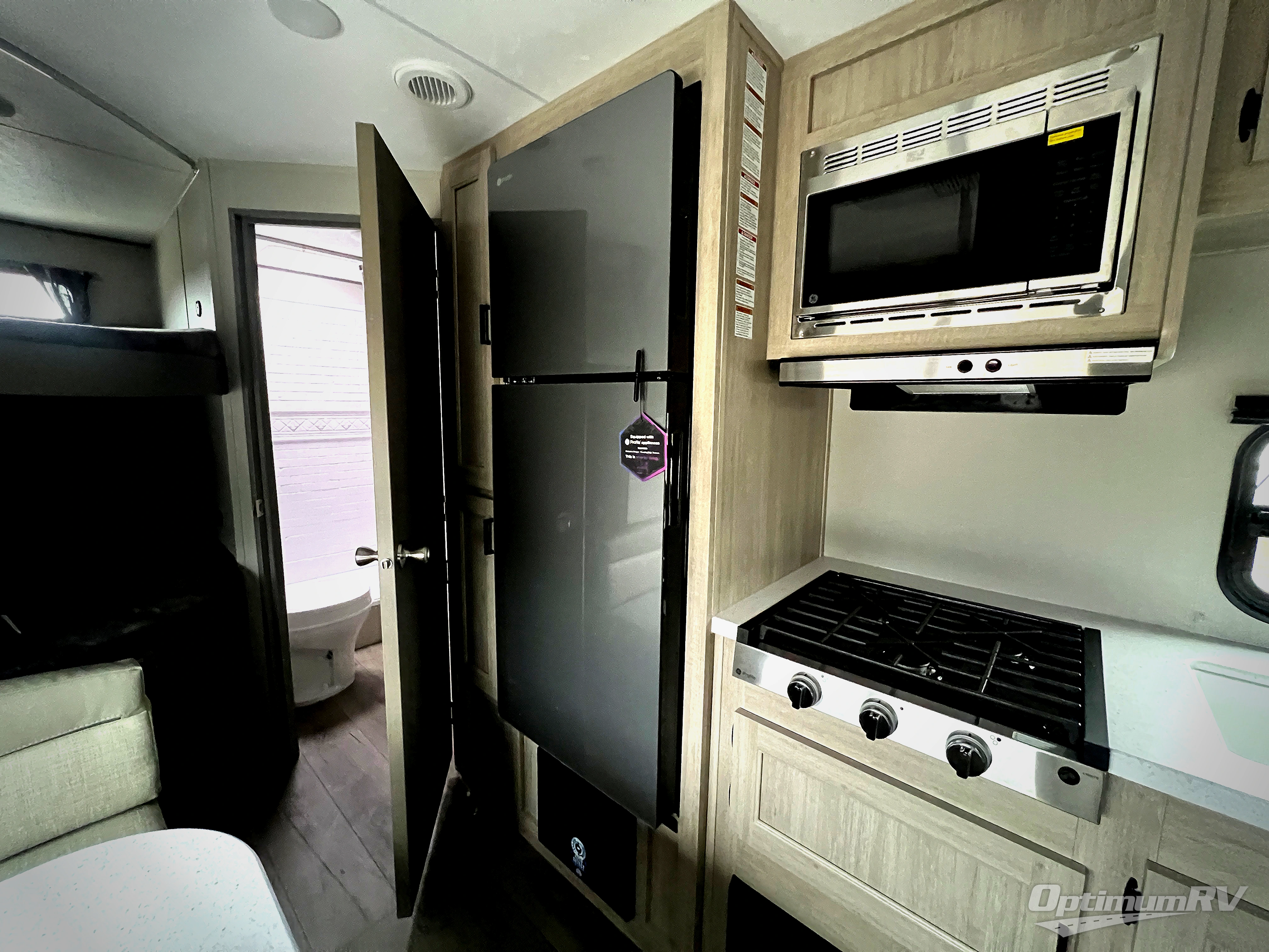 You'll love camping and spending time together in this travel trailer for seven! The bunk beds include under-bunk storage to keep bags out of the way, and the full bath is right next to the bunks for easy nighttime use. A semi-private bedroom up front includes a privacy curtain so you can get dressed each morning, and there are dual wardrobes to keep your things tidy. The chef of your group can whip up breakfast each morning on the three burner cooktop or in the GE stainless microwave, and there is a GE 10.7 cu. ft. 12V refrigerator to keep perishables fresh! A booth dinette provides a place to dine, or you can take your plate outdoors to sit under the 15' power awning with multicolored lights!
