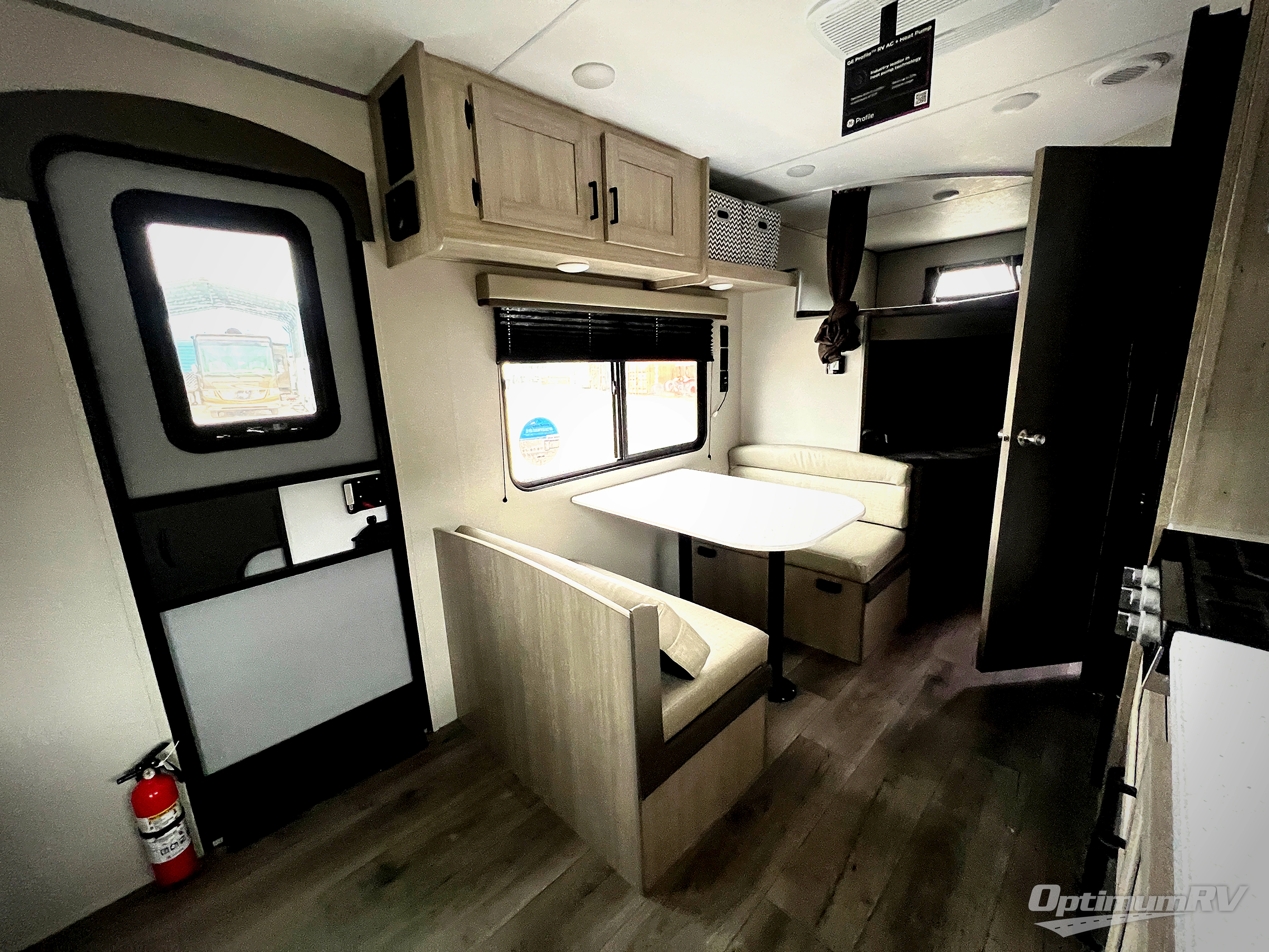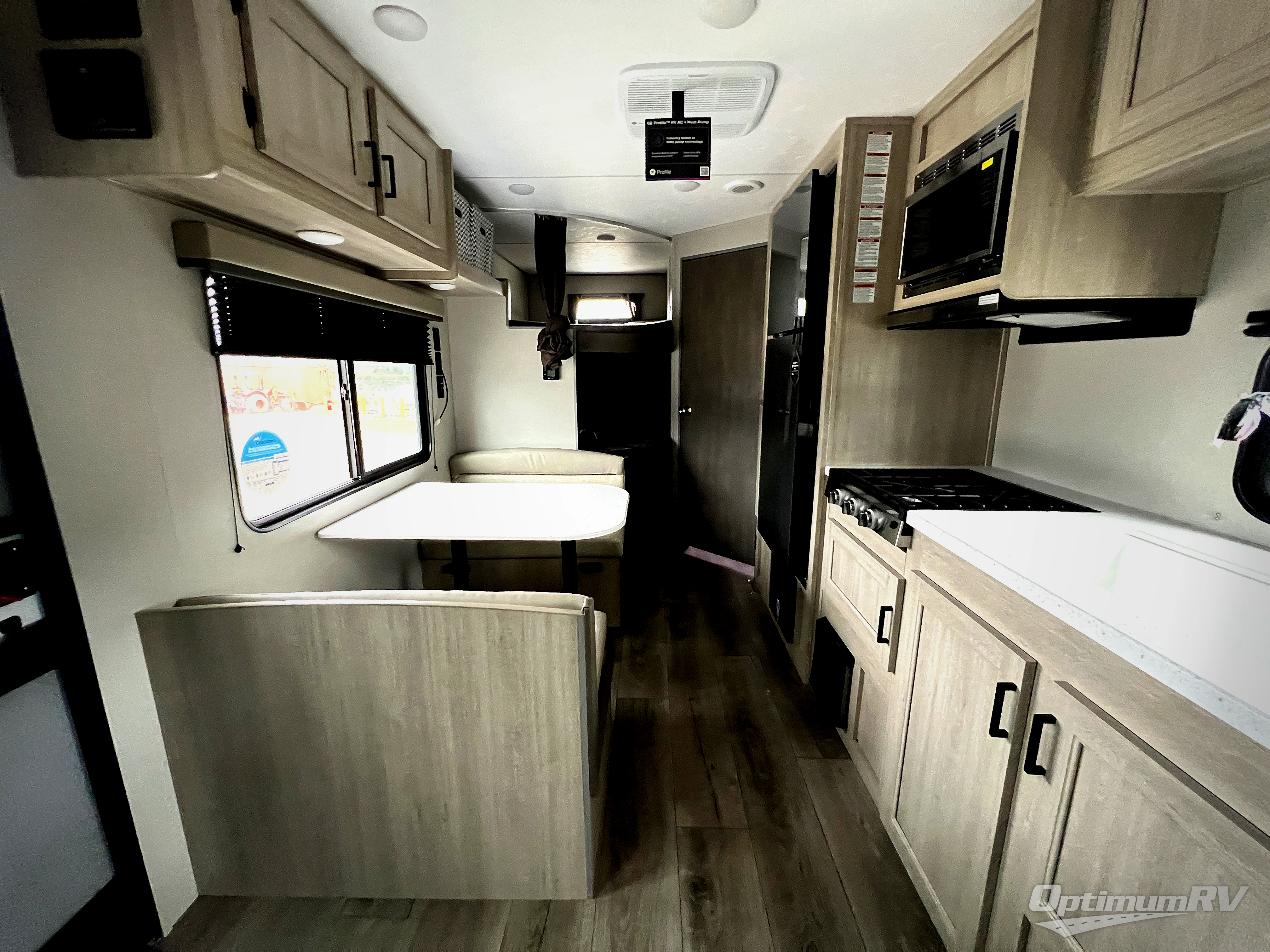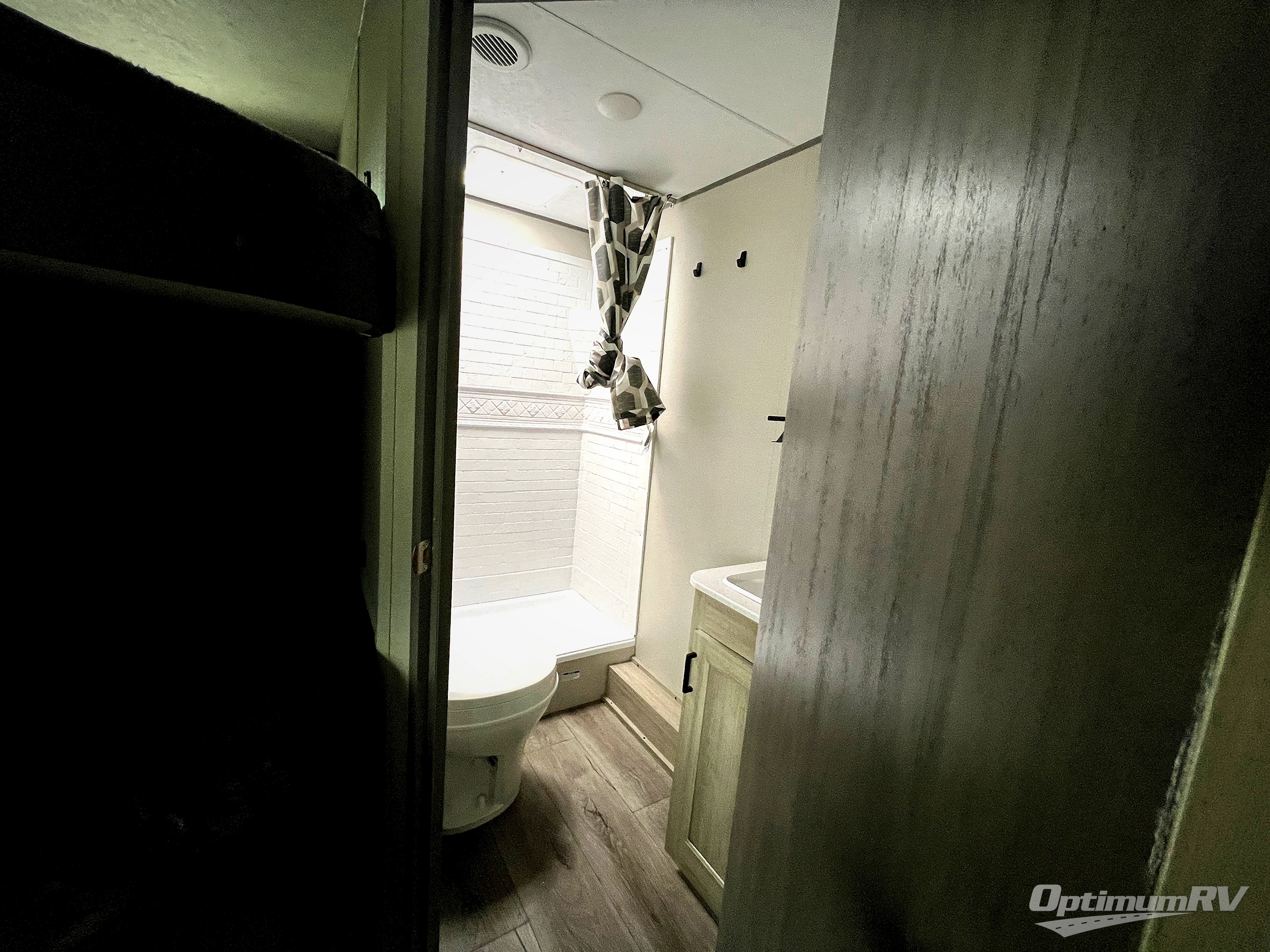 You'll love camping and spending time together in this travel trailer for seven! The bunk beds include under-bunk storage to keep bags out of the way, and the full bath is right next to the bunks for easy nighttime use. A semi-private bedroom up front includes a privacy curtain so you can get dressed each morning, and there are dual wardrobes to keep your things tidy. The chef of your group can whip up breakfast each morning on the three burner cooktop or in the GE stainless microwave, and there is a GE 10.7 cu. ft. 12V refrigerator to keep perishables fresh! A booth dinette provides a place to dine, or you can take your plate outdoors to sit under the 15' power awning with multicolored lights!