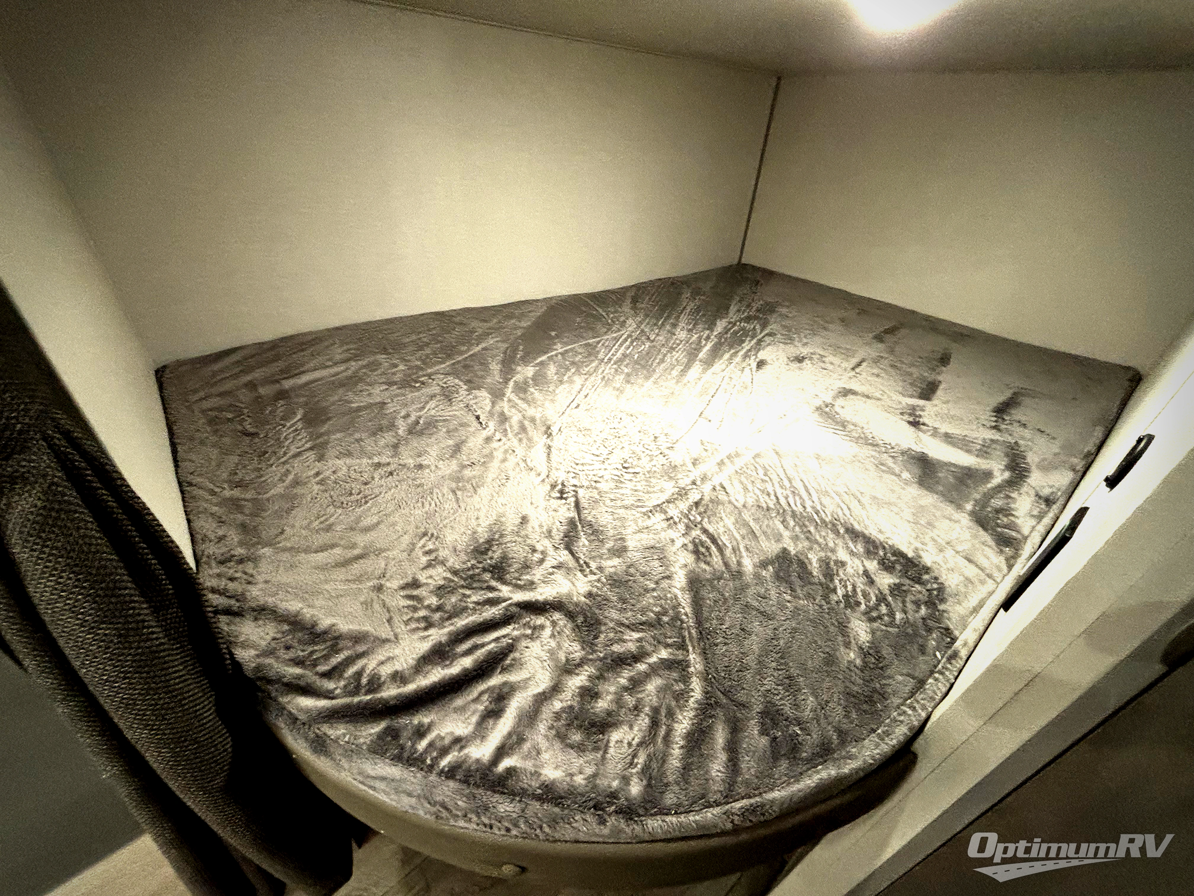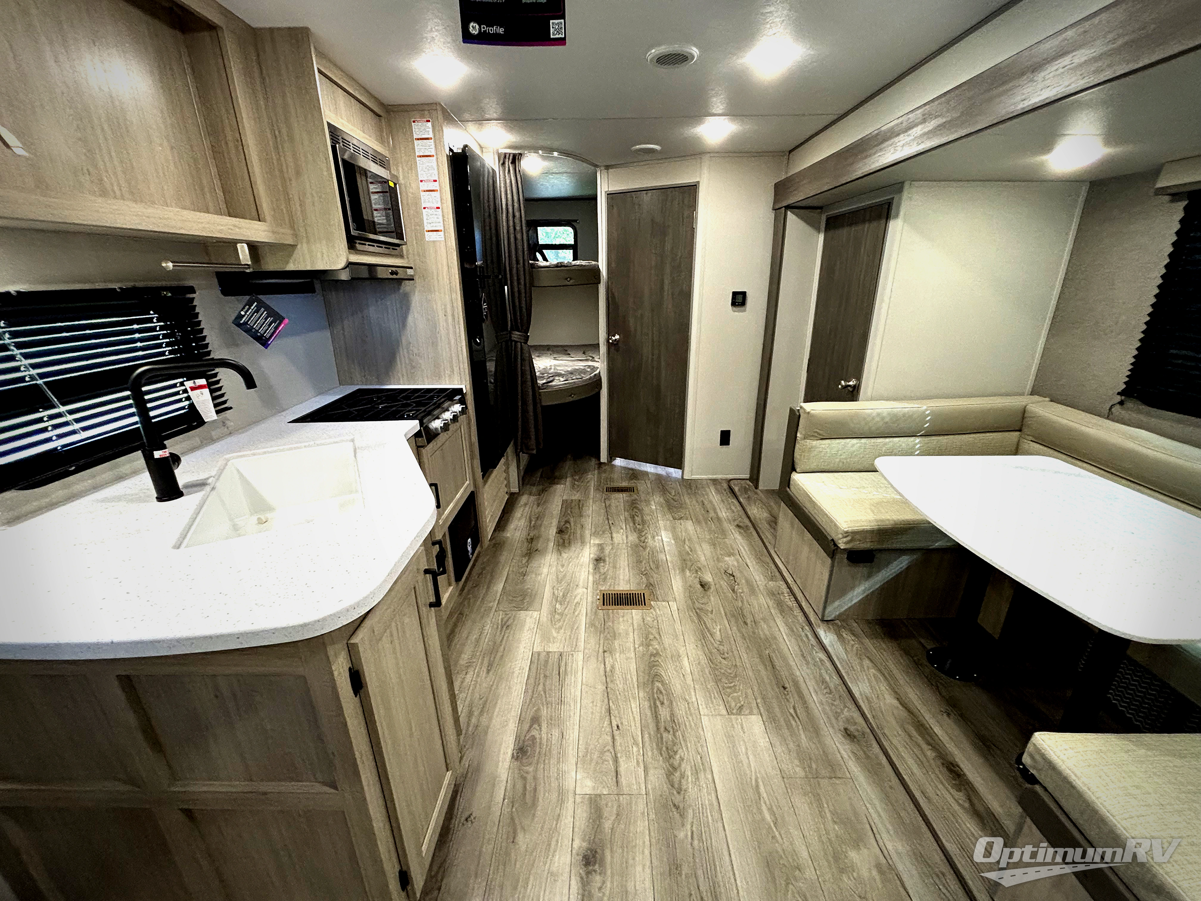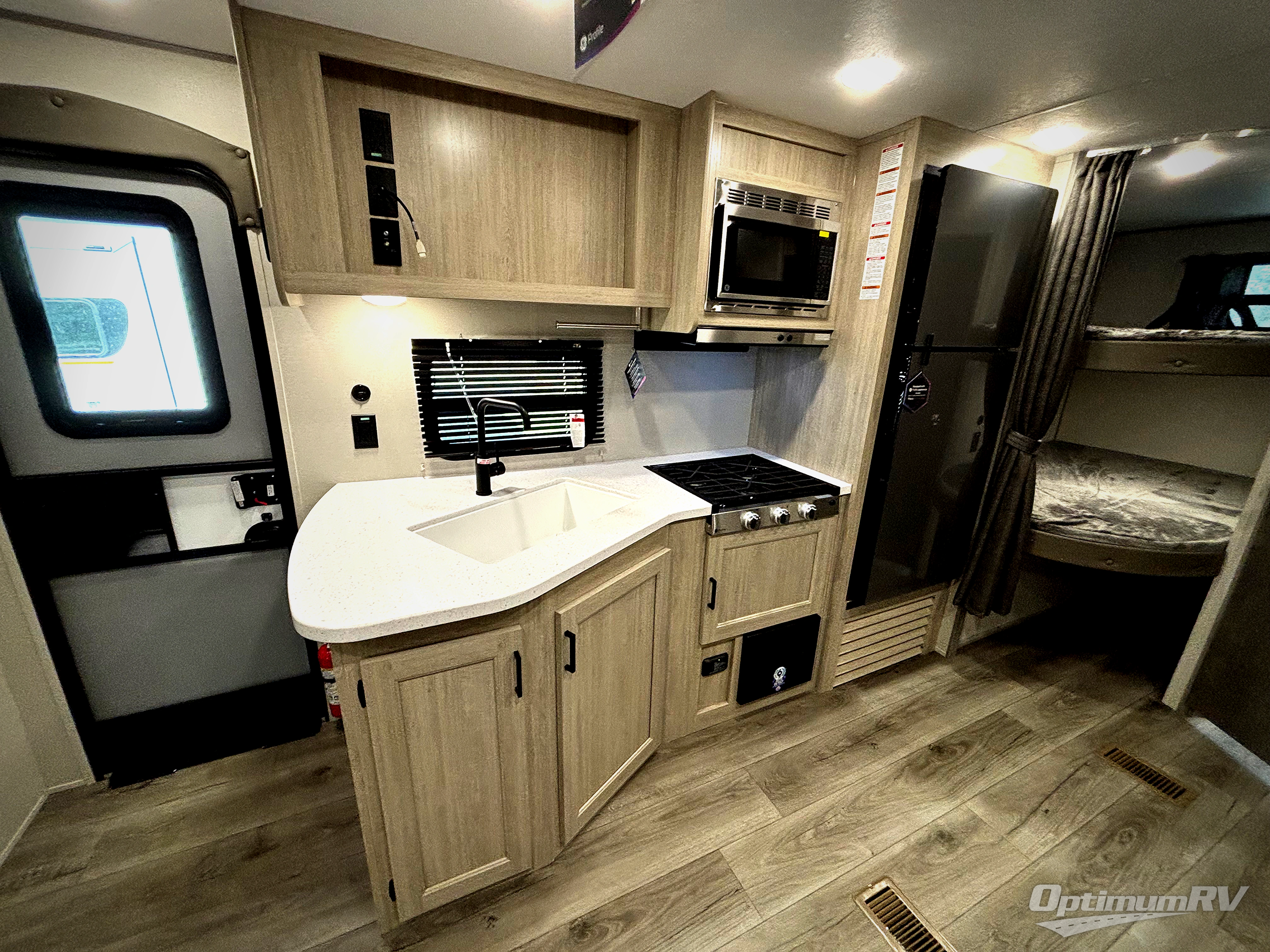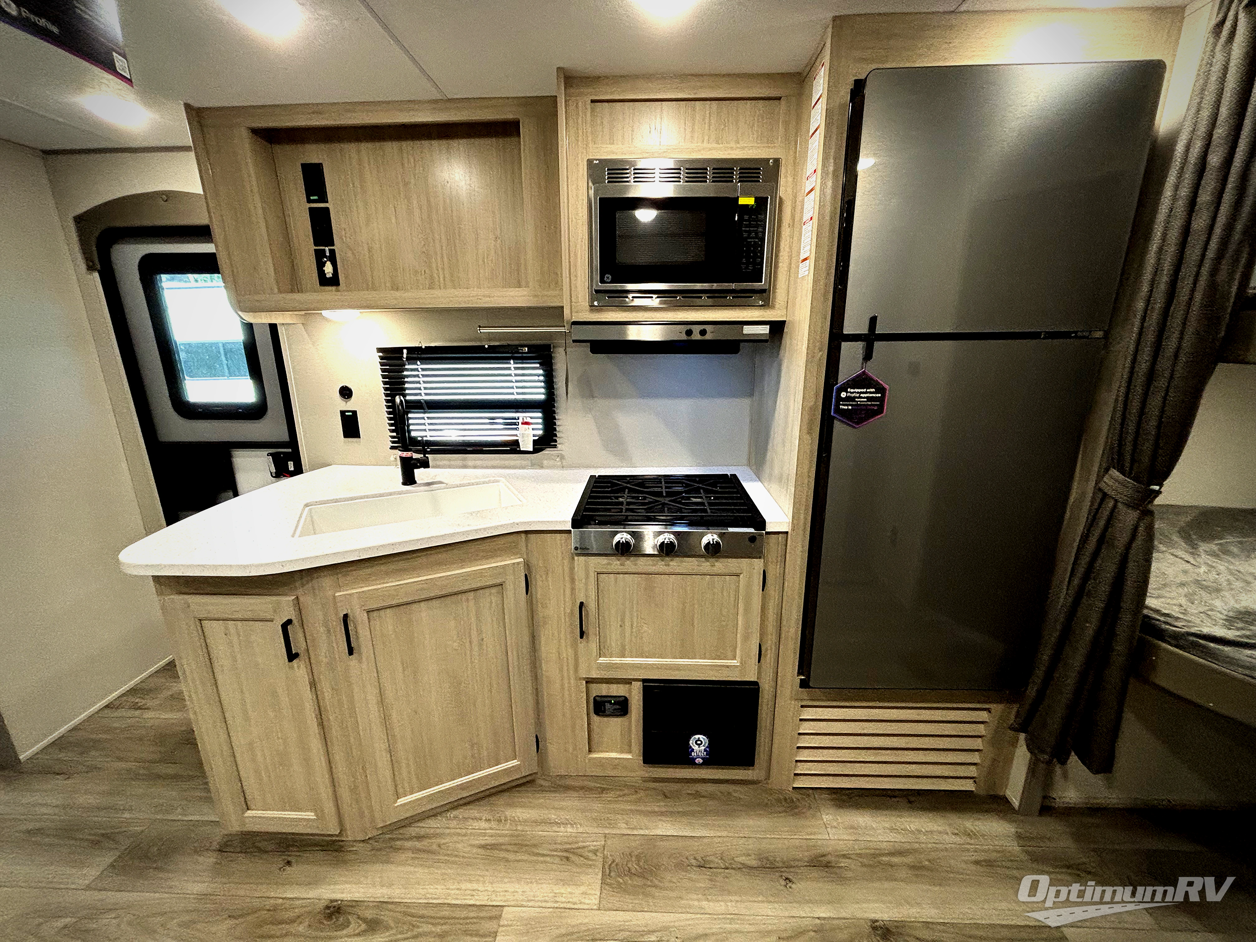 This is the perfect mid-size travel trailer for you and your family! The double-size bunks offer a comfortable sleeping space for the kids and you will have your own private sleeping space with a queen bed in the front bedroom. Freshen up each day in the rear corner bathroom with the tub/shower and a mirror to get ready each morning. You can prepare your best home cooked meals with the GE stainless three burner cooktop and GE stainless 10.7 cu. ft. 12V refrigerator, then enjoy them together at the u-shaped dinette. There is also a large pantry to store all your goods. Don't leave any of your outdoor gear behind either, thanks to the front pass-through storage area and the exterior outside storage area. You could even add the optional outside camper kitchen to grill the catch of the day on the pull out griddle!