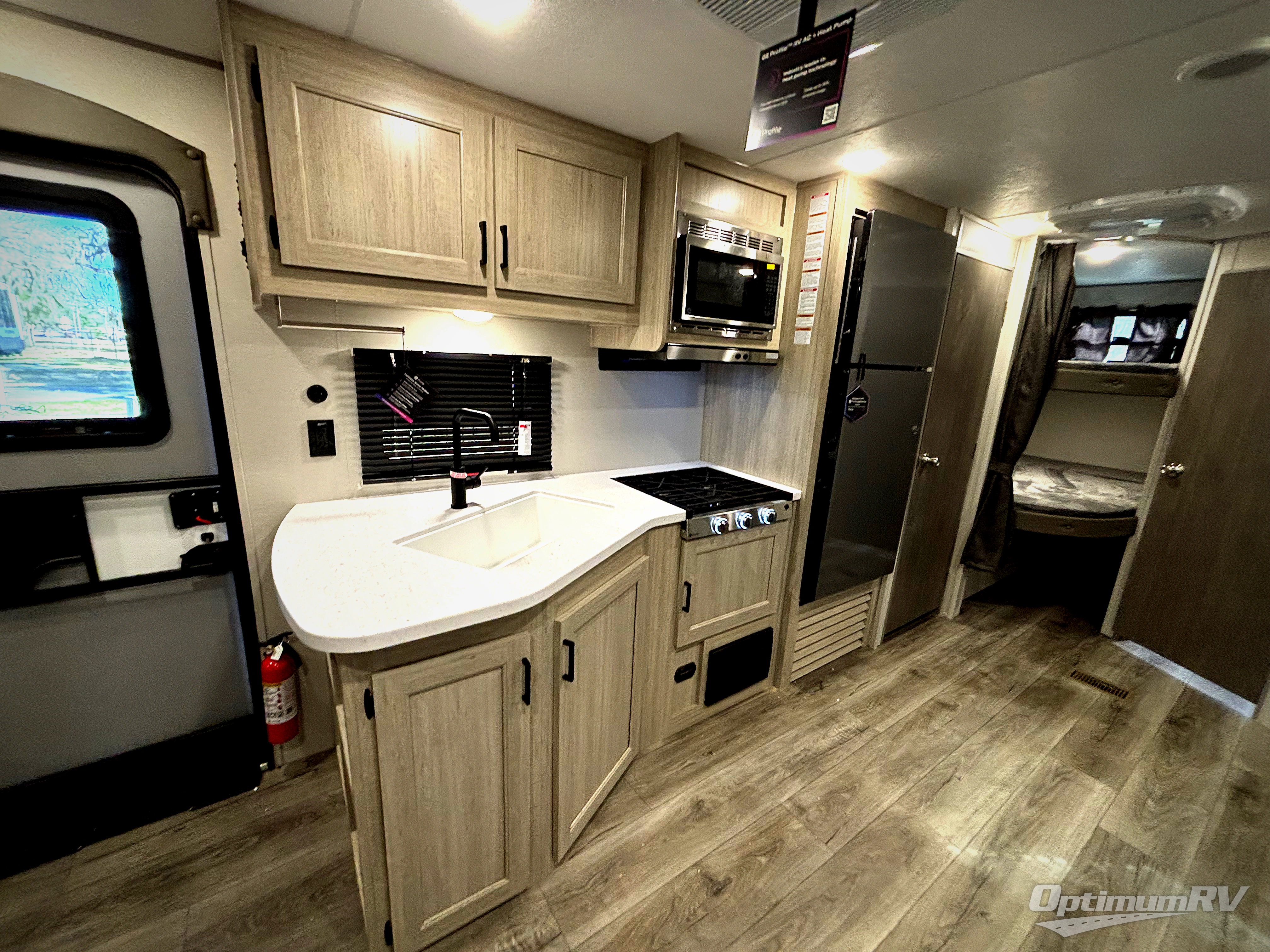 This is the perfect mid-size travel trailer for you and your family! The 46" x 74" double-size bunk beds with lower interior storage offer a comfortable sleeping space for the kids and you will have your own private sleeping space with the 60" x 74" queen bed in the front bedroom. Freshen up each morning in the rear corner bathroom with the tub/shower and a mirror to get ready each morning. You can prepare your best home cooked meals with the GE stainless three burner cooktop and GE stainless 10.7 cu. ft. 12V refrigerator, then enjoy them together at the booth dinette. The sofa is near the entertainment center for a relaxing movie night. Don't leave any of your outdoor gear behind either, thanks to the front pass-through storage area and the exterior outside storage area. You could even add the optional outside camper kitchen to grill the catch of the day on the pull out griddle!