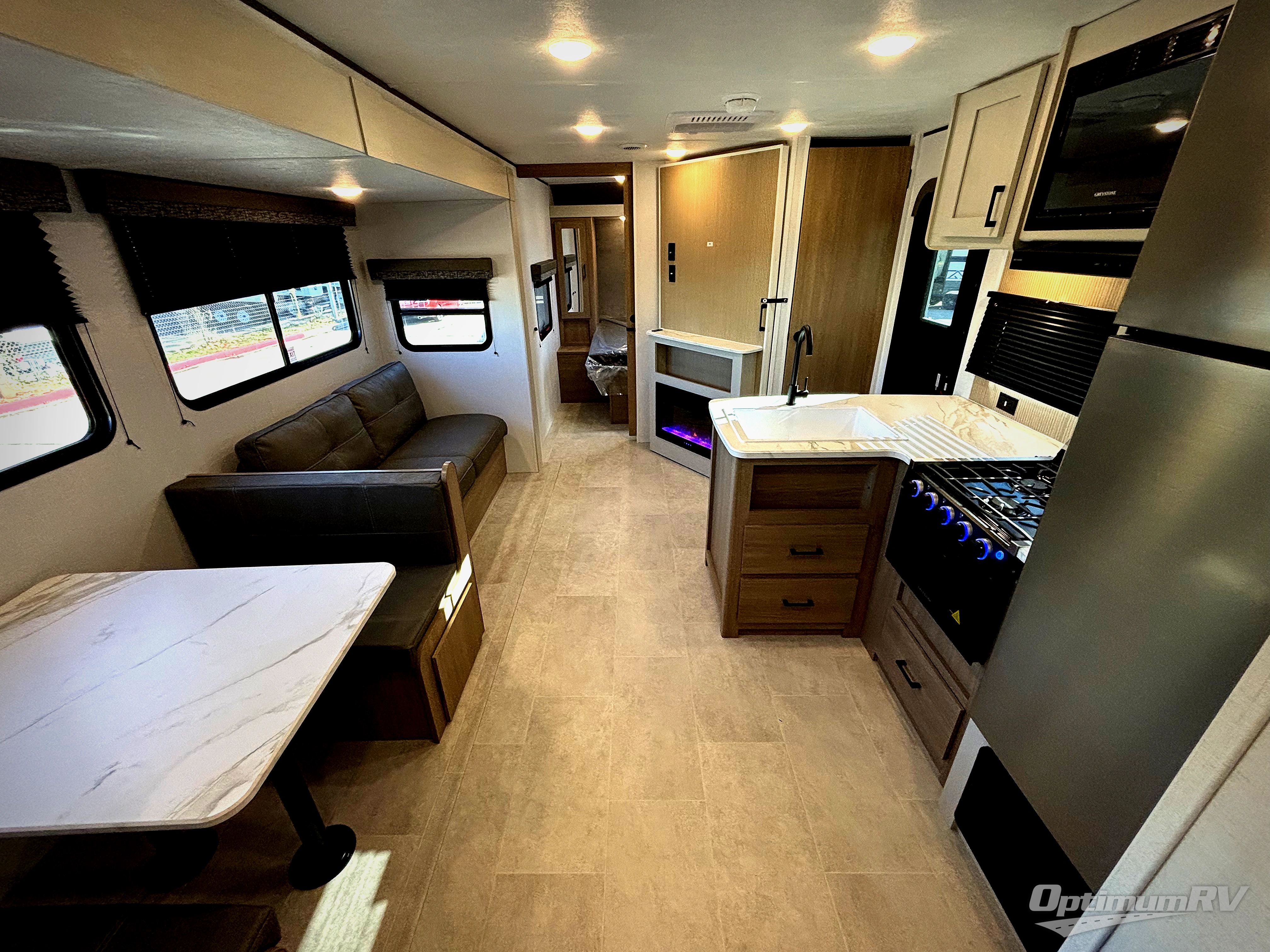 This travel trailer is one your whole crew will love! There is a rear private bunkhouse with double-size bunks for the little ones, a front private bedroom for you, and a booth dinette and jackknife sofa for even more sleeping space! The chef has their choice to cook indoors on the three burner range and microwave oven, or head outdoors to cook on the outdoor kitchen! The full bath will let everyone clean up each day, and the fireplace and large slide out will make your space feel more like home. And don't overlook the pass-through storage and 16' power awning with LED lights!