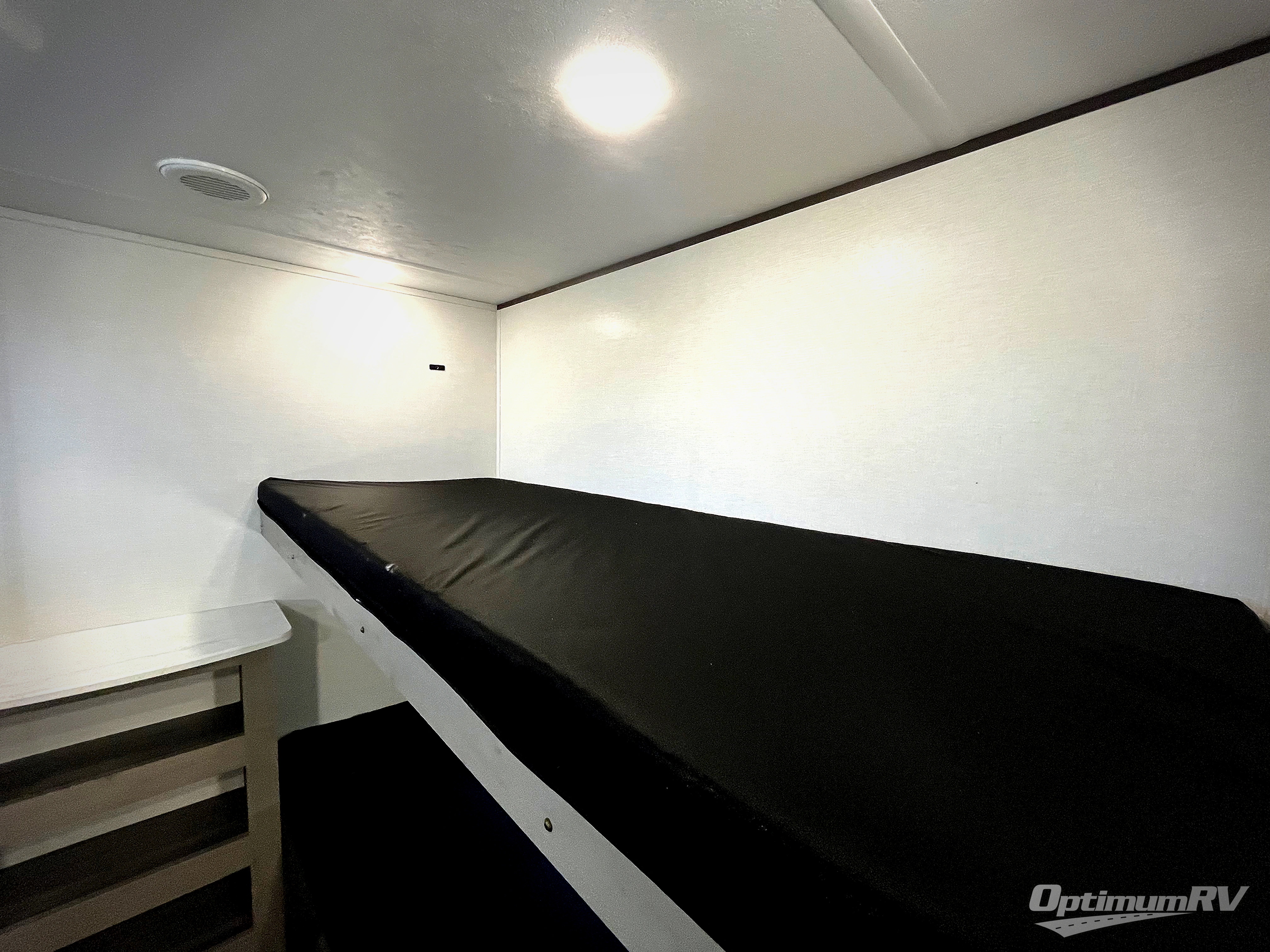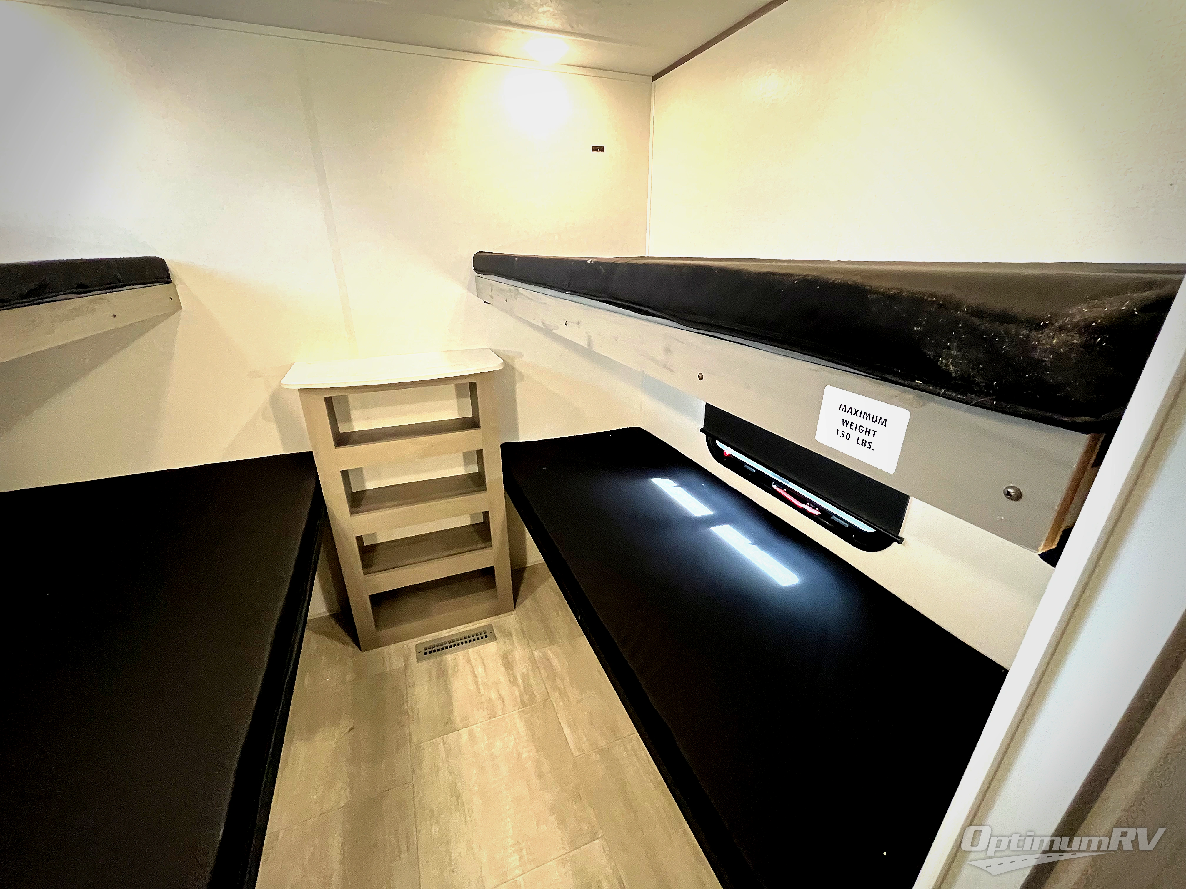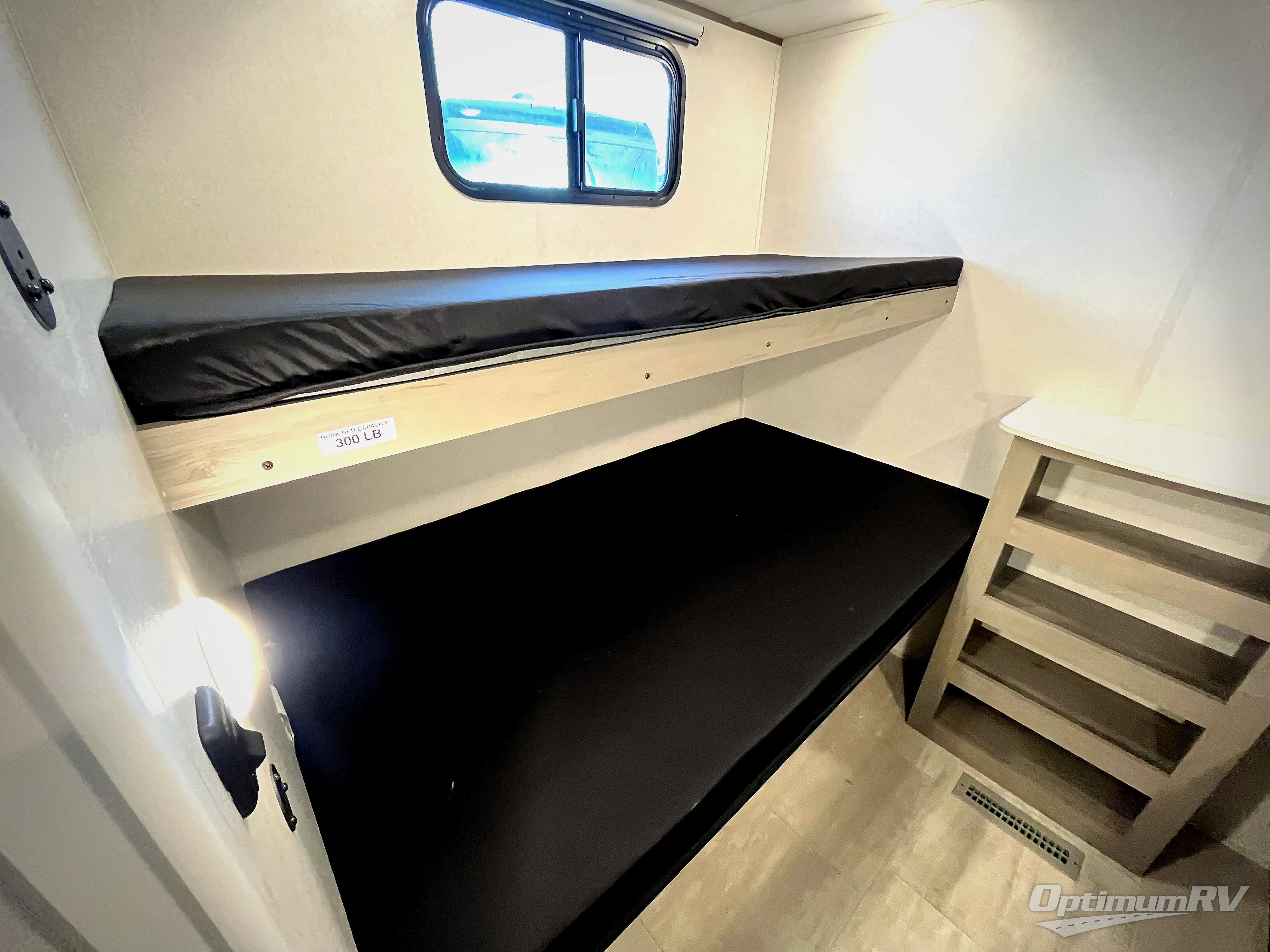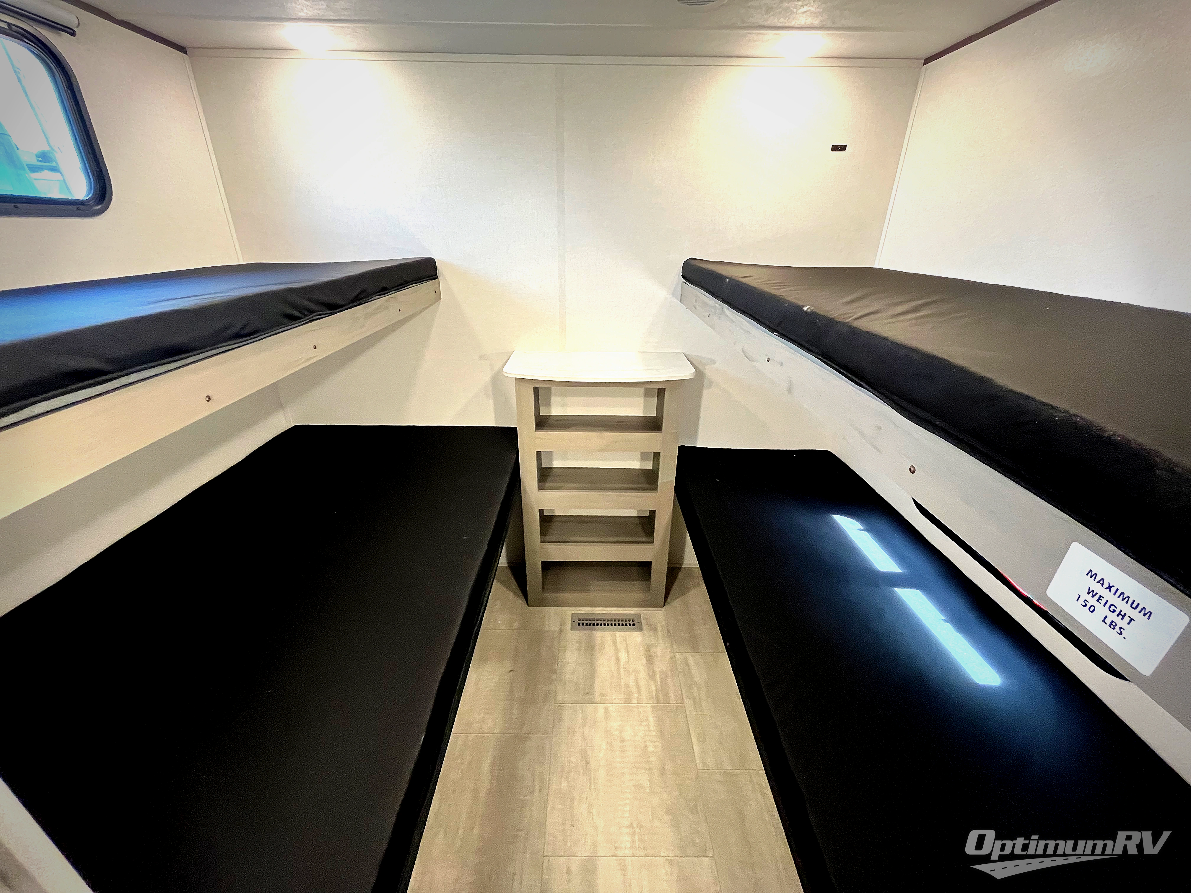 This travel trailer is perfect for weekend excursions or extended getaways at your favorite state park. You will have your own queen bed up front with storage space for your things, and the rear private bunkhouse will be perfect for guests. Here, you'll find a set of bunk beds plus a fold-up bunk over a booth dinette so there is a place to eat or play games back here. The full kitchen will let you cook meals each day, and the 10 cu. ft. refrigerator will keep your food fresh. Outside, a 14' power awning will provide some shade, and an outdoor refrigerator will keep cold drinks close by!