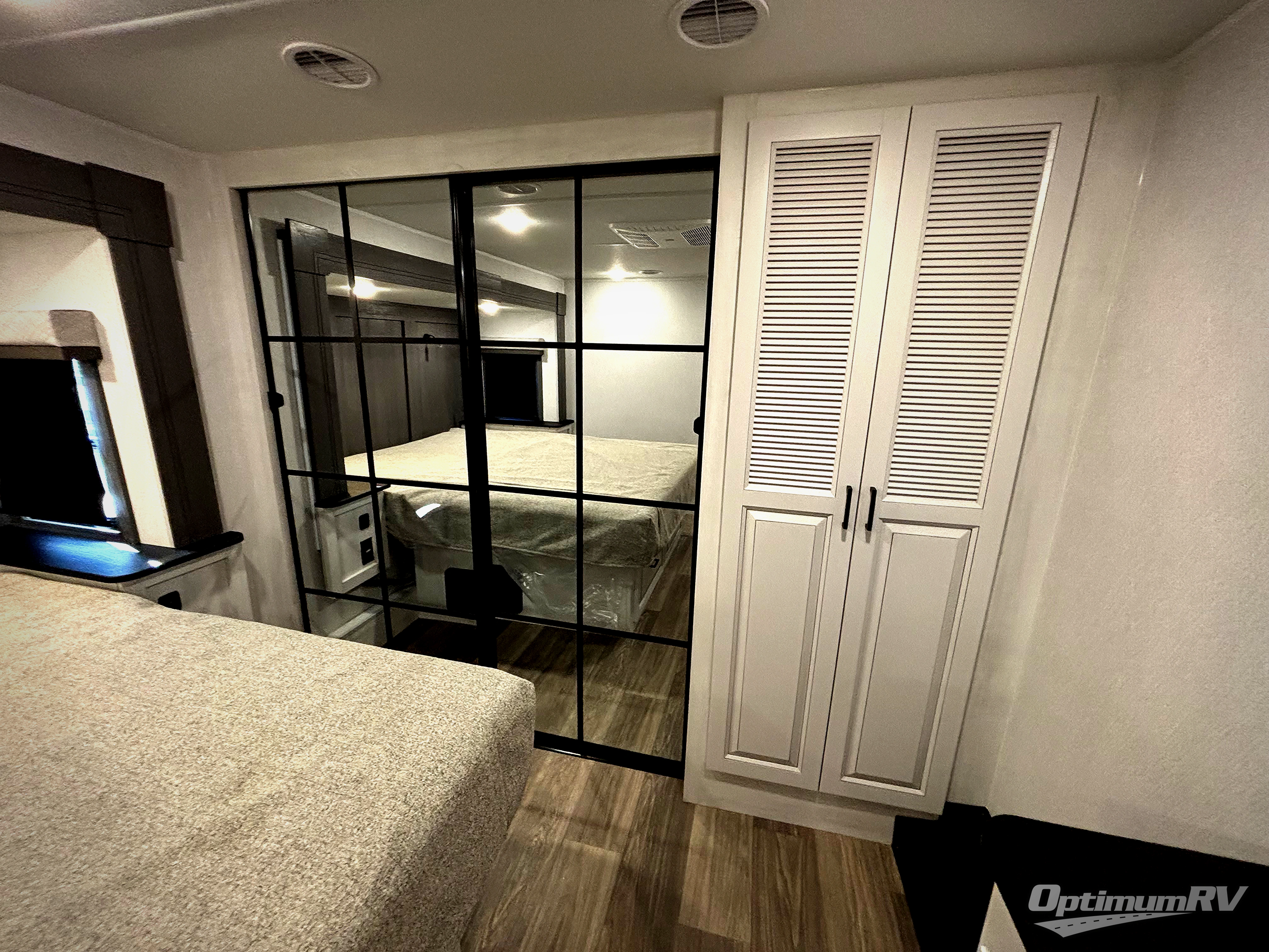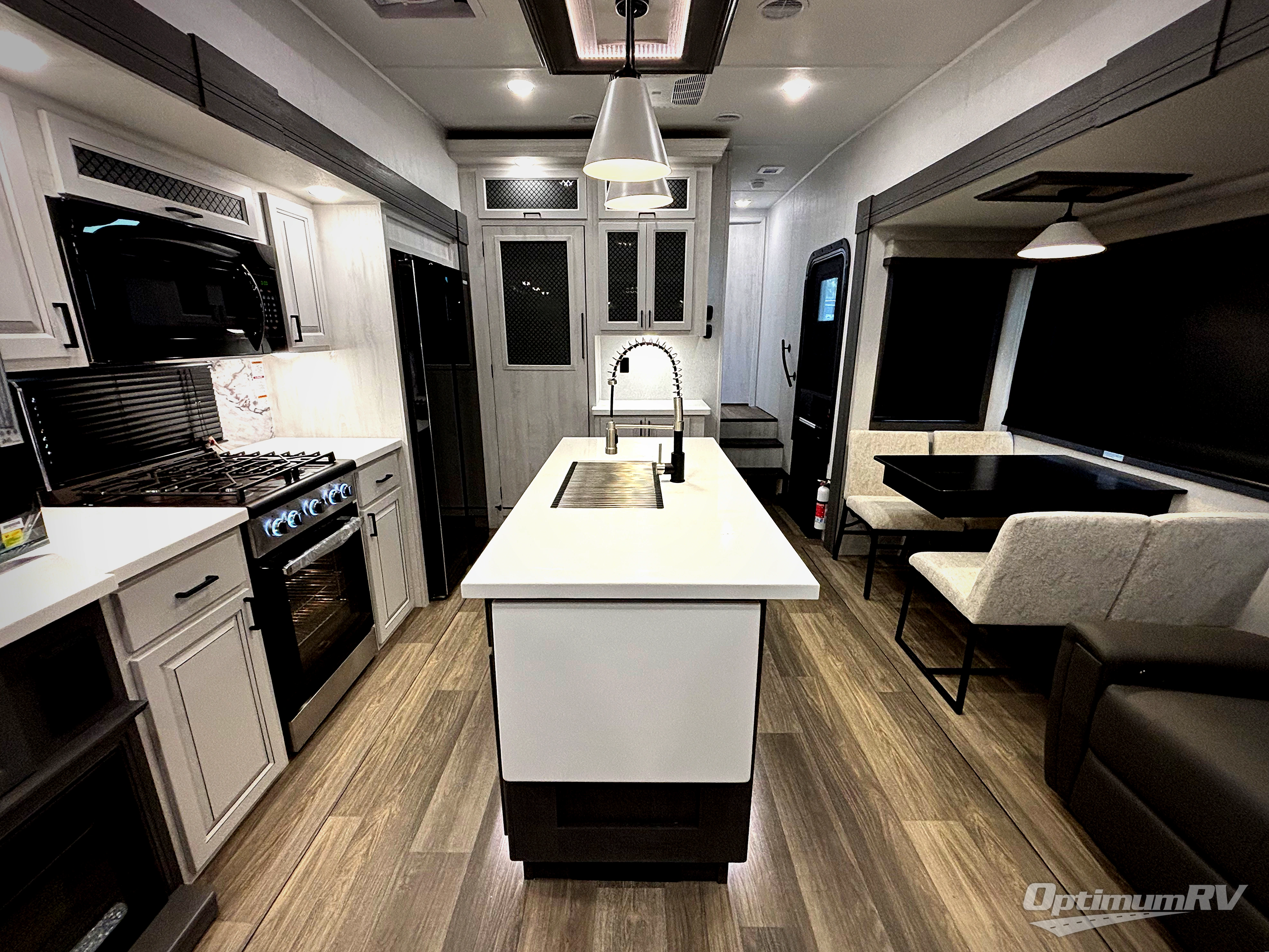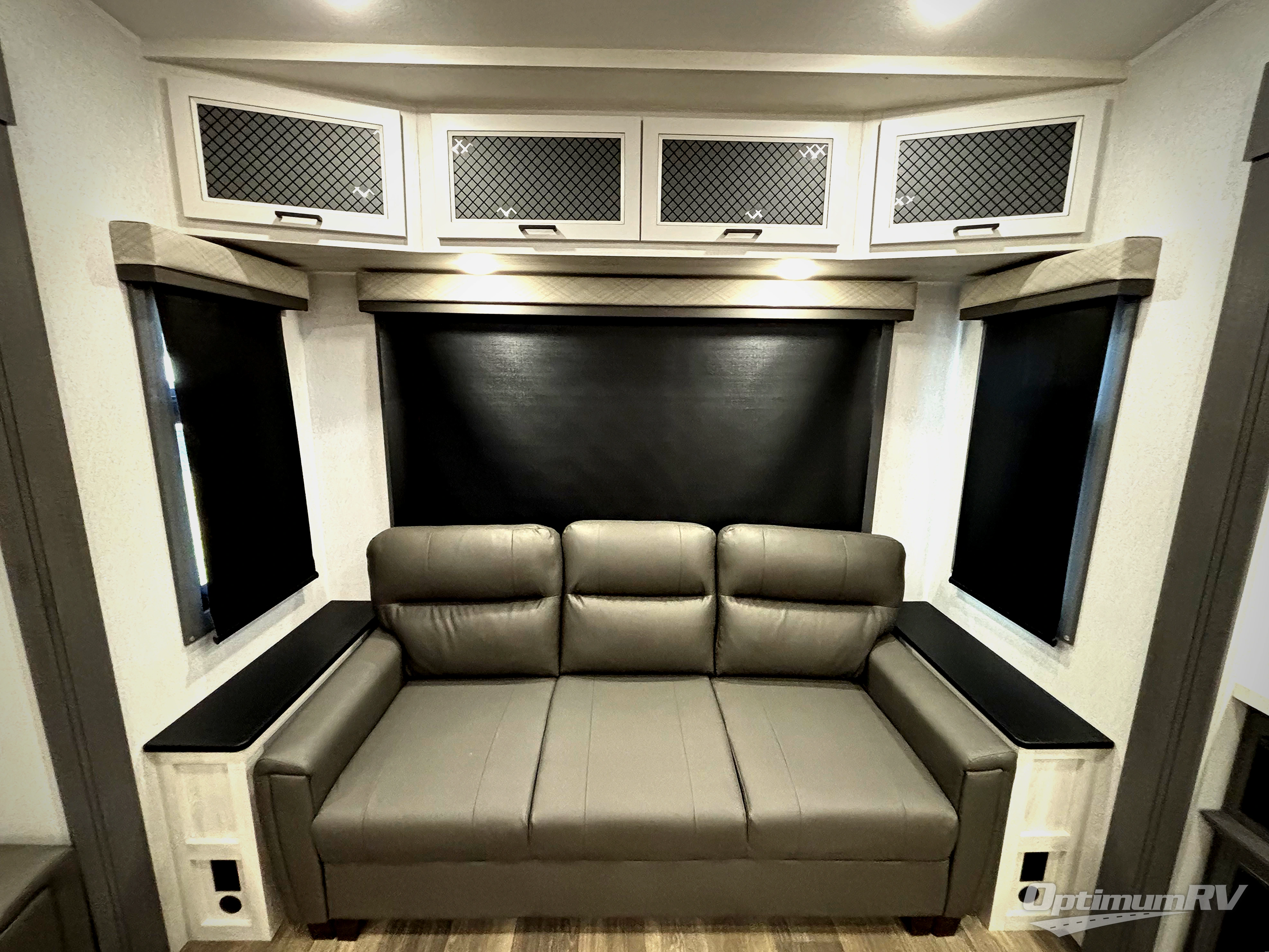 Besides the dimensions and the weights, the only real difference between this Ahara fifth wheel and model 325RL is the bedroom and bathroom configuration. This model offers you a private bedroom that has a king bed slide with drawers under the bed, a sliding dresser top with hidden storage across from the bed, a closet with washer/dryer prep, and a large closet with sliding doors for your clothes. The full bathroom is located right next to the bedroom, and it offers you a dual-sink vanity which is helpful because it allows two people to wash their face and brush their teeth at the same time. The kitchen is quite amazing with its kitchen island with countertop extensions, pantry and hutch, 16-cubic foot 12V refrigerator, and 24" residential oven. As you sit back on the theater seating or 78" sofa, you'll be kept warm by the 5,100 BTU electric fireplace below the TV.