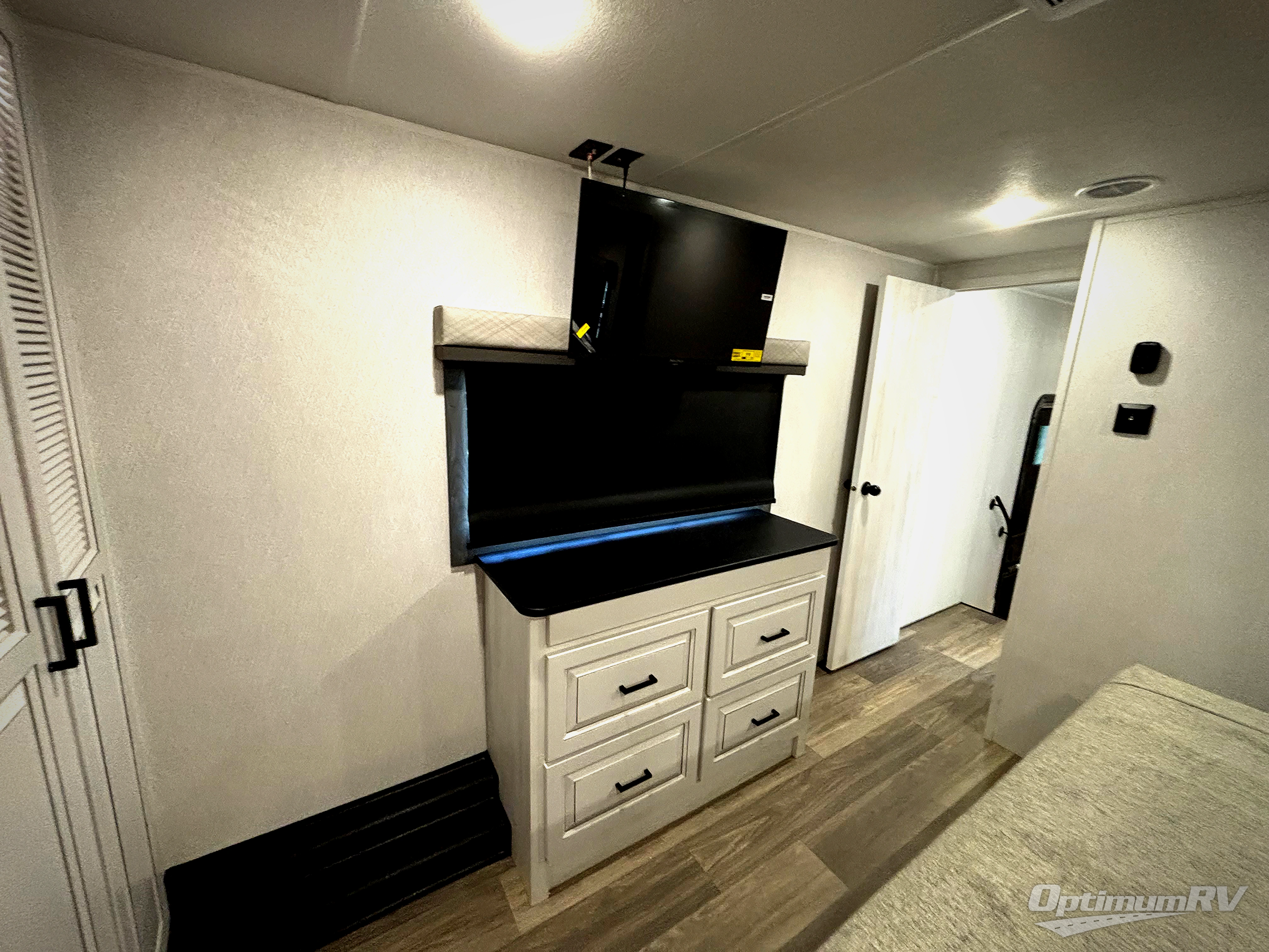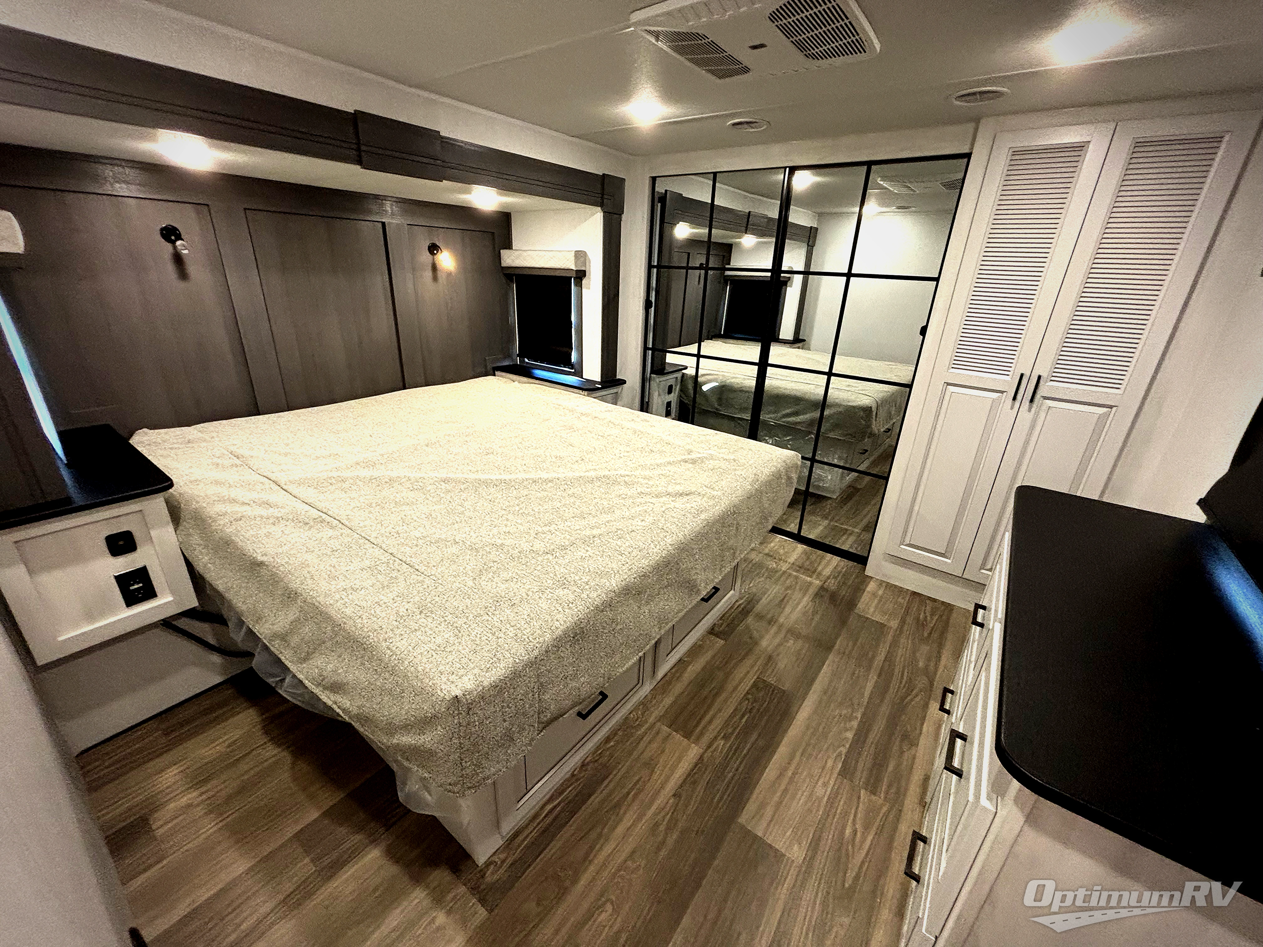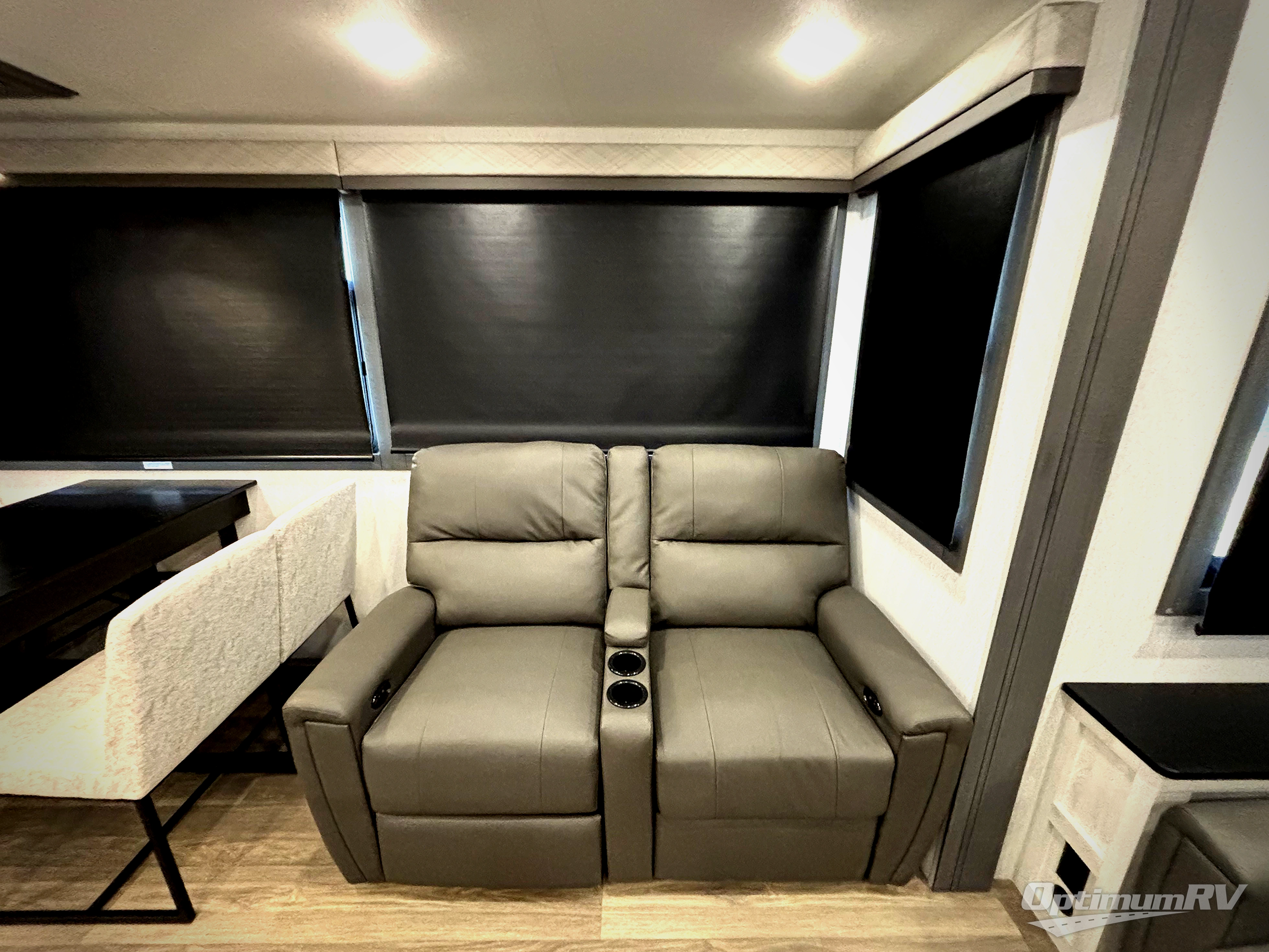Besides the dimensions and the weights, the only real difference between this Ahara fifth wheel and model 325RL is the bedroom and bathroom configuration. This model offers you a private bedroom that has a king bed slide with drawers under the bed, a sliding dresser top with hidden storage across from the bed, a closet with washer/dryer prep, and a large closet with sliding doors for your clothes. The full bathroom is located right next to the bedroom, and it offers you a dual-sink vanity which is helpful because it allows two people to wash their face and brush their teeth at the same time. The kitchen is quite amazing with its kitchen island with countertop extensions, pantry and hutch, 16-cubic foot 12V refrigerator, and 24" residential oven. As you sit back on the theater seating or 78" sofa, you'll be kept warm by the 5,100 BTU electric fireplace below the TV.