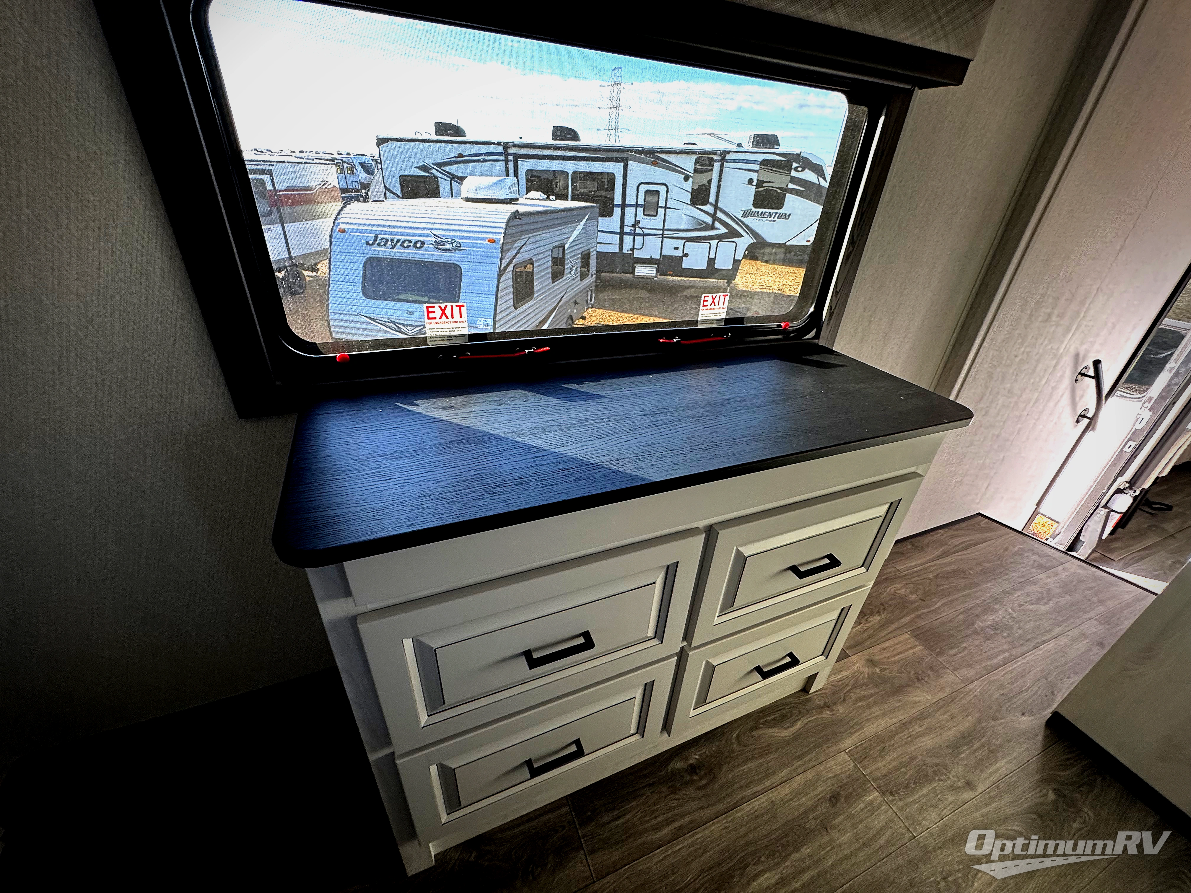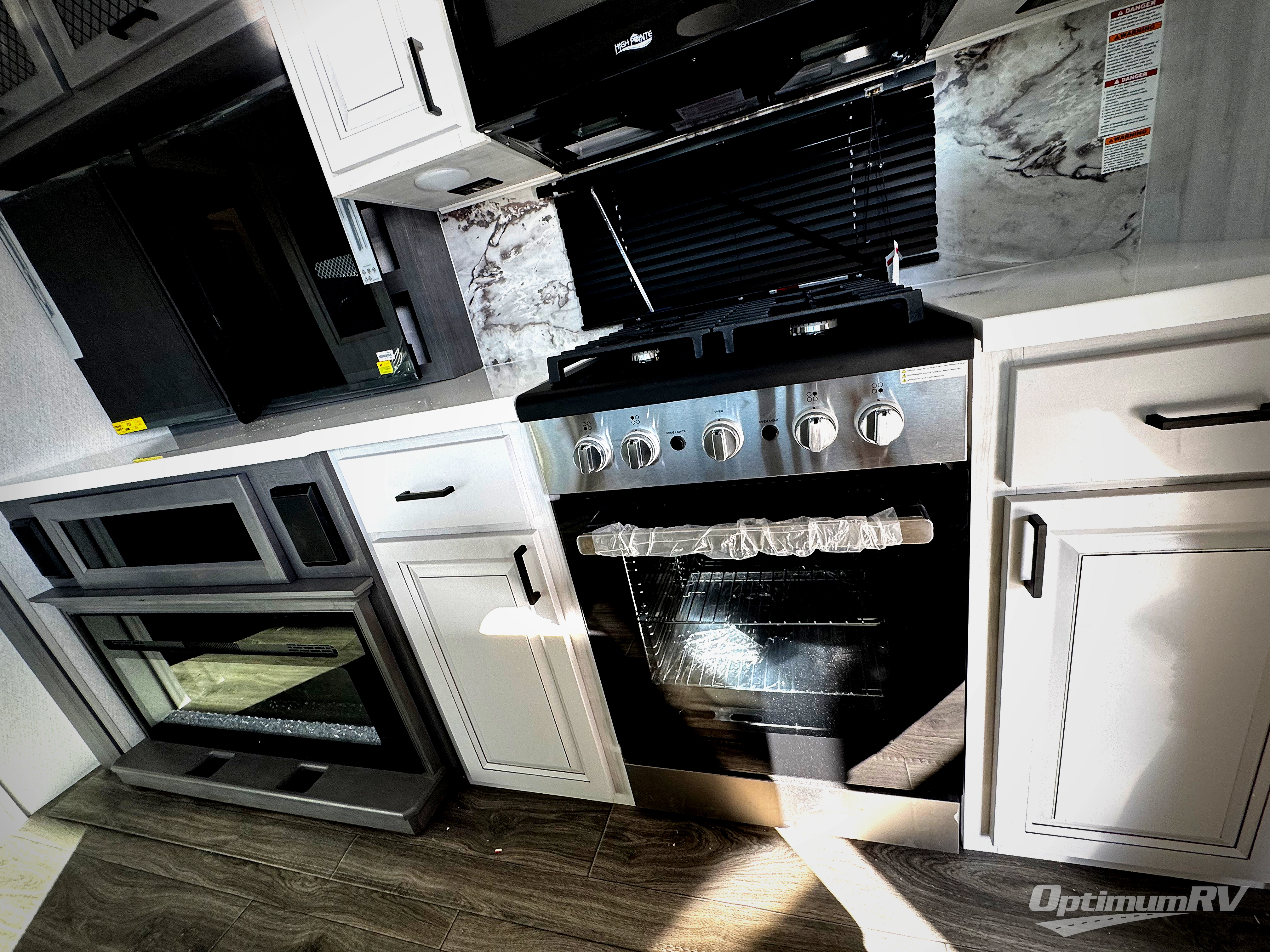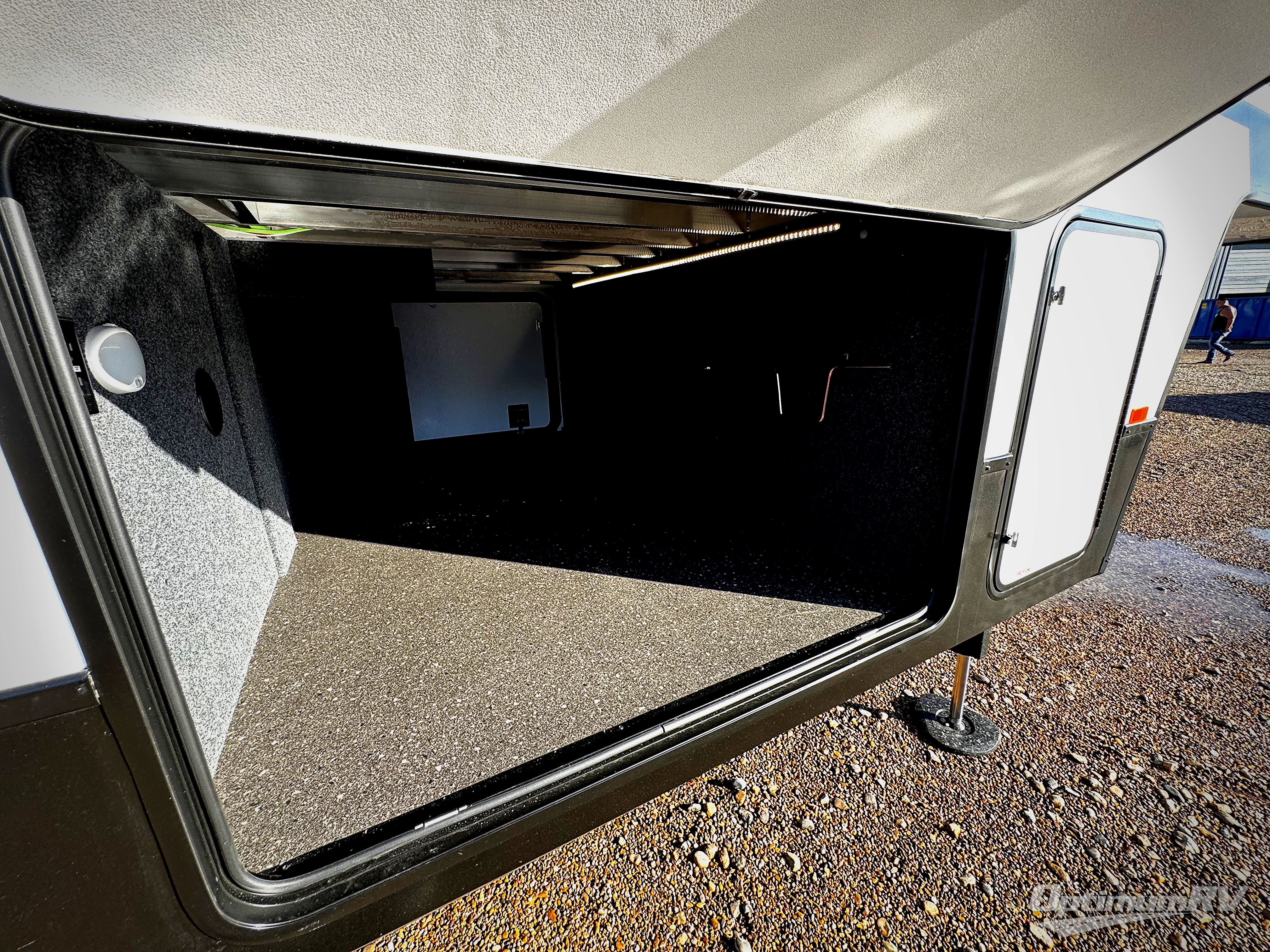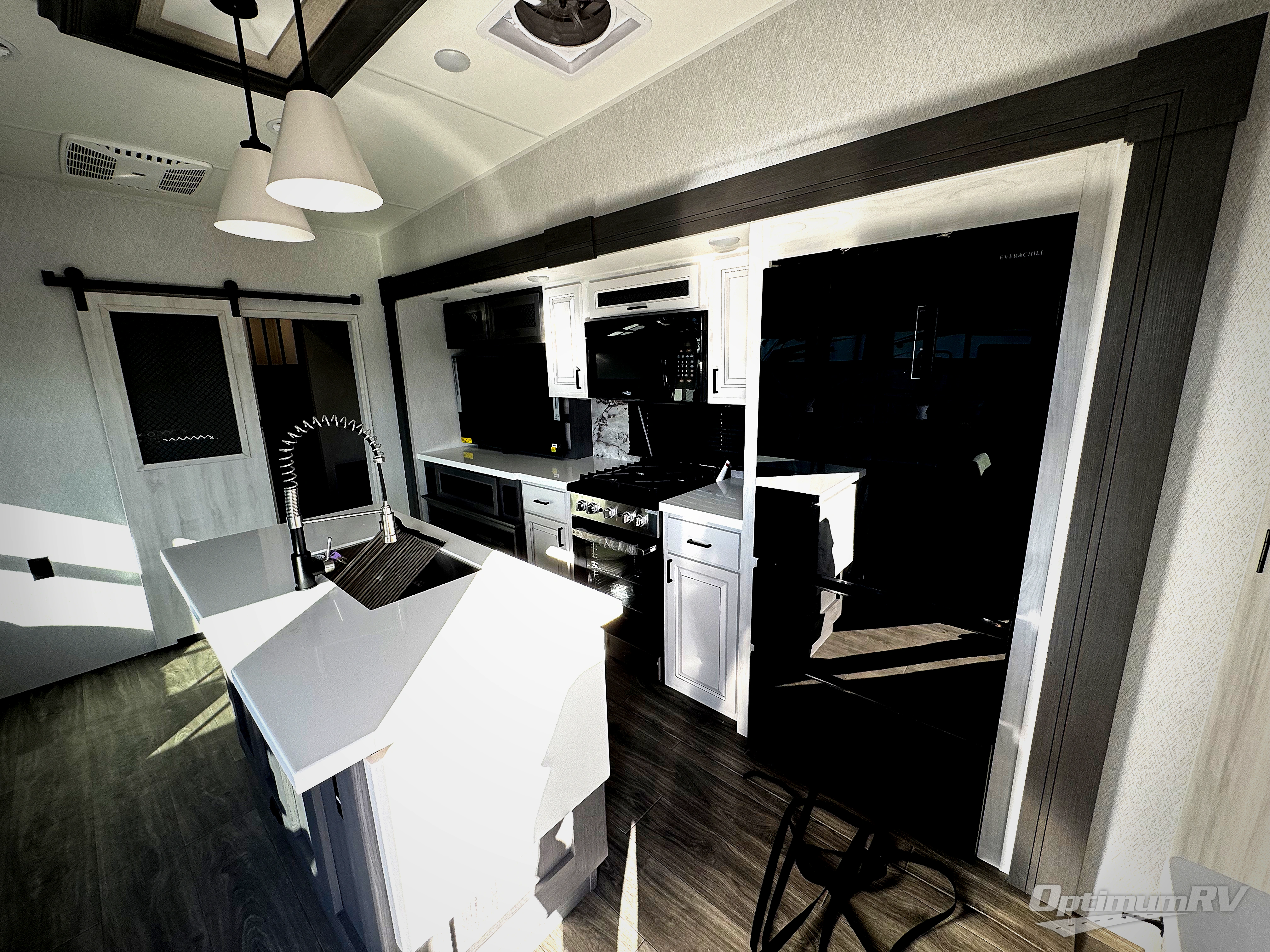 This Ahara fifth wheel is the exact answer to your prayers if you need an RV that provides you with a large private sleeping area for many children or guests! The rear bunkhouse suite has a fold-down bunk, EZ-out sofa, a set of 28" bunks, and a 54" x 72" bunk, so it can easily sleep five. Plus, it also has its very own half bathroom which makes it extremely easy for your kids to use the bathroom at night or get ready in the morning, and the second exterior entry door is also included in this space. You'll have your own bedroom to retreat to at the front, and this space includes a king bed slide with drawers under the bed, sliding dresser top with hidden storage and TV, closet to keep clothes tidy, plus a second closet with washer/dryer prep! The chef of your group will love the spacious kitchen with its kitchen island with countertops extensions, a 24" residential oven with a four burner cooktop, a spacious pantry, plus a 16 cu. ft. 12V French door refrigerator with a double drawer freezer.