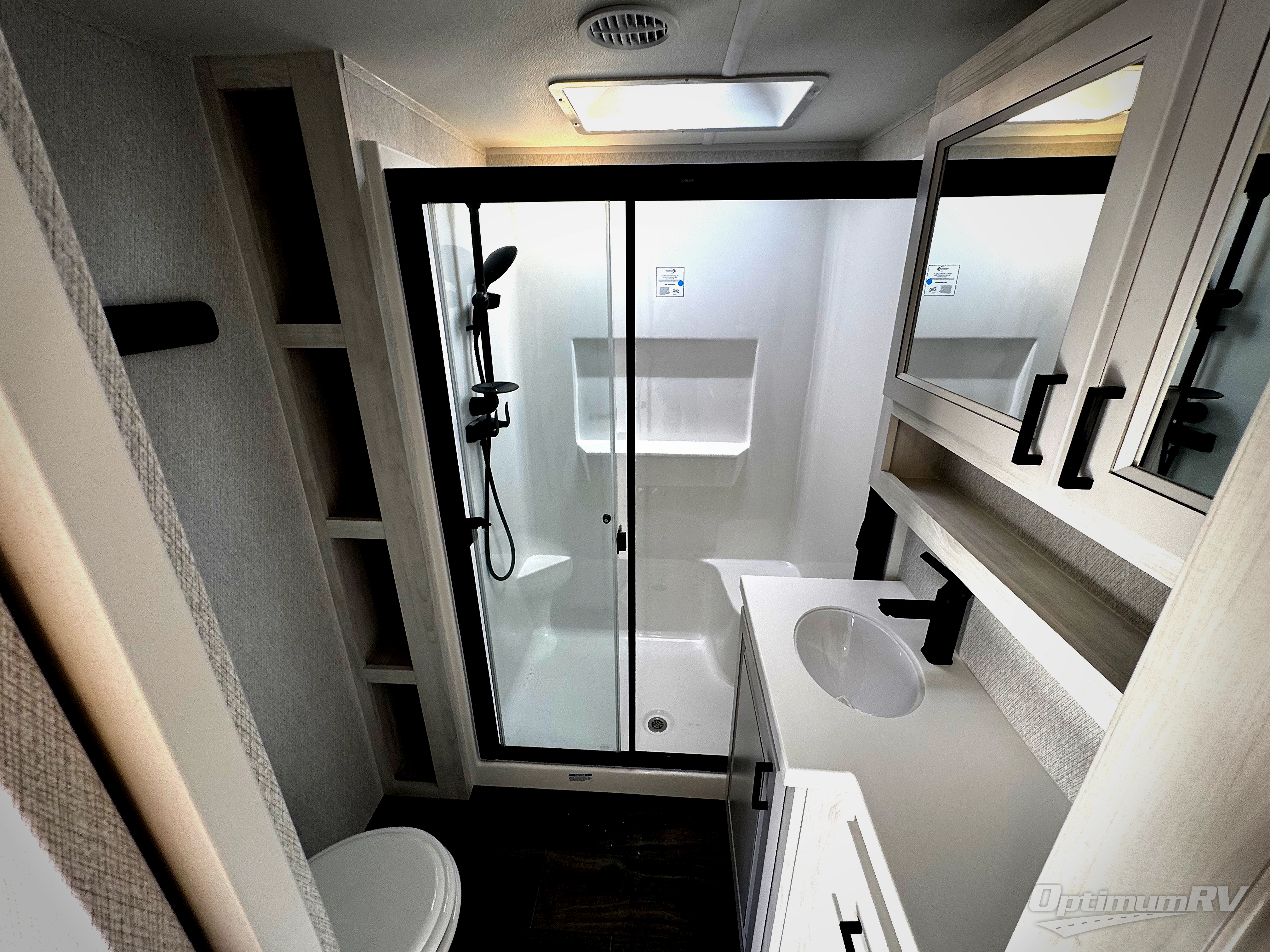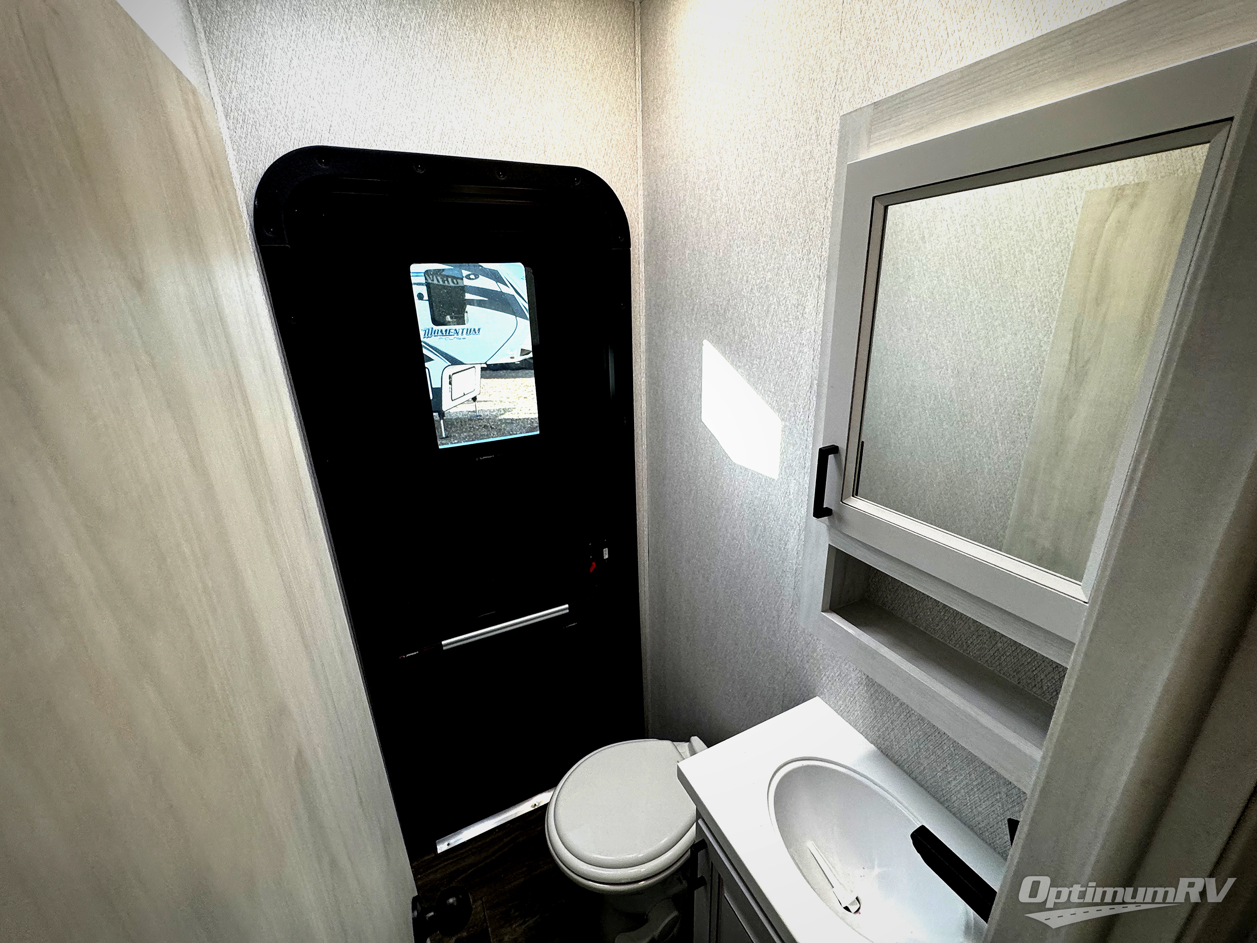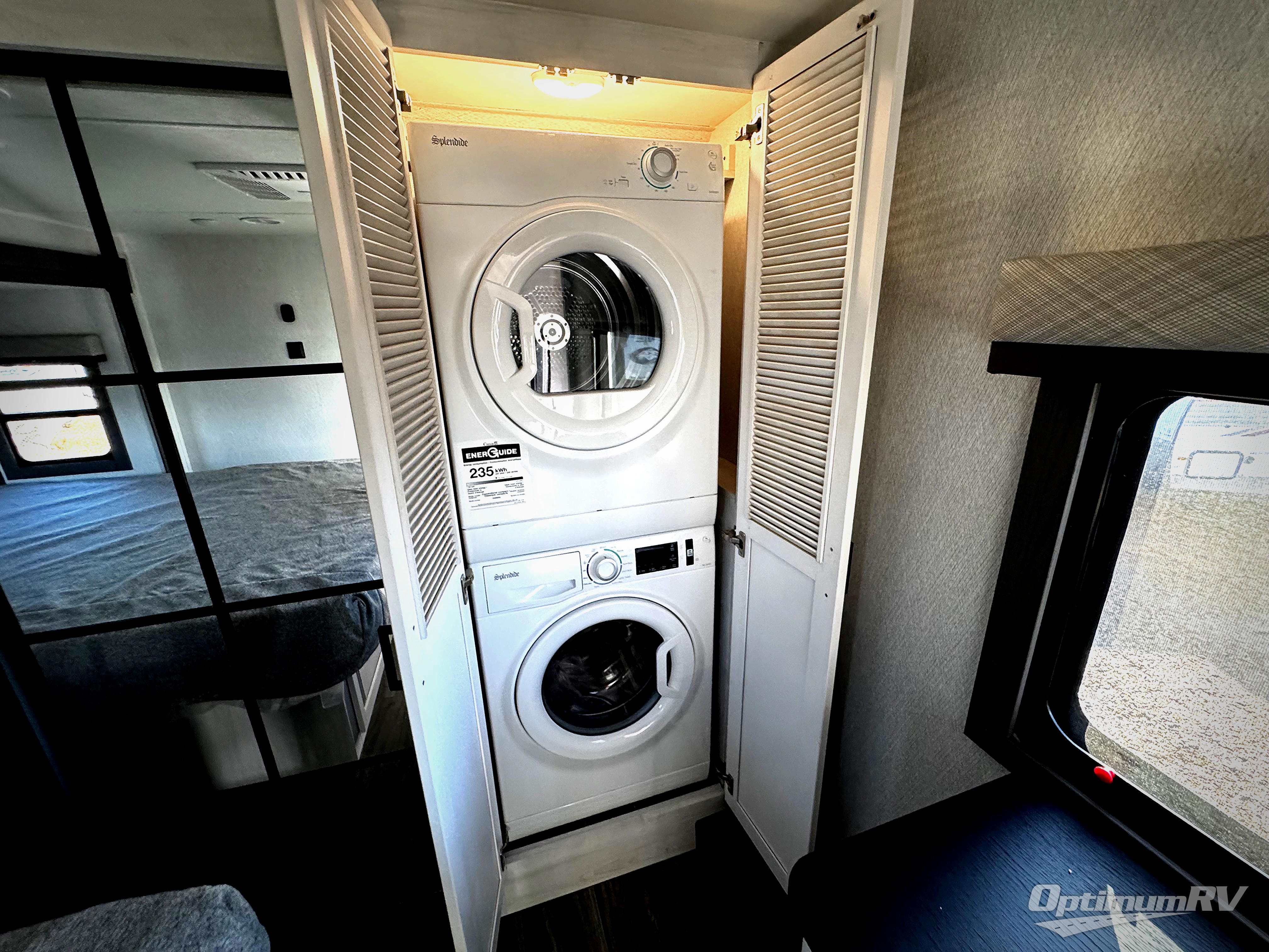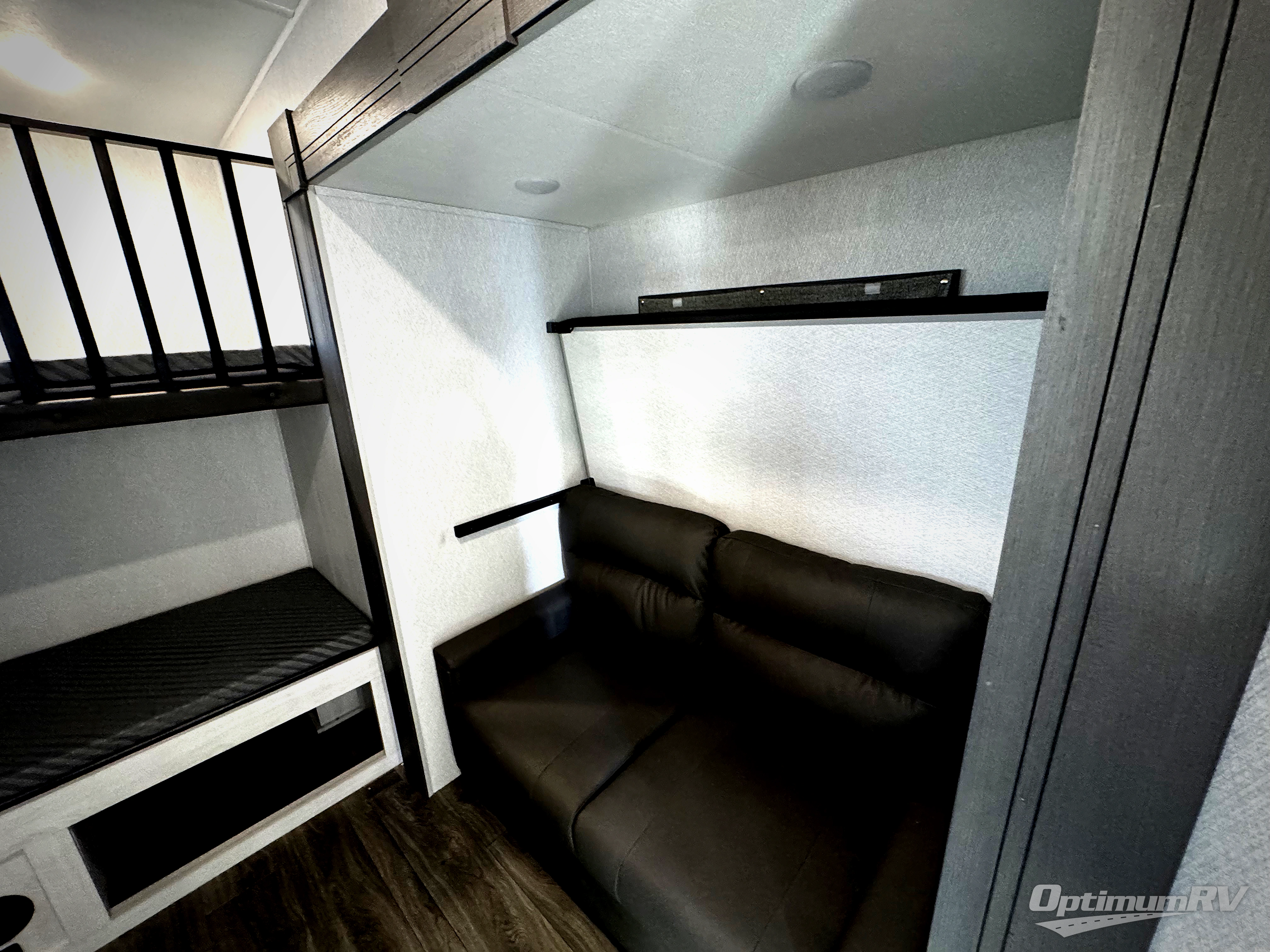 This Ahara fifth wheel is the exact answer to your prayers if you need an RV that provides you with a large private sleeping area for many children or guests! The rear bunkhouse suite has a fold-down bunk, EZ-out sofa, a set of 28" bunks, and a 54" x 72" bunk, so it can easily sleep five. Plus, it also has its very own half bathroom which makes it extremely easy for your kids to use the bathroom at night or get ready in the morning, and the second exterior entry door is also included in this space. You'll have your own bedroom to retreat to at the front, and this space includes a king bed slide with drawers under the bed, sliding dresser top with hidden storage and TV, closet to keep clothes tidy, plus a second closet with washer/dryer prep! The chef of your group will love the spacious kitchen with its kitchen island with countertops extensions, a 24" residential oven with a four burner cooktop, a spacious pantry, plus a 16 cu. ft. 12V French door refrigerator with a double drawer freezer.