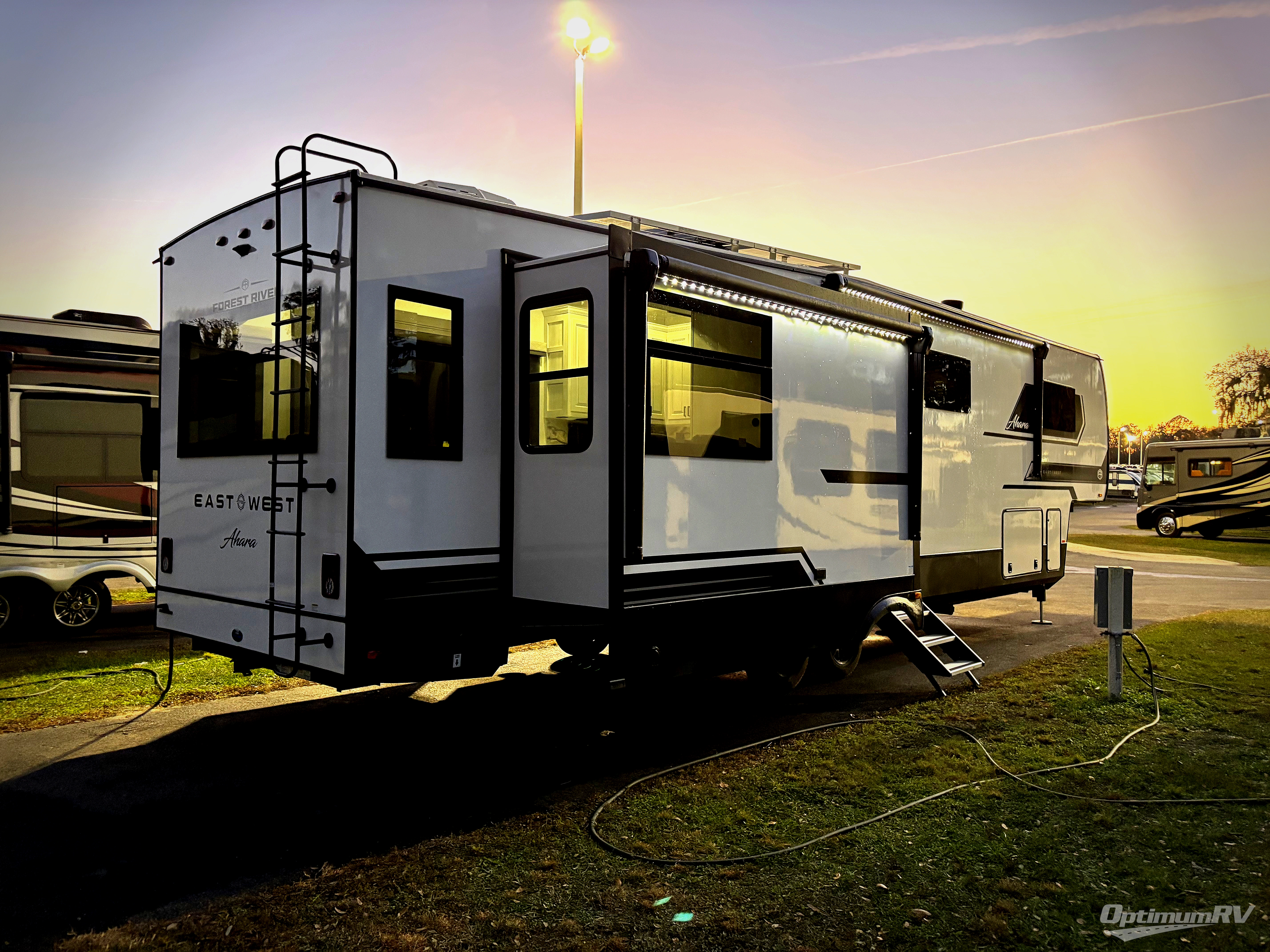 There is just too much luxury to name on the EAST TO WEST Ahara fifth wheel! These units are quite impressive, and once you see them, you'll know what we mean. The Ahara first grabs your attention with its fully painted aerodynamic fiberglass front cap, 102" wide-body chassis, and deep tint square frameless windows. For towing, you'll find a MORryde CRE 3000 suspension, LED marker lights, LED taillights with back-up lights, and rear view camera prep. Traveling in different climates is also made easy with the high-efficiency triple A/C system, 40,000 BTU high-capacity furnace, plus heated, insulated, and enclosed underbelly found within the Climate Package. Head inside to enjoy Slow Rise roller shades, a flush floor kitchen slide to help prevent trips, and solid surface countertops in the kitchen and bath to name a few luxuries!