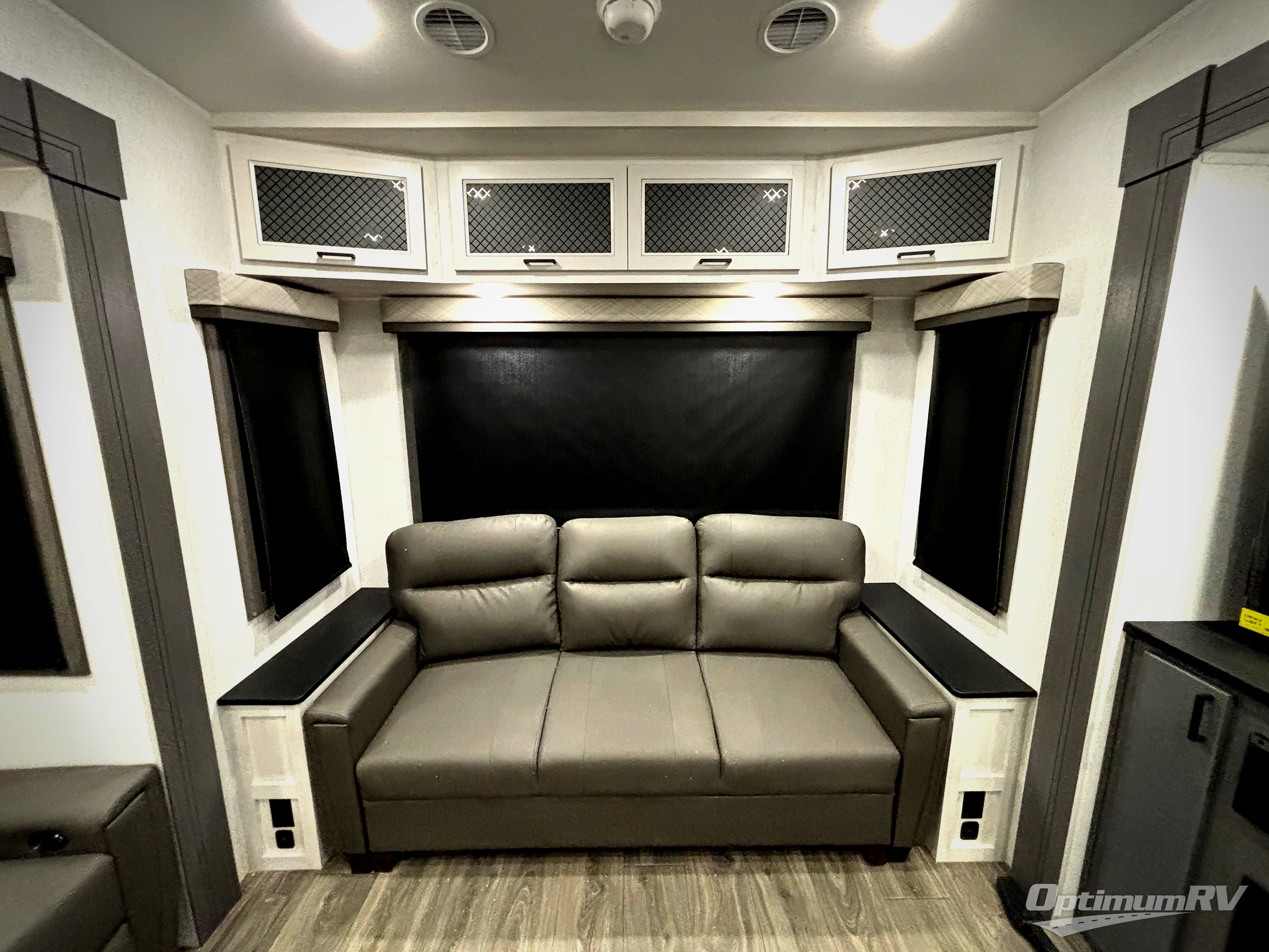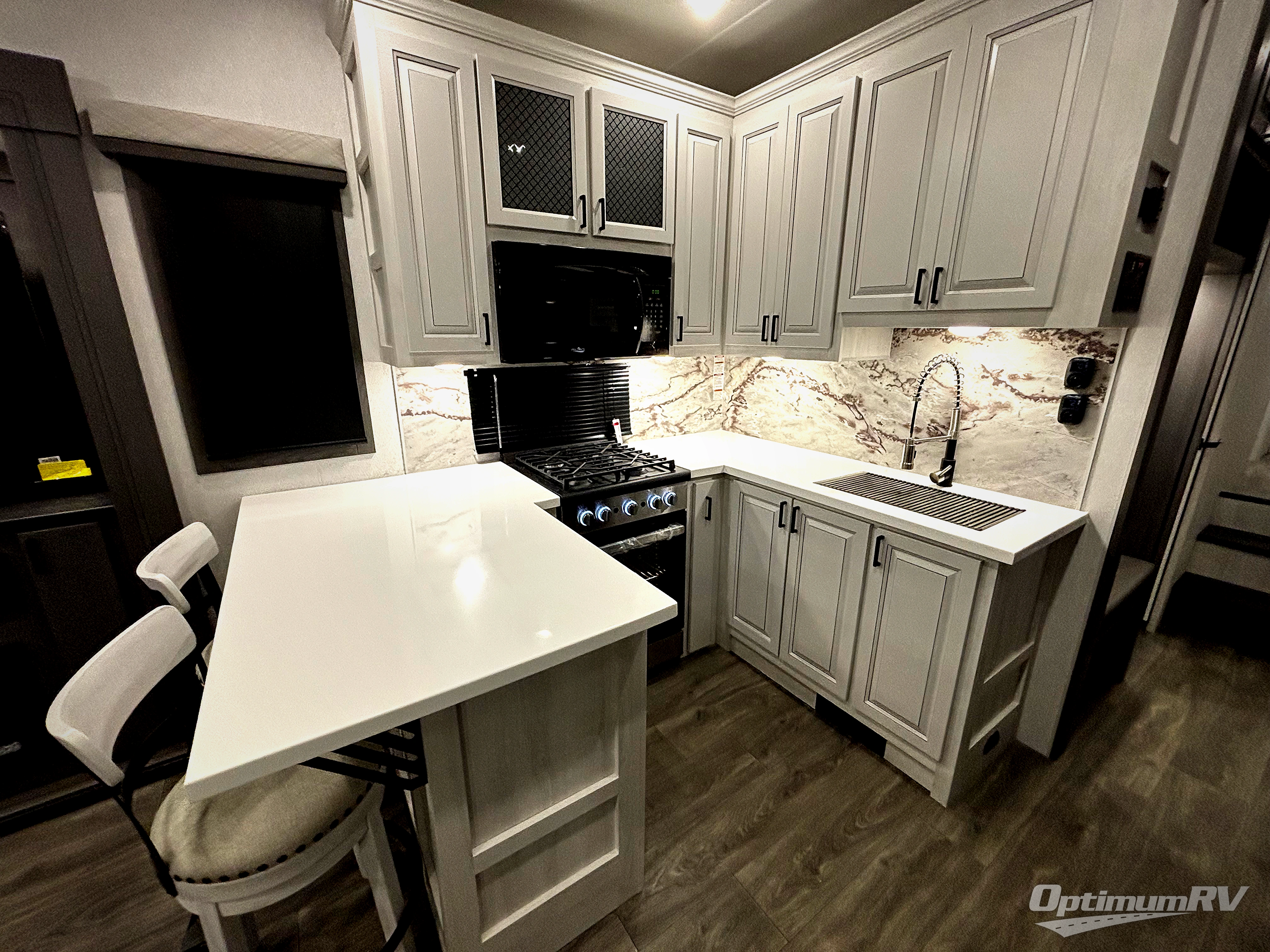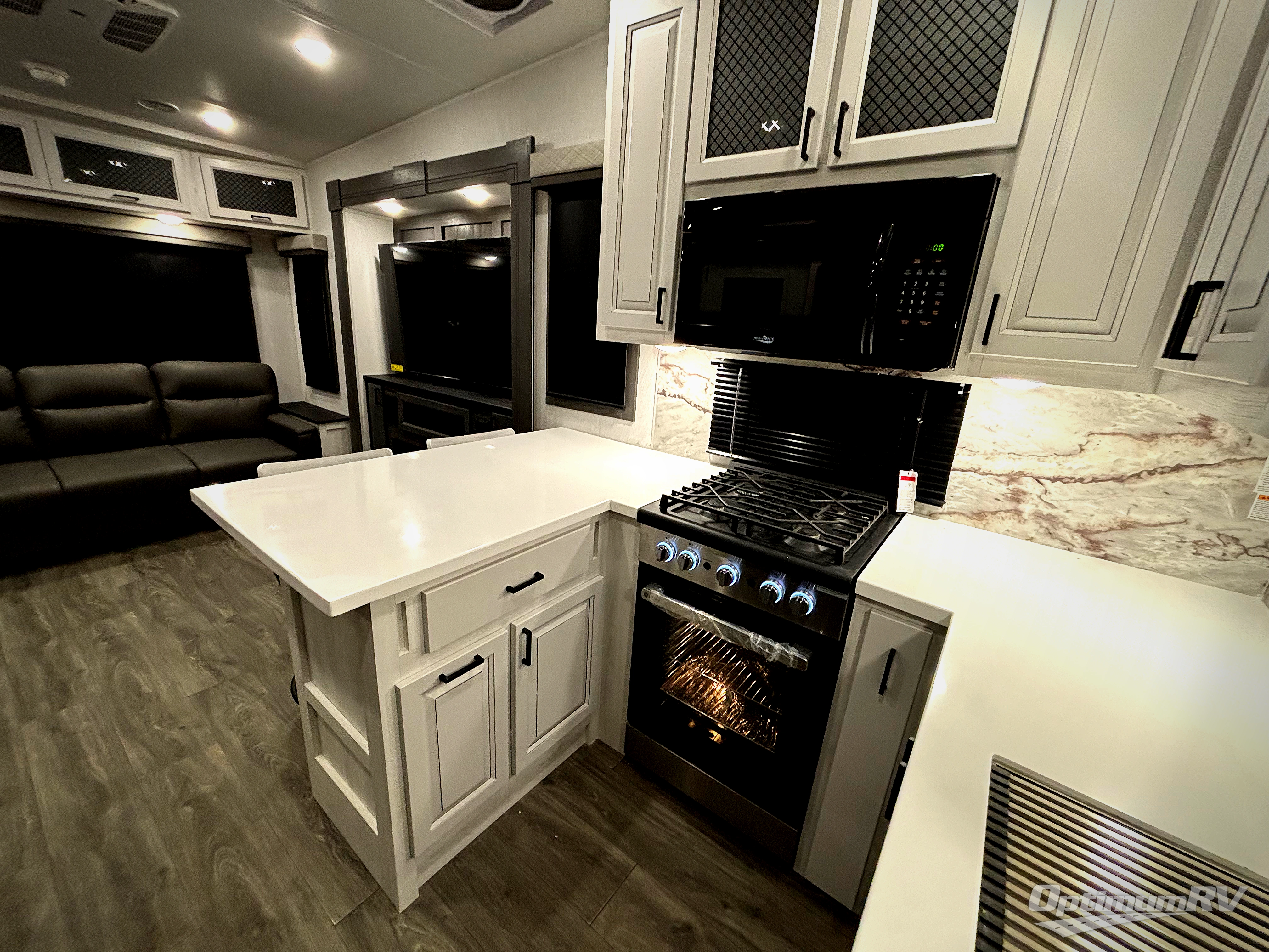 Head to the lake in this spacious fifth wheel for four! You will love the front private bedroom with a king bed slide out, sliding dresser top with hidden storage, and front closet to keep your clothes organized. The full bath is right next to the bedroom for easy access at night, and you're going to love having the utility room in this unit. There is stackable washer and dryer prep, a desk or laundry table, plus a sink with a mirror, making this room multi-functional! A full kitchen includes a u-shaped counter, a four burner range and an over-the-range microwave, plus a 16 cu. ft. refrigerator and walk-in pantry with a coffee bar and shelves. There is also a breakfast bar with seating here where you can visit with the chef while dinner is being made. Last but not least, the rear living area will be a favorite place to hang out with theater seating, a rear 78" EZ out sofa, and a TV with a fireplace!