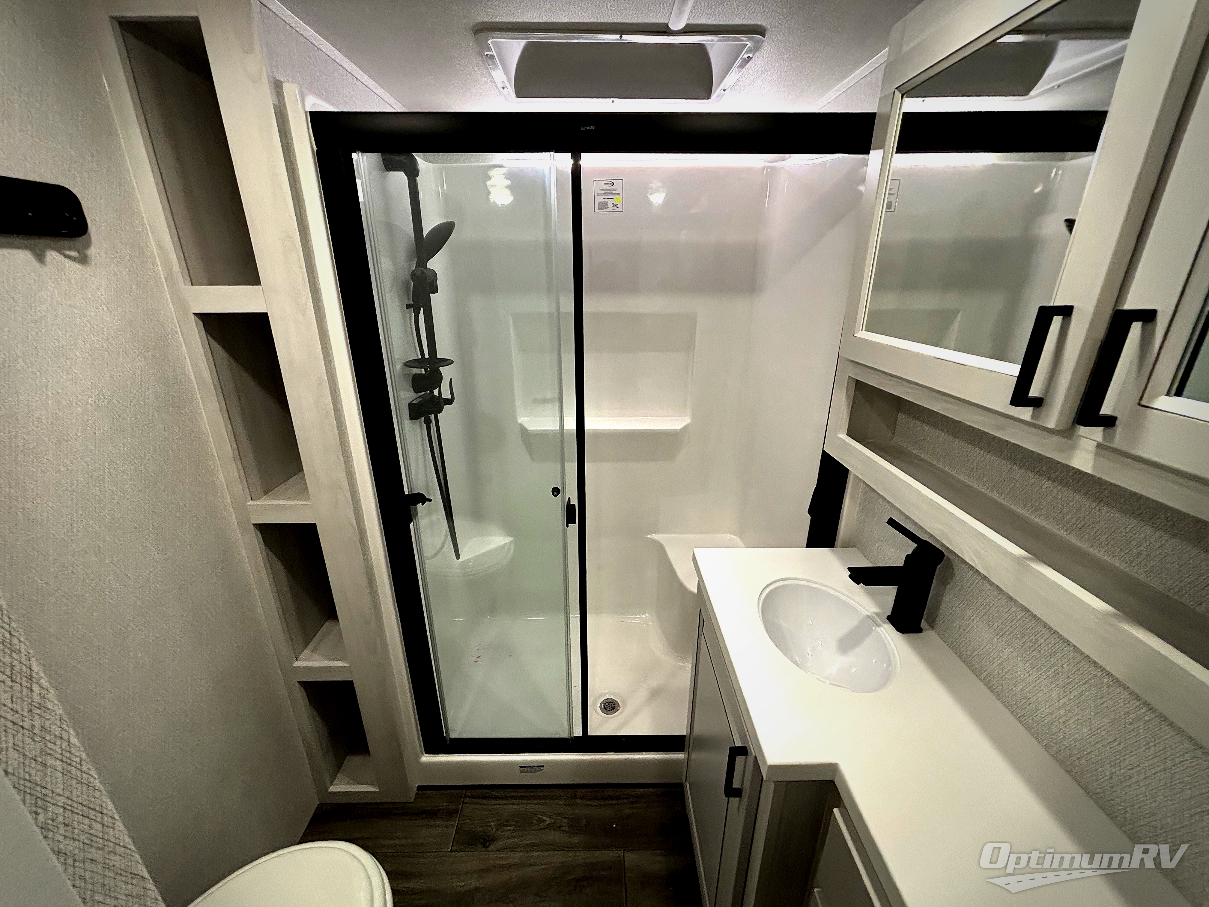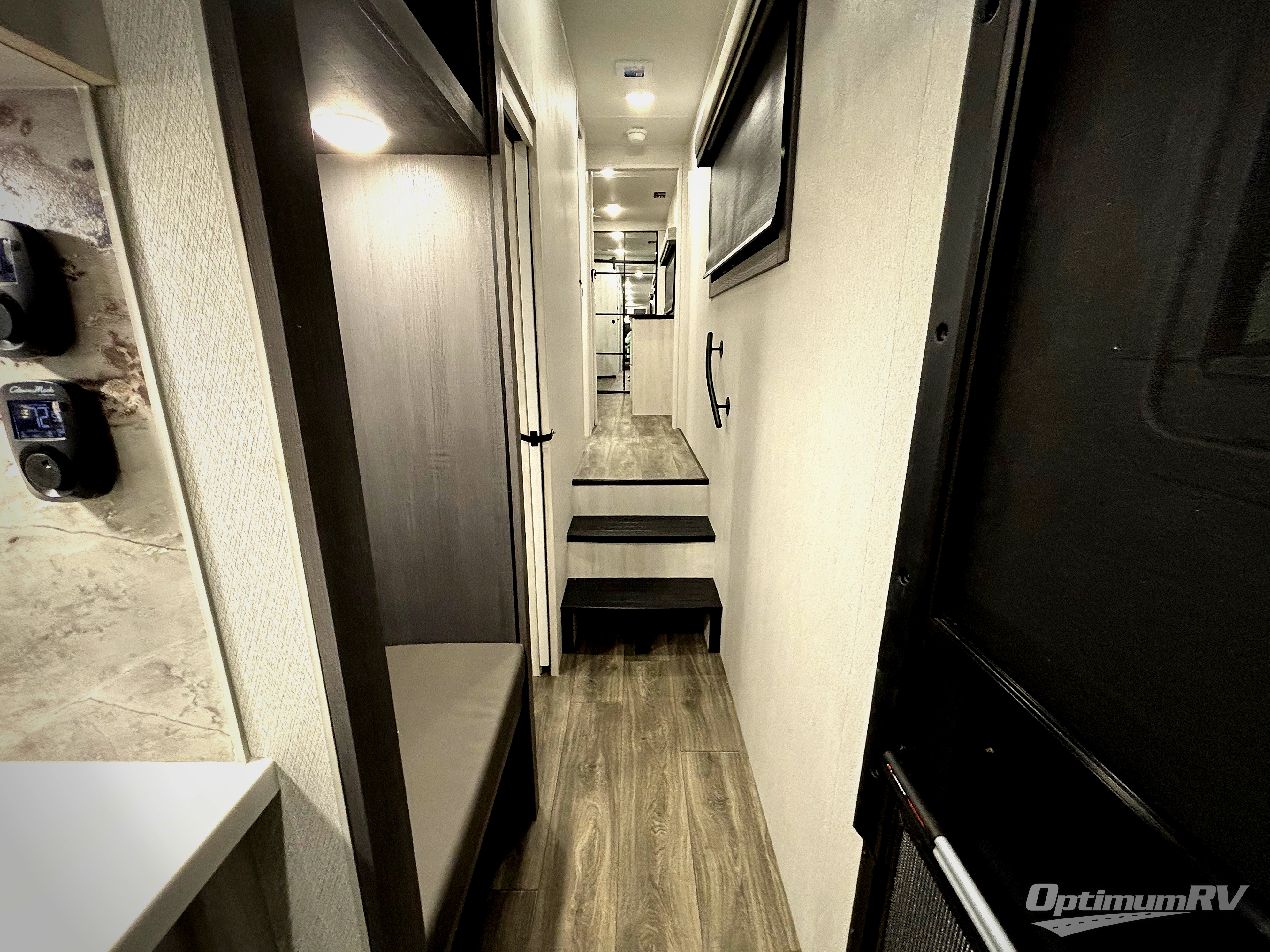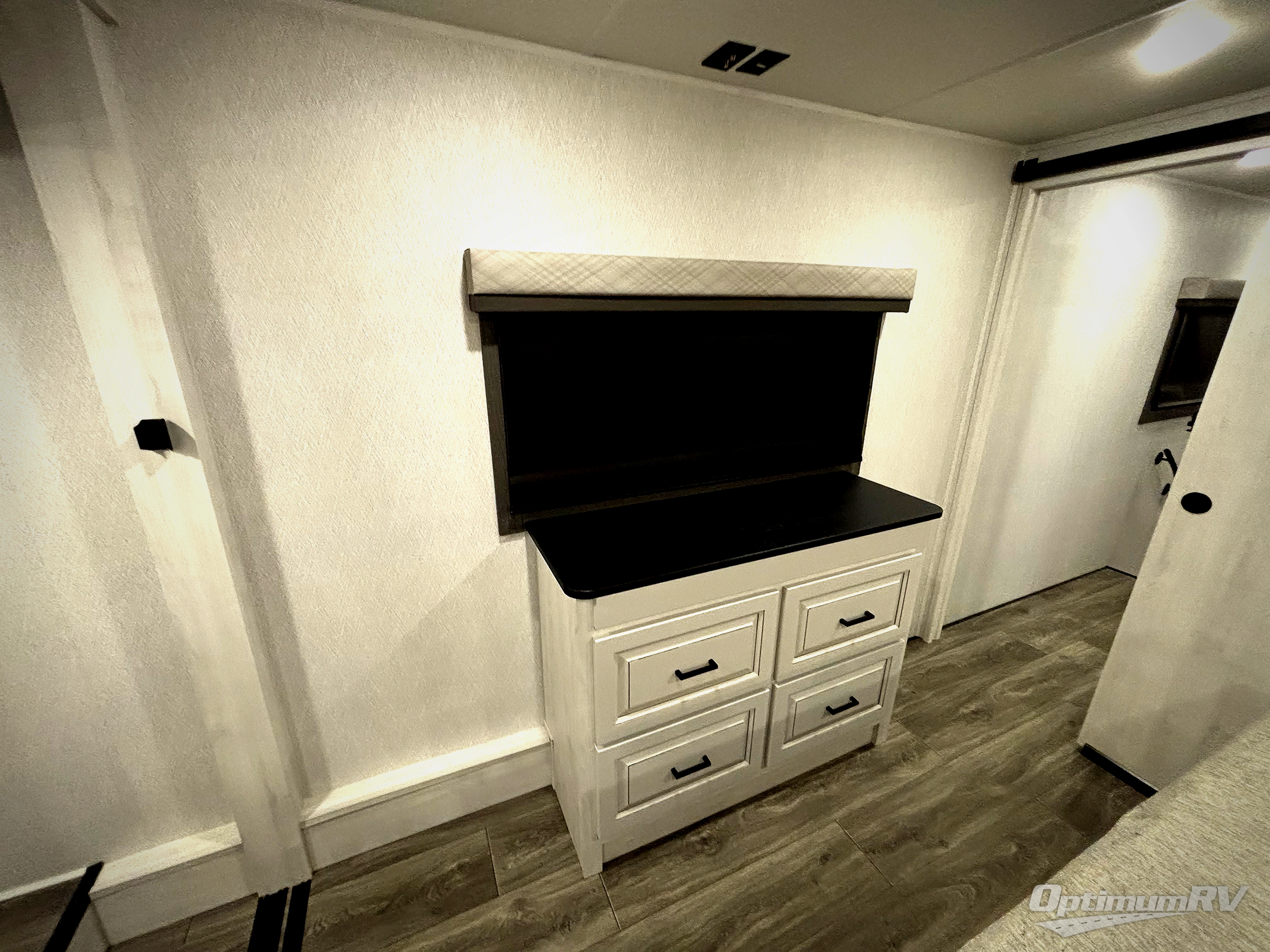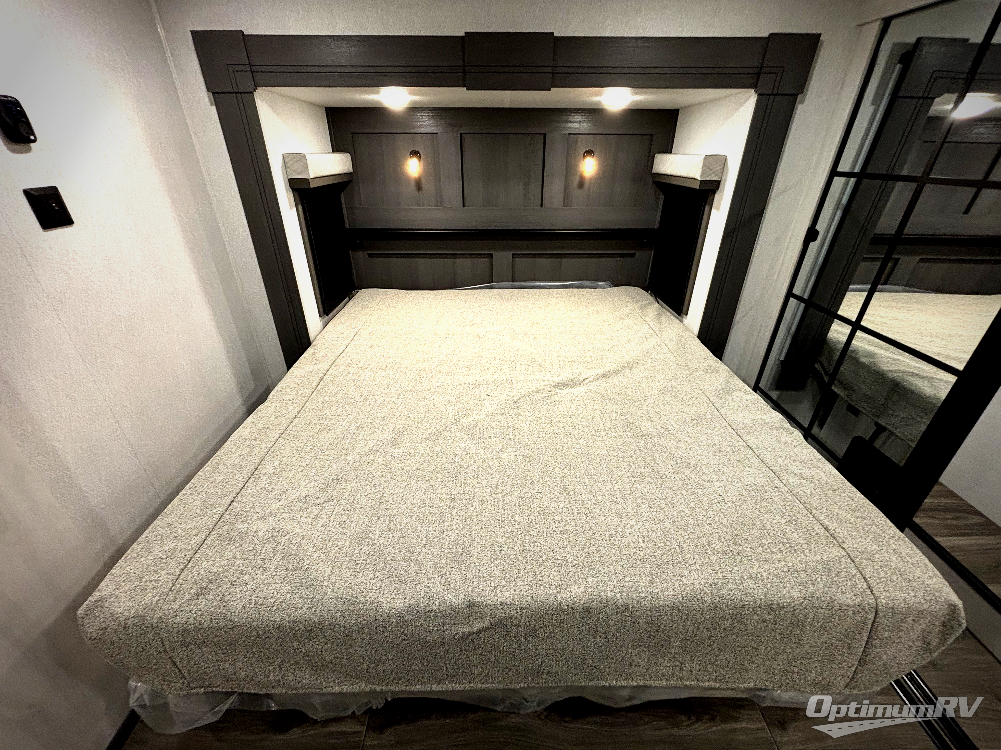 Head to the lake in this spacious fifth wheel for four! You will love the front private bedroom with a king bed slide out, sliding dresser top with hidden storage, and front closet to keep your clothes organized. The full bath is right next to the bedroom for easy access at night, and you're going to love having the utility room in this unit. There is stackable washer and dryer prep, a desk or laundry table, plus a sink with a mirror, making this room multi-functional! A full kitchen includes a u-shaped counter, a four burner range and an over-the-range microwave, plus a 16 cu. ft. refrigerator and walk-in pantry with a coffee bar and shelves. There is also a breakfast bar with seating here where you can visit with the chef while dinner is being made. Last but not least, the rear living area will be a favorite place to hang out with theater seating, a rear 78" EZ out sofa, and a TV with a fireplace!