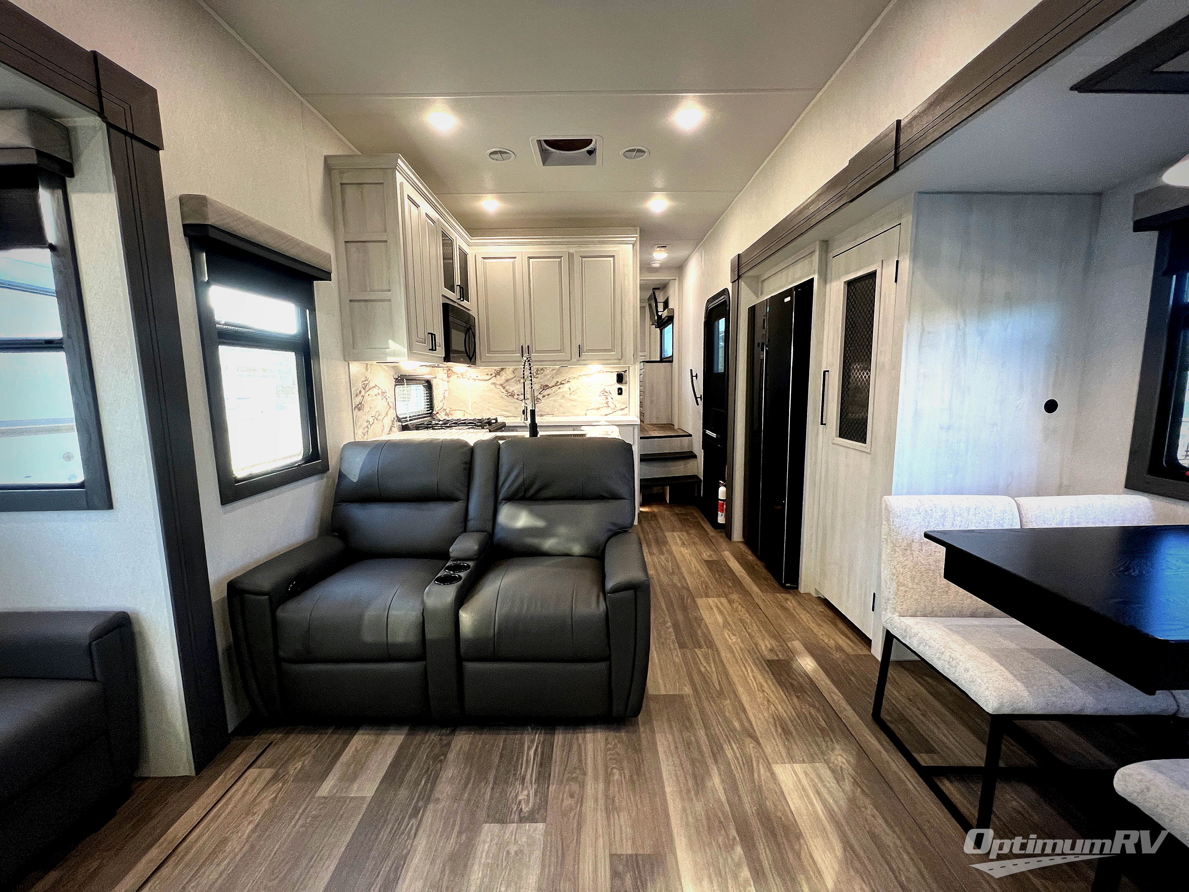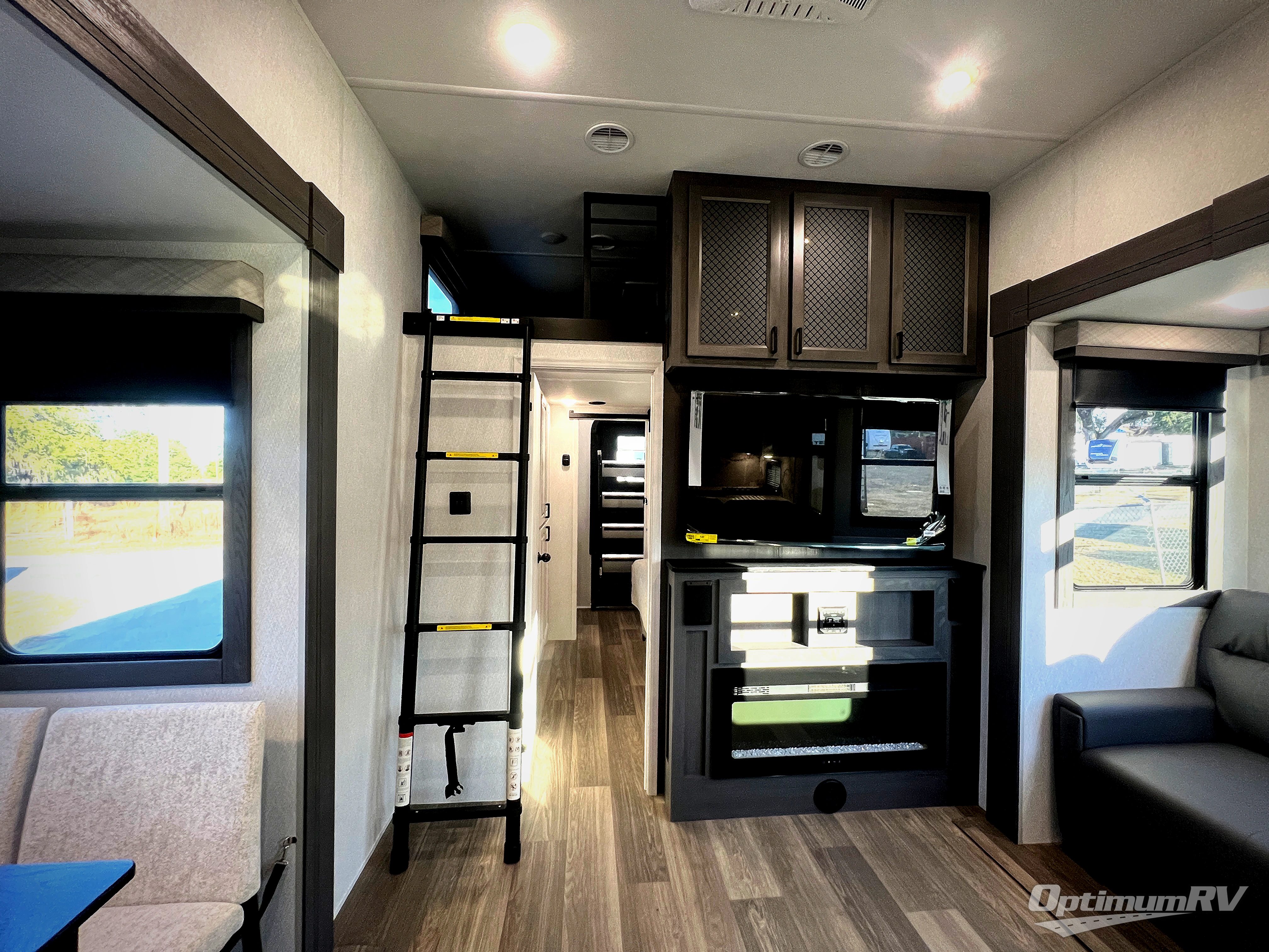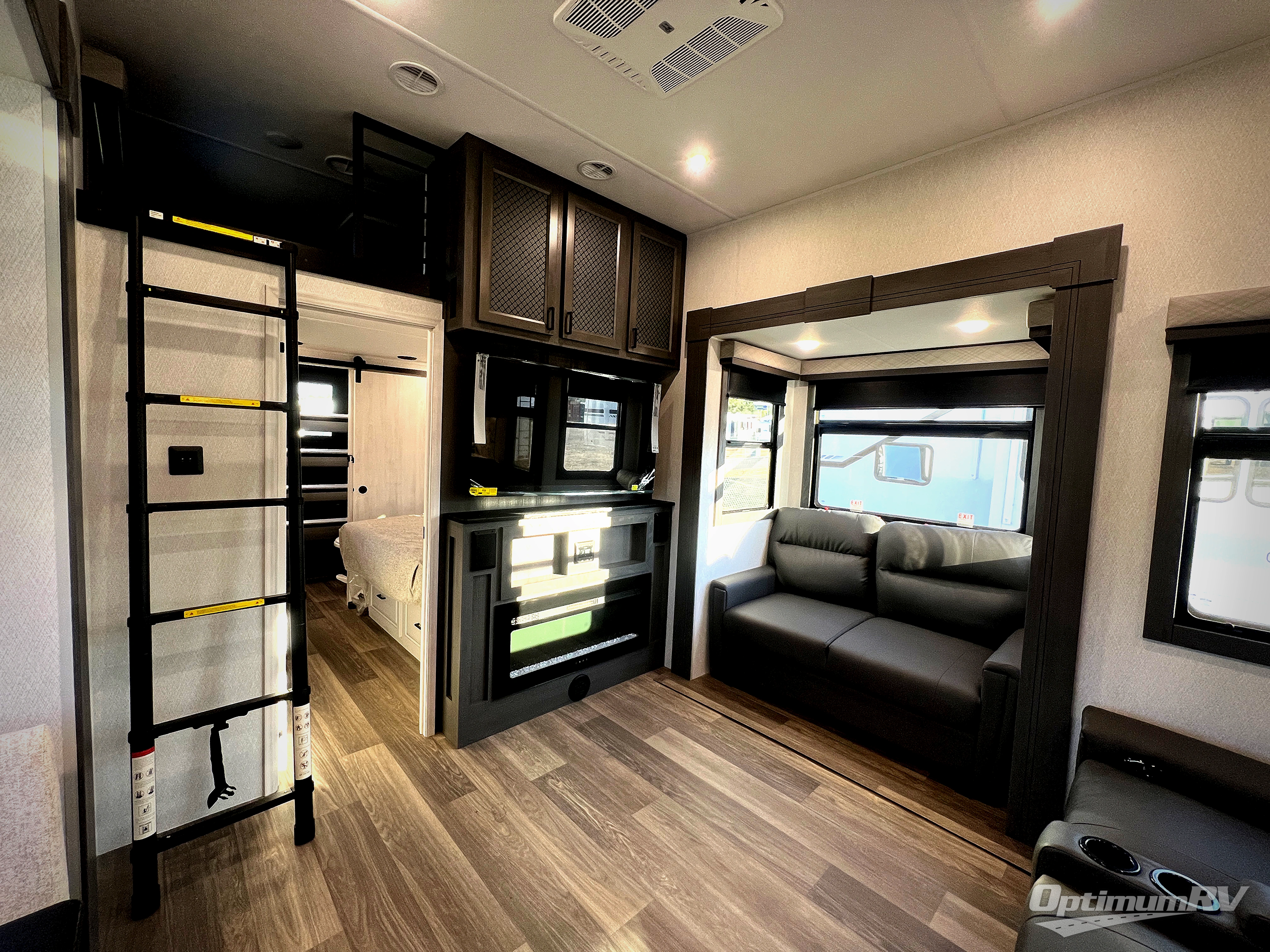 If you enjoy camping with a larger group of family or friends, this dual entry fifth wheel is for you! There is a front bedroom with a king bed slide and storage, plus a second bedroom in the back, complete with a full rear bath, a queen bed slide and storage space. A loft with a ladder is above the rear bedroom, which includes two bunk mats, loft cabinets, and TV prep if the little ones want to watch movies at night. Head to the middle of the unit to enjoy cooking on the four burner range and utilizing the generous counter space in the kitchen. There is also a walk-in pantry with a coffee bar and shelves, plus a 16 cu. ft. 12V refrigerator for food storage. Theater seating in the living room is in direct view of the TV and fireplace, and there is a tri-fold sofa slide out here as well for even more seating and sleeping space!