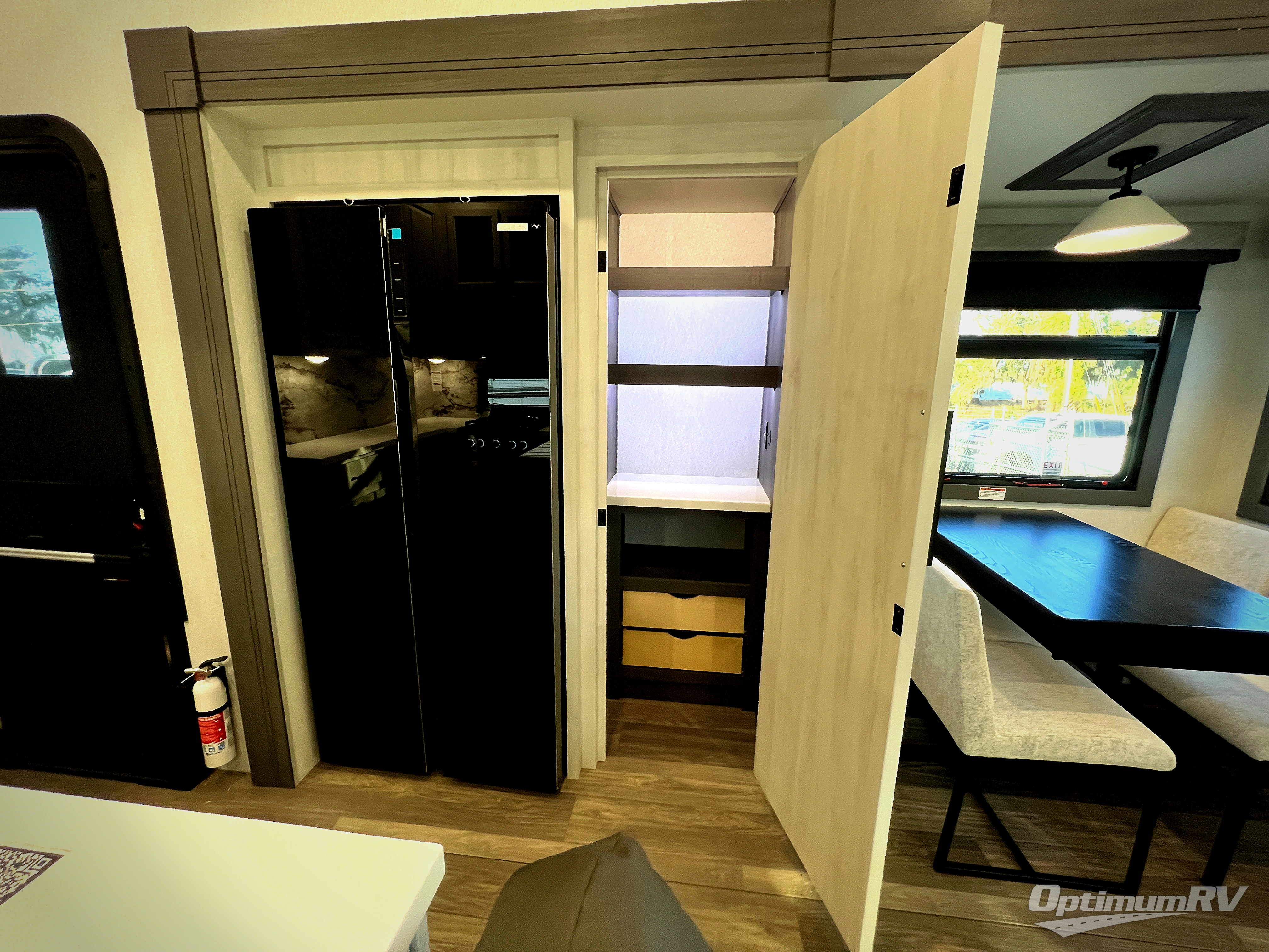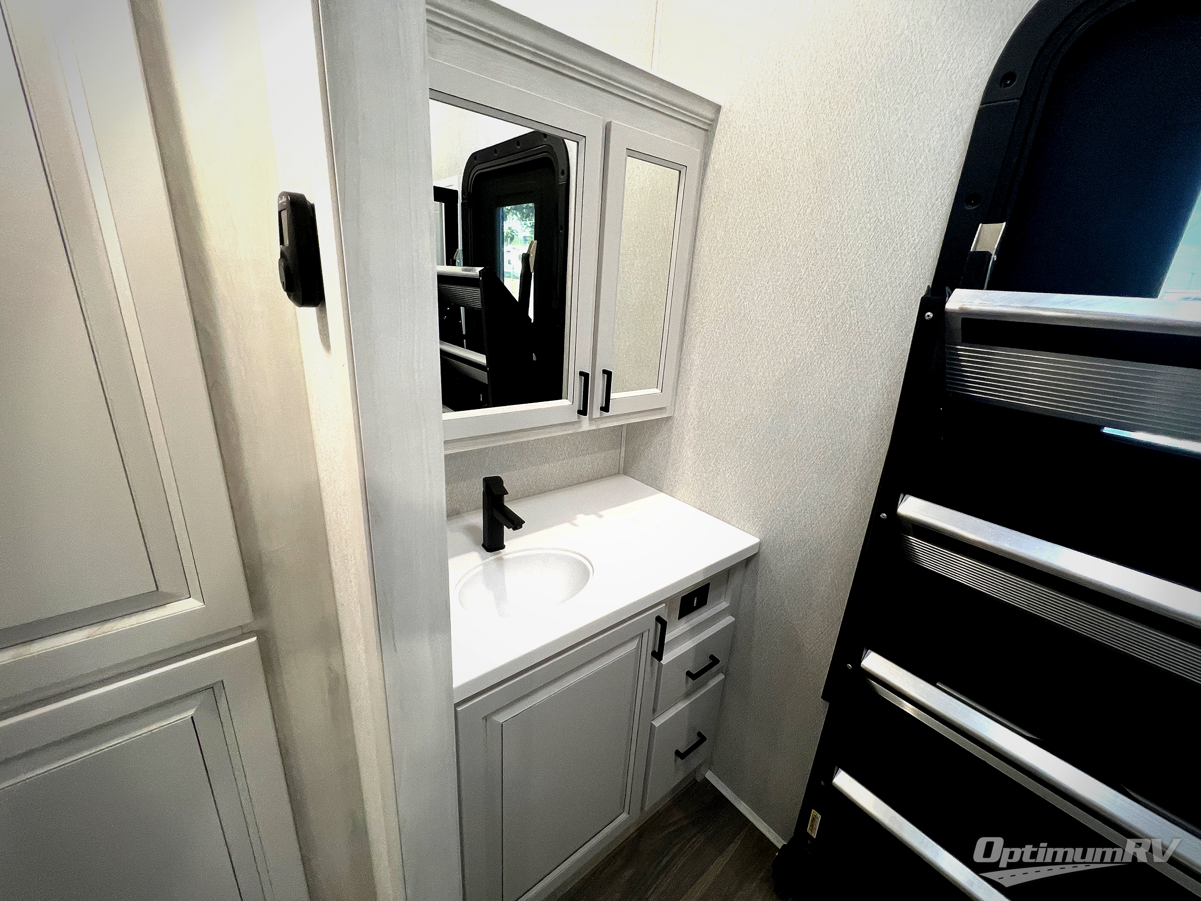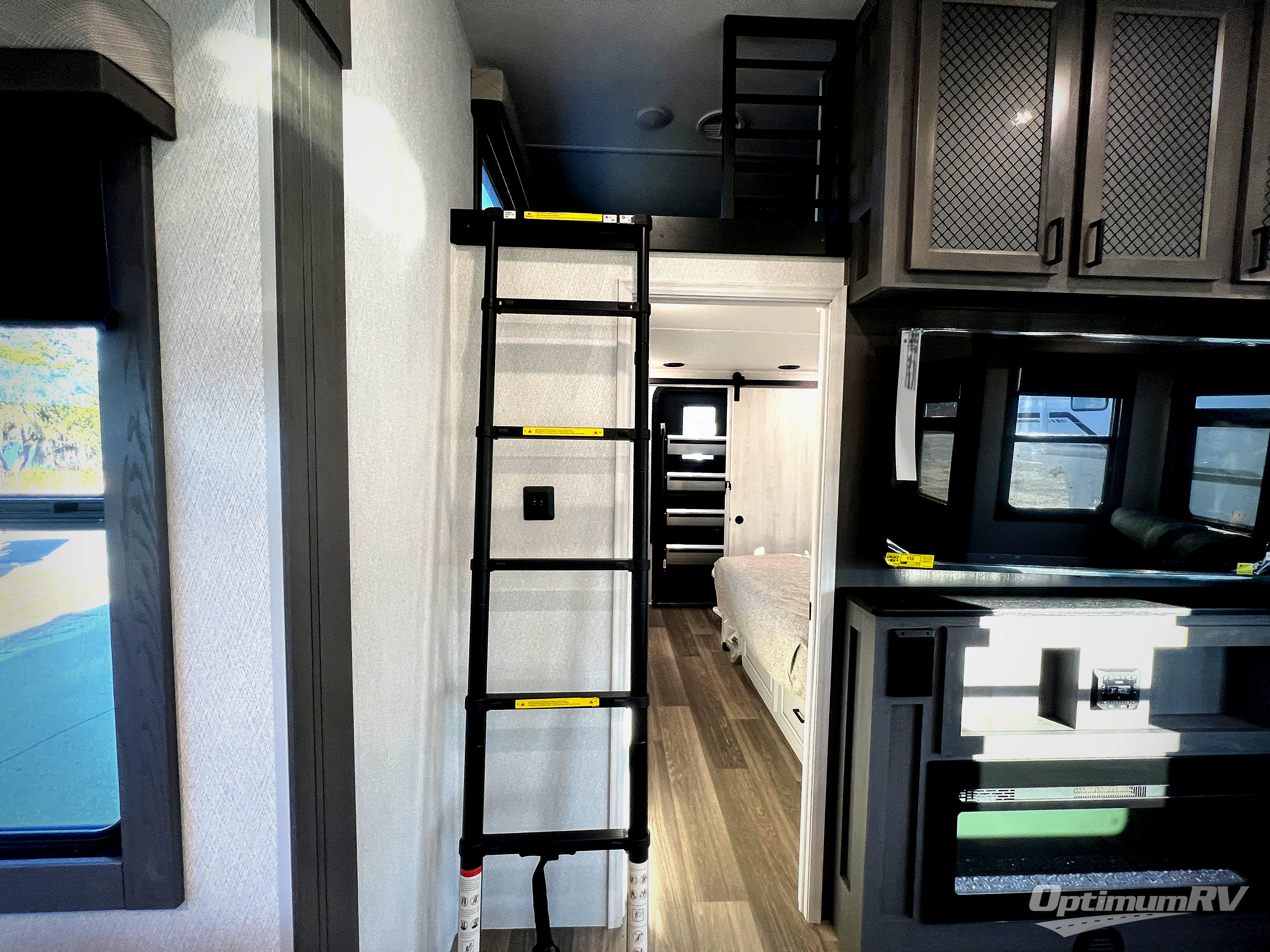 If you enjoy camping with a larger group of family or friends, this dual entry fifth wheel is for you! There is a front bedroom with a king bed slide and storage, plus a second bedroom in the back, complete with a full rear bath, a queen bed slide and storage space. A loft with a ladder is above the rear bedroom, which includes two bunk mats, loft cabinets, and TV prep if the little ones want to watch movies at night. Head to the middle of the unit to enjoy cooking on the four burner range and utilizing the generous counter space in the kitchen. There is also a walk-in pantry with a coffee bar and shelves, plus a 16 cu. ft. 12V refrigerator for food storage. Theater seating in the living room is in direct view of the TV and fireplace, and there is a tri-fold sofa slide out here as well for even more seating and sleeping space!