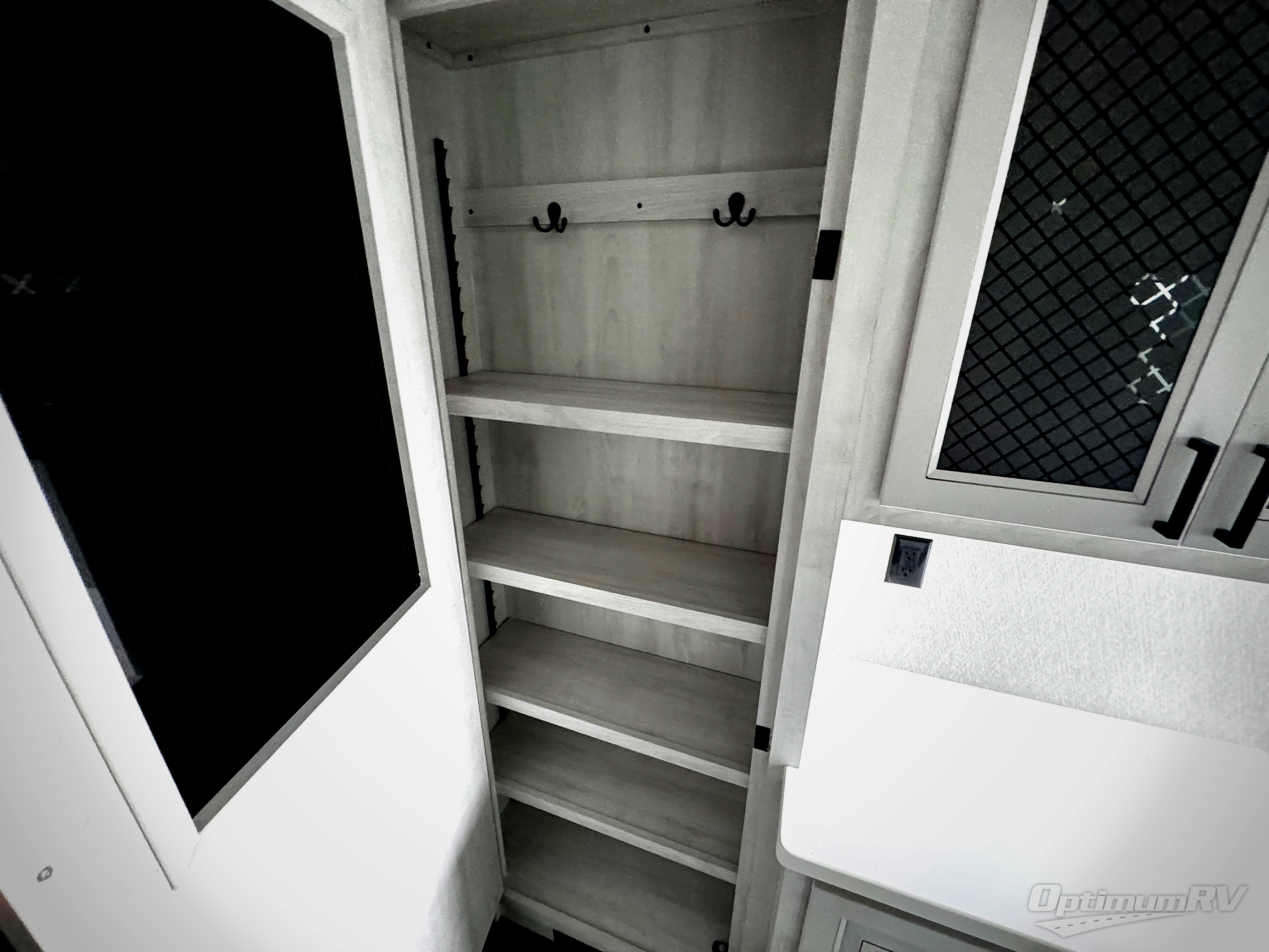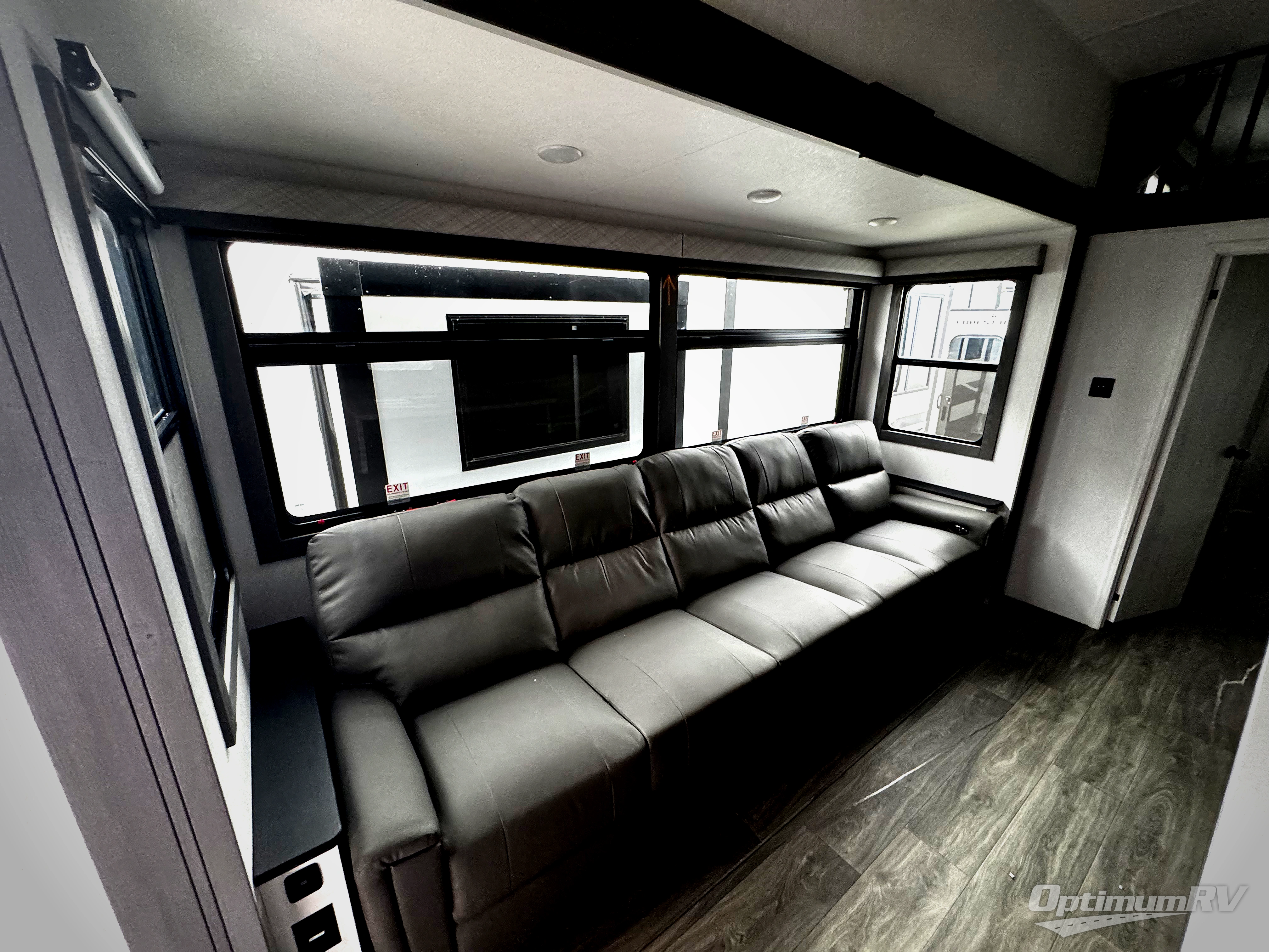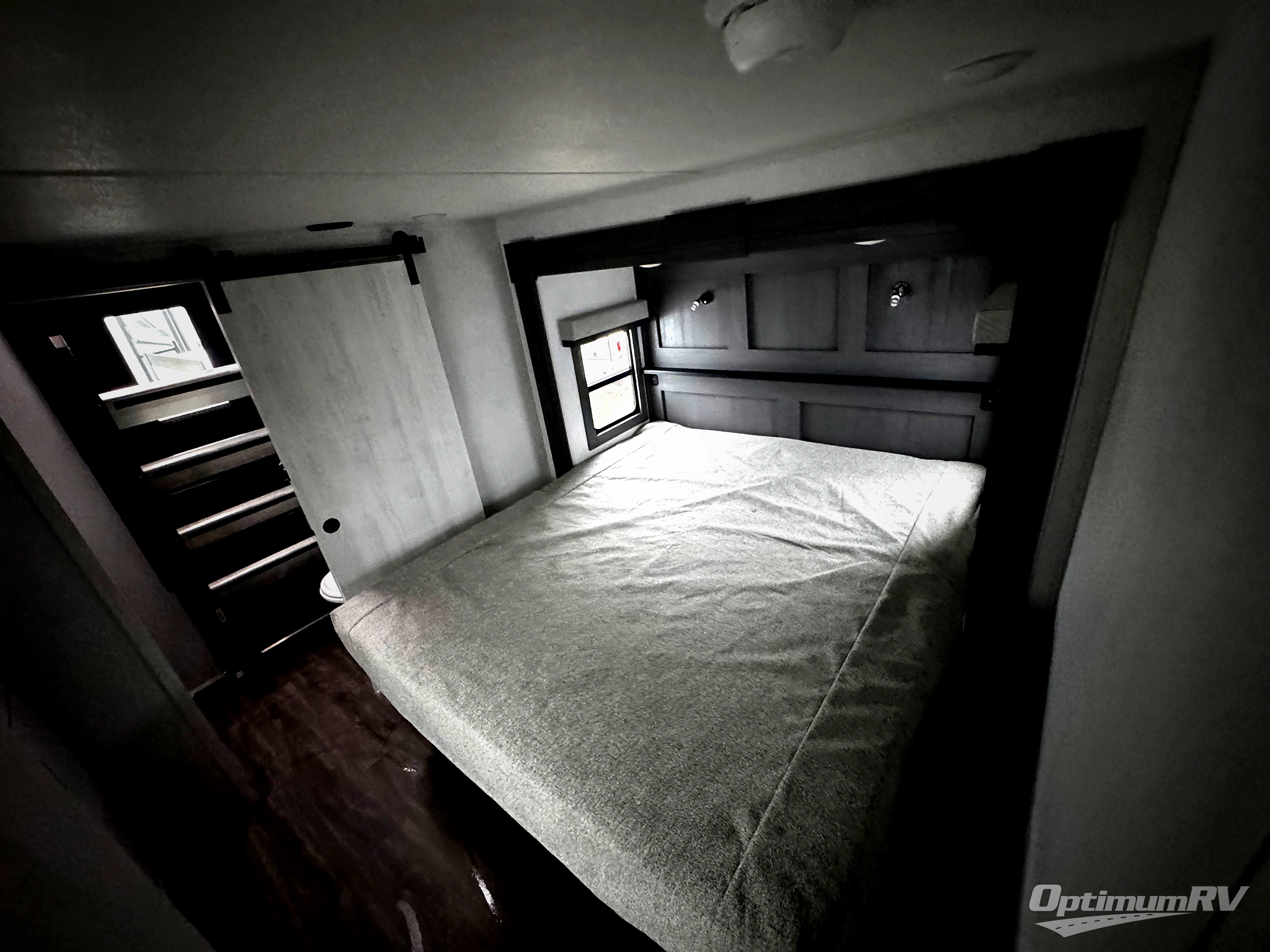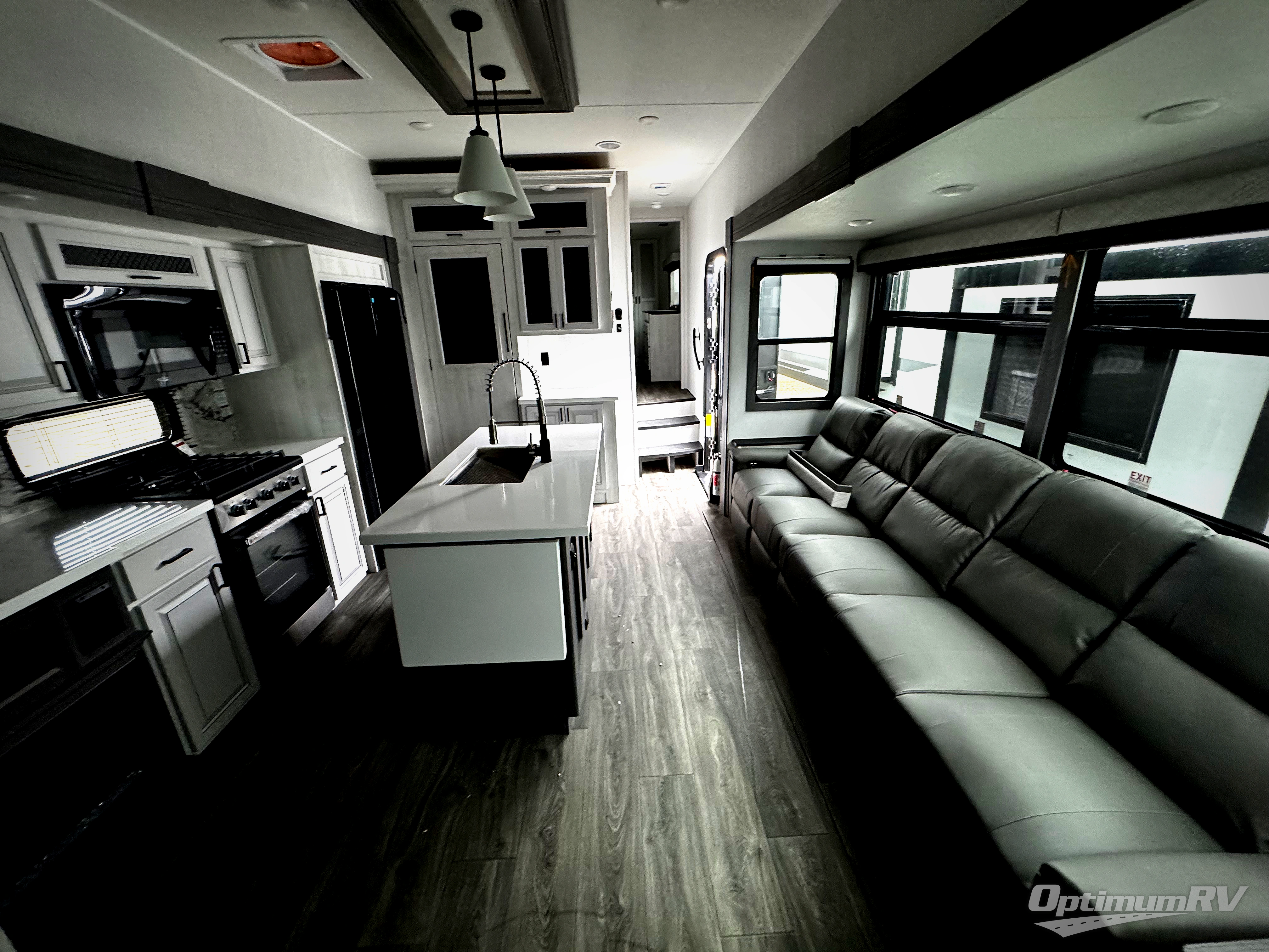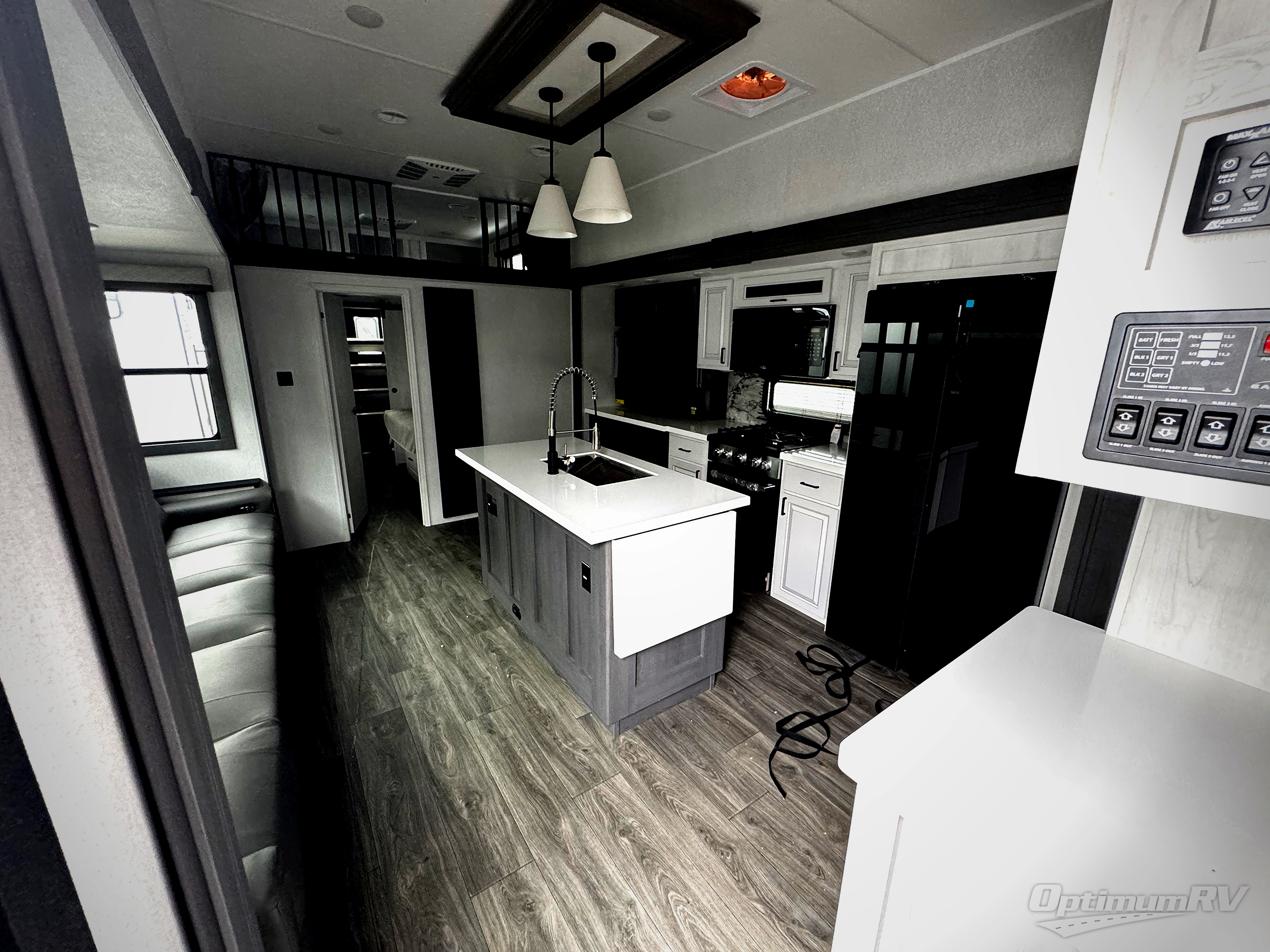 If you're looking for a luxury fifth wheel with more space for friends and family, you've found it in this Ahara! The main entry door opens up to the living area with dual opposing slides, a 50" LED TV with a fireplace, plus a full kitchen with residential appliances, a hutch, and even a pantry for dry goods and snacks. Everyone can meet here in the evenings to dine at the free-standing dinette or relax on the theater seating. You'll love the rear master suite with its king bed slide out, drawers under the bed, and full rear bath with the unique rear second entry door. And check out the Ahara Sky Suite loft above this room for even more sleeping or storage space! Your guests will find the front private bedroom to be accommodating since it includes a king bed slide out, drawers under the bed, plus a large wardrobe to keep clothes tidy. There is also a closet with washer and dryer prep. Who knows, you may just choose this bedroom for your own!