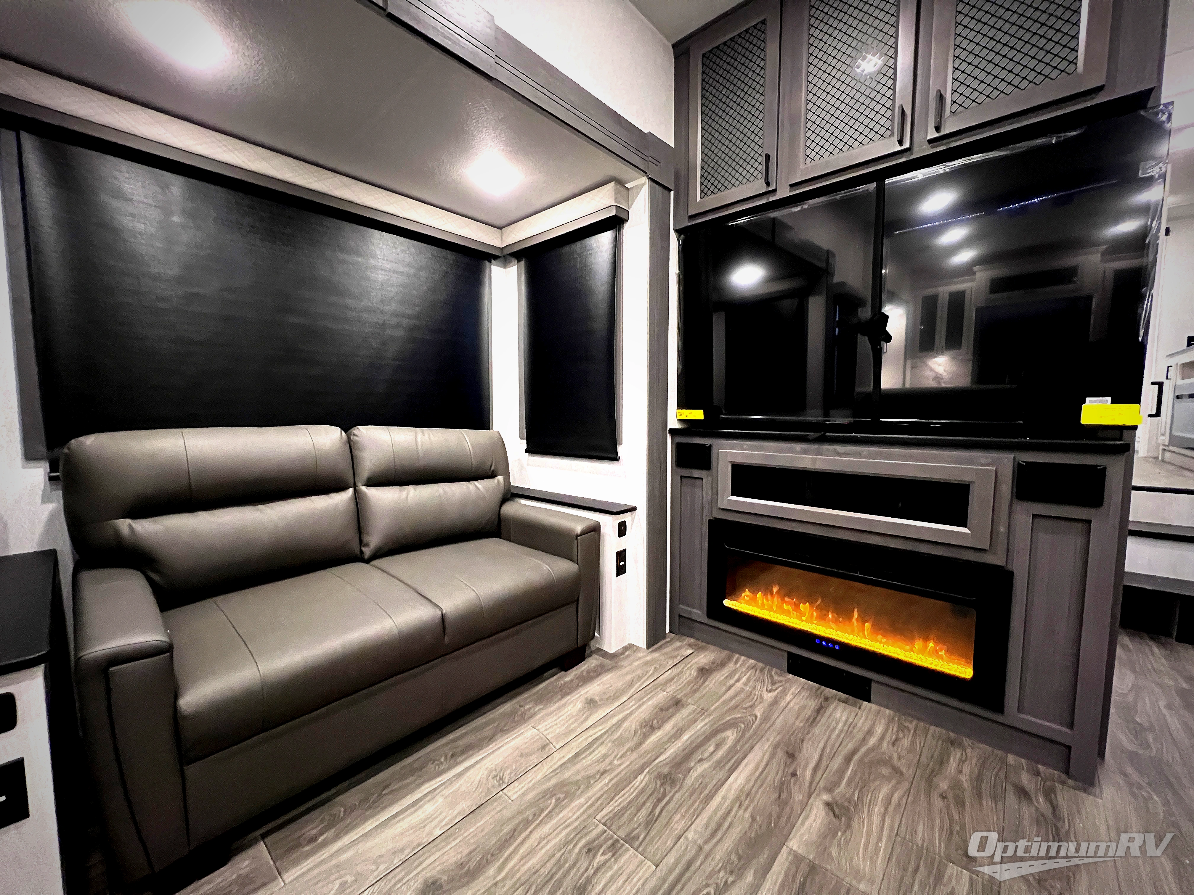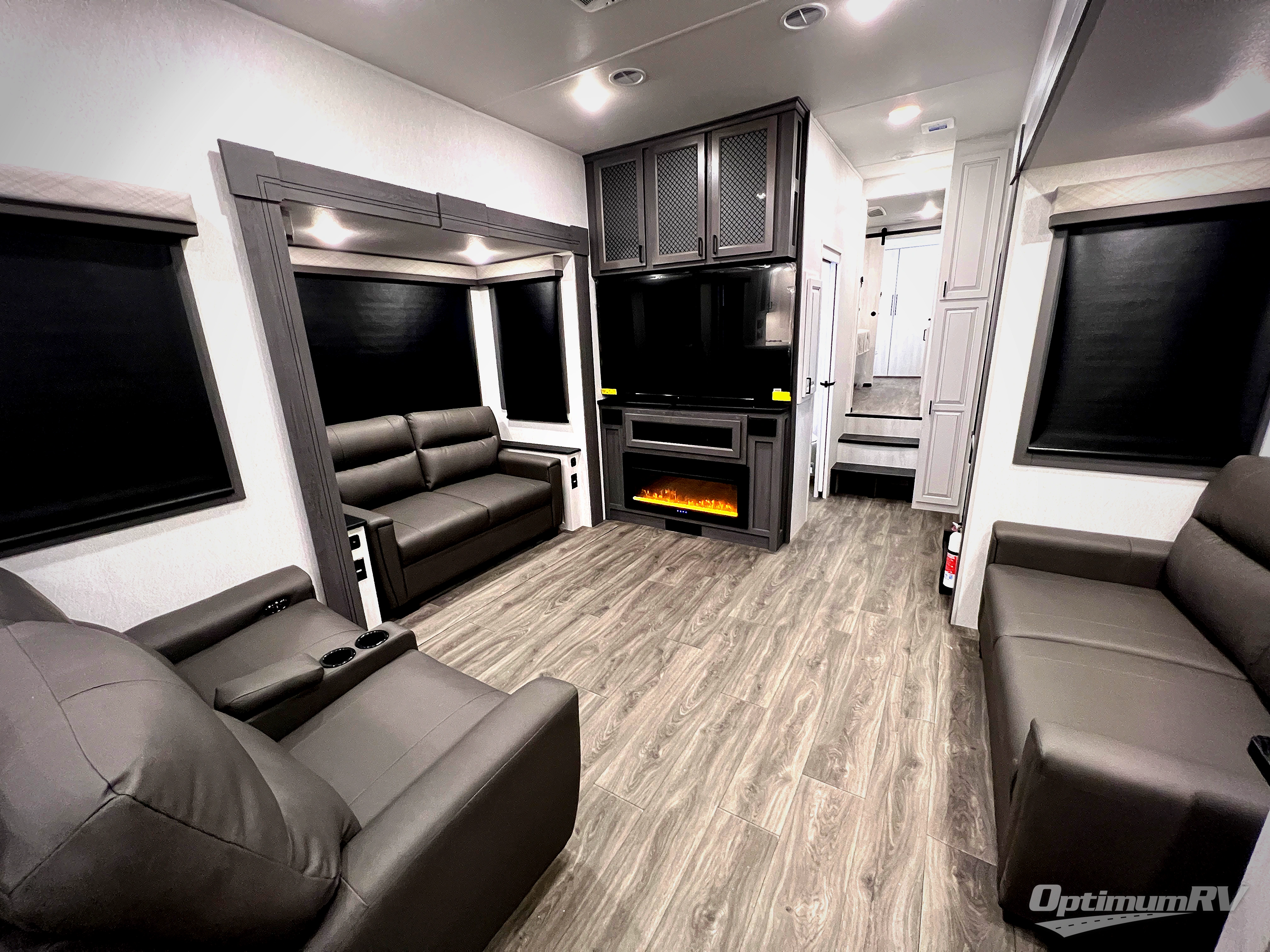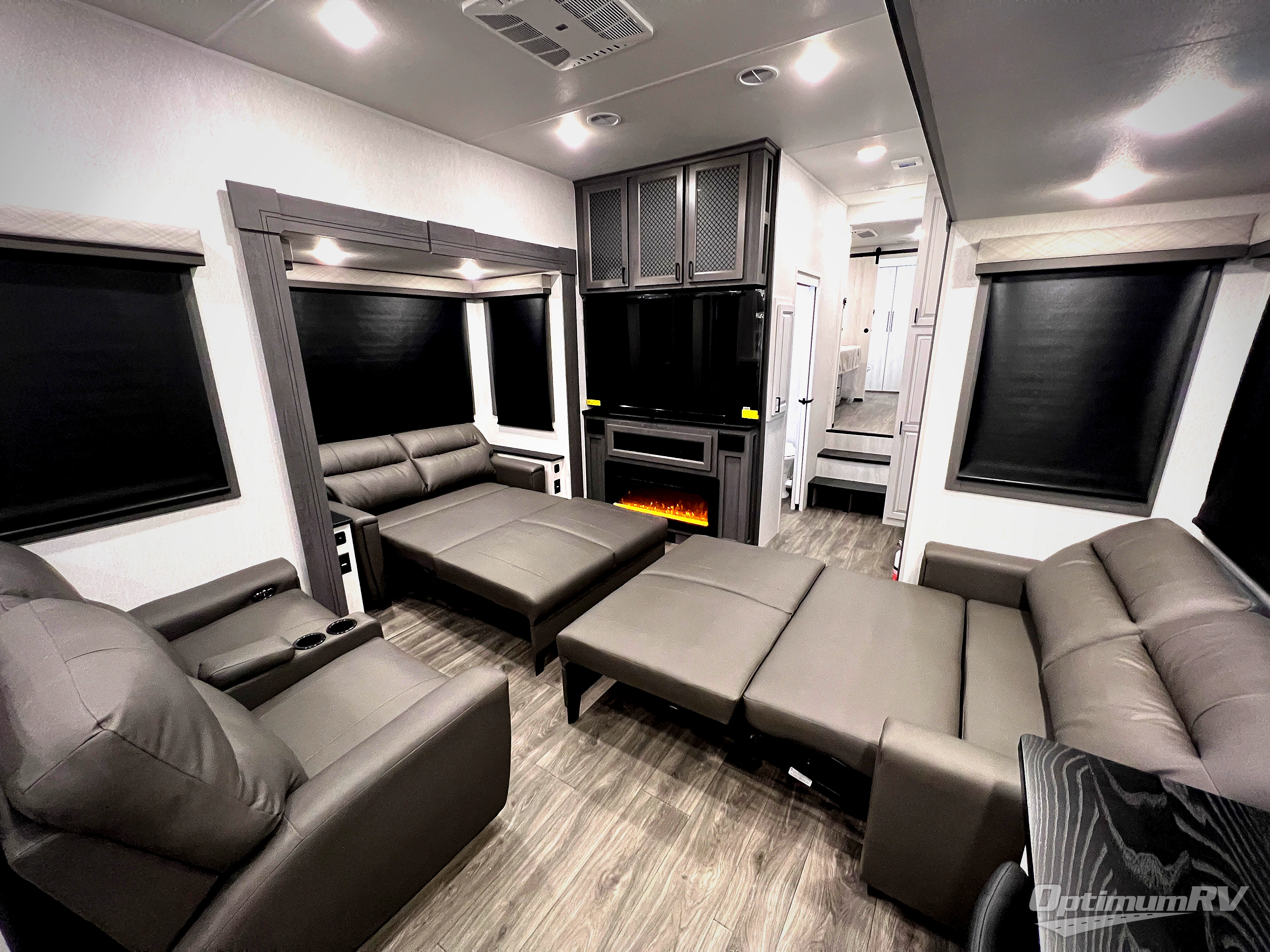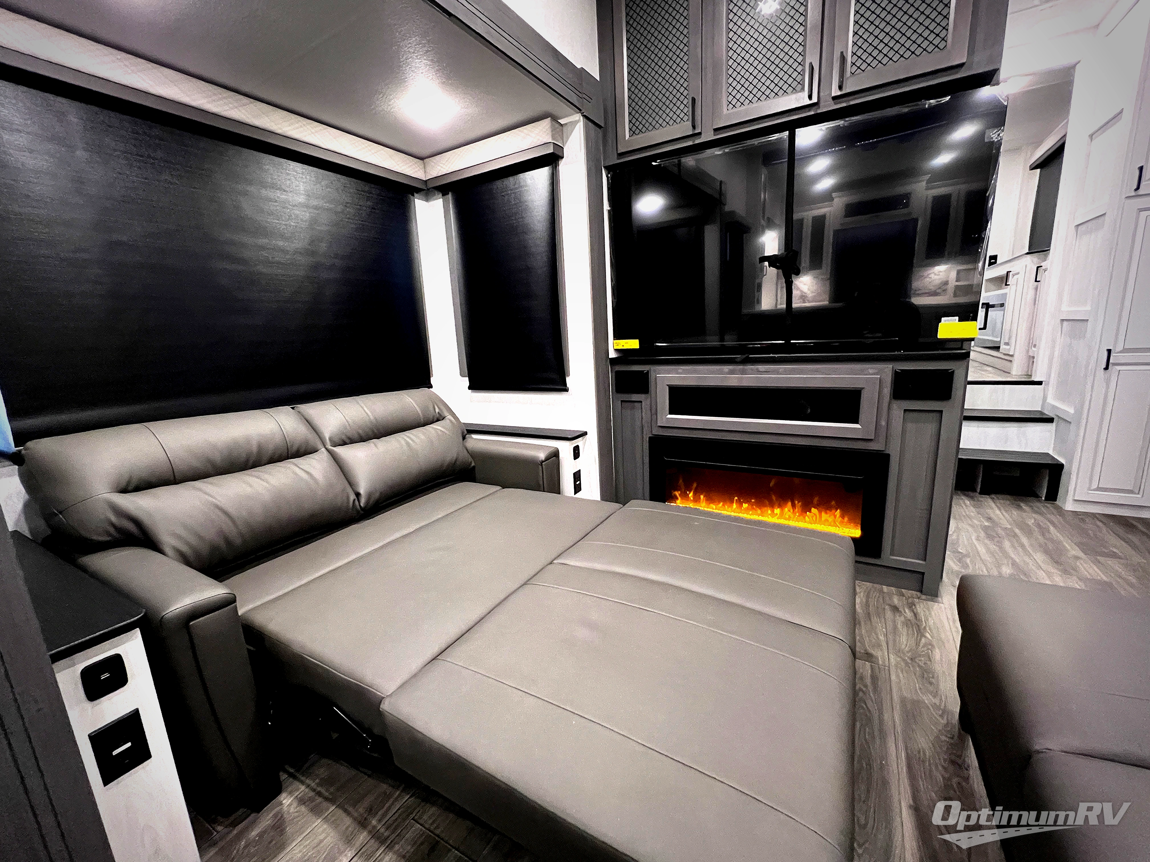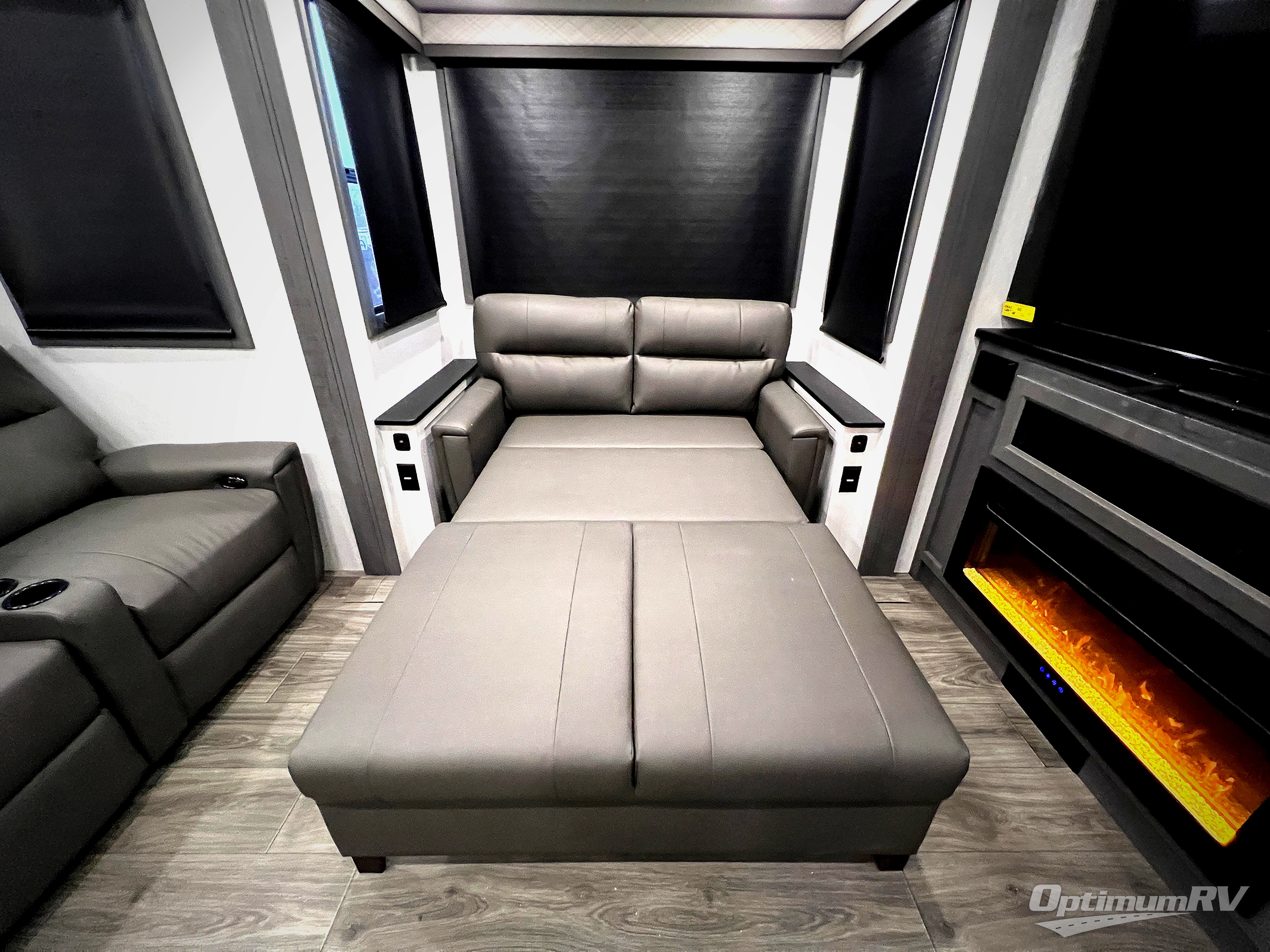 The spacious rear kitchen is equipped with a 30” microwave, 24” residential oven, overhead cabinets, breakfast bar with bar stools, walk-in pantry, and 16 cu. ft. refrigerator, perfect for cooking all your favorite dishes with the greatest convenience The living room is the heart of the home, featuring a desk with chairs, theater seating, two 60” trifold sofas, a TV with fireplace, and more. And when nature calls, you'll appreciate the convenient half bath with overhead cabinets and washer and dryer prep. The main bedroom is a serene retreat, featuring a king bed, drawers under the bed, a bedroom fireplace, and more. This is the perfect place to relax and recharge after a long day of adventure, and with a front full bathroom featuring a 30” x 40” shower, dual sink vanity, walk-in closet, dresser/drawers, you'll have everything you need to stay clean and comfortable on the go. Outside, you'll find not one, but two awnings to providing plenty of shade and protection from the elements.