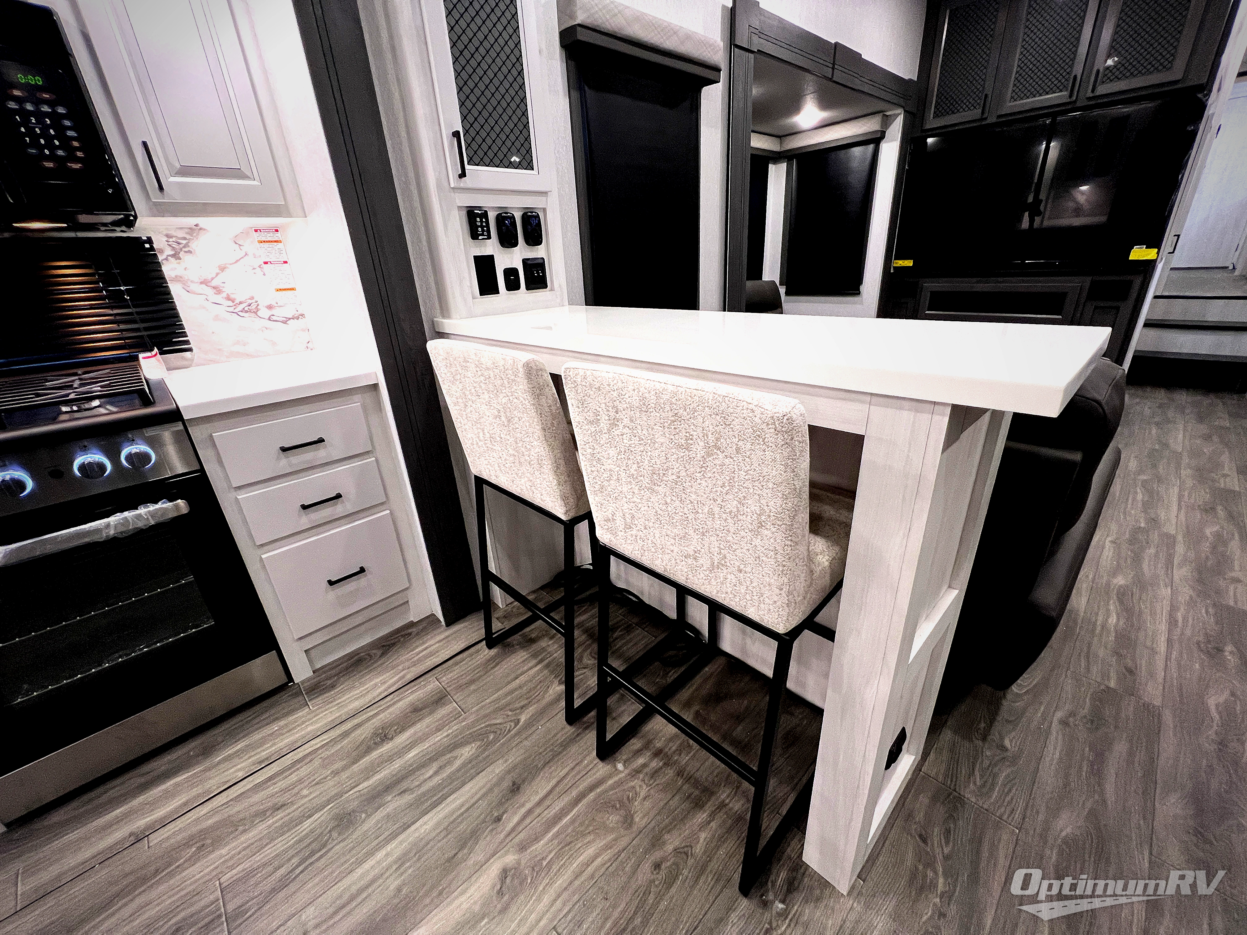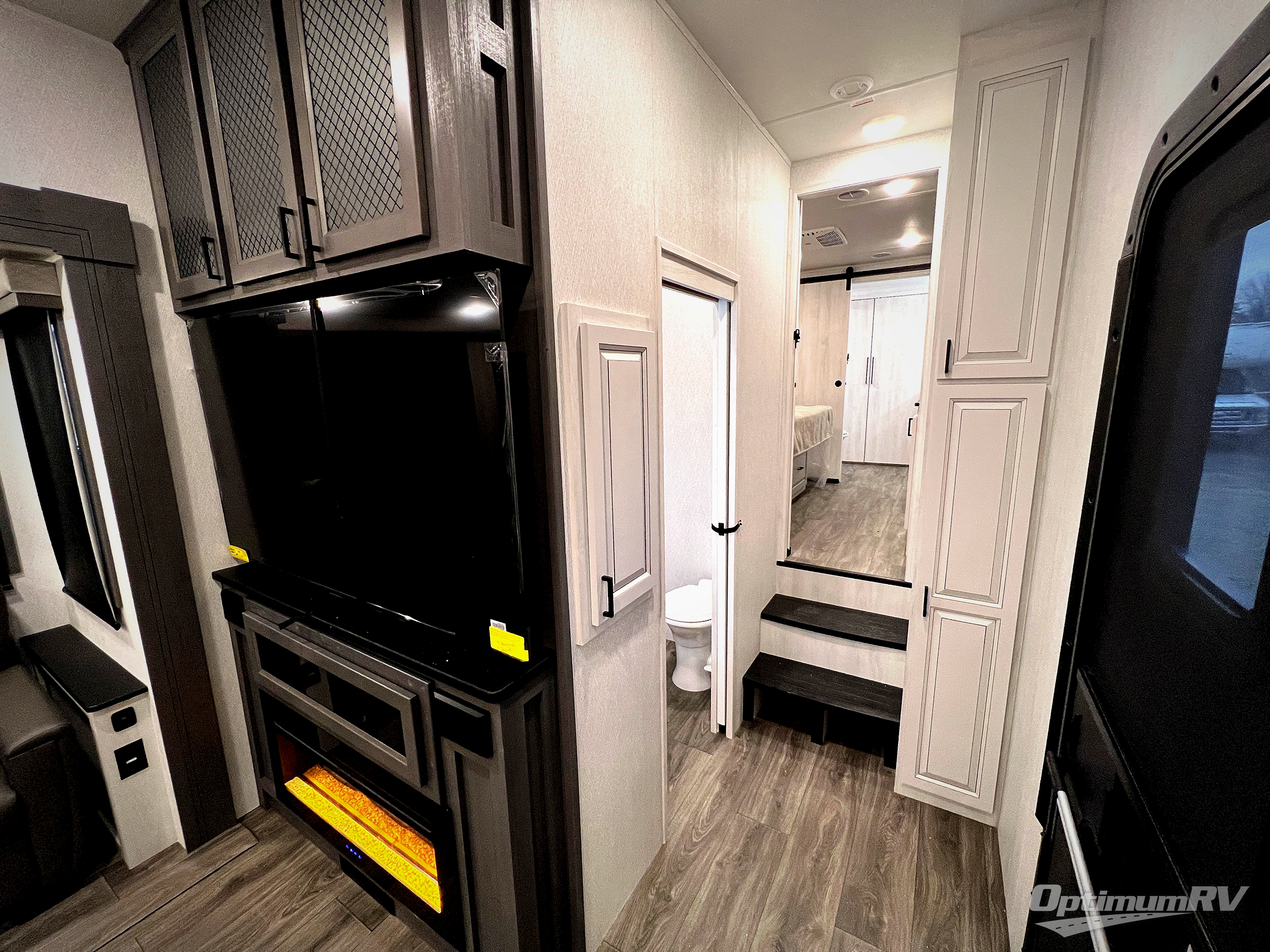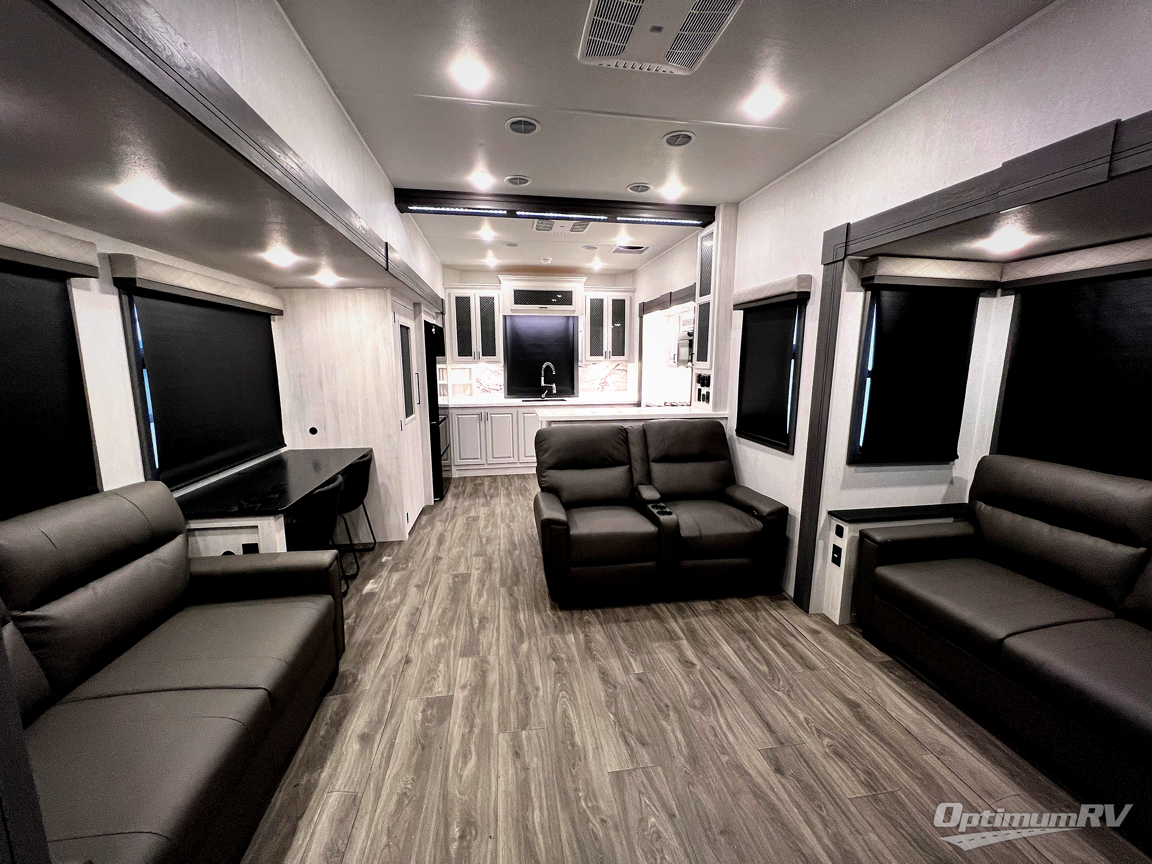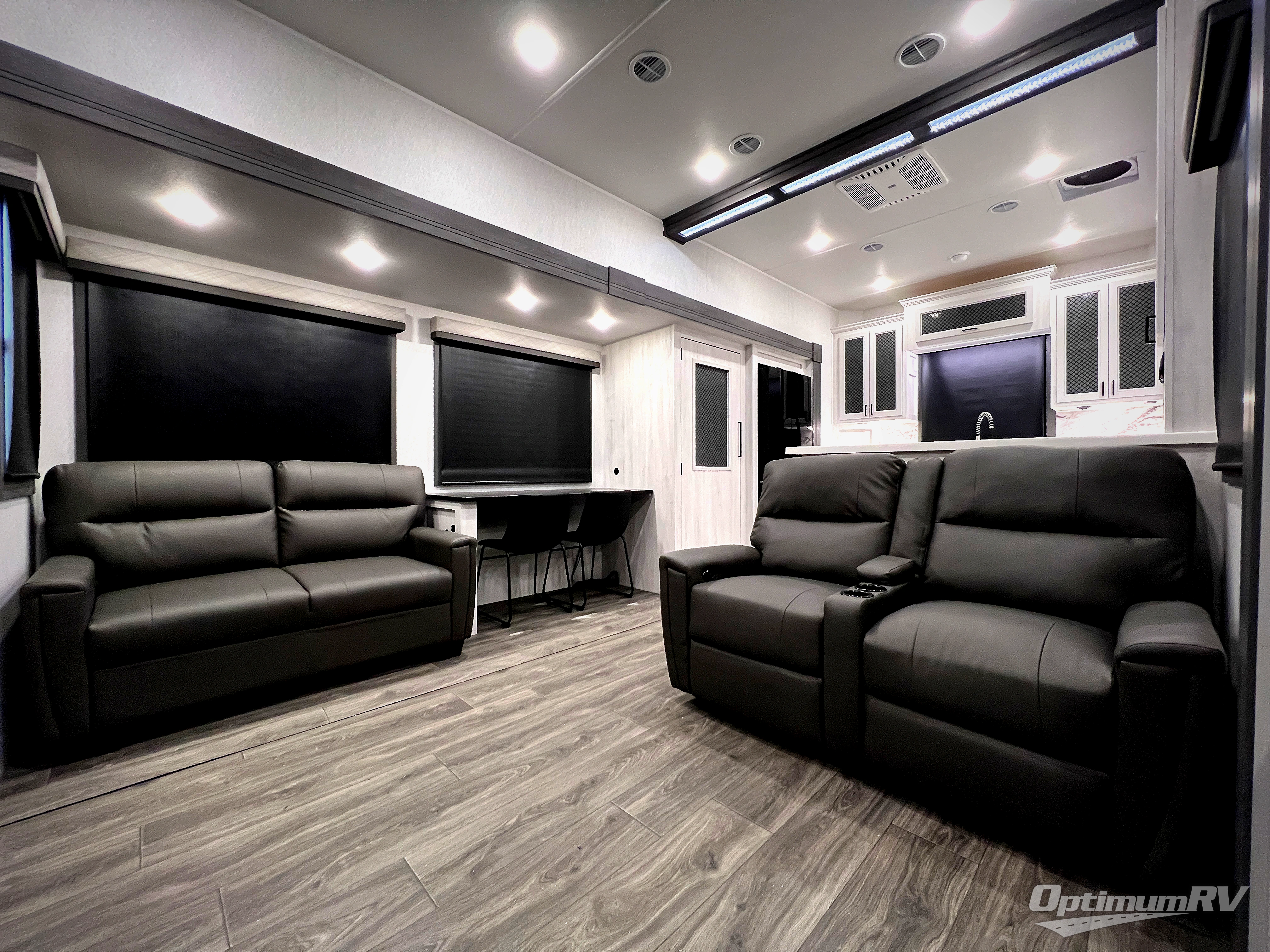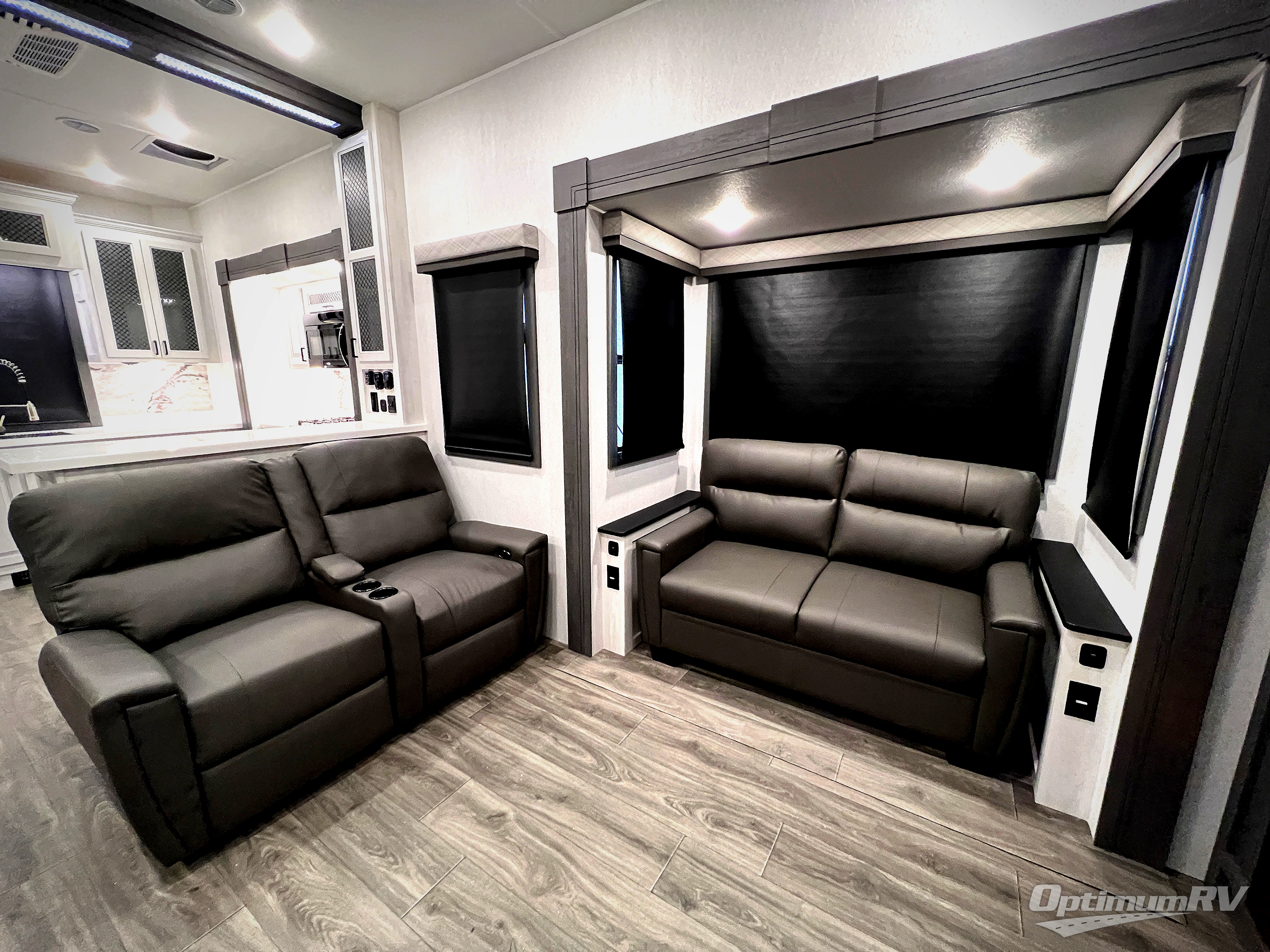 The spacious rear kitchen is equipped with a 30” microwave, 24” residential oven, overhead cabinets, breakfast bar with bar stools, walk-in pantry, and 16 cu. ft. refrigerator, perfect for cooking all your favorite dishes with the greatest convenience The living room is the heart of the home, featuring a desk with chairs, theater seating, two 60” trifold sofas, a TV with fireplace, and more. And when nature calls, you'll appreciate the convenient half bath with overhead cabinets and washer and dryer prep. The main bedroom is a serene retreat, featuring a king bed, drawers under the bed, a bedroom fireplace, and more. This is the perfect place to relax and recharge after a long day of adventure, and with a front full bathroom featuring a 30” x 40” shower, dual sink vanity, walk-in closet, dresser/drawers, you'll have everything you need to stay clean and comfortable on the go. Outside, you'll find not one, but two awnings to providing plenty of shade and protection from the elements.