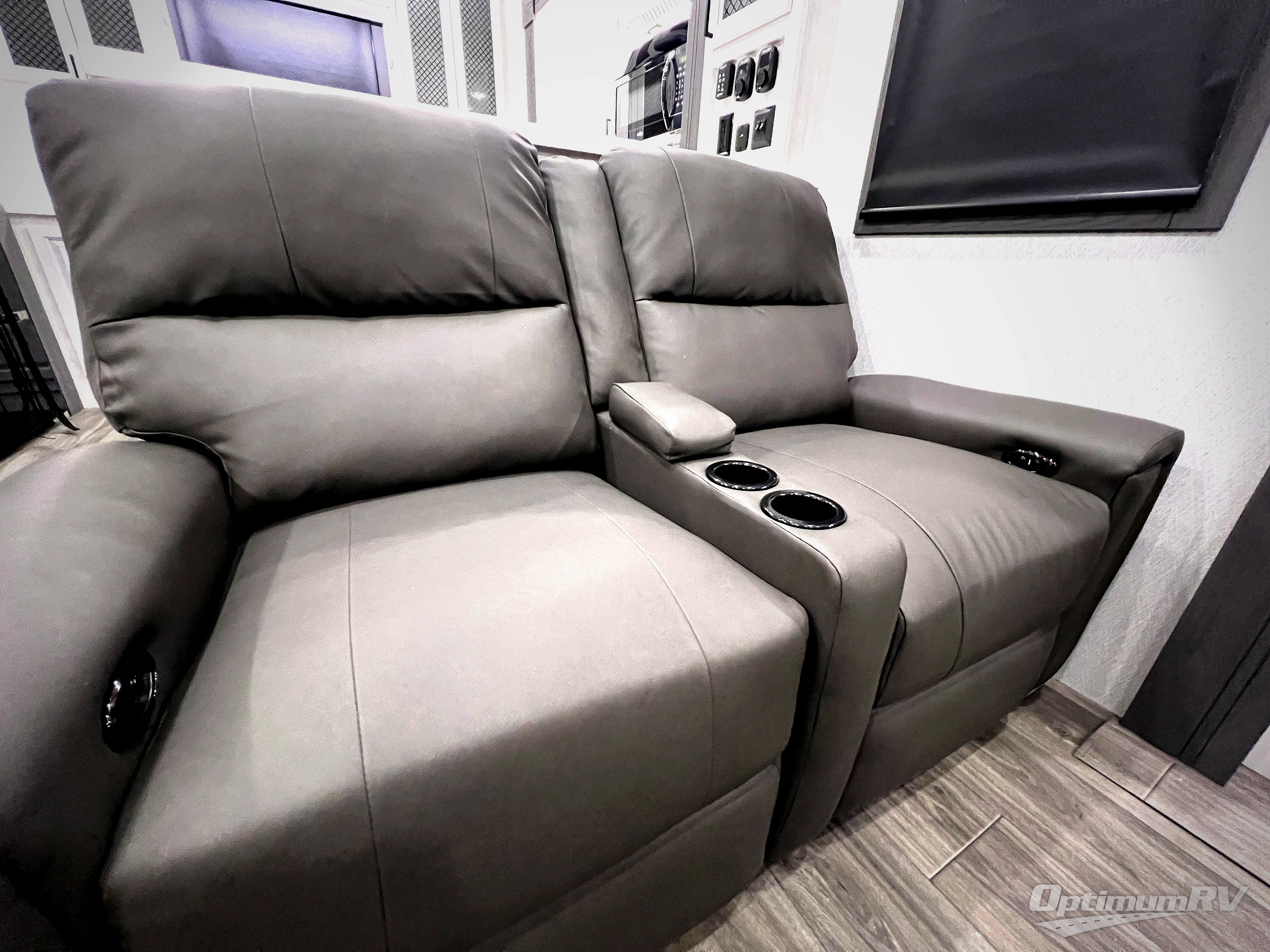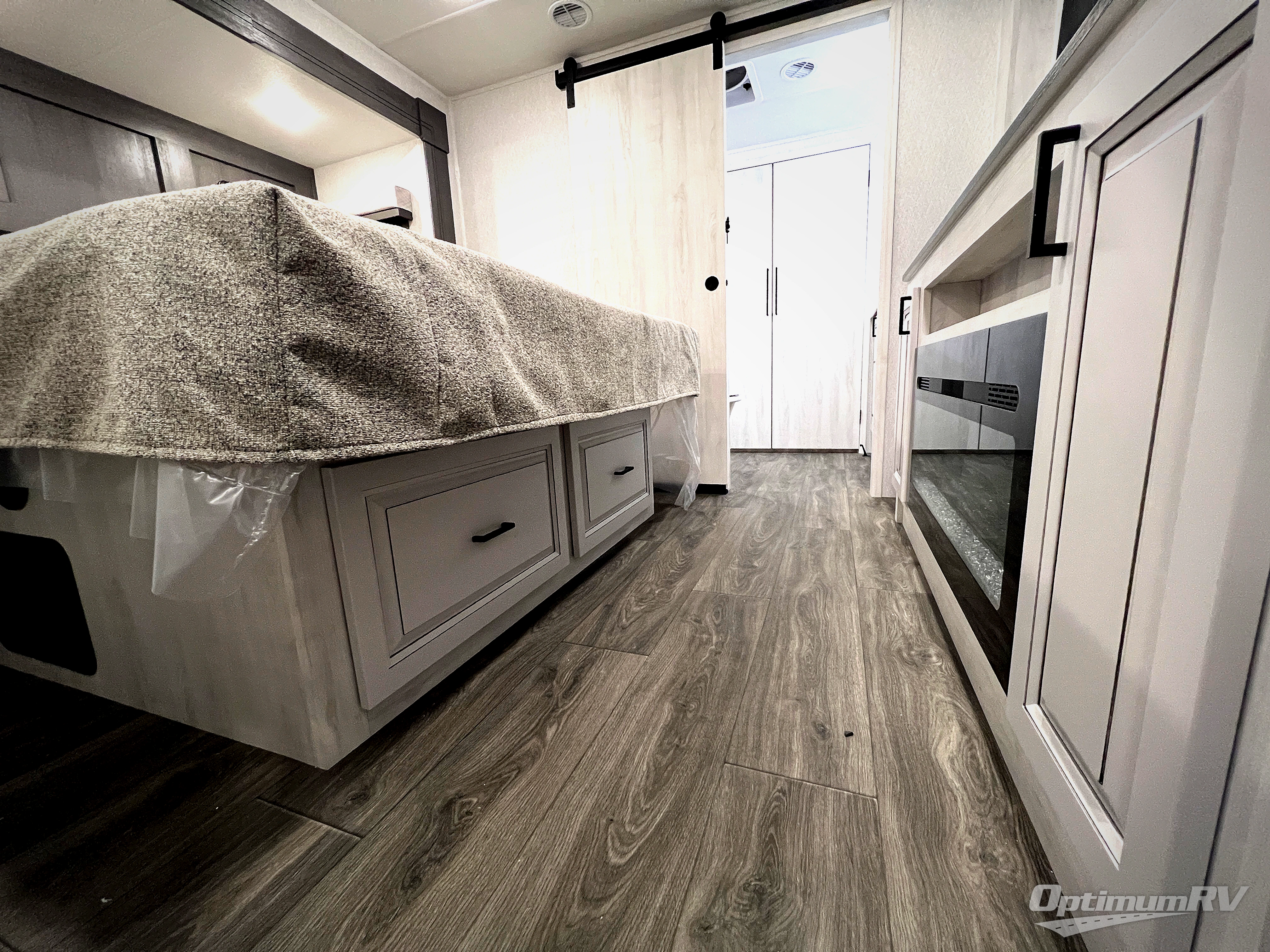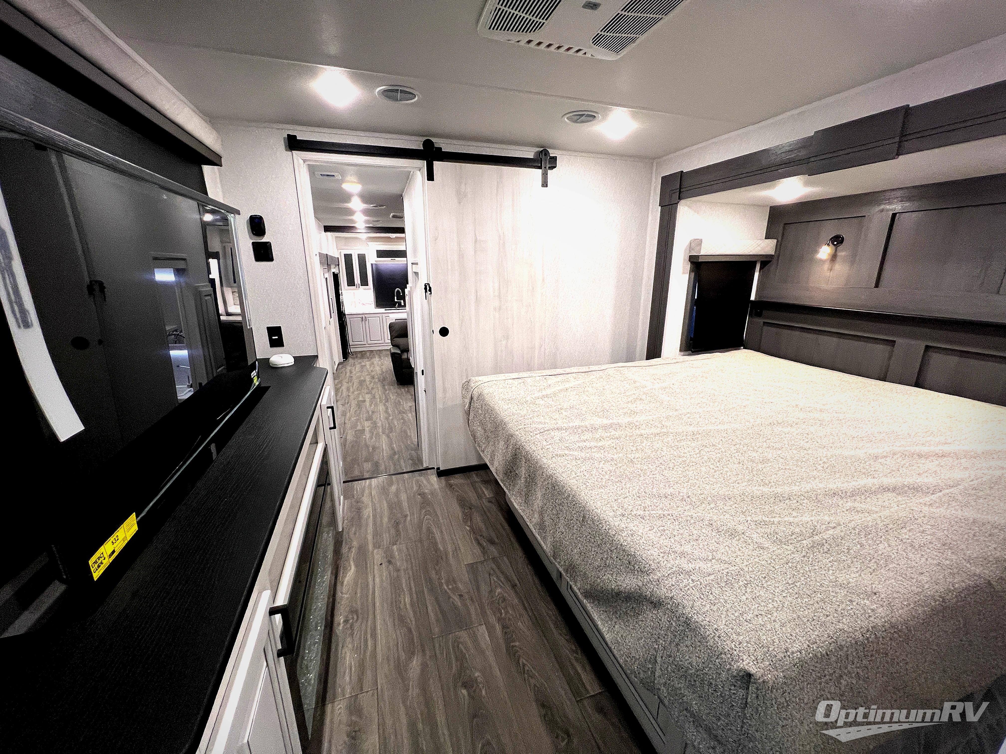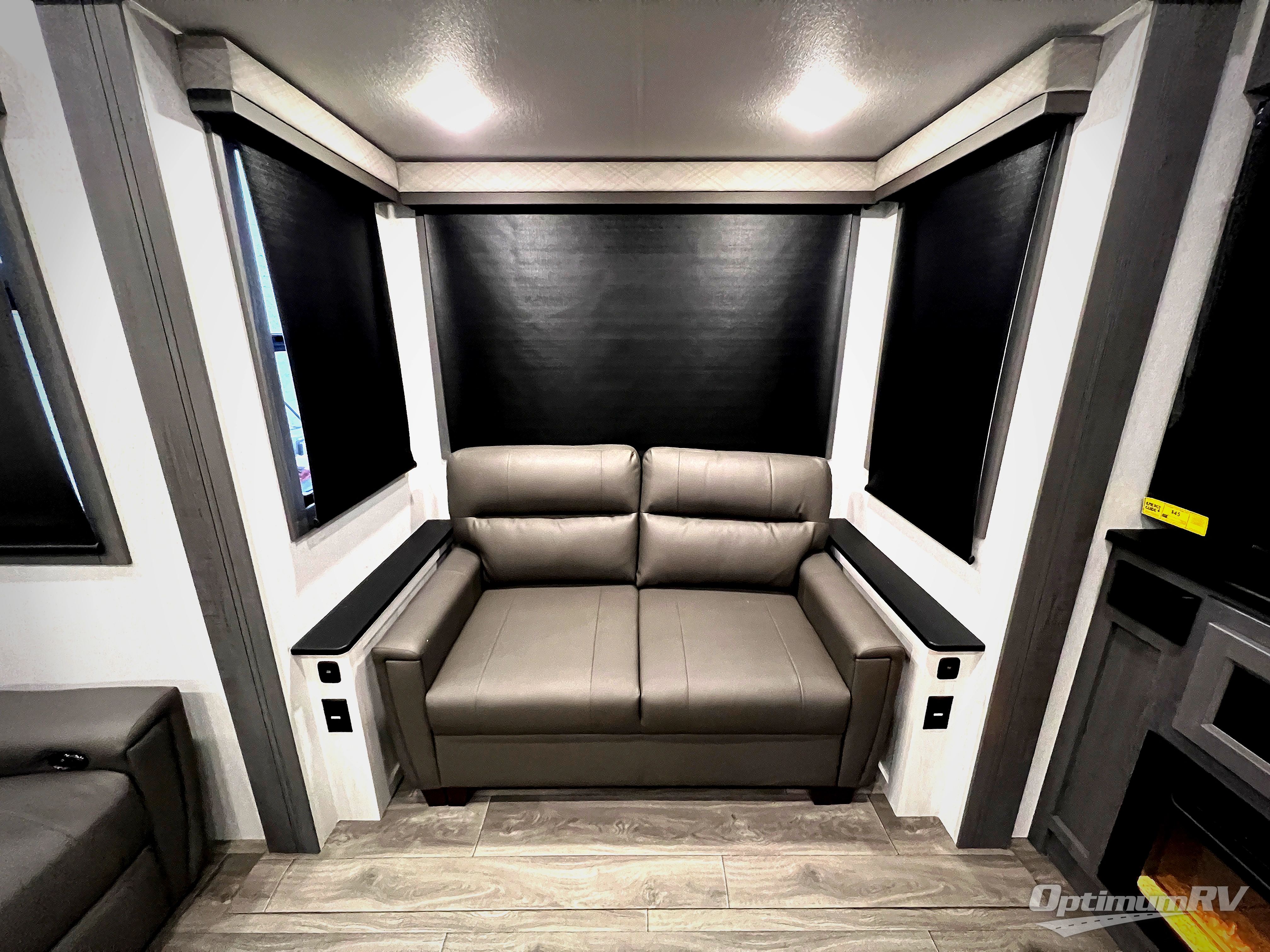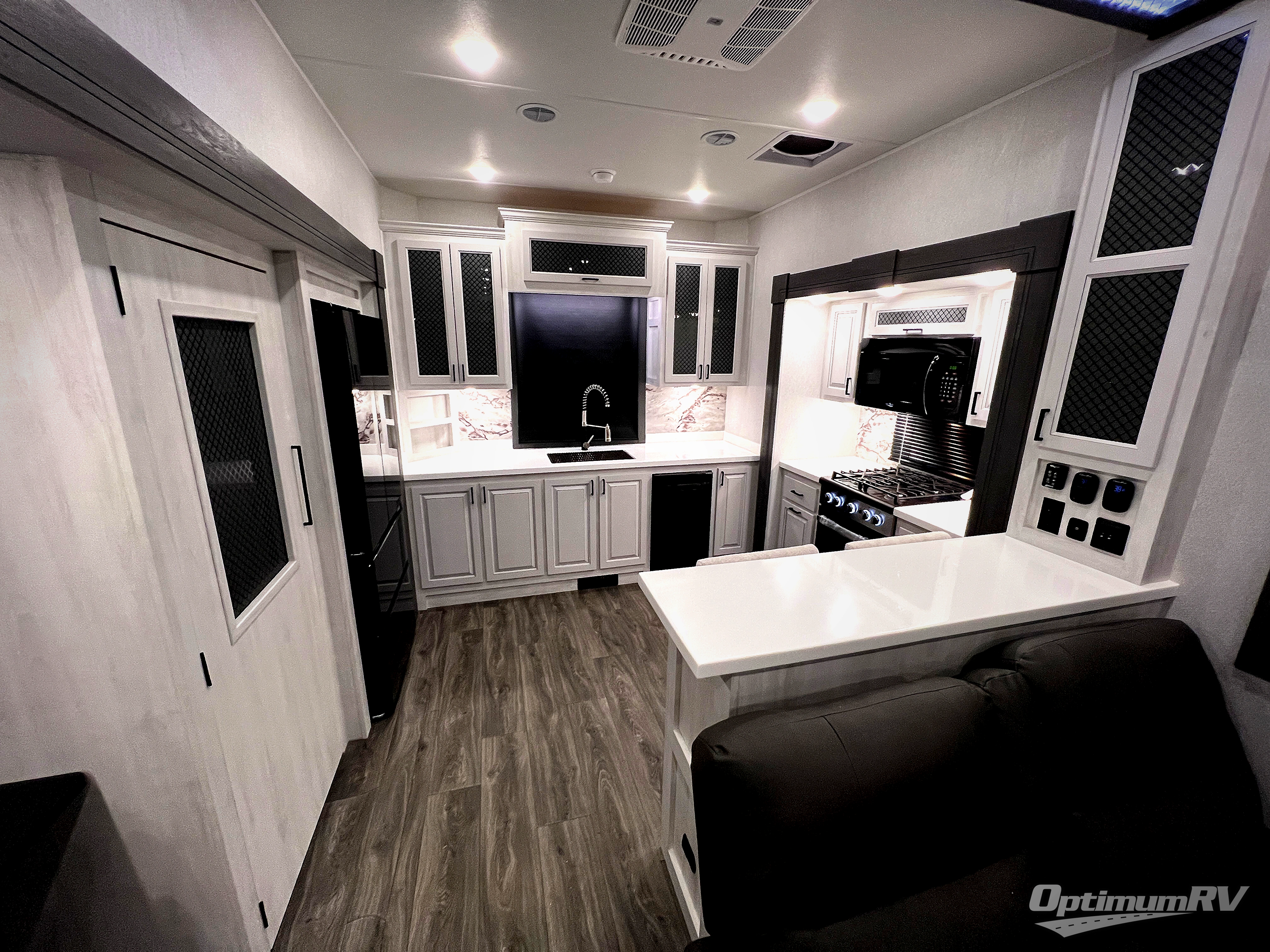 The spacious rear kitchen is equipped with a 30” microwave, 24” residential oven, overhead cabinets, breakfast bar with bar stools, walk-in pantry, and 16 cu. ft. refrigerator, perfect for cooking all your favorite dishes with the greatest convenience The living room is the heart of the home, featuring a desk with chairs, theater seating, two 60” trifold sofas, a TV with fireplace, and more. And when nature calls, you'll appreciate the convenient half bath with overhead cabinets and washer and dryer prep. The main bedroom is a serene retreat, featuring a king bed, drawers under the bed, a bedroom fireplace, and more. This is the perfect place to relax and recharge after a long day of adventure, and with a front full bathroom featuring a 30” x 40” shower, dual sink vanity, walk-in closet, dresser/drawers, you'll have everything you need to stay clean and comfortable on the go. Outside, you'll find not one, but two awnings to providing plenty of shade and protection from the elements.