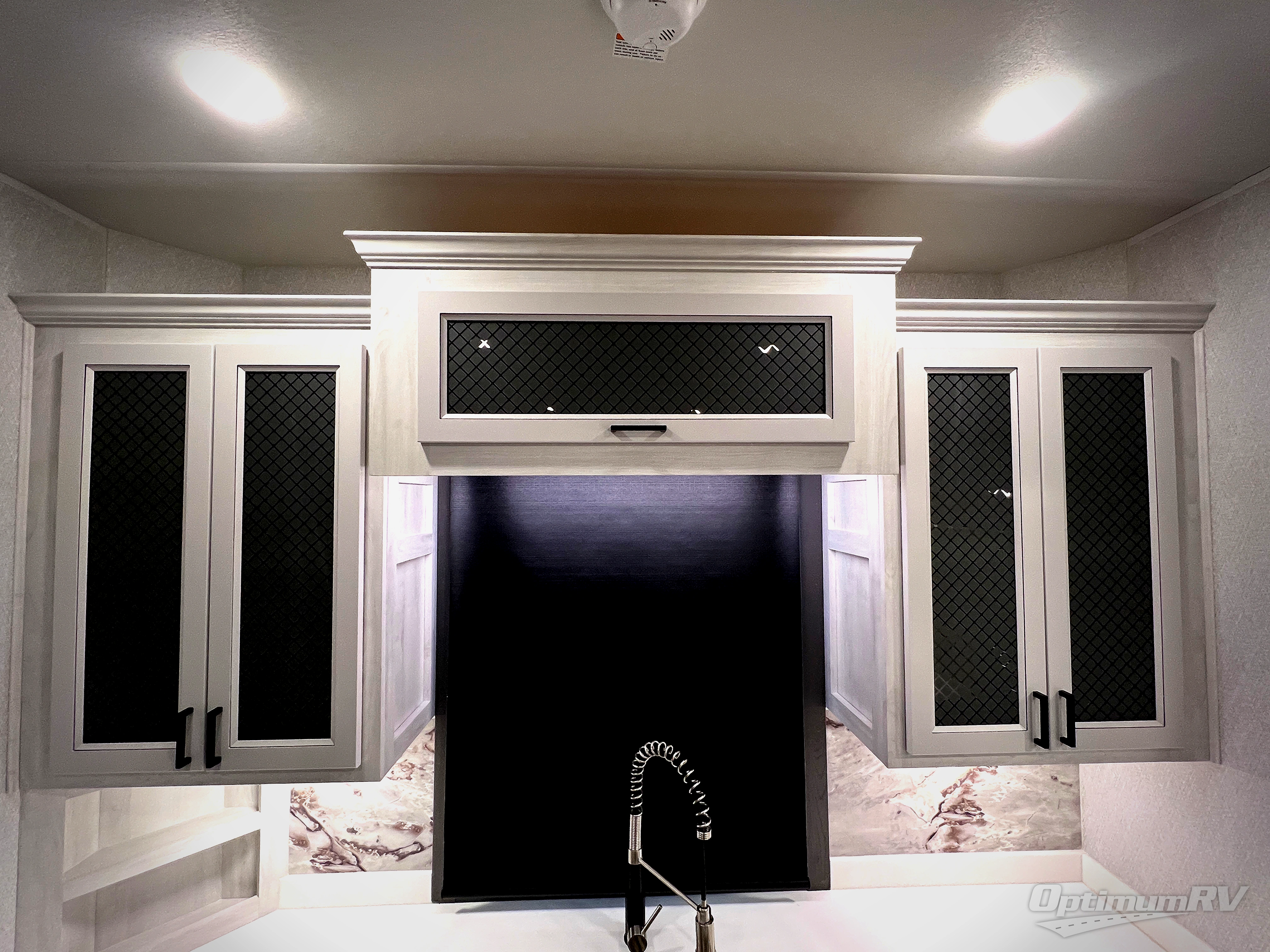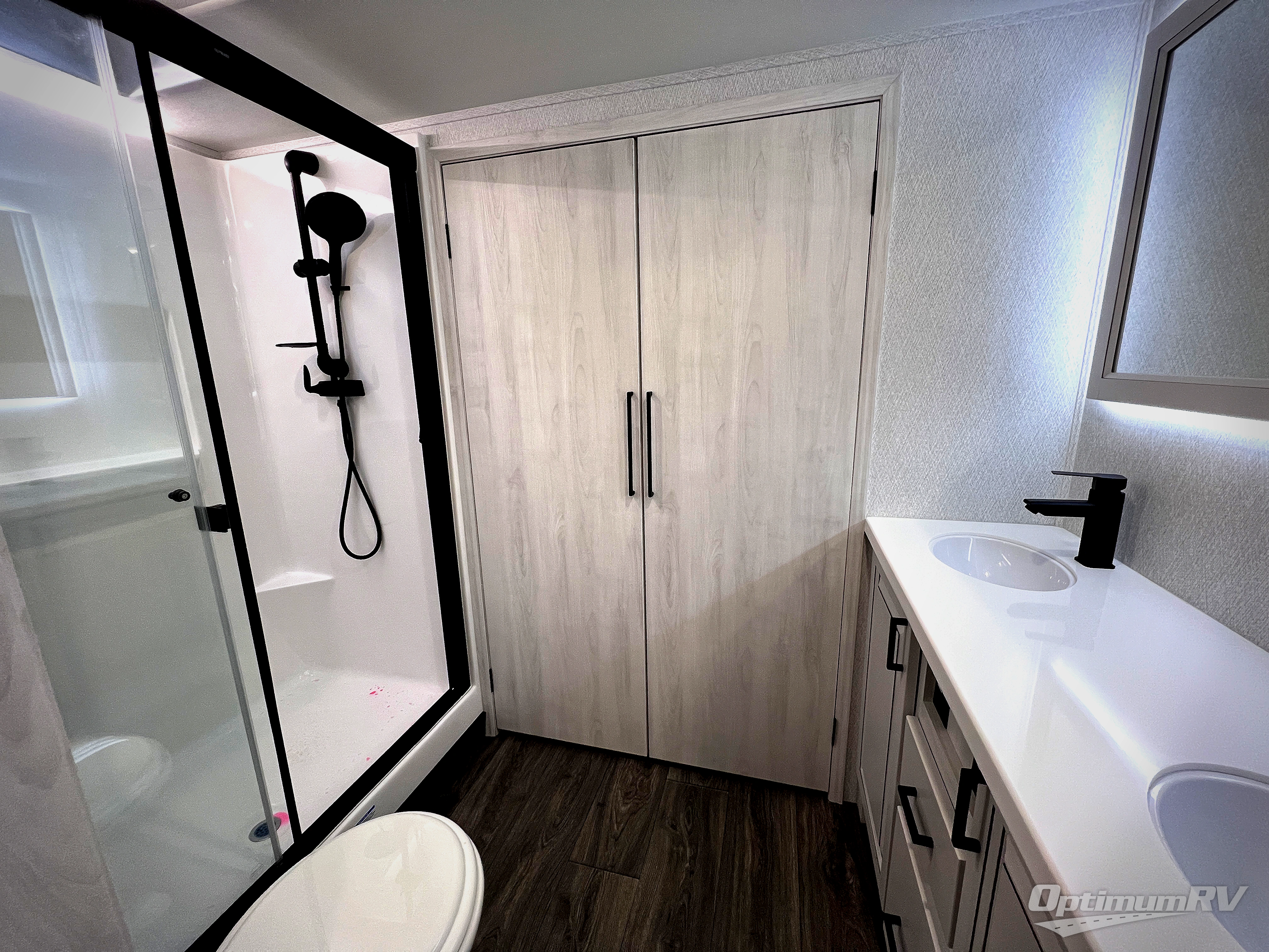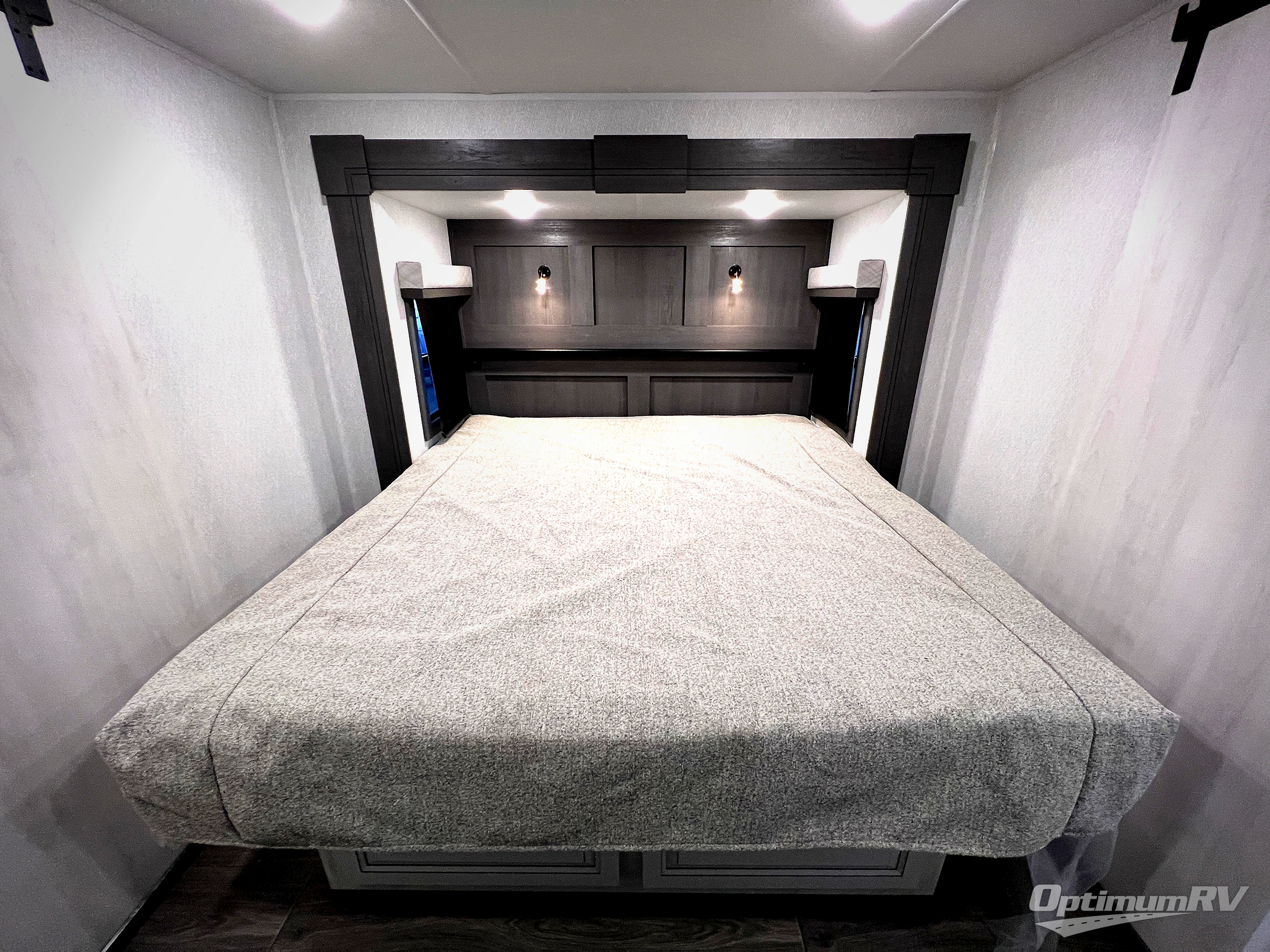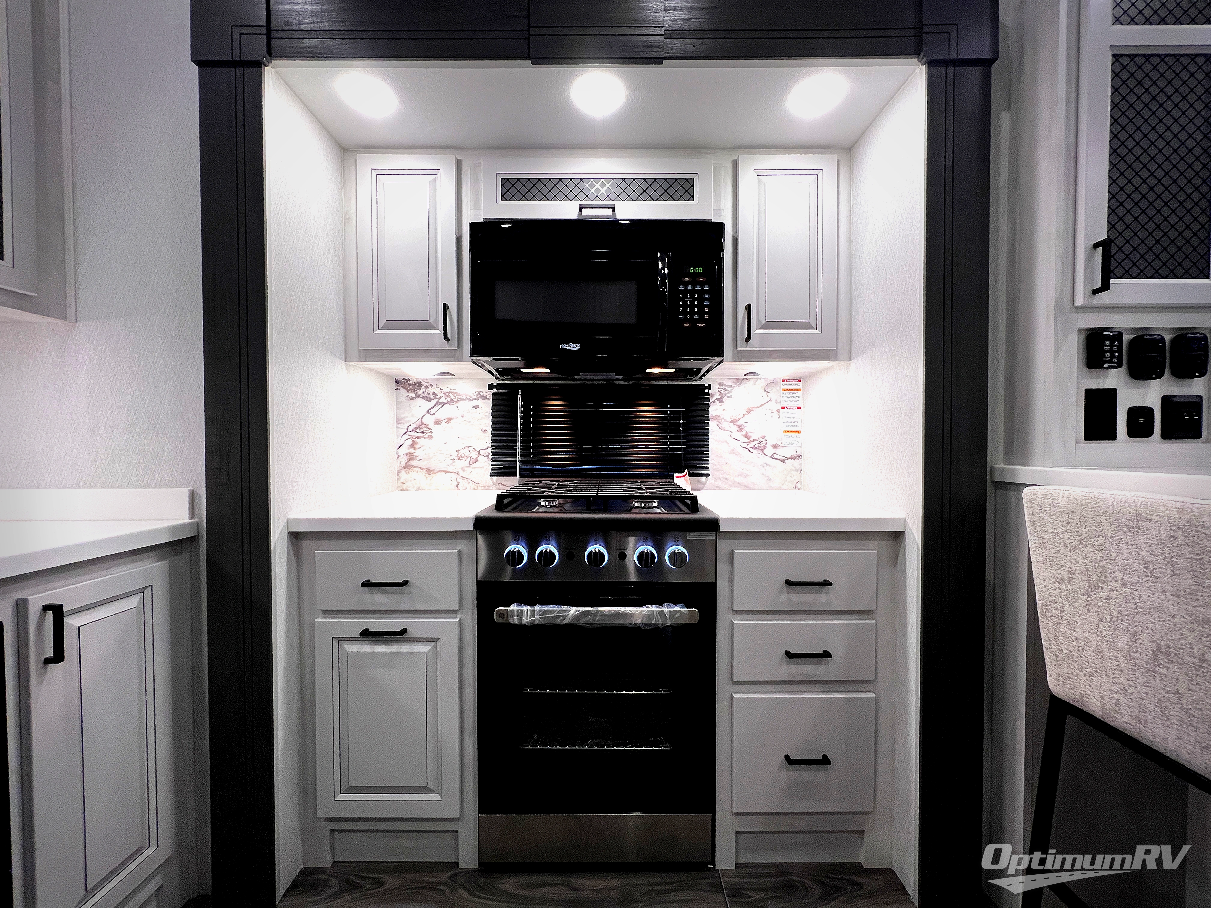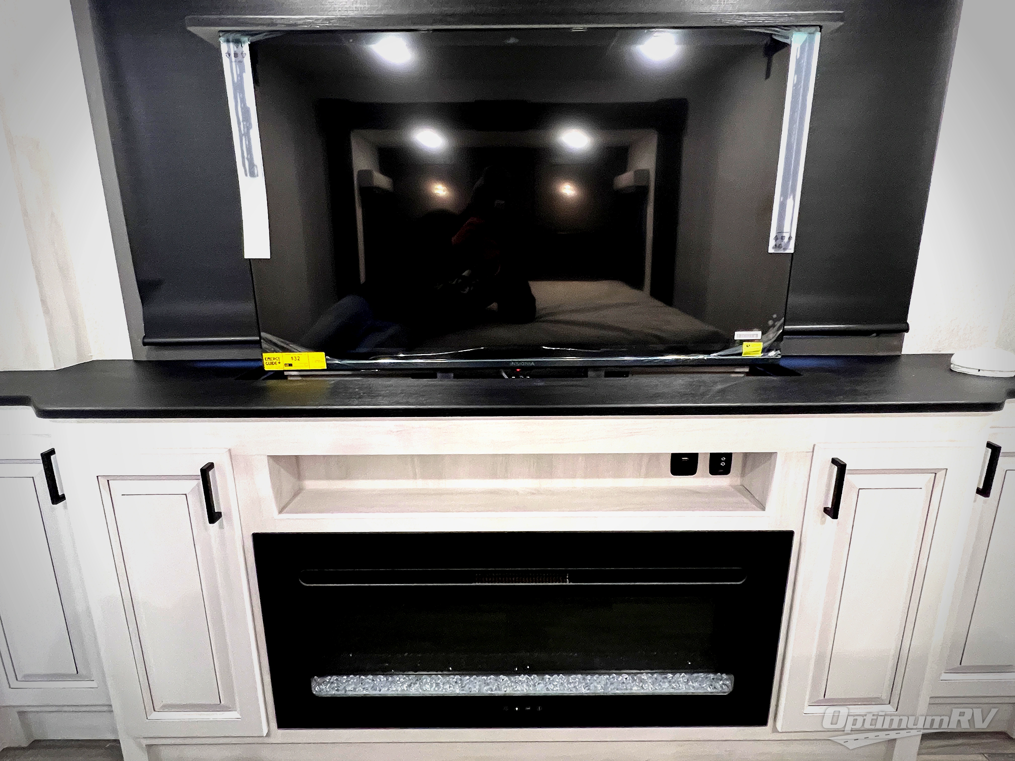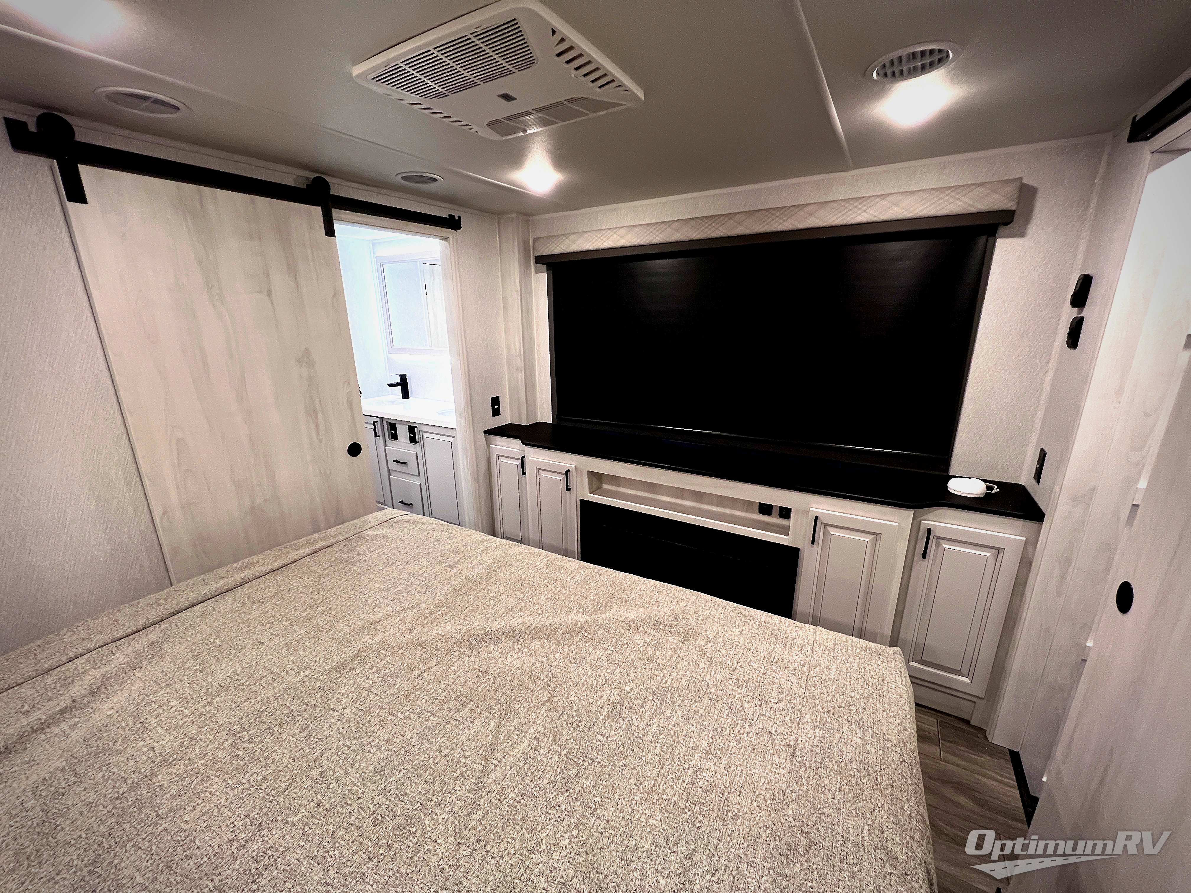 The spacious rear kitchen is equipped with a 30” microwave, 24” residential oven, overhead cabinets, breakfast bar with bar stools, walk-in pantry, and 16 cu. ft. refrigerator, perfect for cooking all your favorite dishes with the greatest convenience The living room is the heart of the home, featuring a desk with chairs, theater seating, two 60” trifold sofas, a TV with fireplace, and more. And when nature calls, you'll appreciate the convenient half bath with overhead cabinets and washer and dryer prep. The main bedroom is a serene retreat, featuring a king bed, drawers under the bed, a bedroom fireplace, and more. This is the perfect place to relax and recharge after a long day of adventure, and with a front full bathroom featuring a 30” x 40” shower, dual sink vanity, walk-in closet, dresser/drawers, you'll have everything you need to stay clean and comfortable on the go. Outside, you'll find not one, but two awnings to providing plenty of shade and protection from the elements.