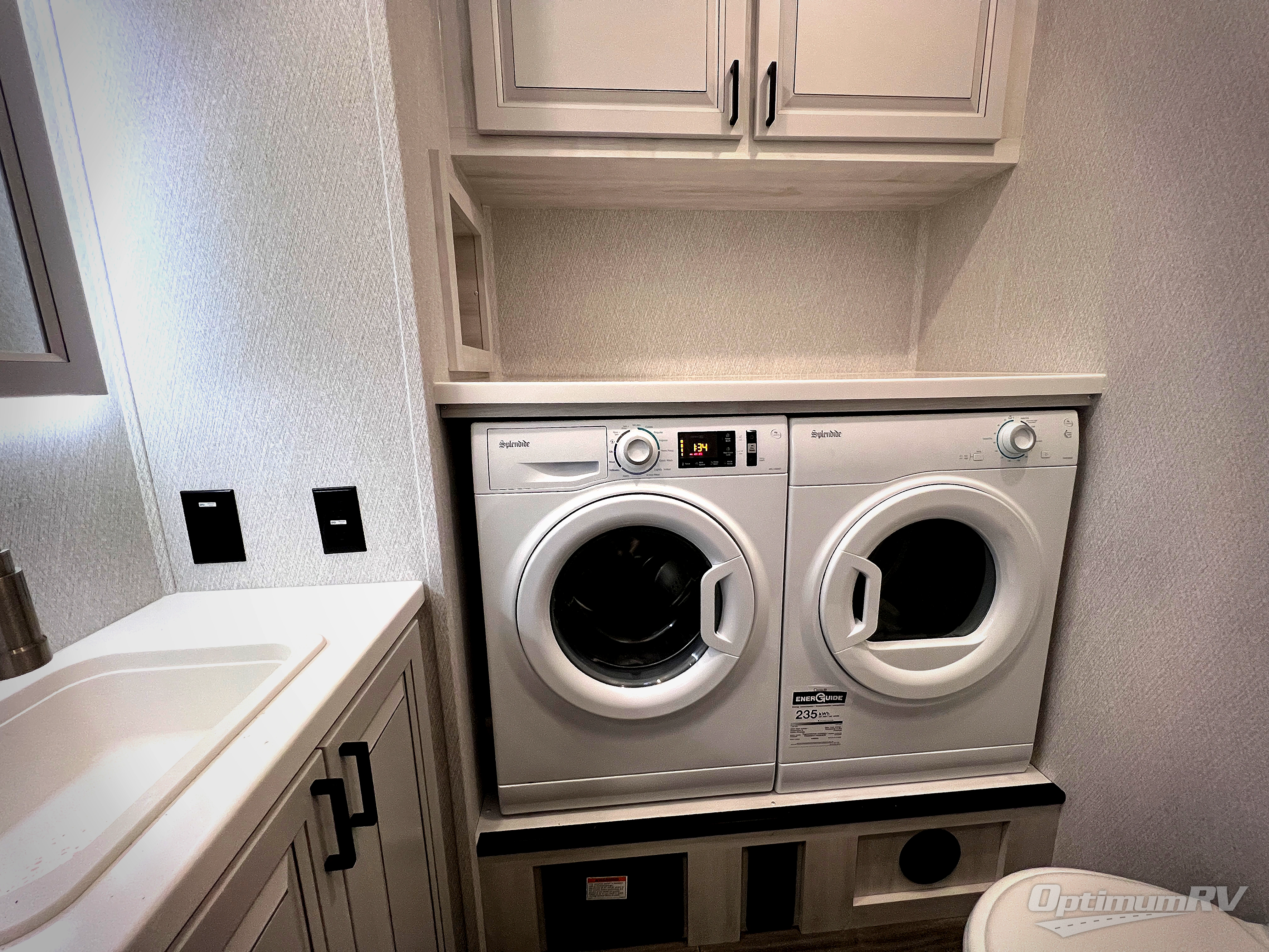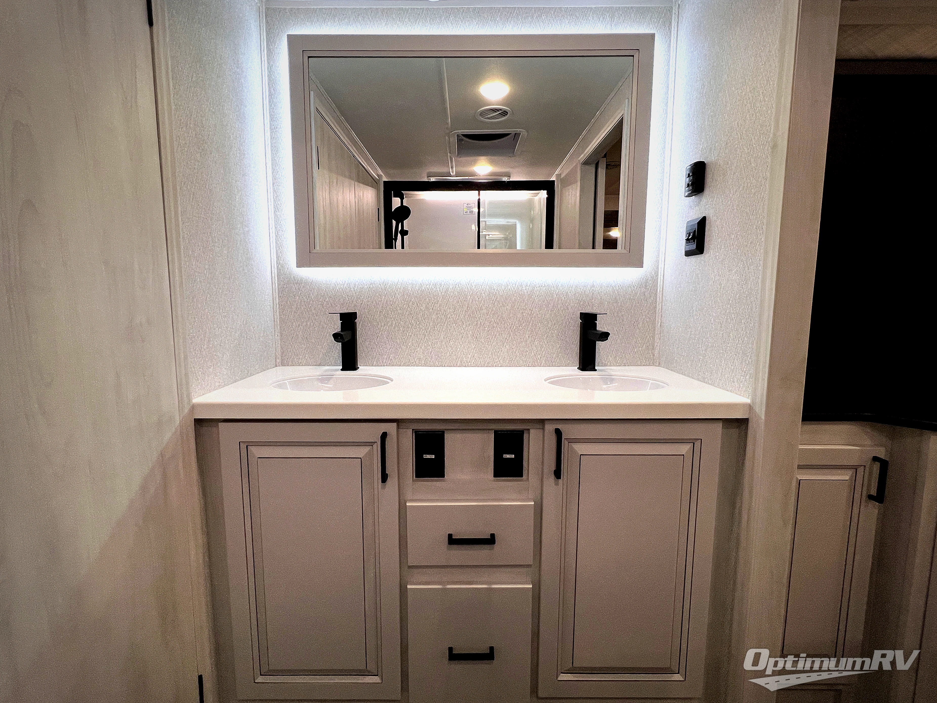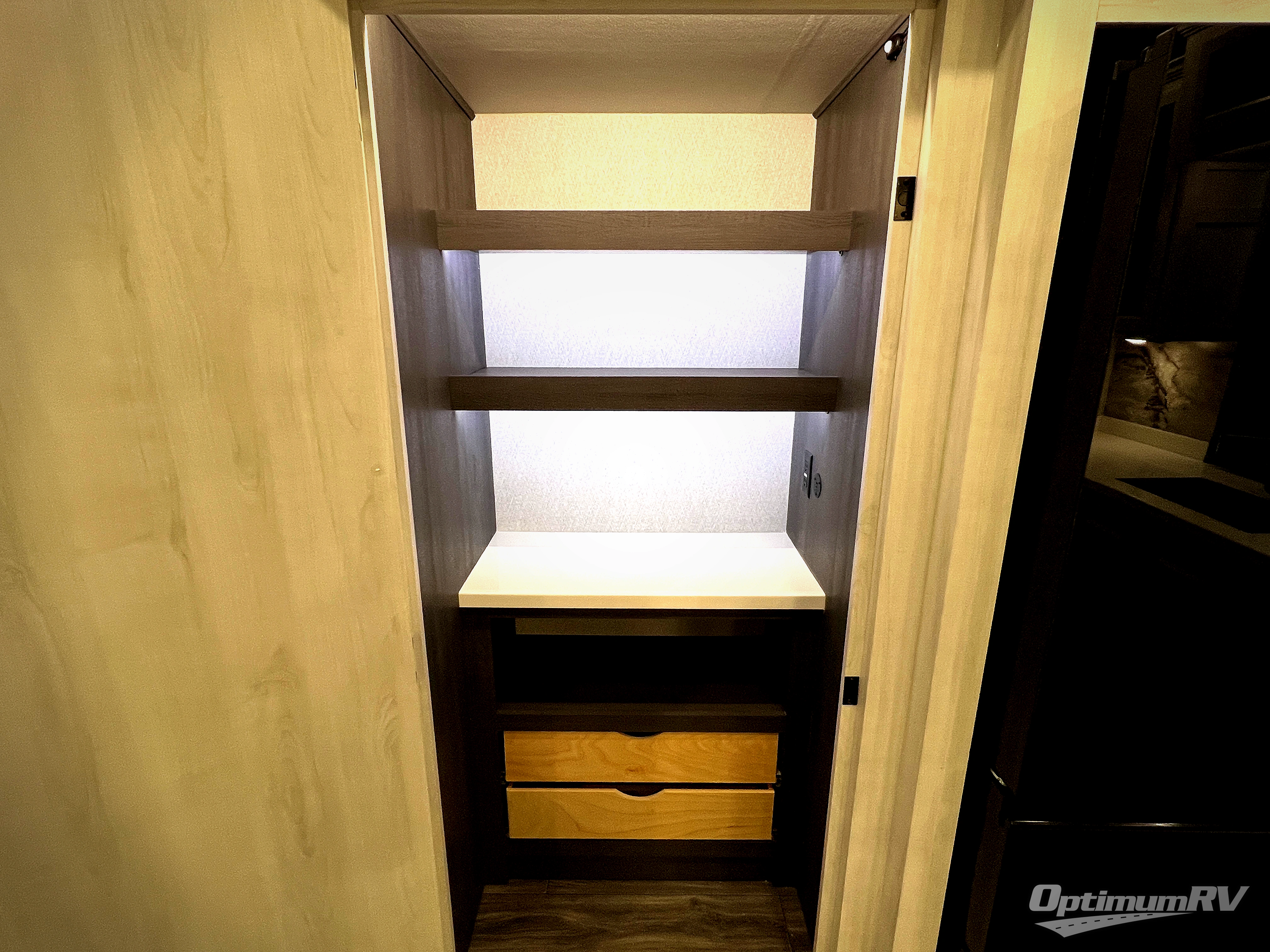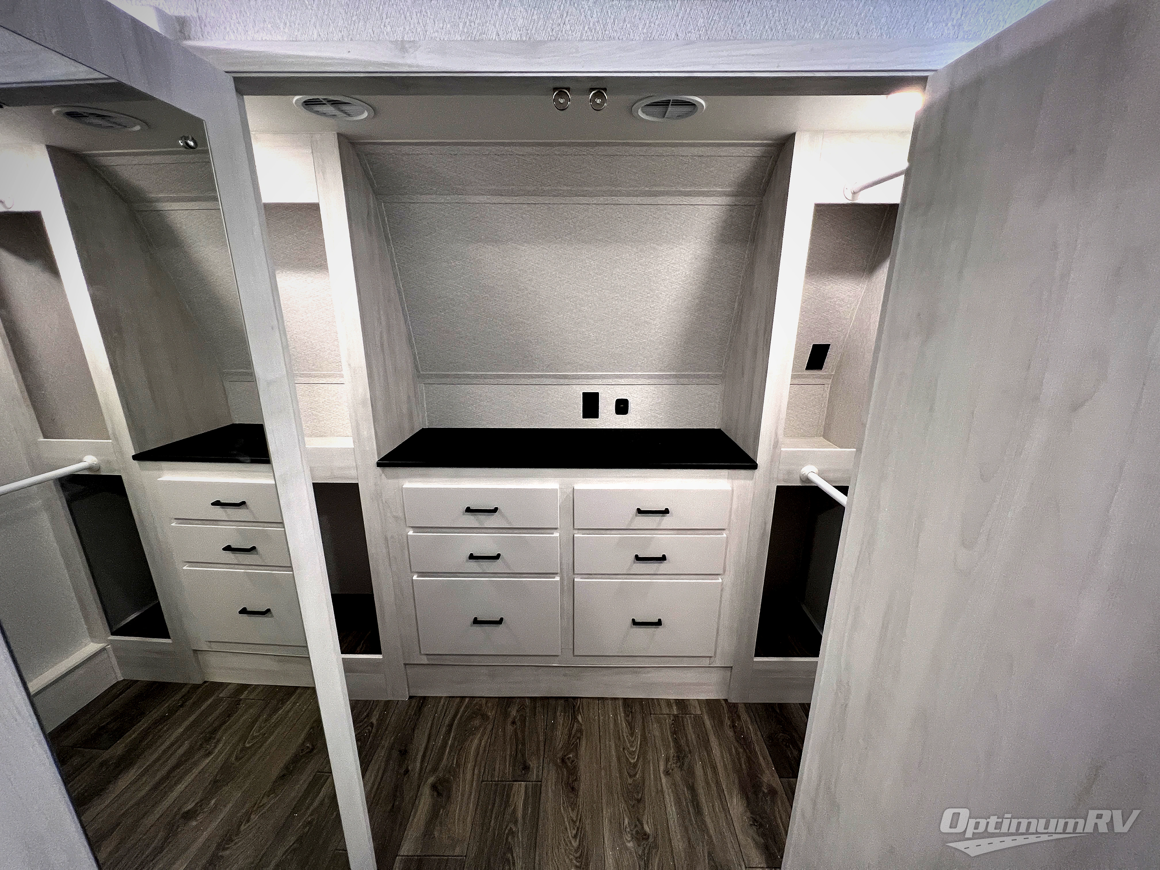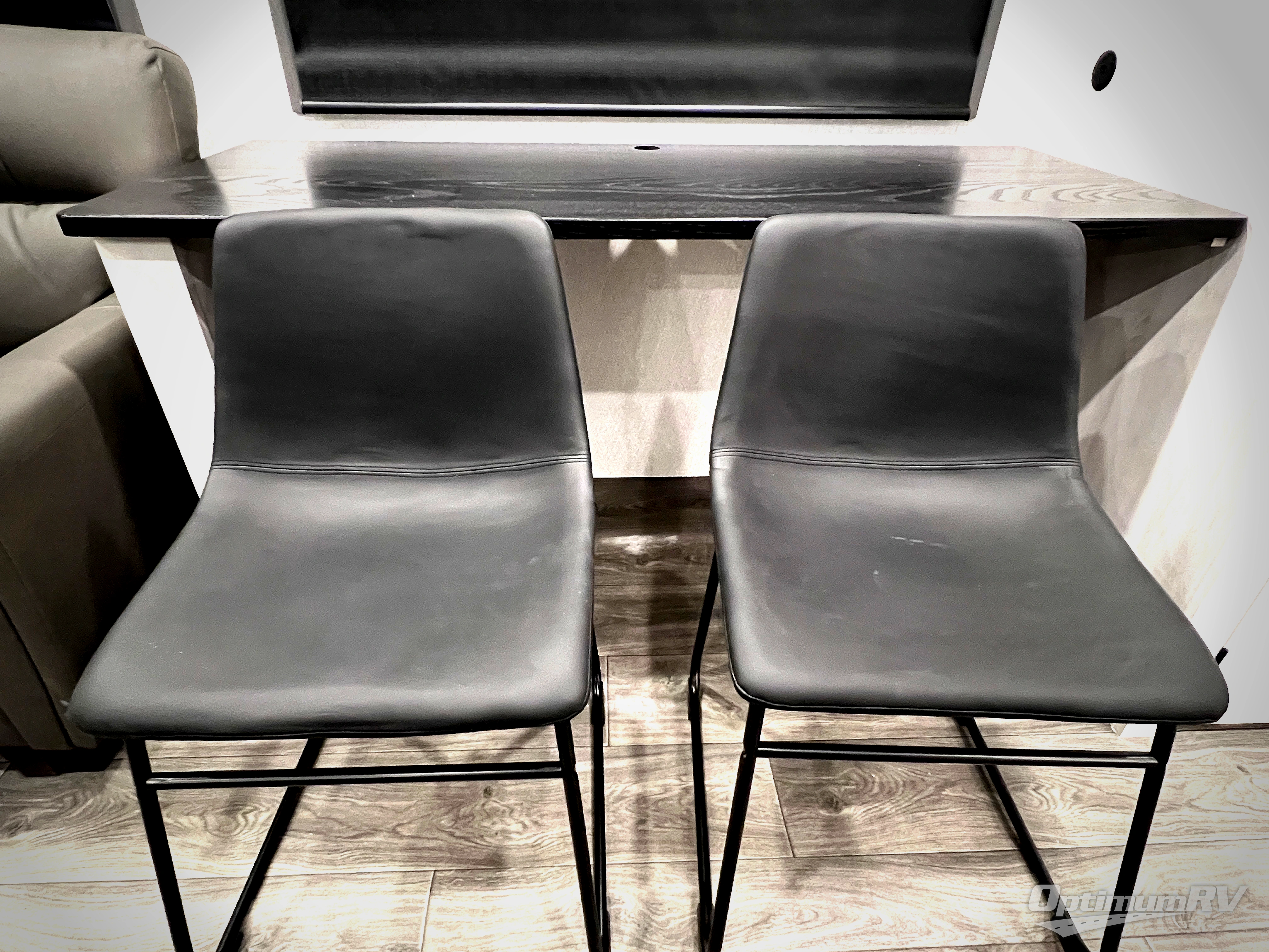 The spacious rear kitchen is equipped with a 30” microwave, 24” residential oven, overhead cabinets, breakfast bar with bar stools, walk-in pantry, and 16 cu. ft. refrigerator, perfect for cooking all your favorite dishes with the greatest convenience The living room is the heart of the home, featuring a desk with chairs, theater seating, two 60” trifold sofas, a TV with fireplace, and more. And when nature calls, you'll appreciate the convenient half bath with overhead cabinets and washer and dryer prep. The main bedroom is a serene retreat, featuring a king bed, drawers under the bed, a bedroom fireplace, and more. This is the perfect place to relax and recharge after a long day of adventure, and with a front full bathroom featuring a 30” x 40” shower, dual sink vanity, walk-in closet, dresser/drawers, you'll have everything you need to stay clean and comfortable on the go. Outside, you'll find not one, but two awnings to providing plenty of shade and protection from the elements.