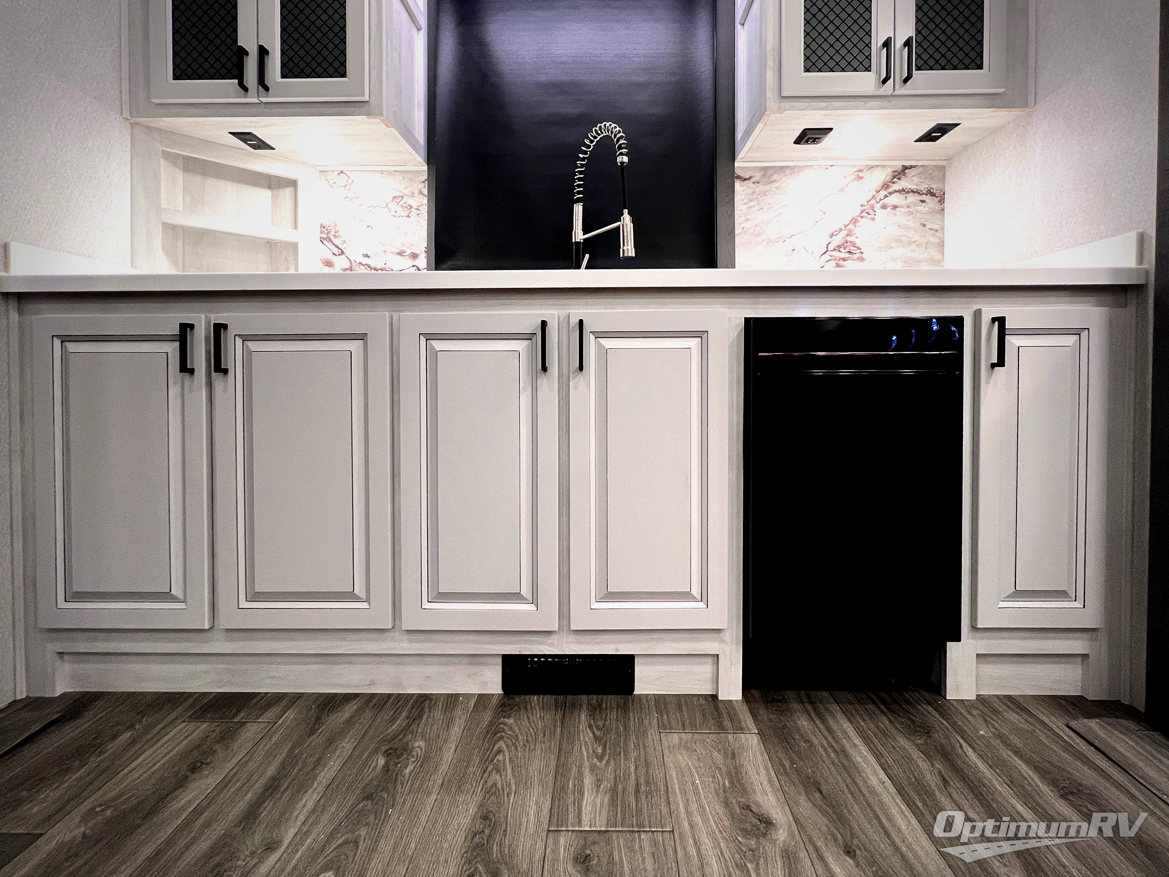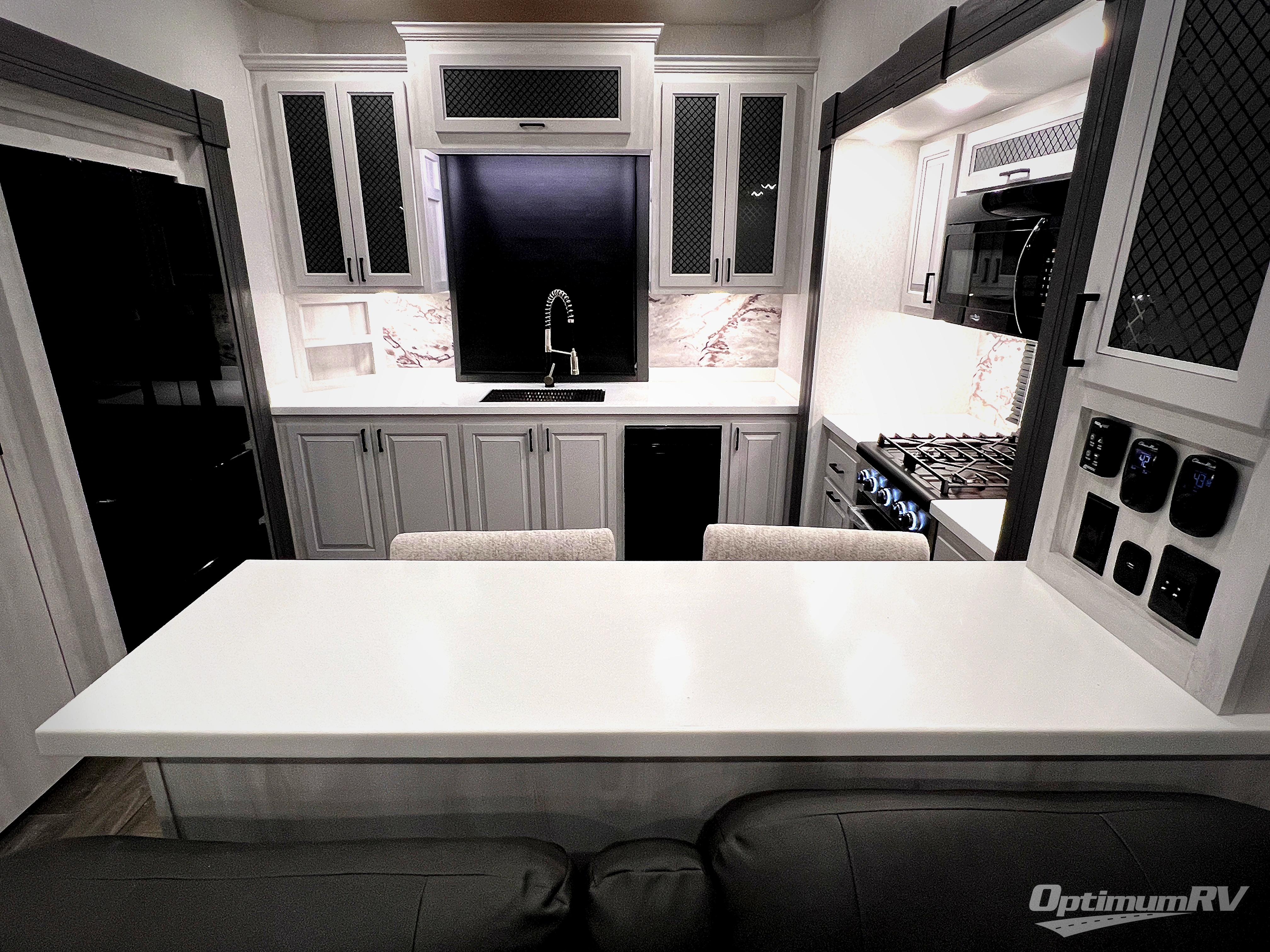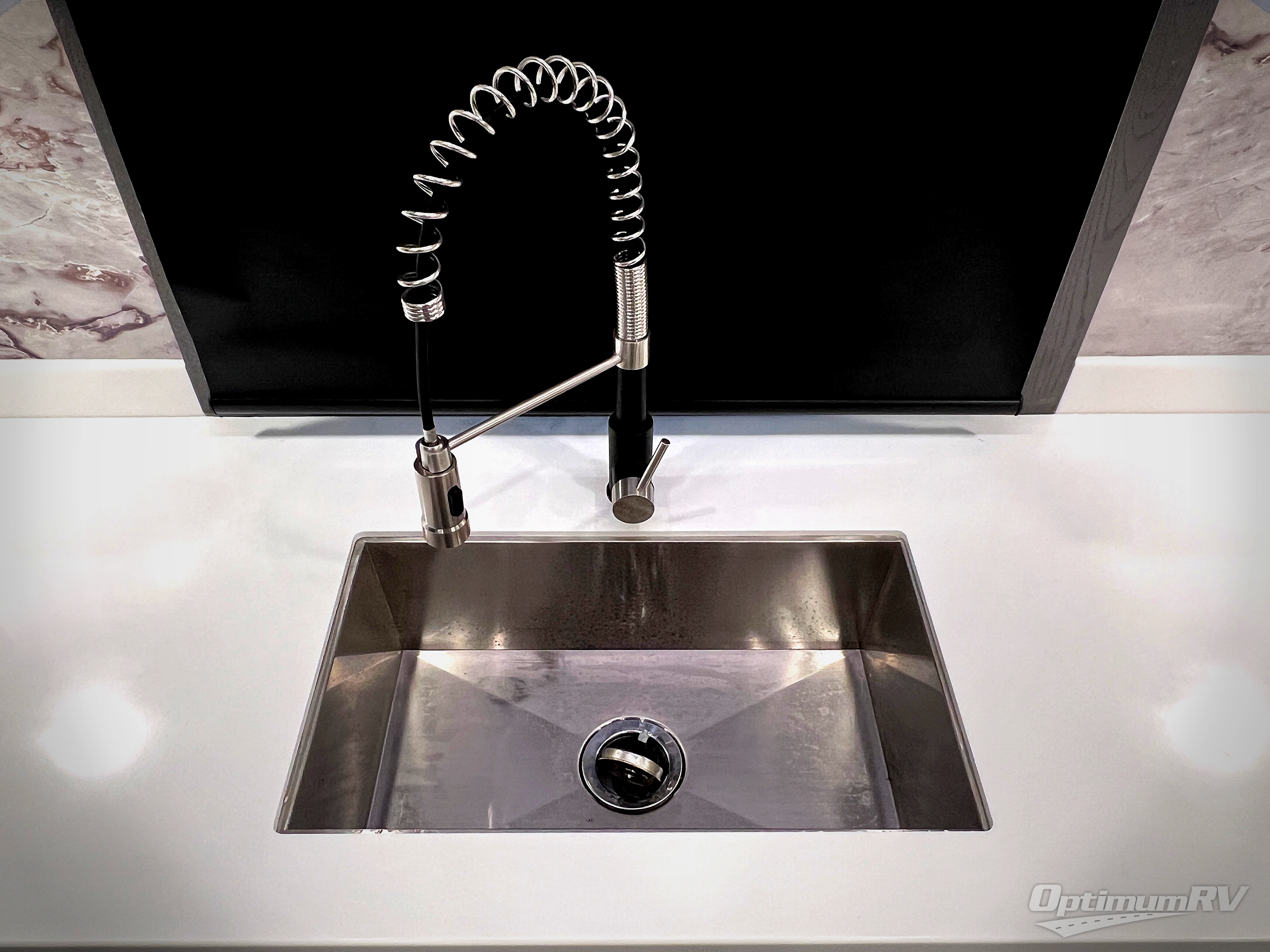 There is just too much luxury to name on the EAST TO WEST Ahara fifth wheel! These units are quite impressive, and once you see them, you'll know what we mean. The Ahara first grabs your attention with its fully painted aerodynamic fiberglass front cap, 102" wide-body chassis, and deep tint square frameless windows. For towing, you'll find a MORryde CRE 3000 suspension, LED marker lights, LED taillights with back-up lights, and rear view camera prep. Traveling in different climates is also made easy with the high-efficiency triple A/C system, 40,000 BTU high-capacity furnace, plus heated, insulated, and enclosed underbelly found within the Climate Package. Head inside to enjoy Slow Rise roller shades, a flush floor kitchen slide to help prevent trips, and solid surface countertops in the kitchen and bath to name a few luxuries!