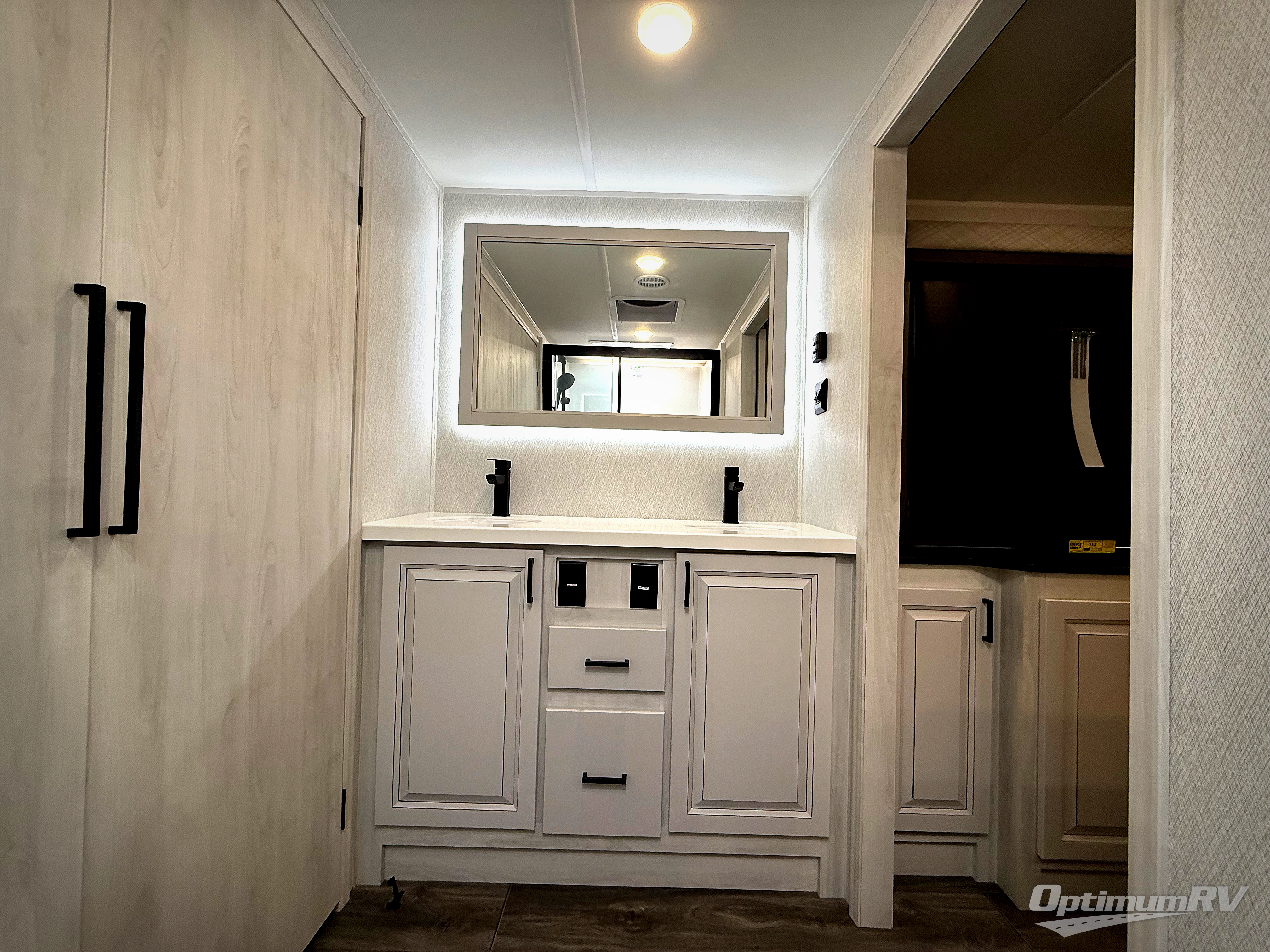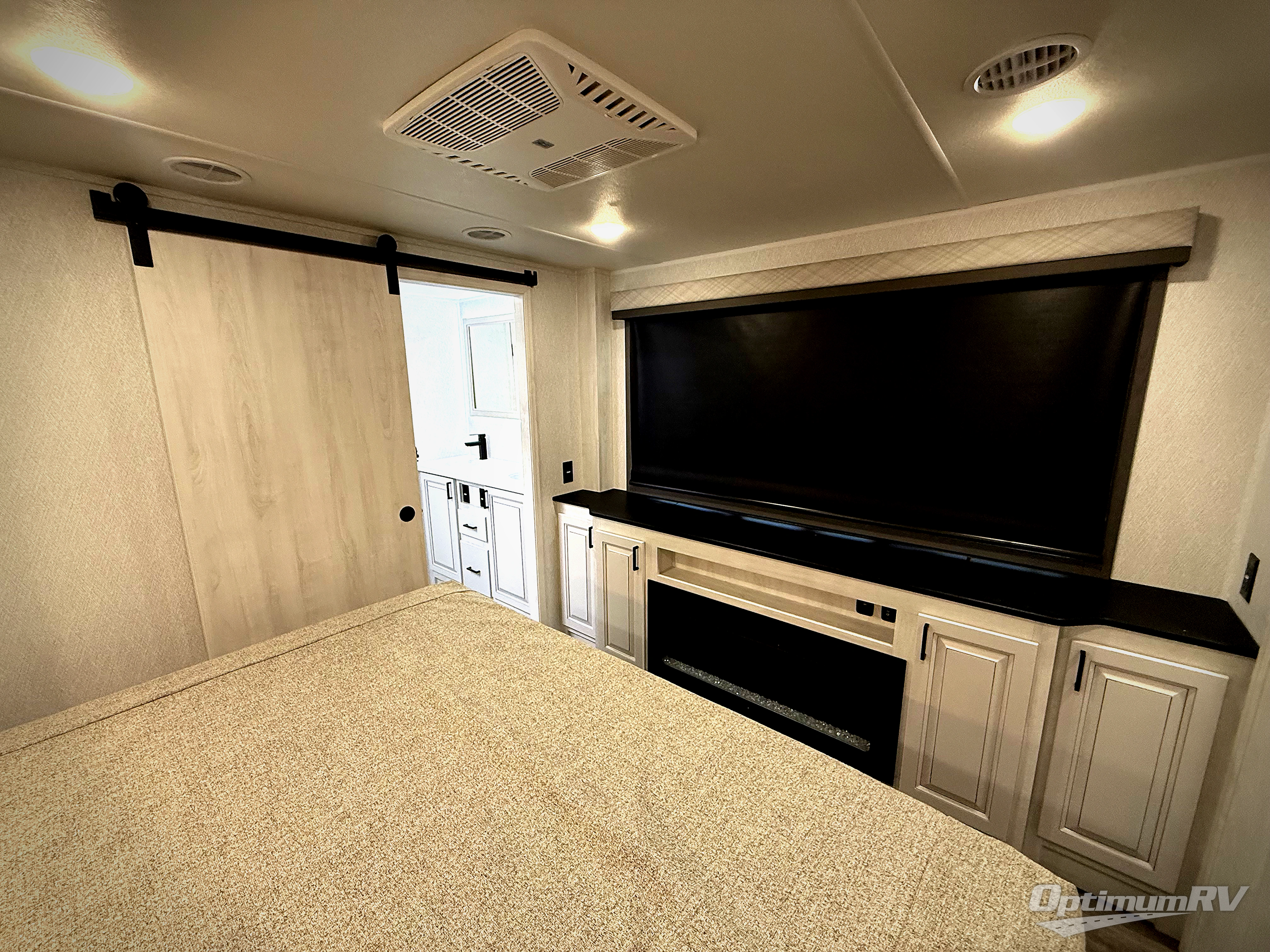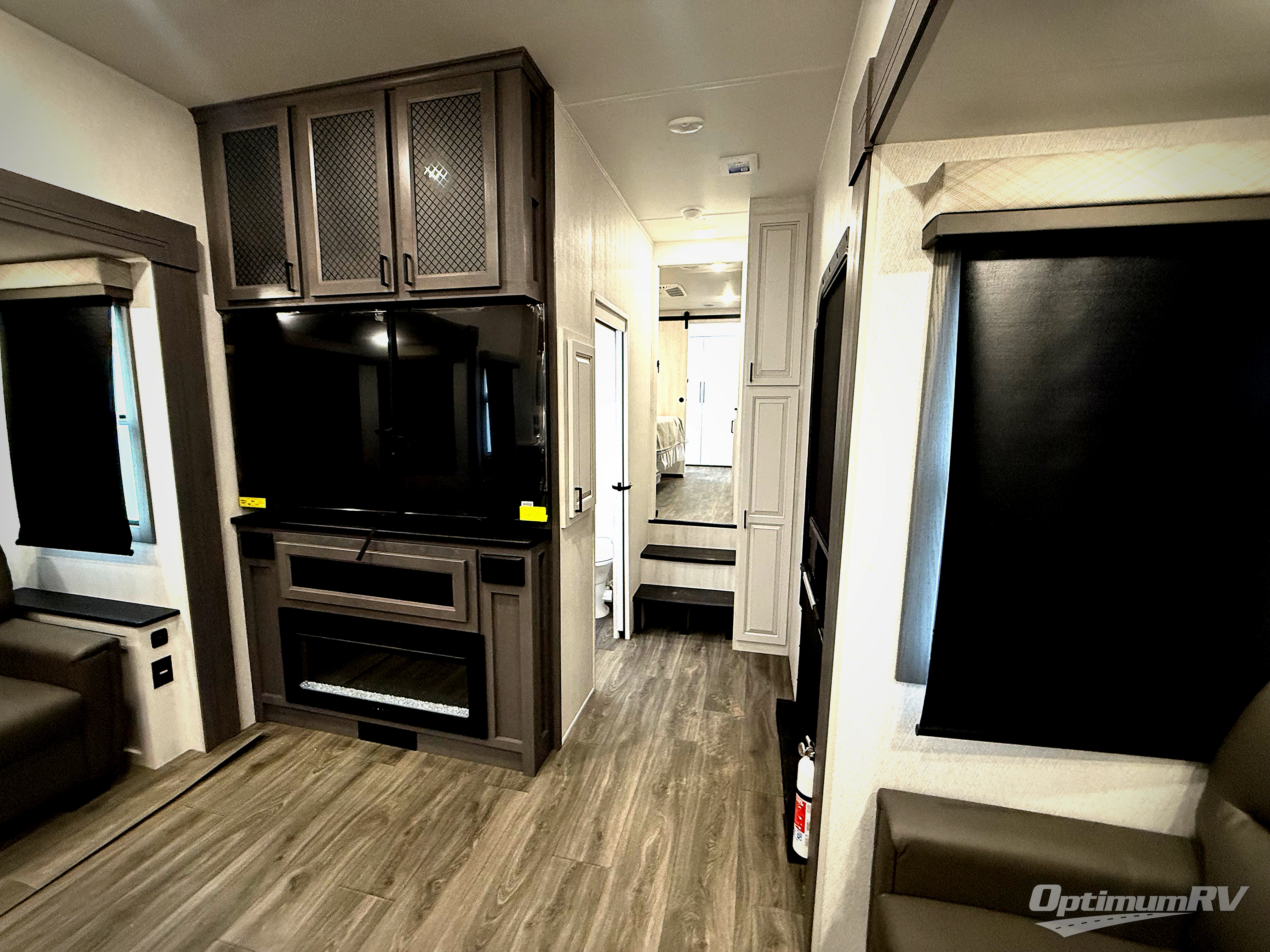 The spacious rear kitchen is equipped with a 30” microwave, 24” residential oven, overhead cabinets, breakfast bar with bar stools, walk-in pantry, and 16 cu. ft. refrigerator, perfect for cooking all your favorite dishes with the greatest convenience The living room is the heart of the home, featuring a desk with chairs, theater seating, two 60” trifold sofas, a TV with fireplace, and more. And when nature calls, you'll appreciate the convenient half bath with overhead cabinets and washer and dryer prep. The main bedroom is a serene retreat, featuring a king bed, drawers under the bed, a bedroom fireplace, and more. This is the perfect place to relax and recharge after a long day of adventure, and with a front full bathroom featuring a 30” x 40” shower, dual sink vanity, walk-in closet, dresser/drawers, you'll have everything you need to stay clean and comfortable on the go. Outside, you'll find not one, but two awnings to providing plenty of shade and protection from the elements.