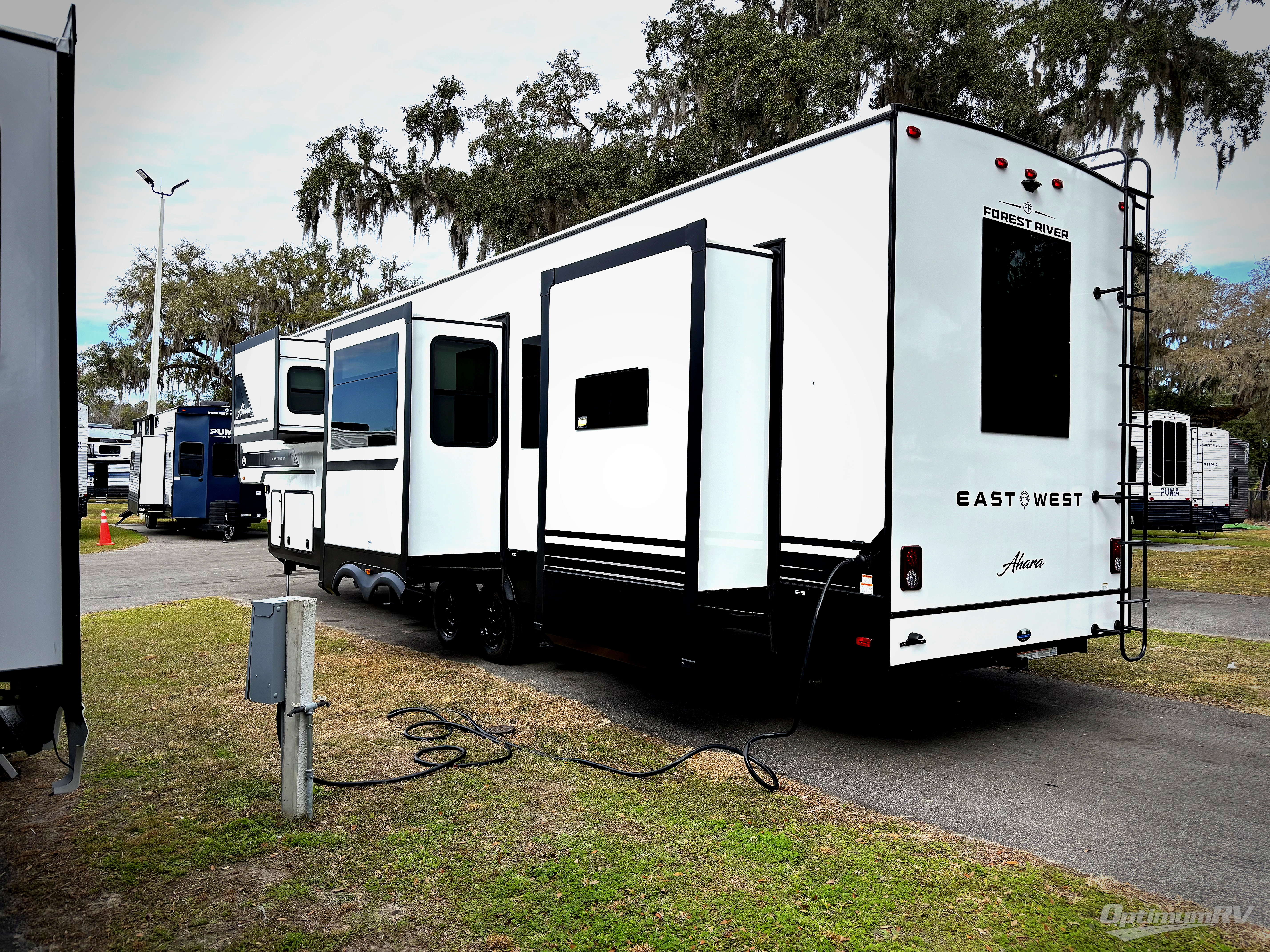 There is just too much luxury to name on the EAST TO WEST Ahara fifth wheel! These units are quite impressive, and once you see them, you'll know what we mean. The Ahara first grabs your attention with its fully painted aerodynamic fiberglass front cap, 102" wide-body chassis, and deep tint square frameless windows. For towing, you'll find a MORryde CRE 3000 suspension, LED marker lights, LED taillights with back-up lights, and rear view camera prep. Traveling in different climates is also made easy with the high-efficiency triple A/C system, 40,000 BTU high-capacity furnace, plus heated, insulated, and enclosed underbelly found within the Climate Package. Head inside to enjoy Slow Rise roller shades, a flush floor kitchen slide to help prevent trips, and solid surface countertops in the kitchen and bath to name a few luxuries!