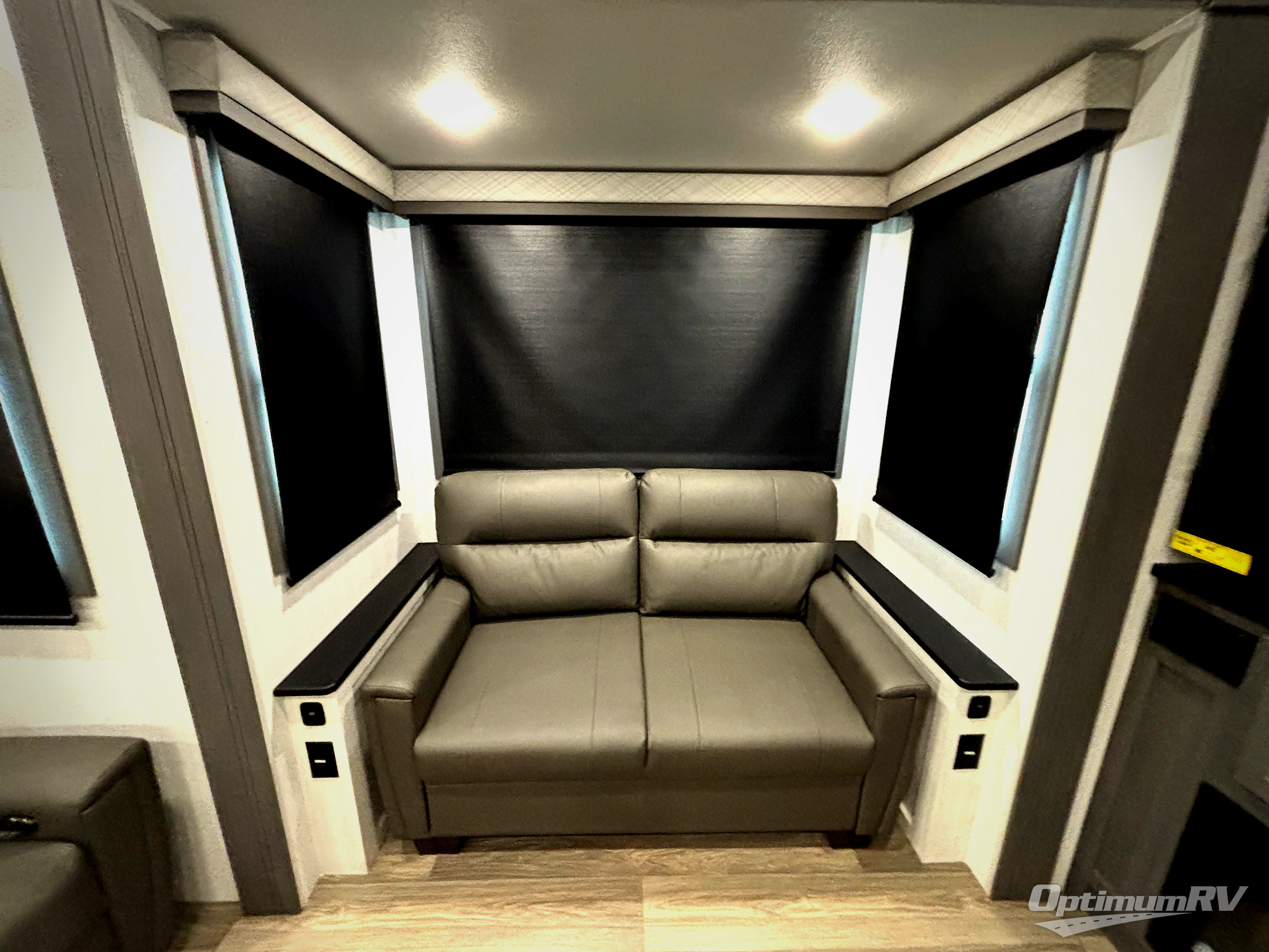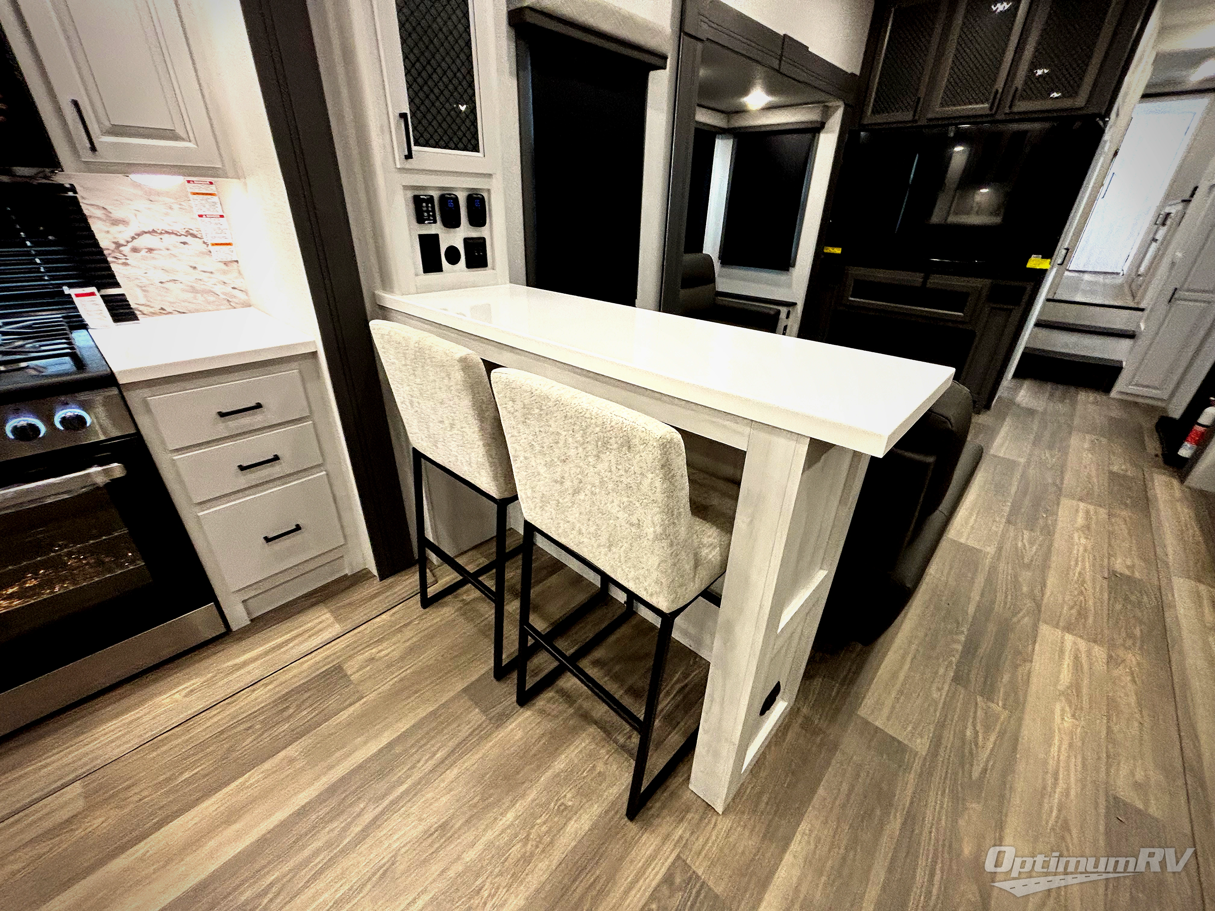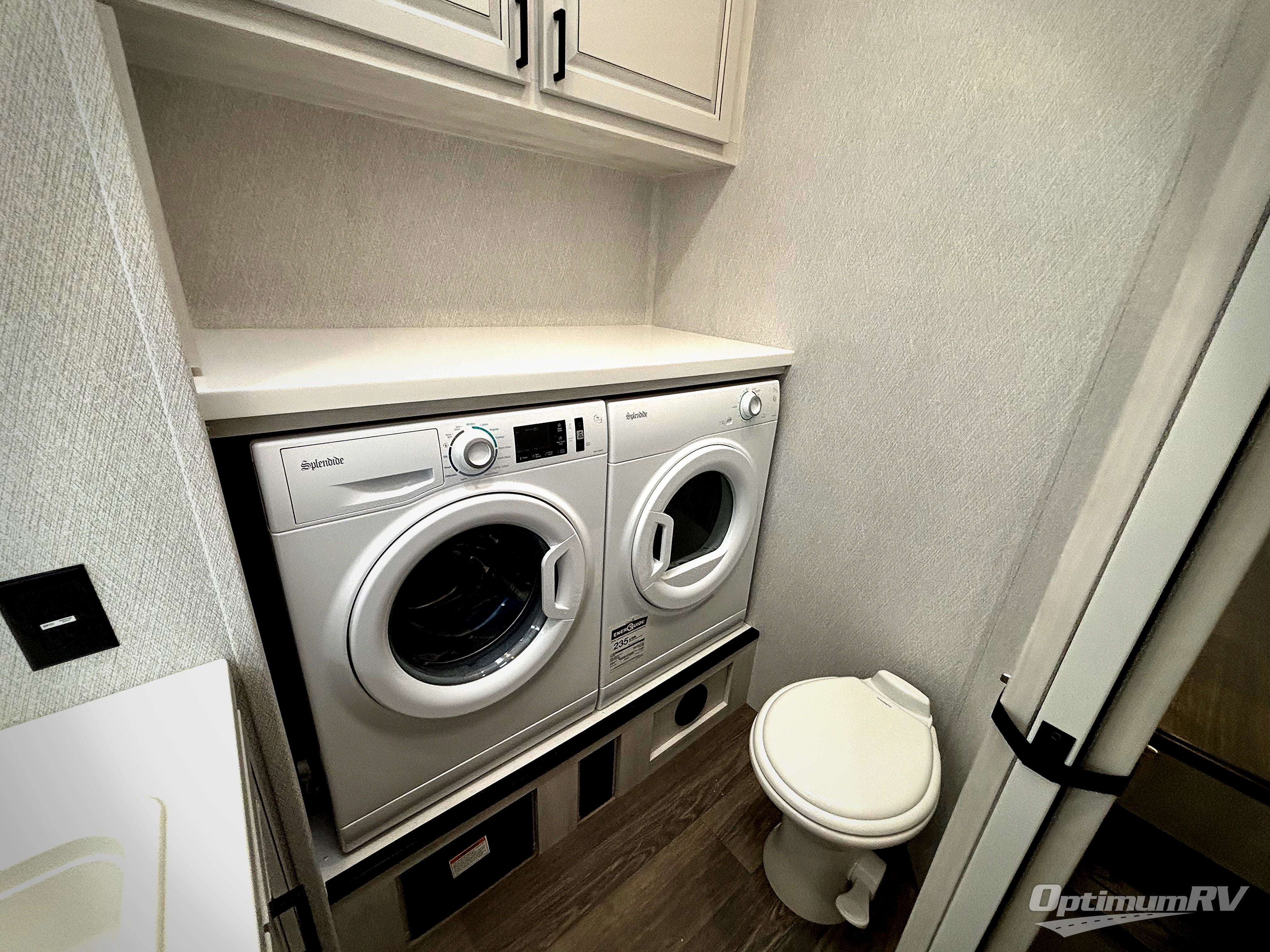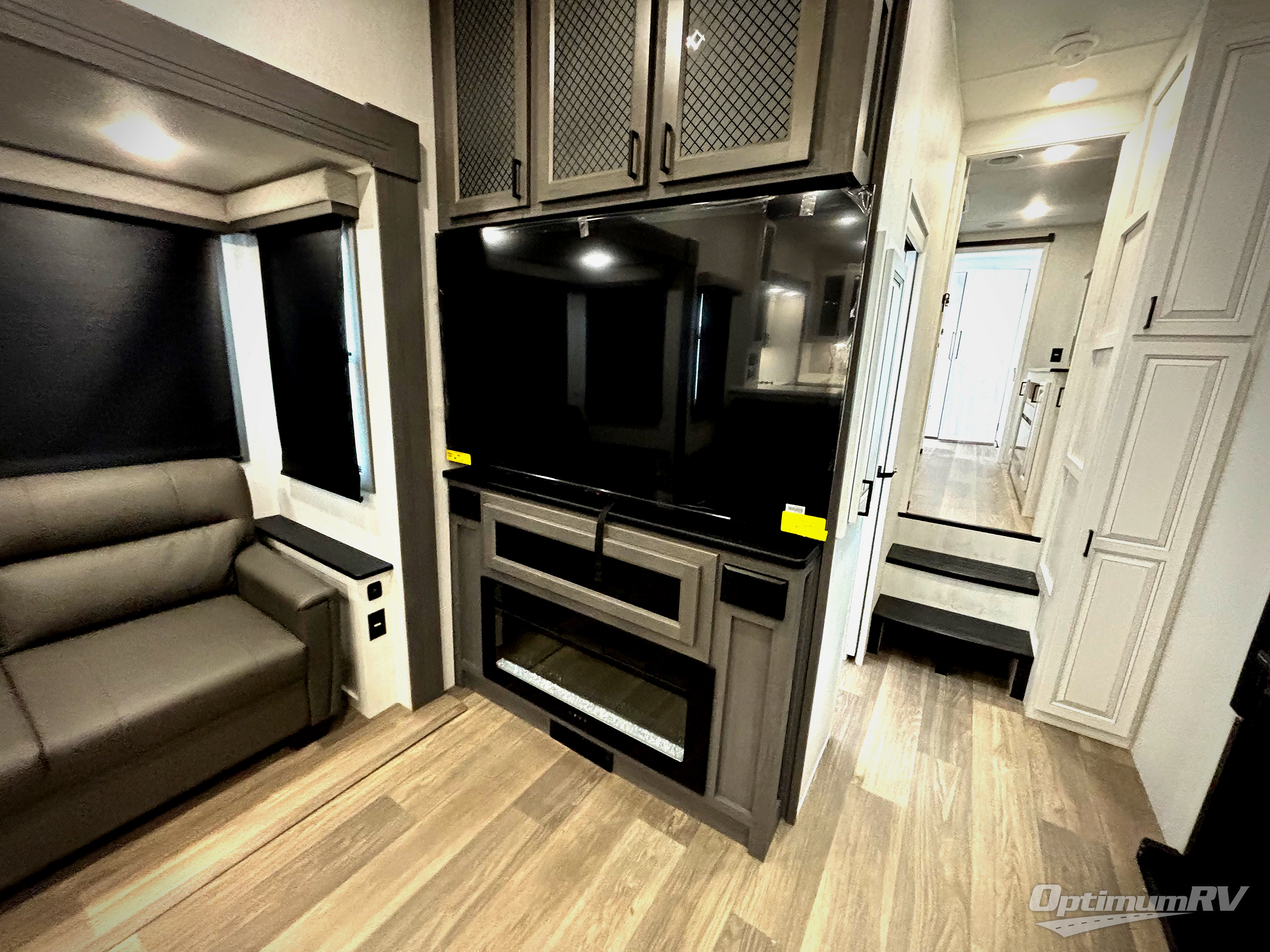 The spacious rear kitchen is equipped with a 30” microwave, 24” residential oven, overhead cabinets, breakfast bar with bar stools, walk-in pantry, and 16 cu. ft. refrigerator, perfect for cooking all your favorite dishes with the greatest convenience The living room is the heart of the home, featuring a desk with chairs, theater seating, two 60” trifold sofas, a TV with fireplace, and more. And when nature calls, you'll appreciate the convenient half bath with overhead cabinets and washer and dryer prep. The main bedroom is a serene retreat, featuring a king bed, drawers under the bed, a bedroom fireplace, and more. This is the perfect place to relax and recharge after a long day of adventure, and with a front full bathroom featuring a 30” x 40” shower, dual sink vanity, walk-in closet, dresser/drawers, you'll have everything you need to stay clean and comfortable on the go. Outside, you'll find not one, but two awnings to providing plenty of shade and protection from the elements.
