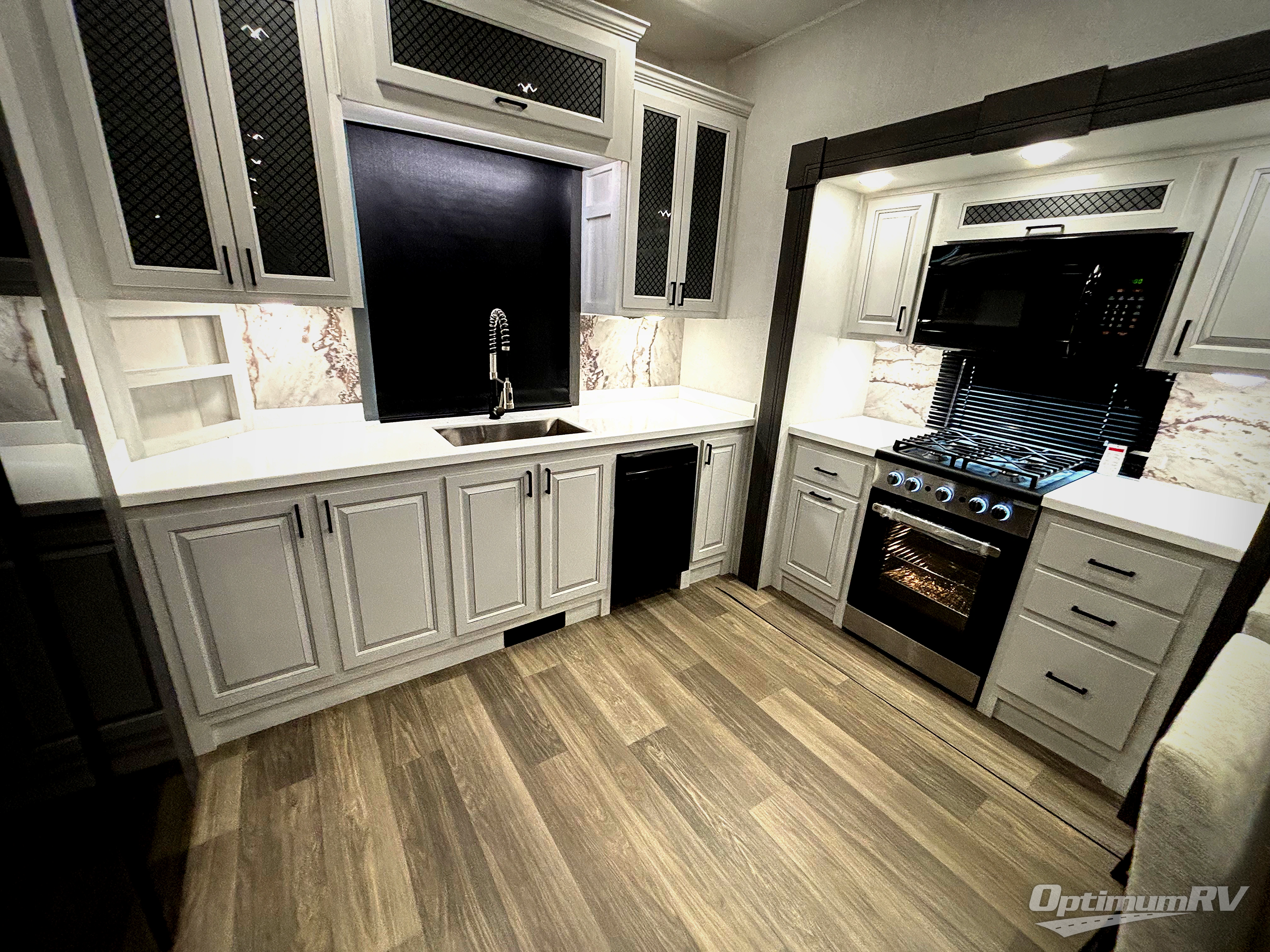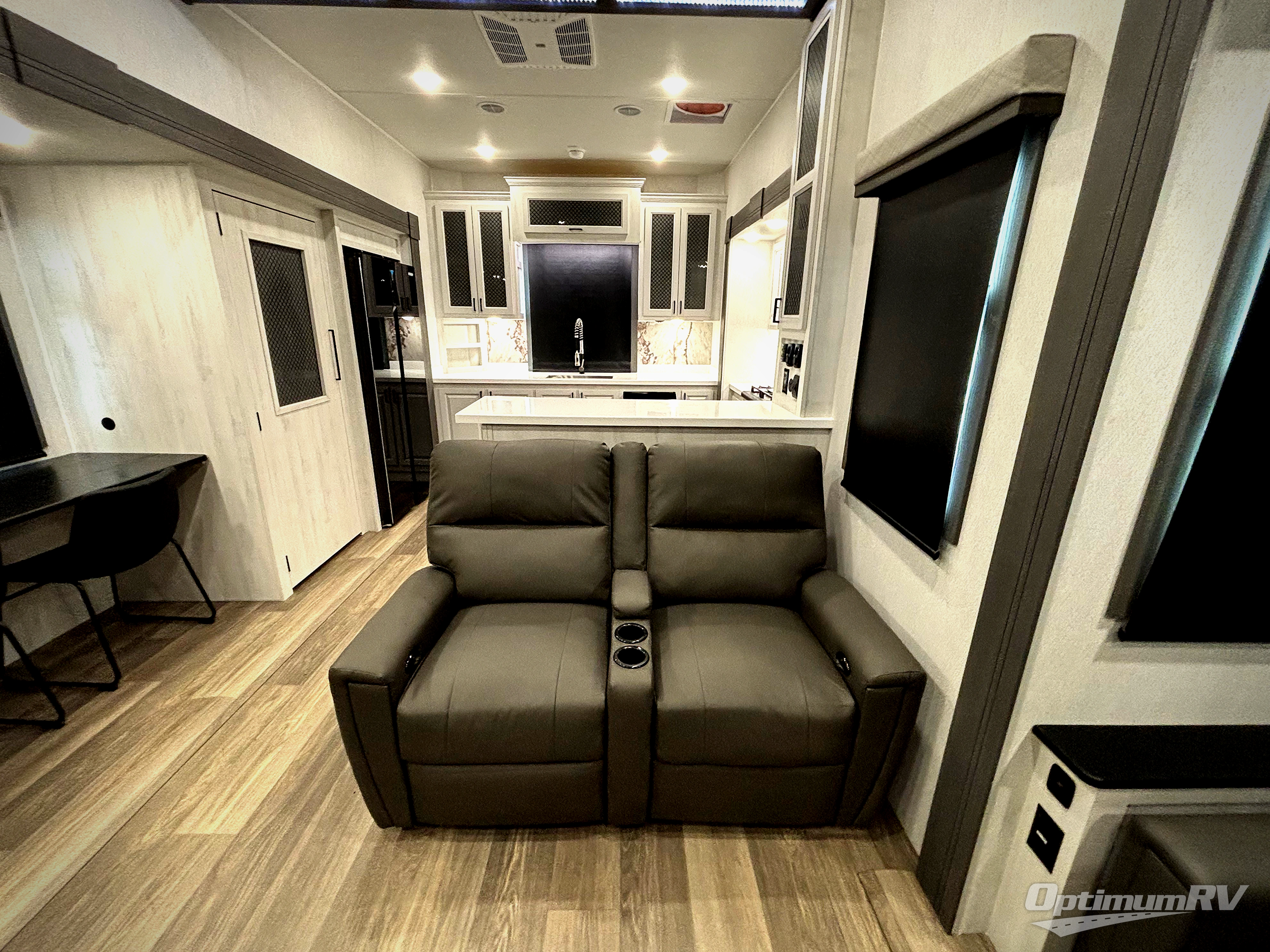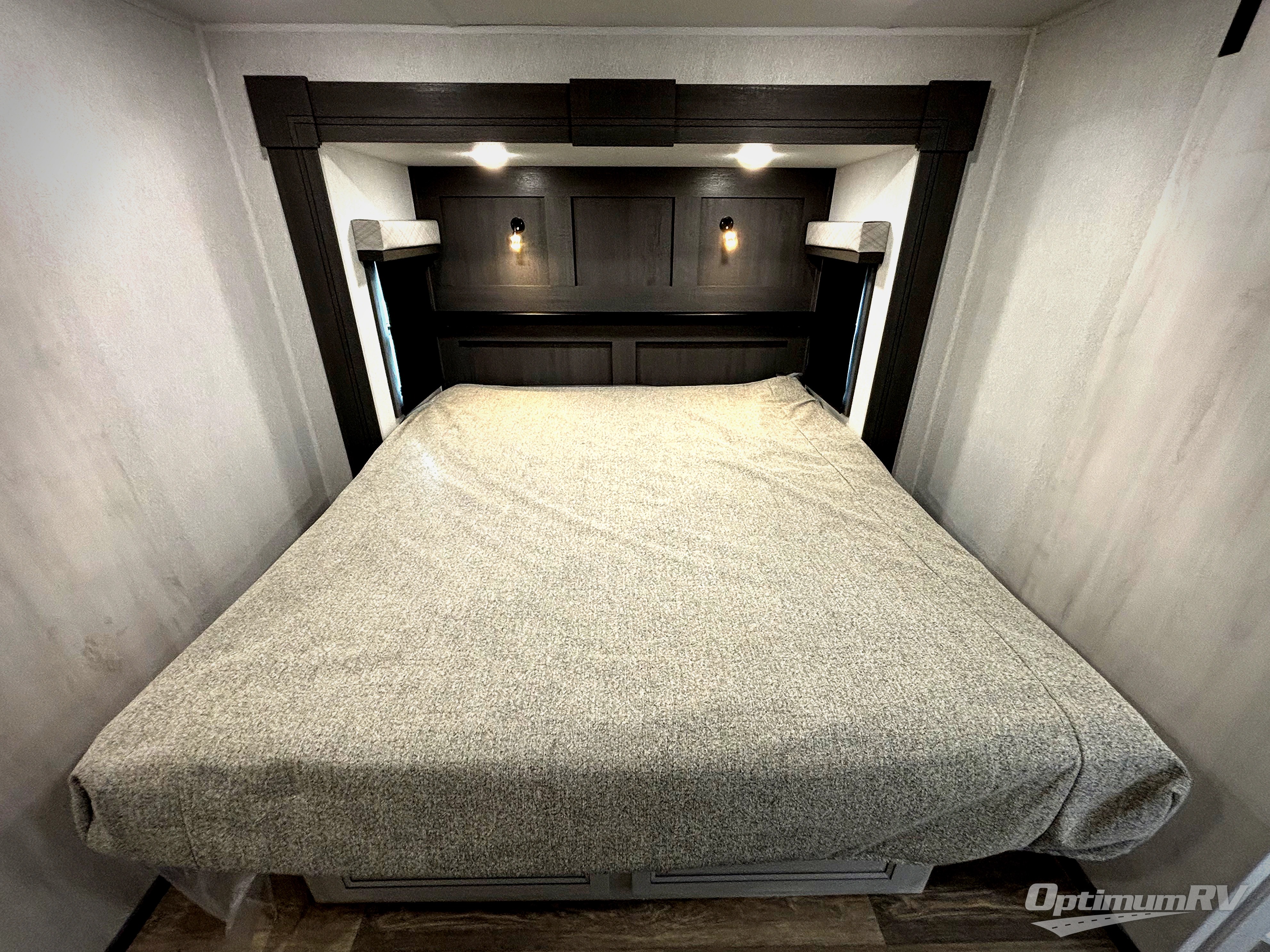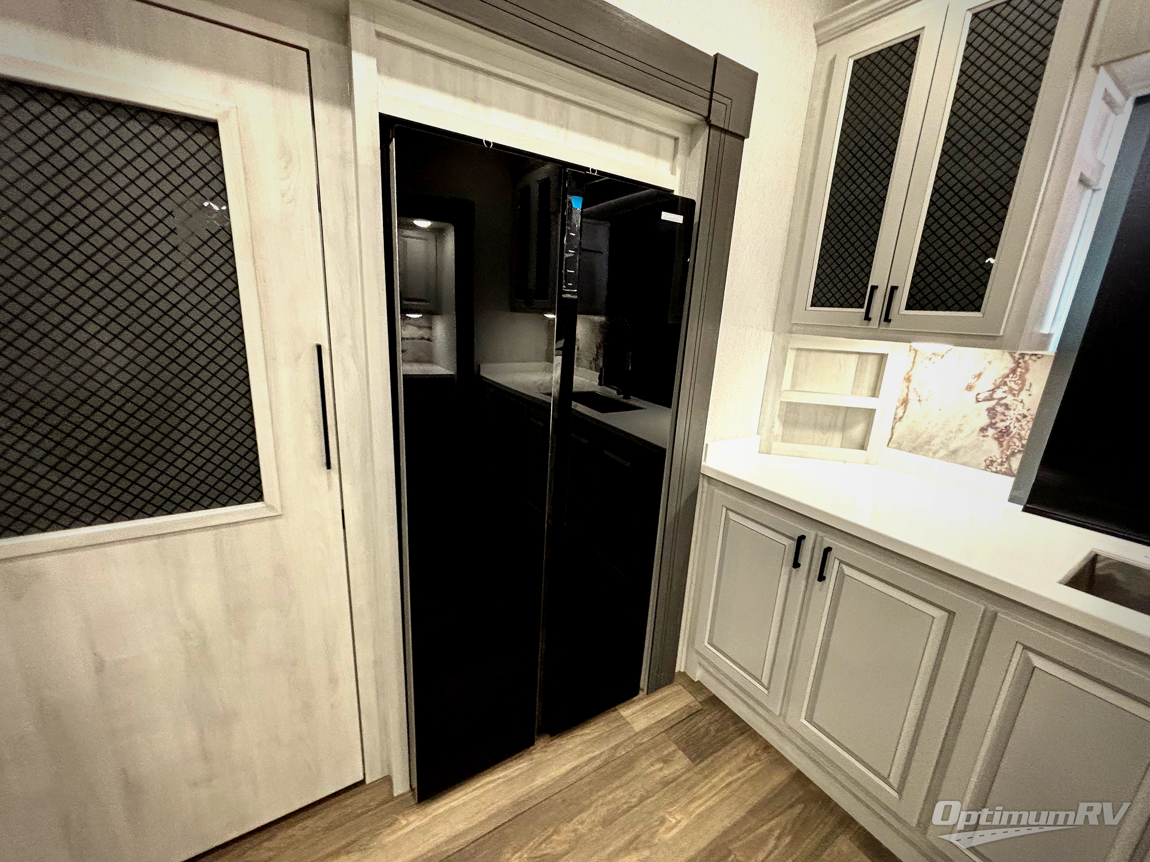 The spacious rear kitchen is equipped with a 30” microwave, 24” residential oven, overhead cabinets, breakfast bar with bar stools, walk-in pantry, and 16 cu. ft. refrigerator, perfect for cooking all your favorite dishes with the greatest convenience The living room is the heart of the home, featuring a desk with chairs, theater seating, two 60” trifold sofas, a TV with fireplace, and more. And when nature calls, you'll appreciate the convenient half bath with overhead cabinets and washer and dryer prep. The main bedroom is a serene retreat, featuring a king bed, drawers under the bed, a bedroom fireplace, and more. This is the perfect place to relax and recharge after a long day of adventure, and with a front full bathroom featuring a 30” x 40” shower, dual sink vanity, walk-in closet, dresser/drawers, you'll have everything you need to stay clean and comfortable on the go. Outside, you'll find not one, but two awnings to providing plenty of shade and protection from the elements.