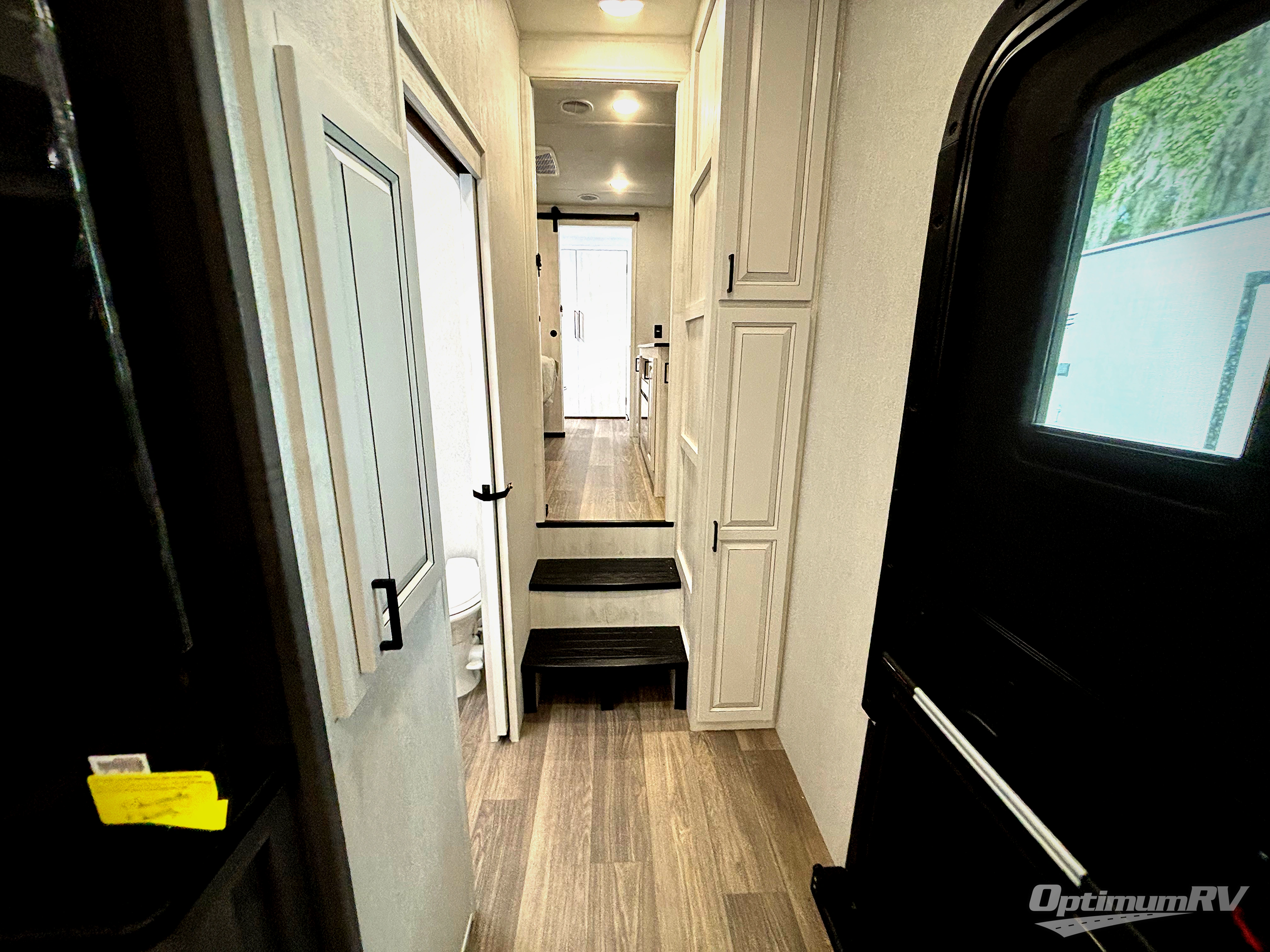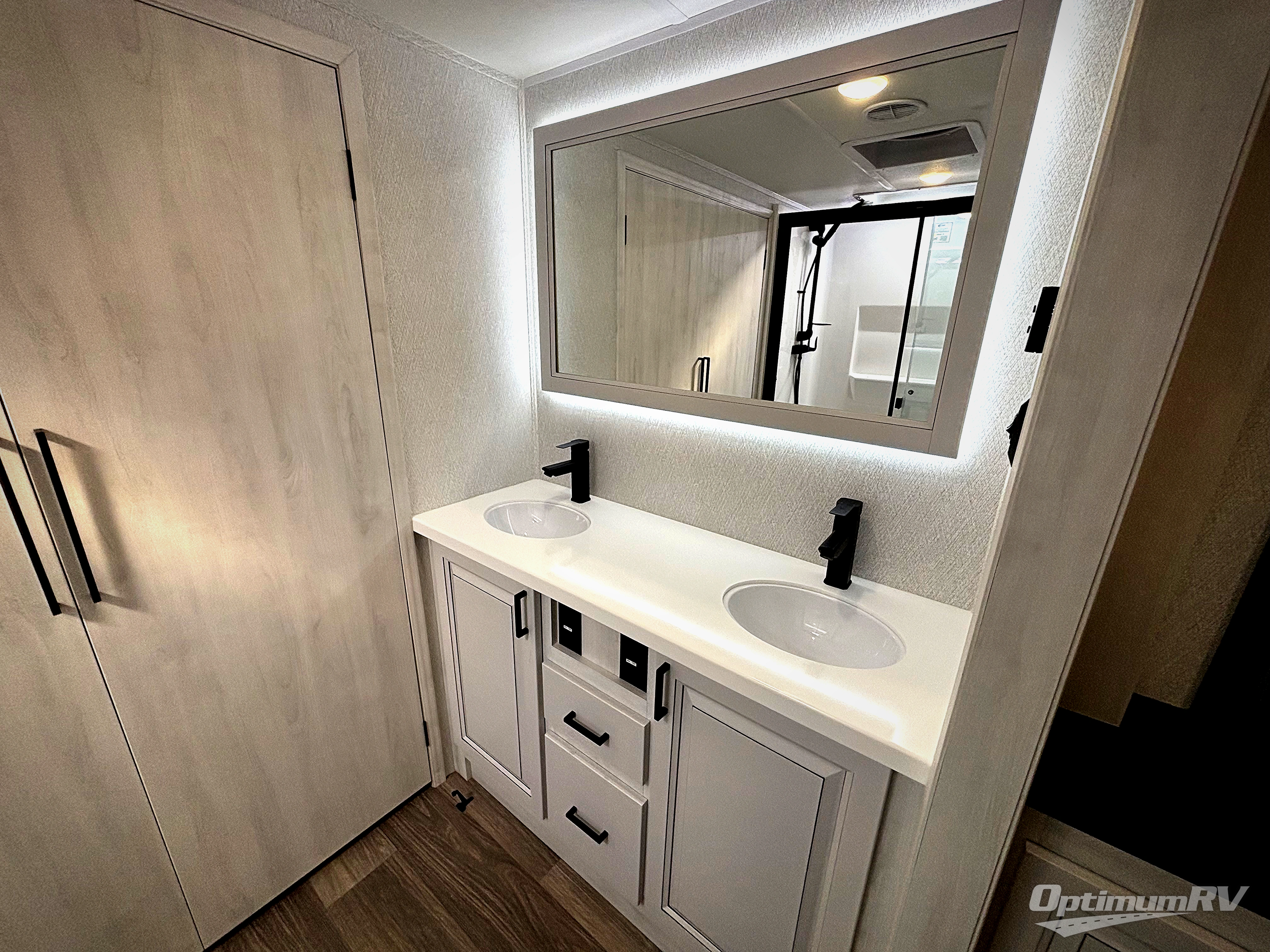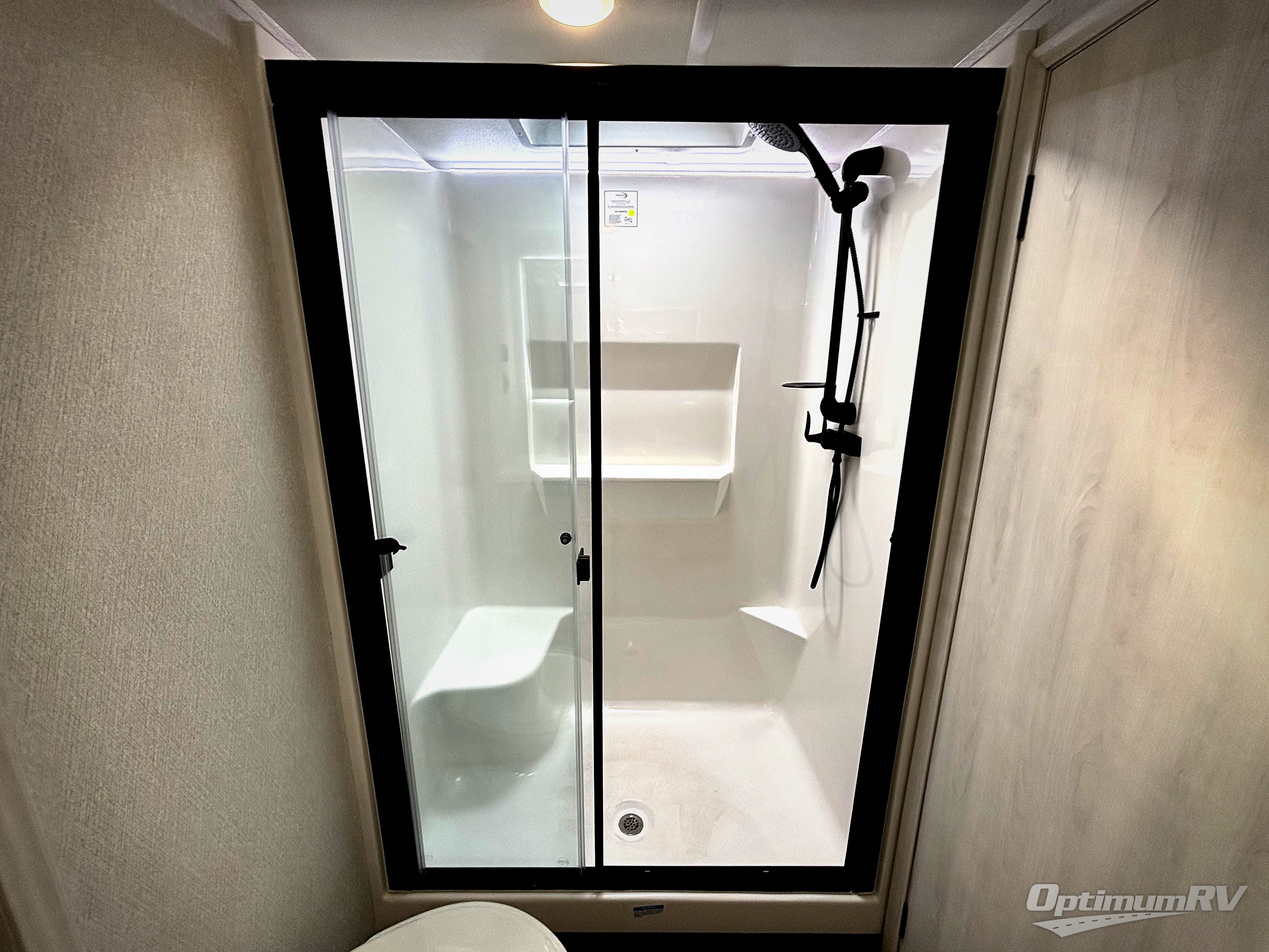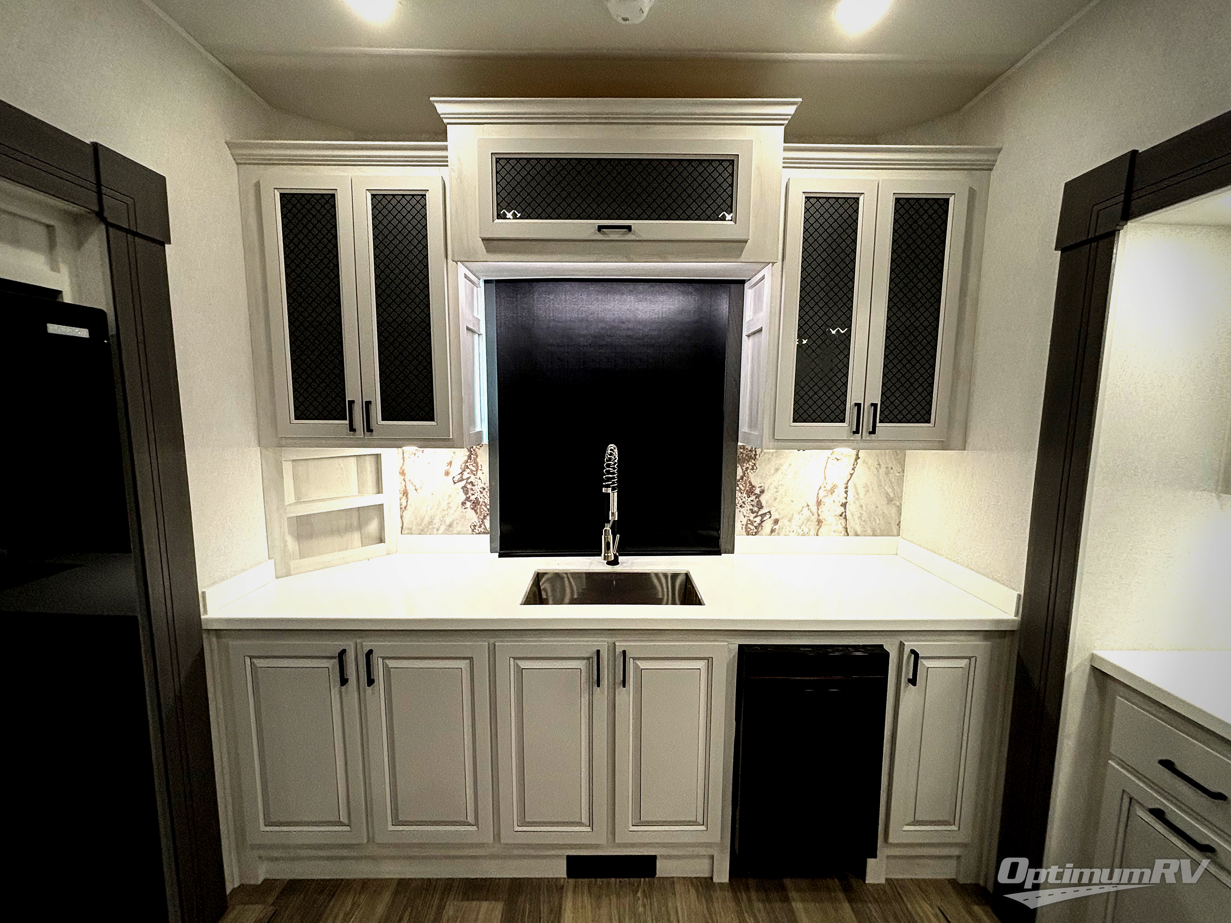 The spacious rear kitchen is equipped with a 30” microwave, 24” residential oven, overhead cabinets, breakfast bar with bar stools, walk-in pantry, and 16 cu. ft. refrigerator, perfect for cooking all your favorite dishes with the greatest convenience The living room is the heart of the home, featuring a desk with chairs, theater seating, two 60” trifold sofas, a TV with fireplace, and more. And when nature calls, you'll appreciate the convenient half bath with overhead cabinets and washer and dryer prep. The main bedroom is a serene retreat, featuring a king bed, drawers under the bed, a bedroom fireplace, and more. This is the perfect place to relax and recharge after a long day of adventure, and with a front full bathroom featuring a 30” x 40” shower, dual sink vanity, walk-in closet, dresser/drawers, you'll have everything you need to stay clean and comfortable on the go. Outside, you'll find not one, but two awnings to providing plenty of shade and protection from the elements.
