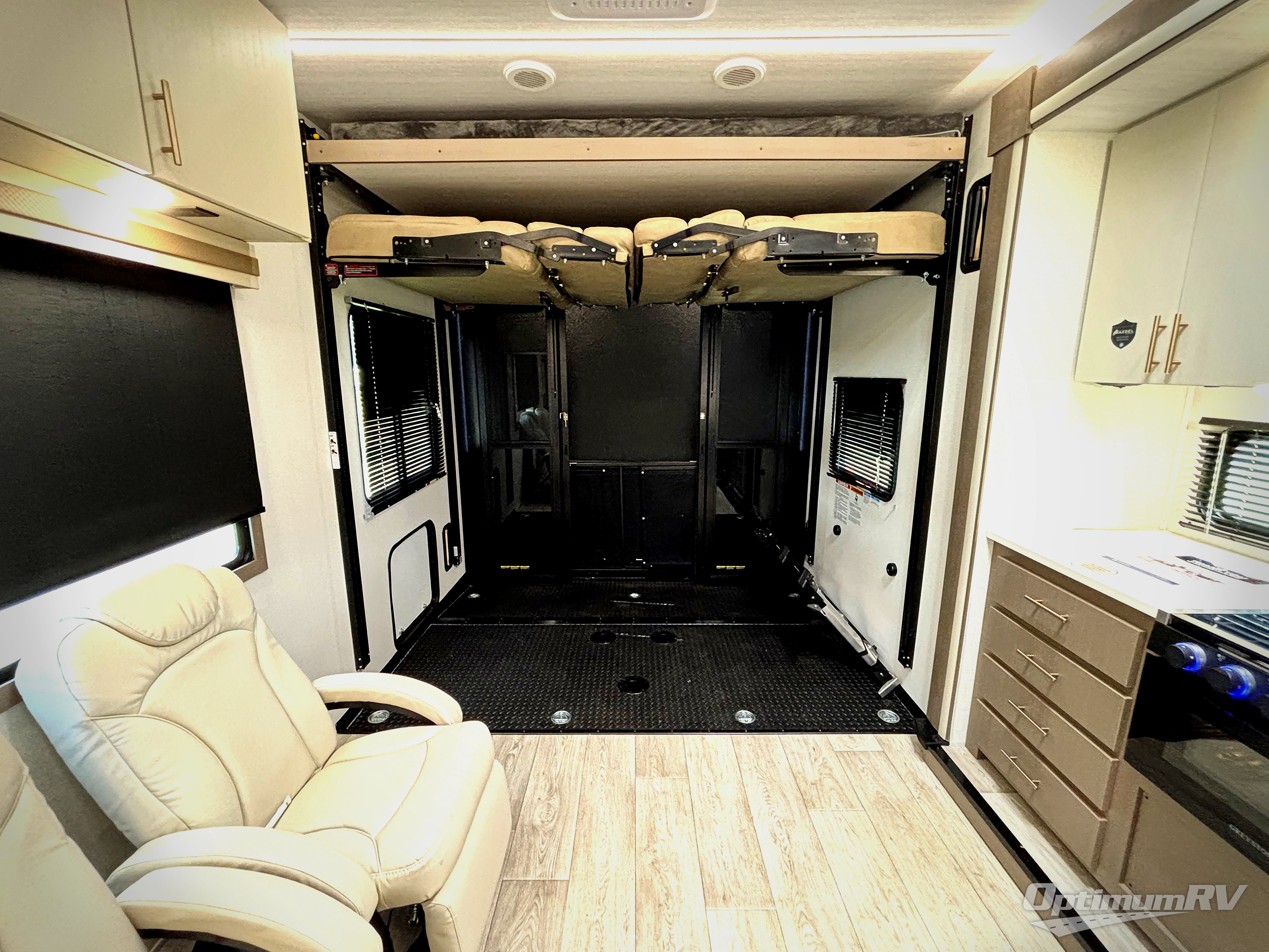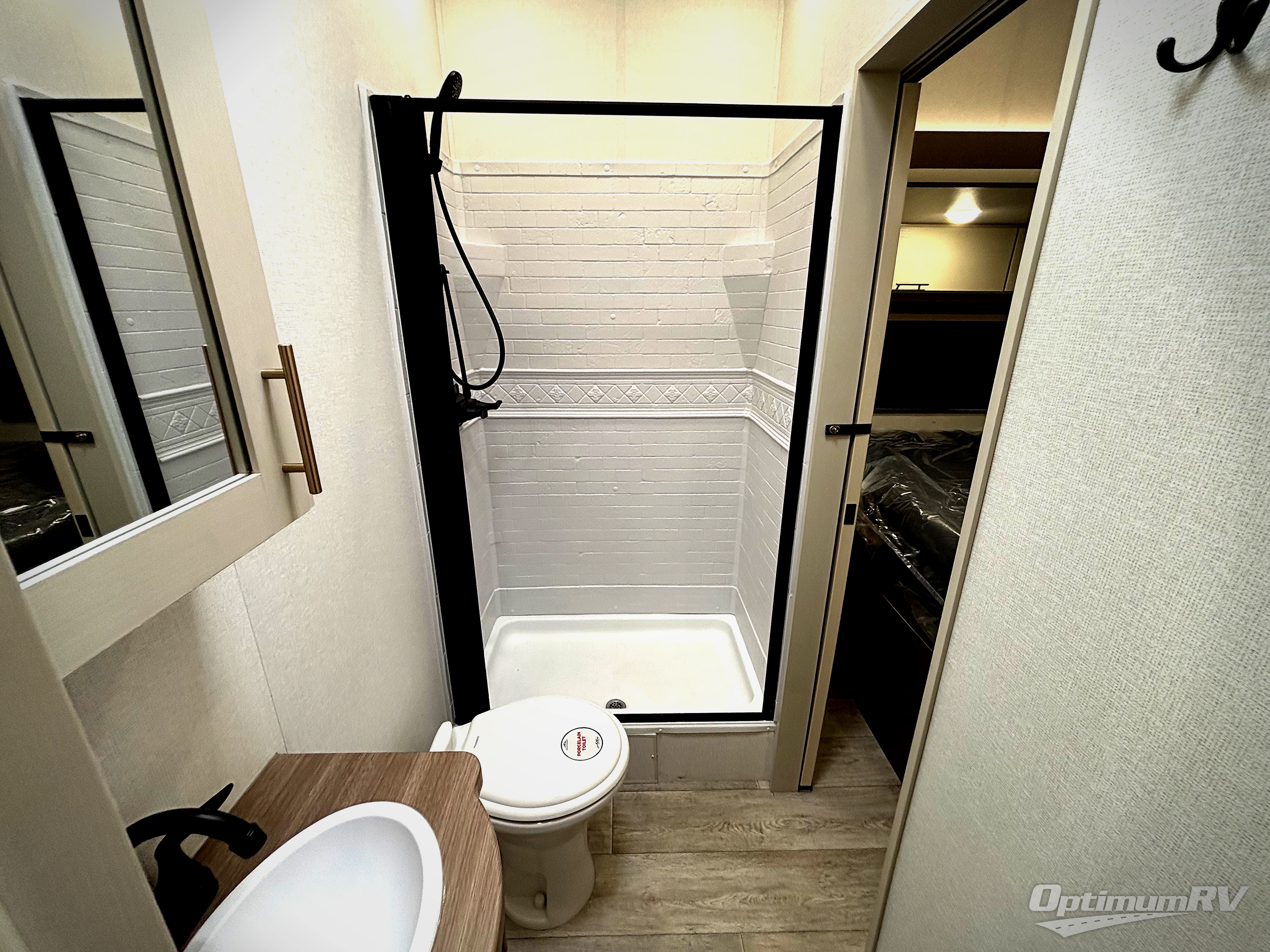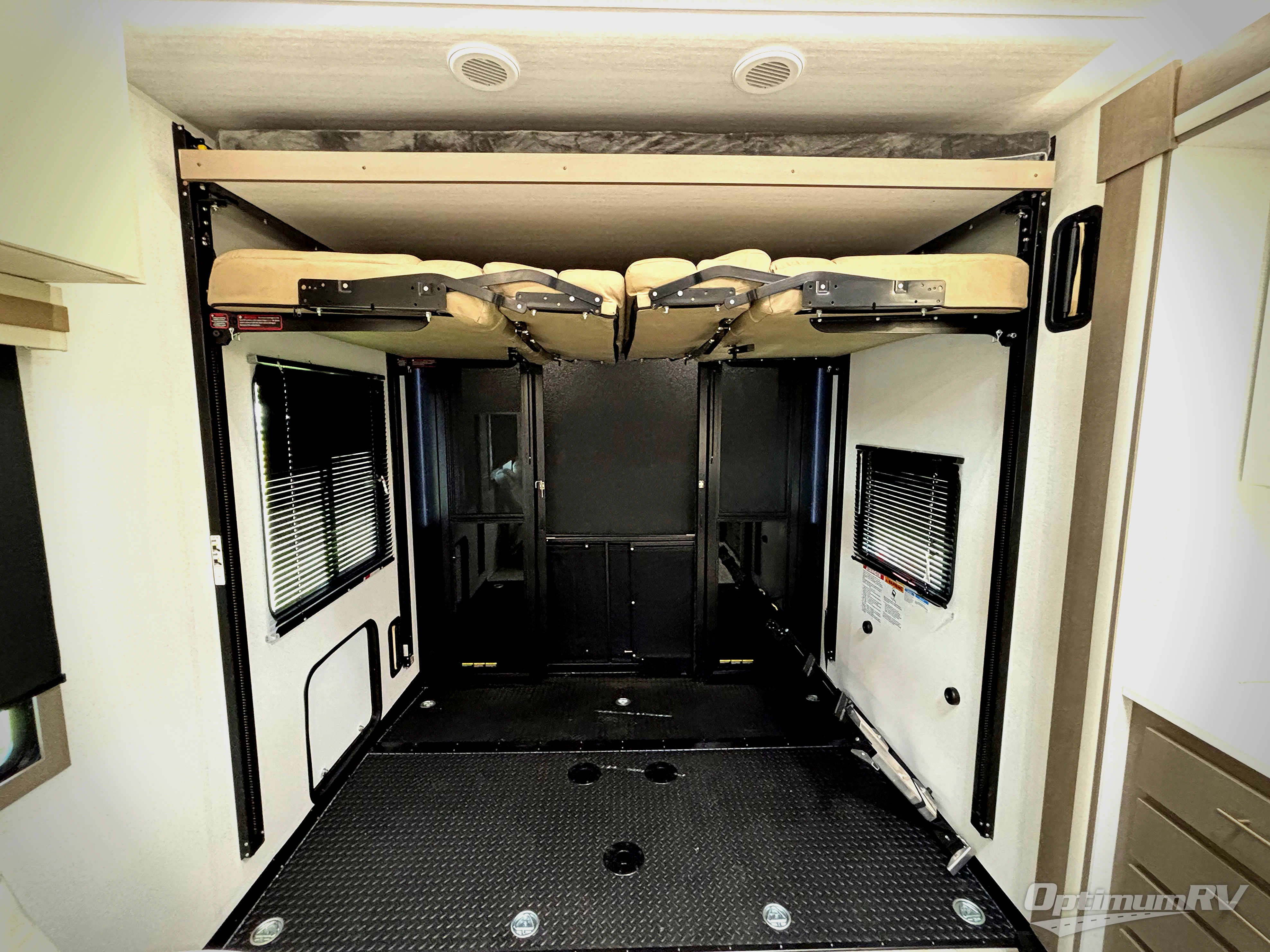 Take your favorite toys and favorite people to your favorite camping spots in this toy hauler! It offers a 14' garage so there is plenty of room for all your toys with a 97" x 92" ramp door with patio kit for easy loading and unloading. A Happi-jack with bunk above opposing sofas with a table in between means you will get lots of flexible use out of the space. The kitchen comes with a 10.7 cu. ft. 12V black glass refrigerator and three-burner range, and you can relax in one of the two recliners after dinner. At night retire to the front bedroom with its king bed slide, wardrobe, dresser, and dual entry bath with shower and skylight. This model also comes with the mandatory West Coach Power Package with a 400 watt solar panel, a 30 Amp controller and a second battery to keep you going!
