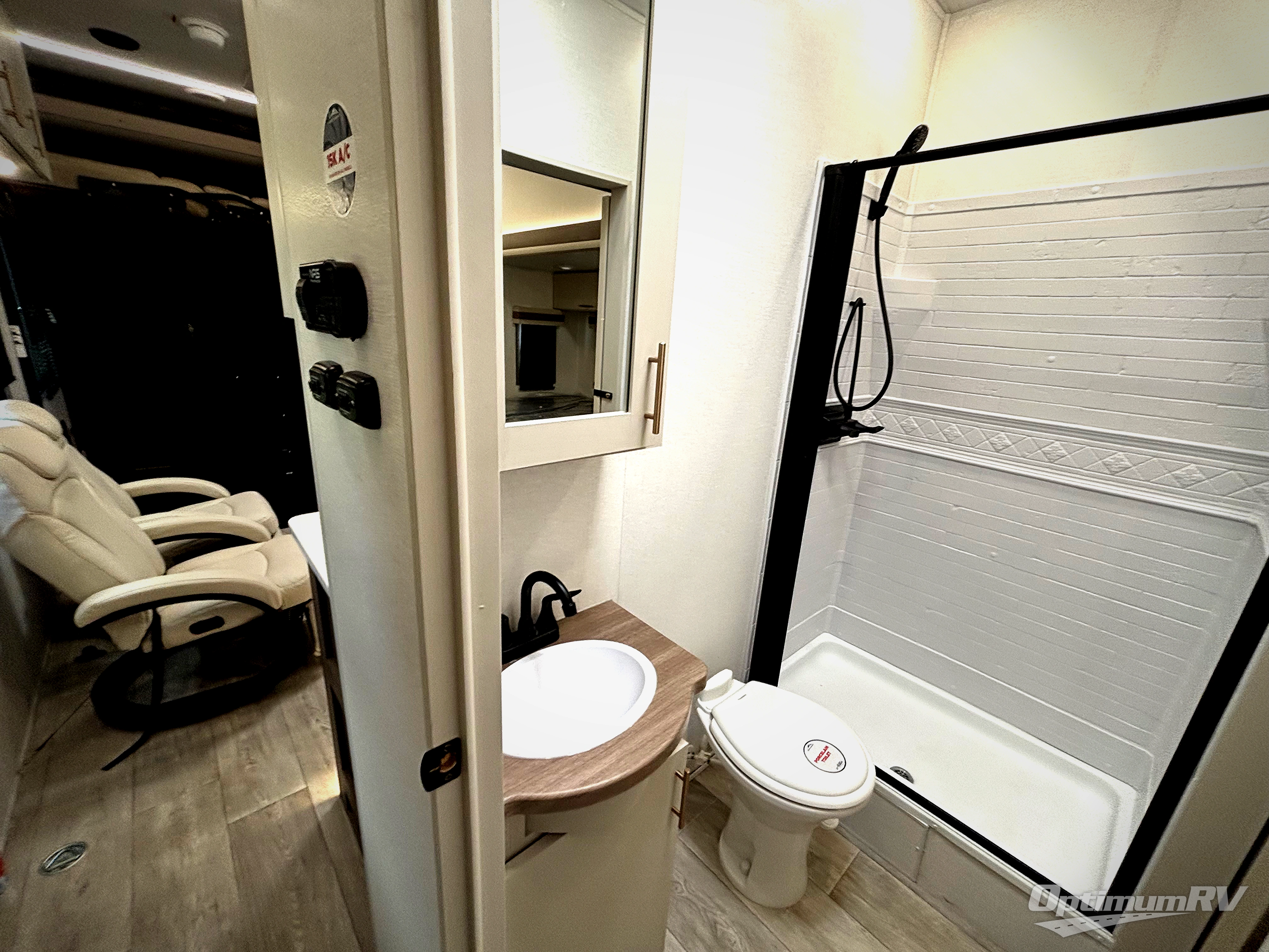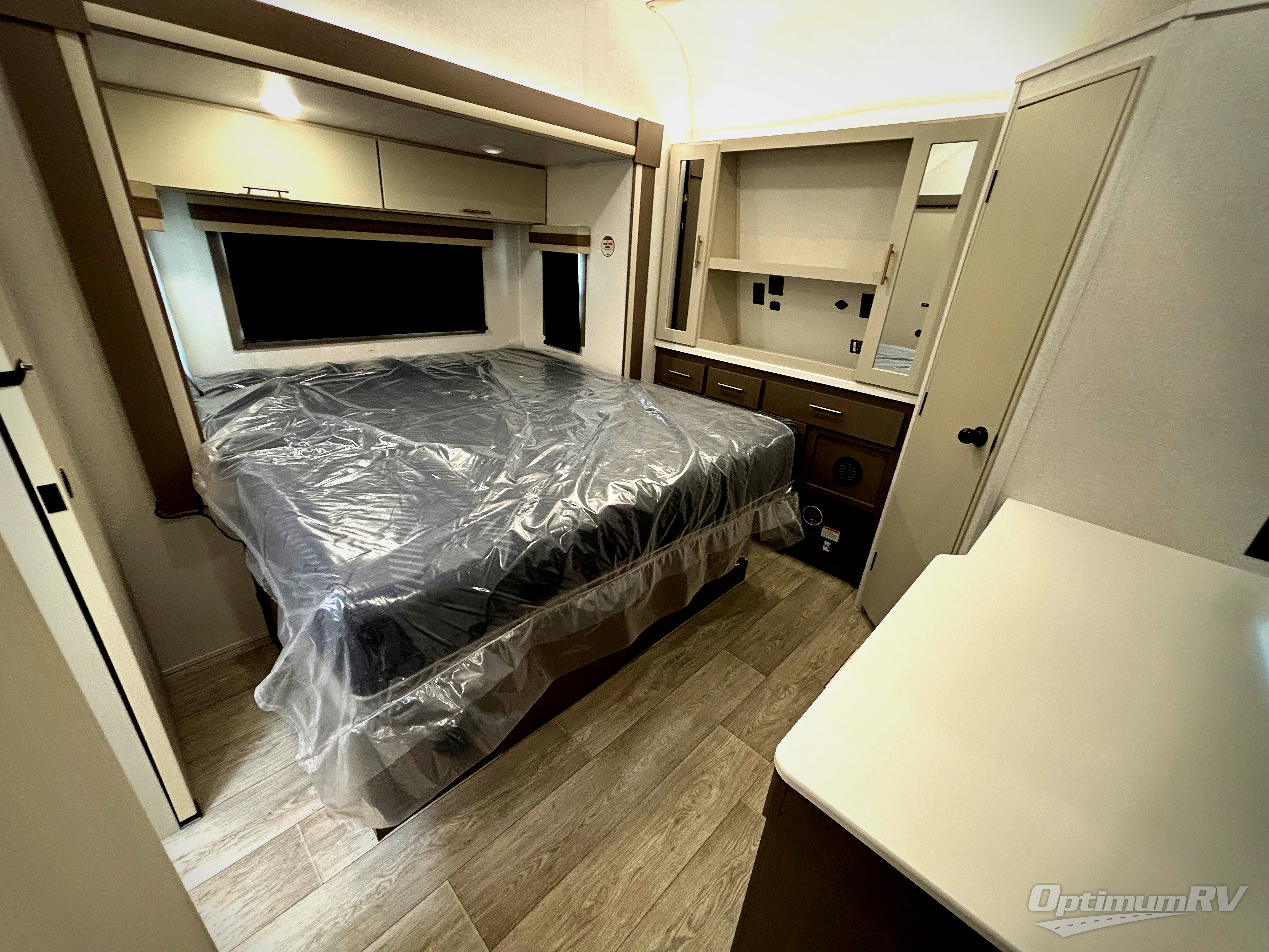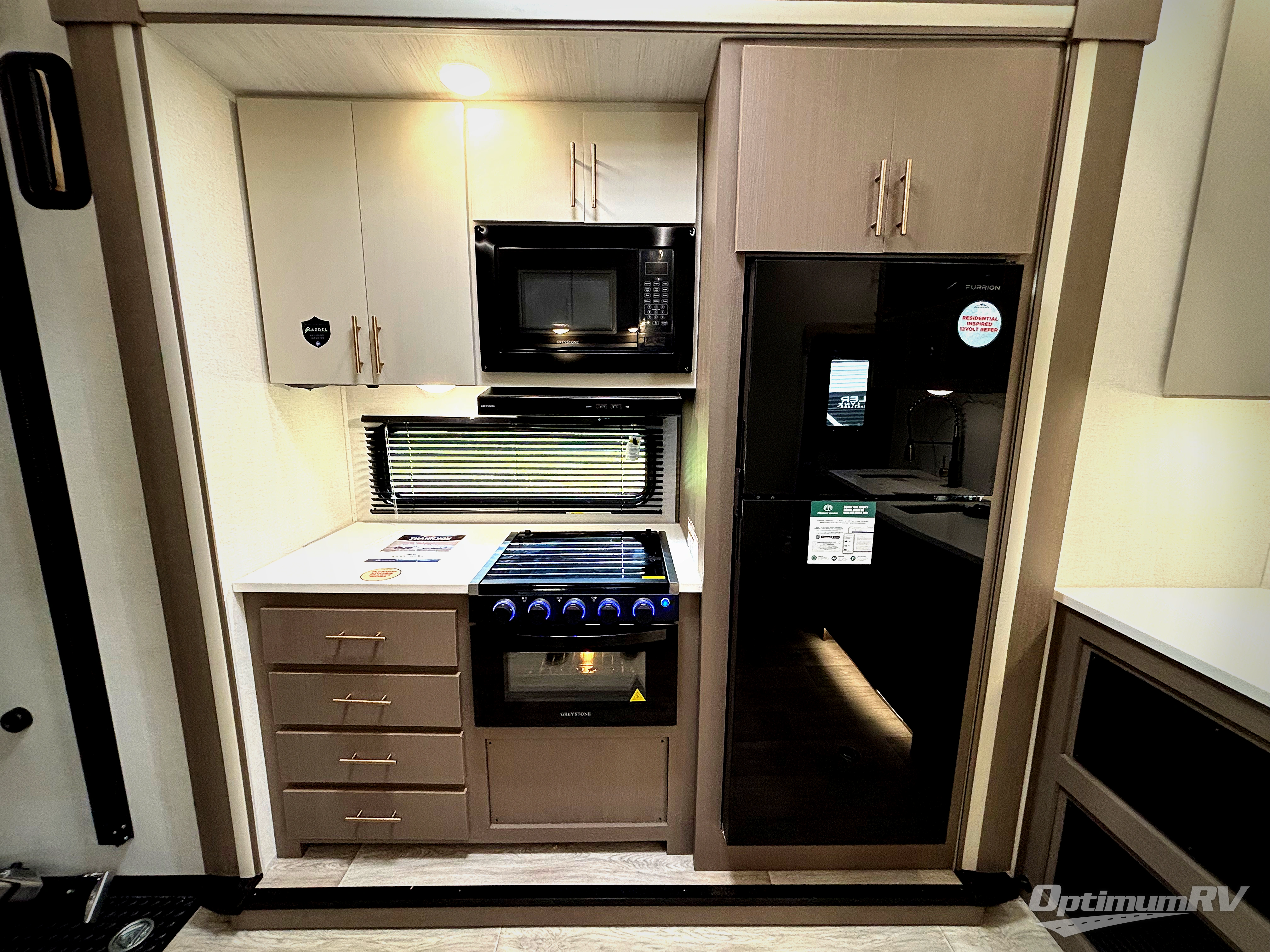 Take your favorite toys and favorite people to your favorite camping spots in this toy hauler! It offers a 14' garage so there is plenty of room for all your toys with a 97" x 92" ramp door with patio kit for easy loading and unloading. A Happi-jack with bunk above opposing sofas with a table in between means you will get lots of flexible use out of the space. The kitchen comes with a 10.7 cu. ft. 12V black glass refrigerator and three-burner range, and you can relax in one of the two recliners after dinner. At night retire to the front bedroom with its king bed slide, wardrobe, dresser, and dual entry bath with shower and skylight. This model also comes with the mandatory West Coach Power Package with a 400 watt solar panel, a 30 Amp controller and a second battery to keep you going!