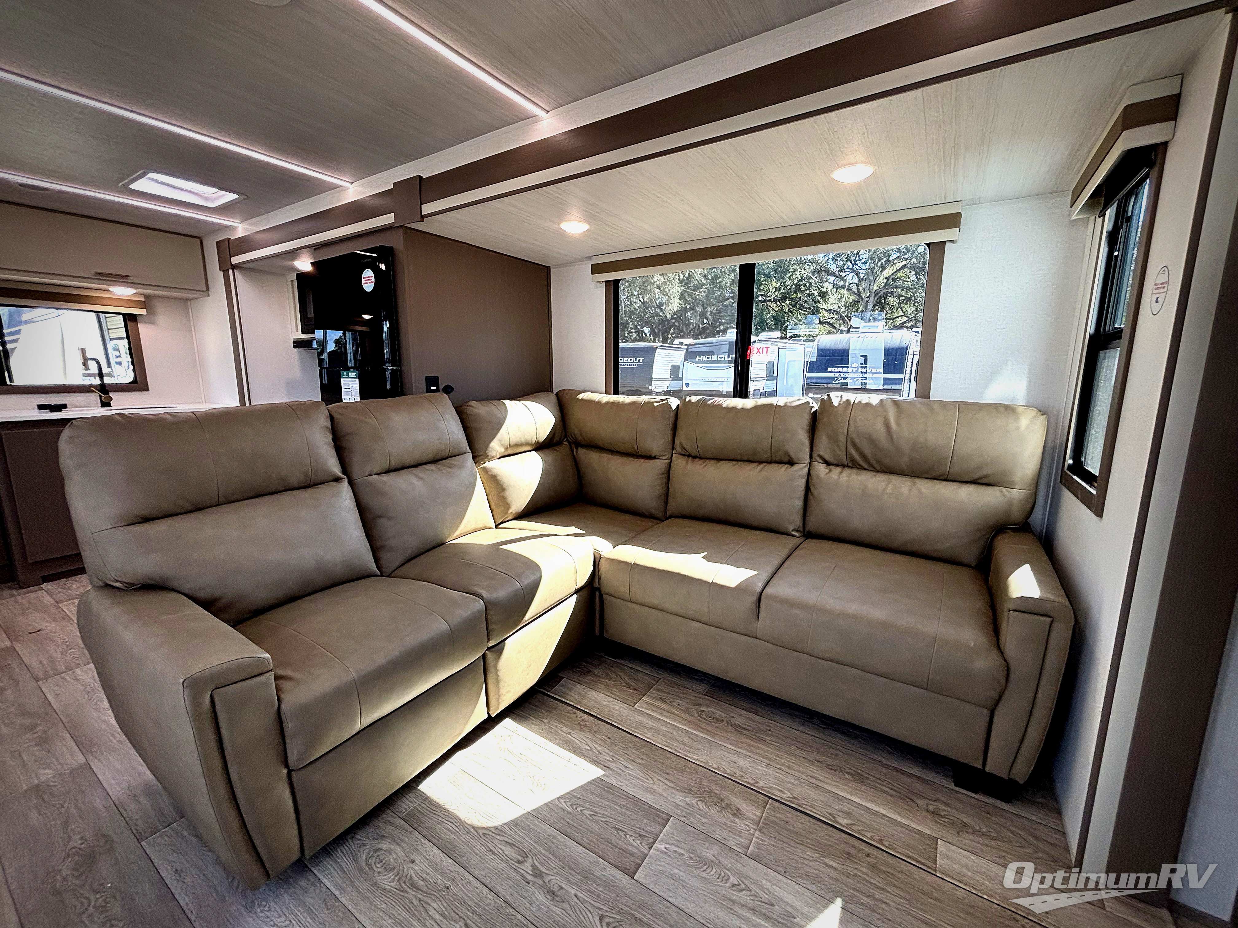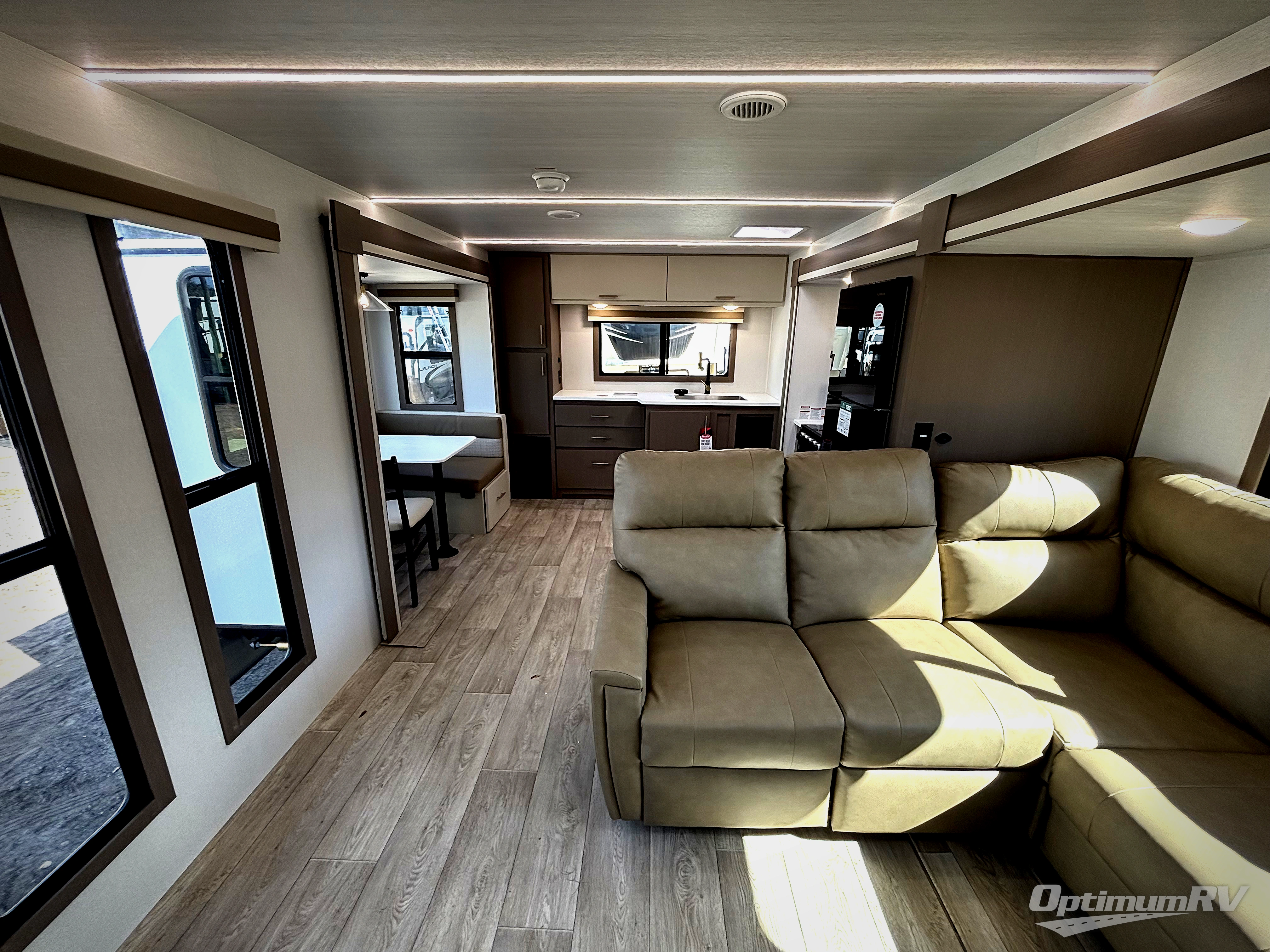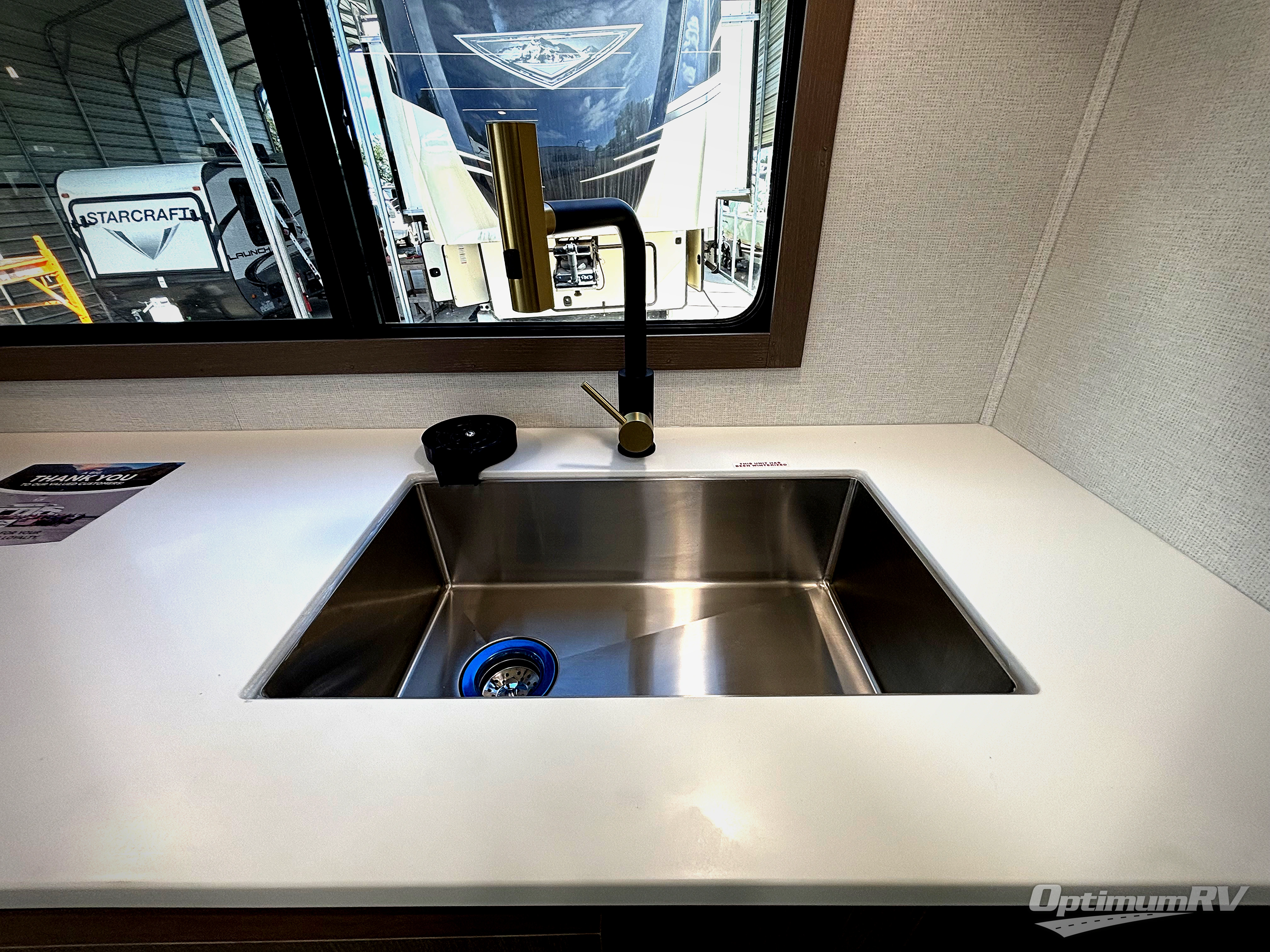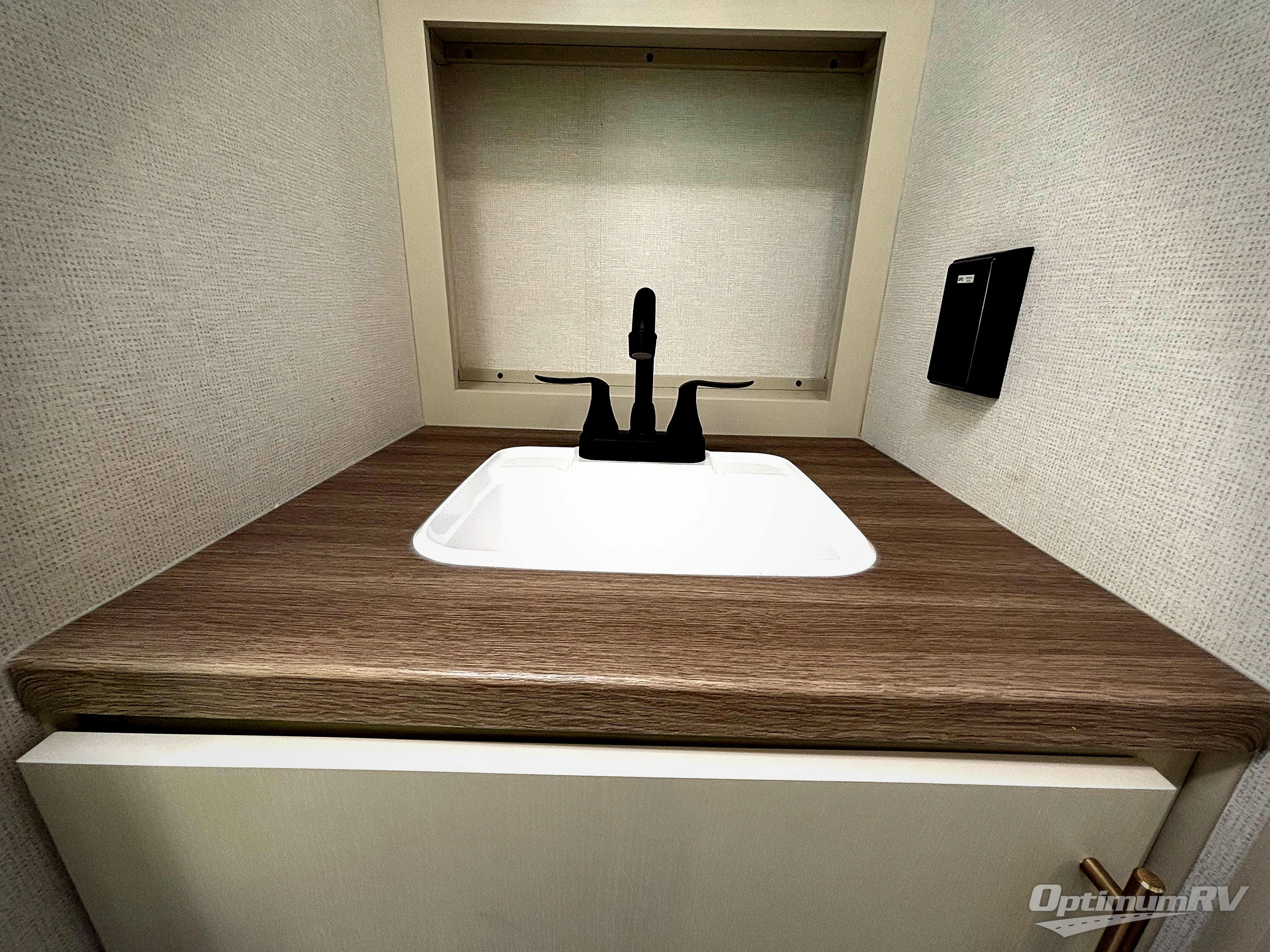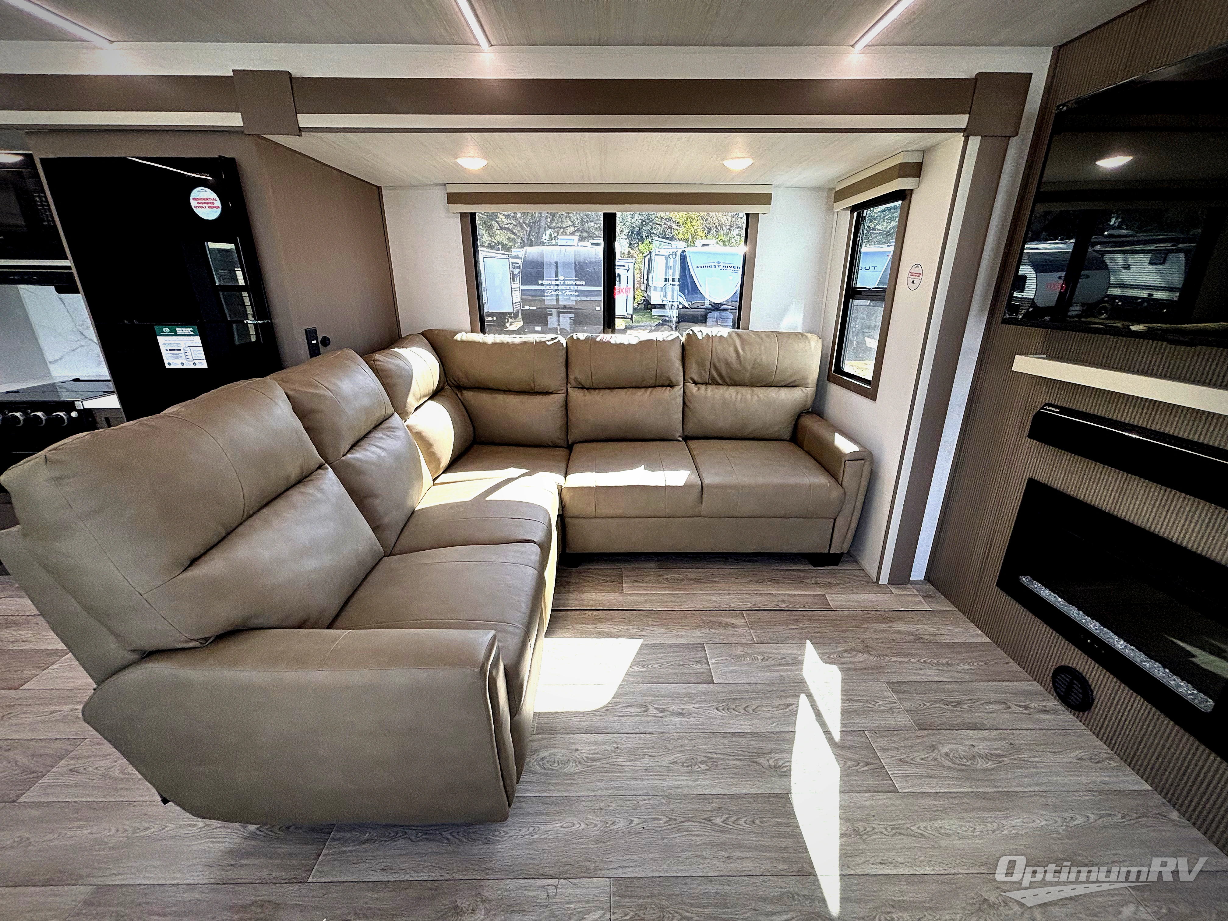 Experience a luxurious ride in this travel trailer. The rear kitchen is equipped with everything you need to whip up a culinary masterpiece. Enjoy ample storage in the pantry, a 12V refrigerator for keeping your favorite drinks and snacks chilled, a three-burner cooktop for cooking up a storm, and a microwave for quick reheating. The sink provides a convenient spot for washing up, and the spacious countertops offer plenty of room for food preparation. Relax and unwind in the heart of the trailer, a comfortable living area features a tri-fold sofa and a sofa with recliners. Gather around the fireplace on chilly evenings, or enjoy your favorite shows on the TV. Further, the full bathroom is equipped with everything you need for a comfortable stay, and the front bedroom boasts a queen-sized bed, large wardrobe, dresser, and overhead cabinets. Finally, take your living space outdoors with the fold-down patio, perfect for alfresco dining or simply enjoying the fresh air.