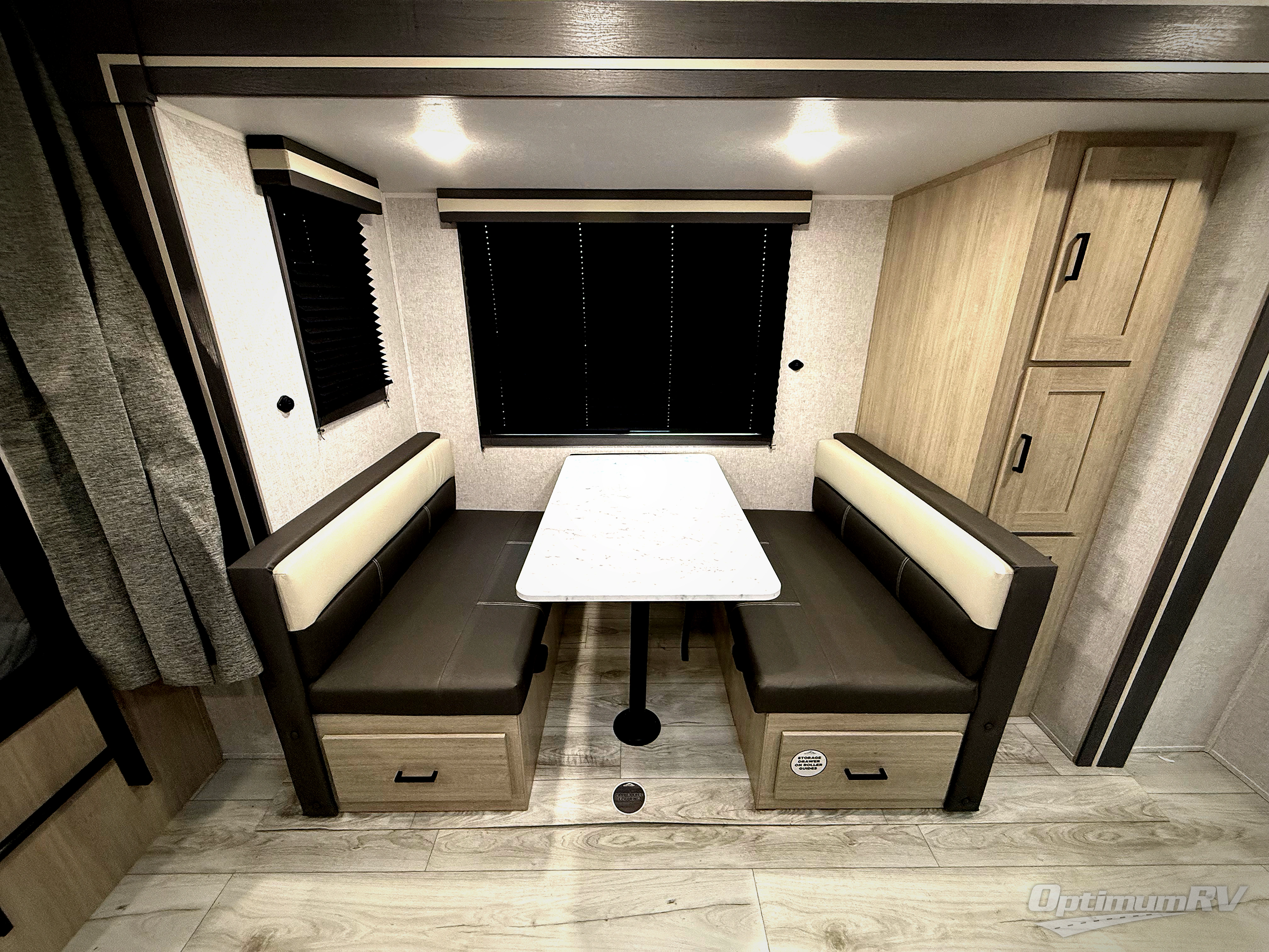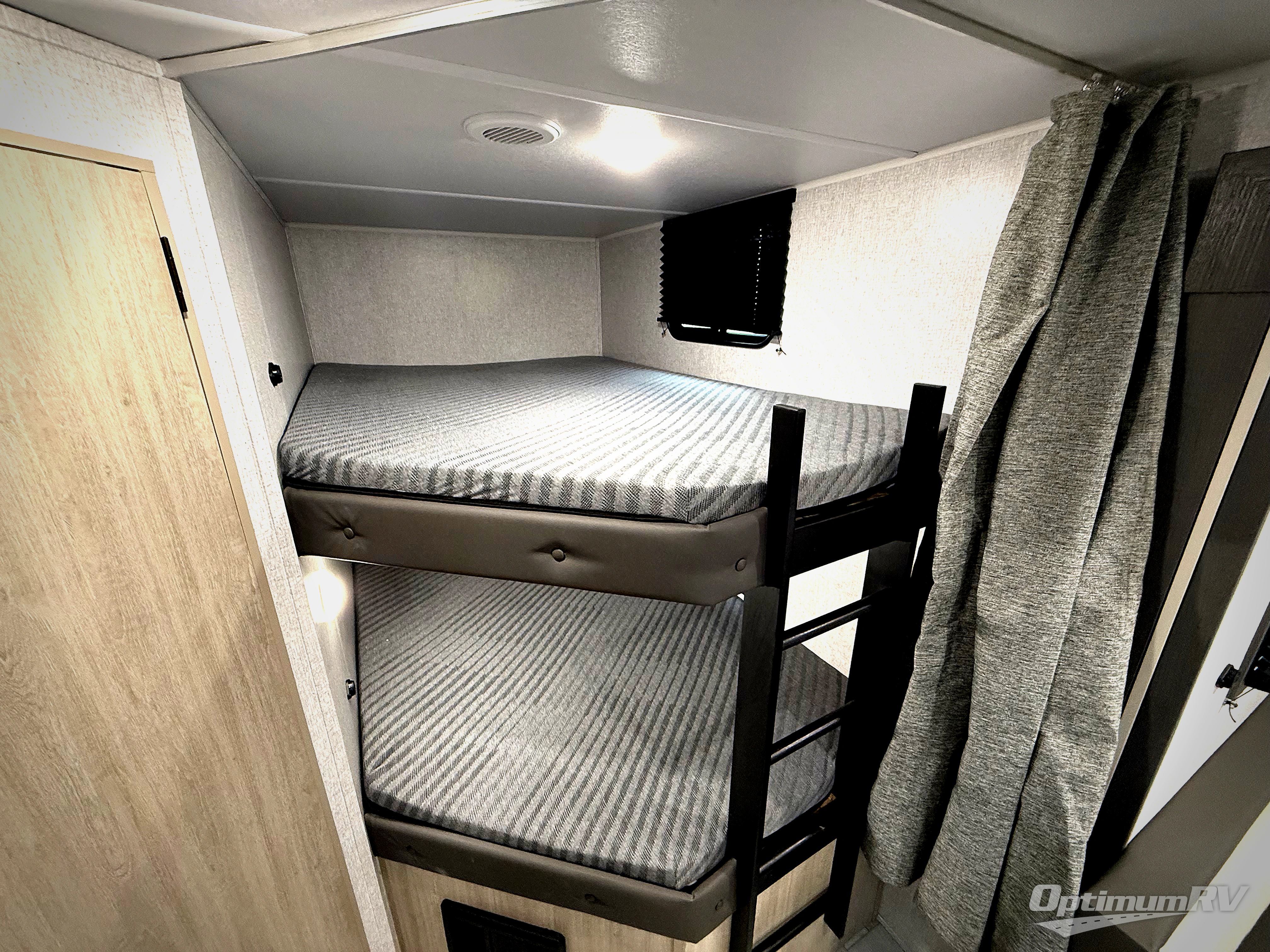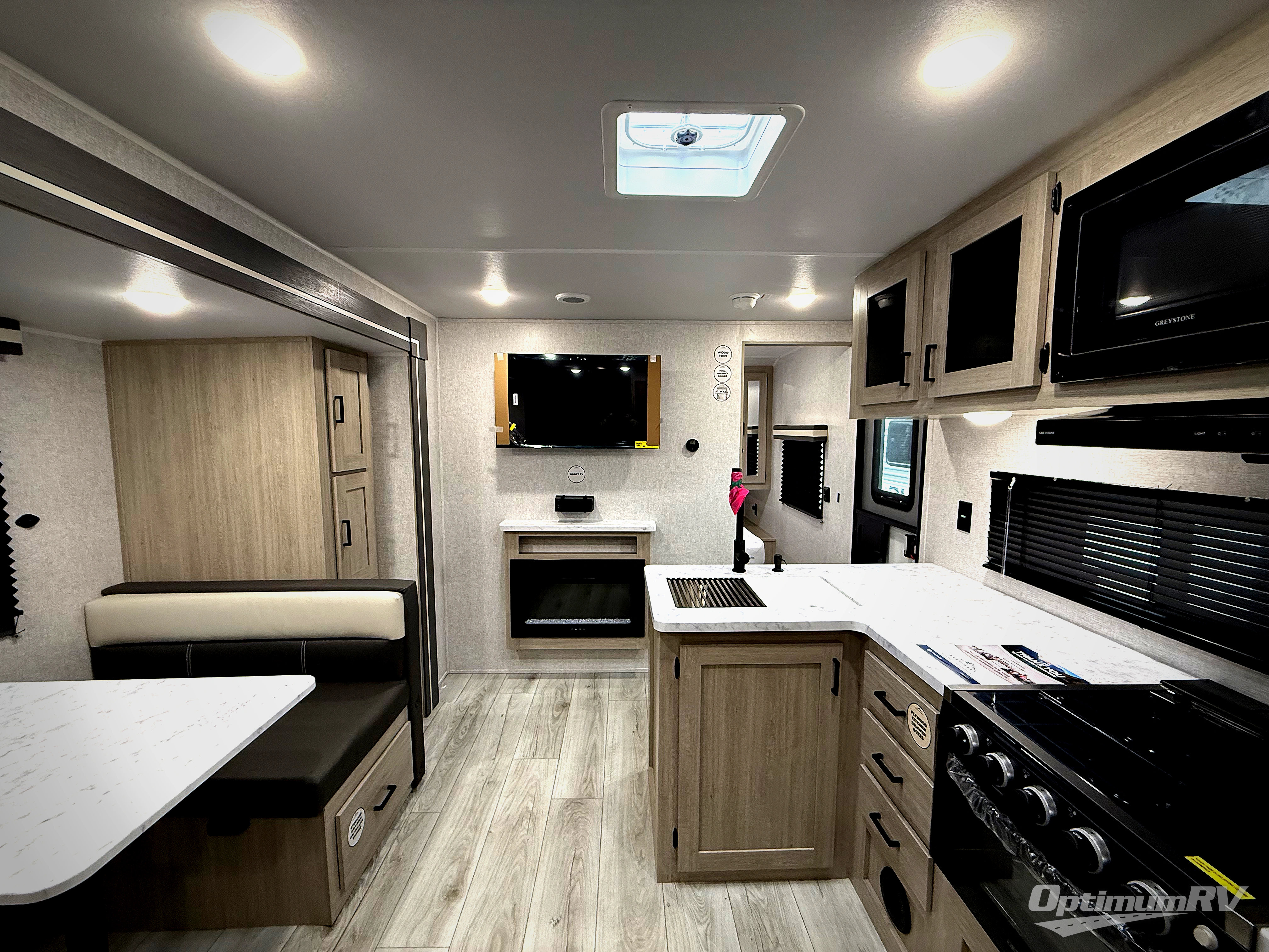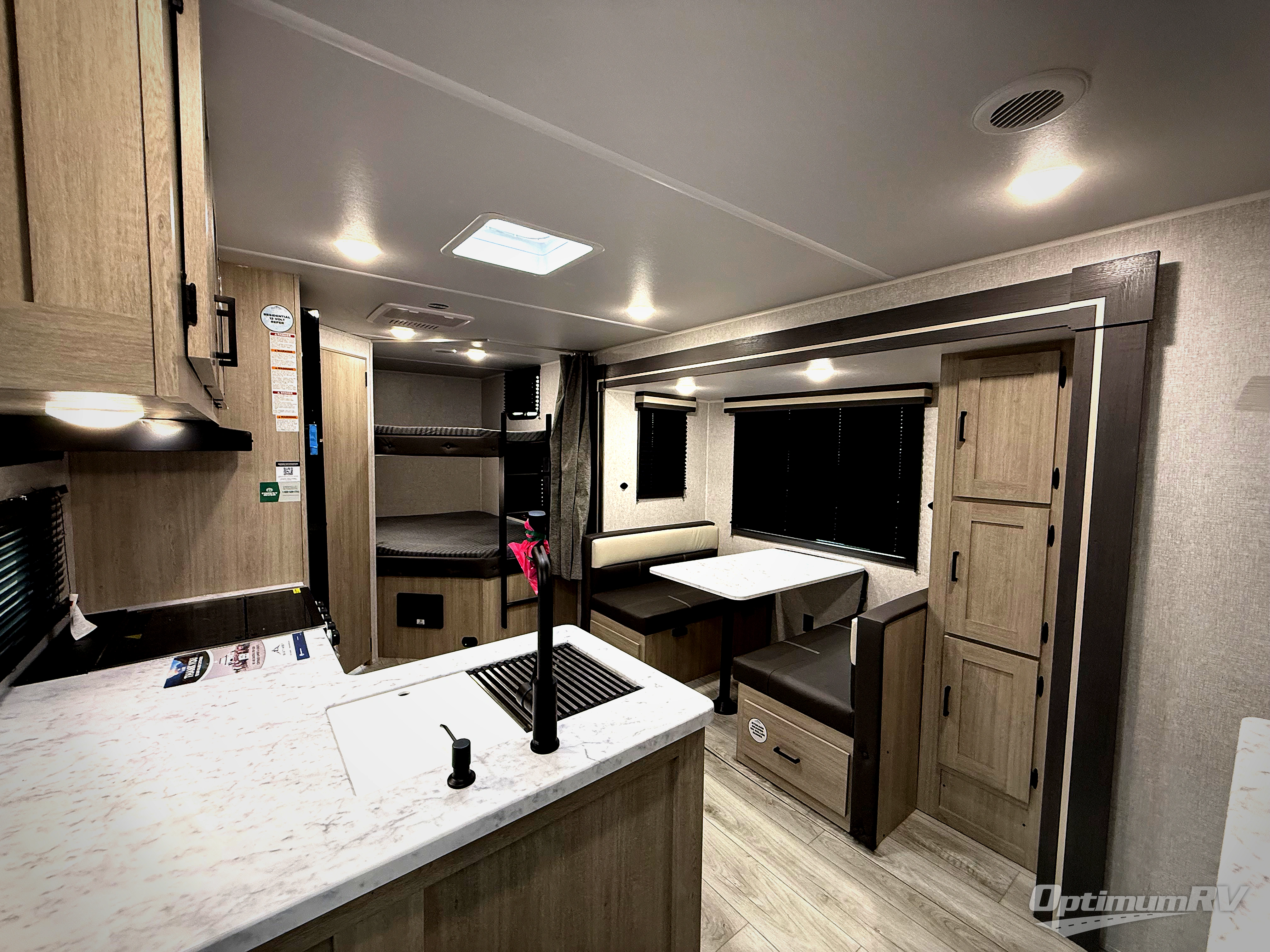 Head to the lake in this travel trailer with a large slide out for more space and comfort and additional sleeping space provided by the double-size bunks! Once you arrive, you can put out the 16' power awning, unload the pass-through storage, and make lunch on the outdoor kitchen with a pull-out griddle and refrigerator. The booth dinette inside can be used as dining space, and there is storage underneath here for added convenience. You will also find a full interior kitchen, and the full bath includes one of the dual entry doors for added convenience. When you're ready for some shut-eye, the king bed in the front private bedroom will feel just like home. There are also dual wardrobes and nightstands to keep your things tidy!