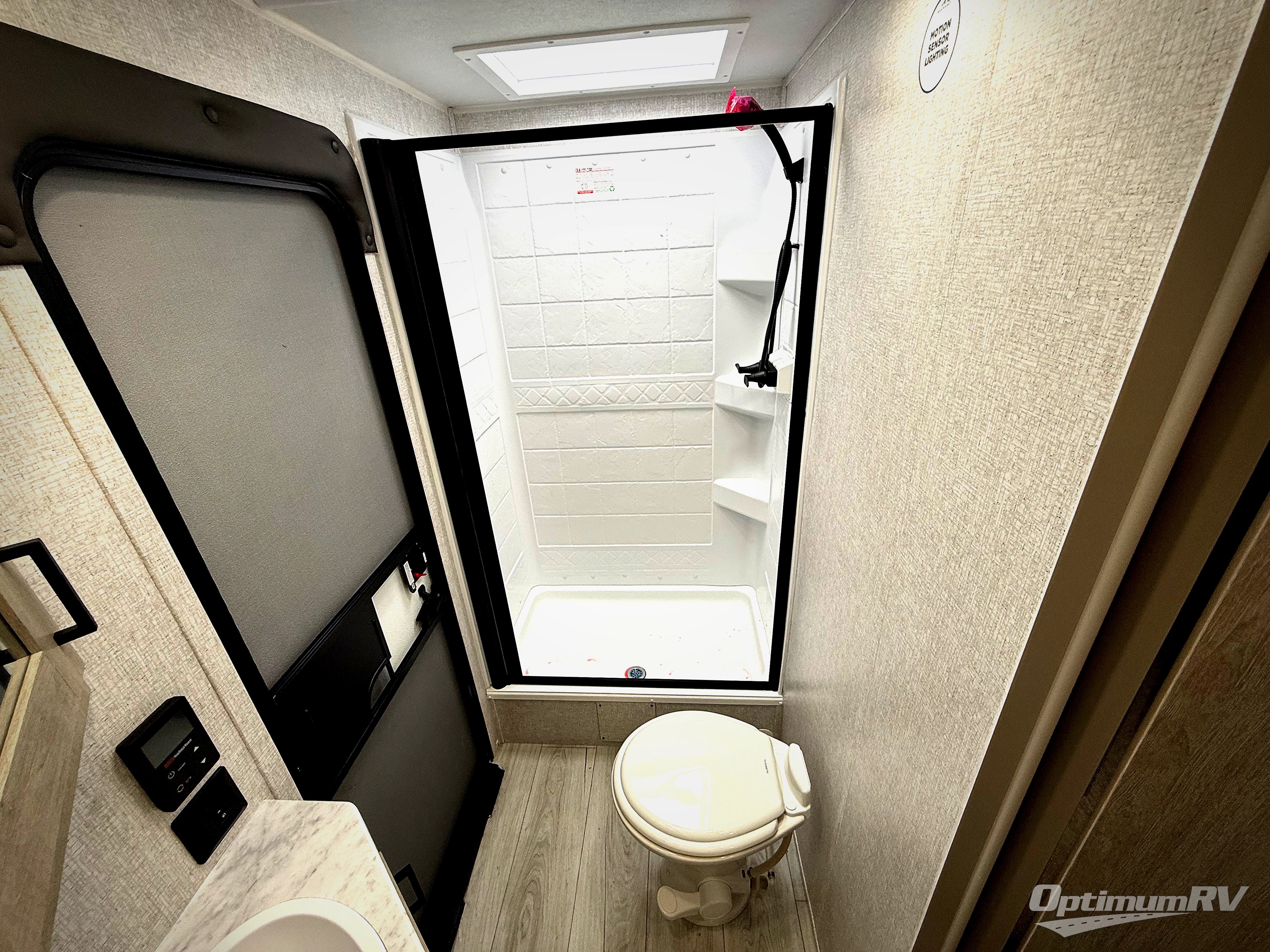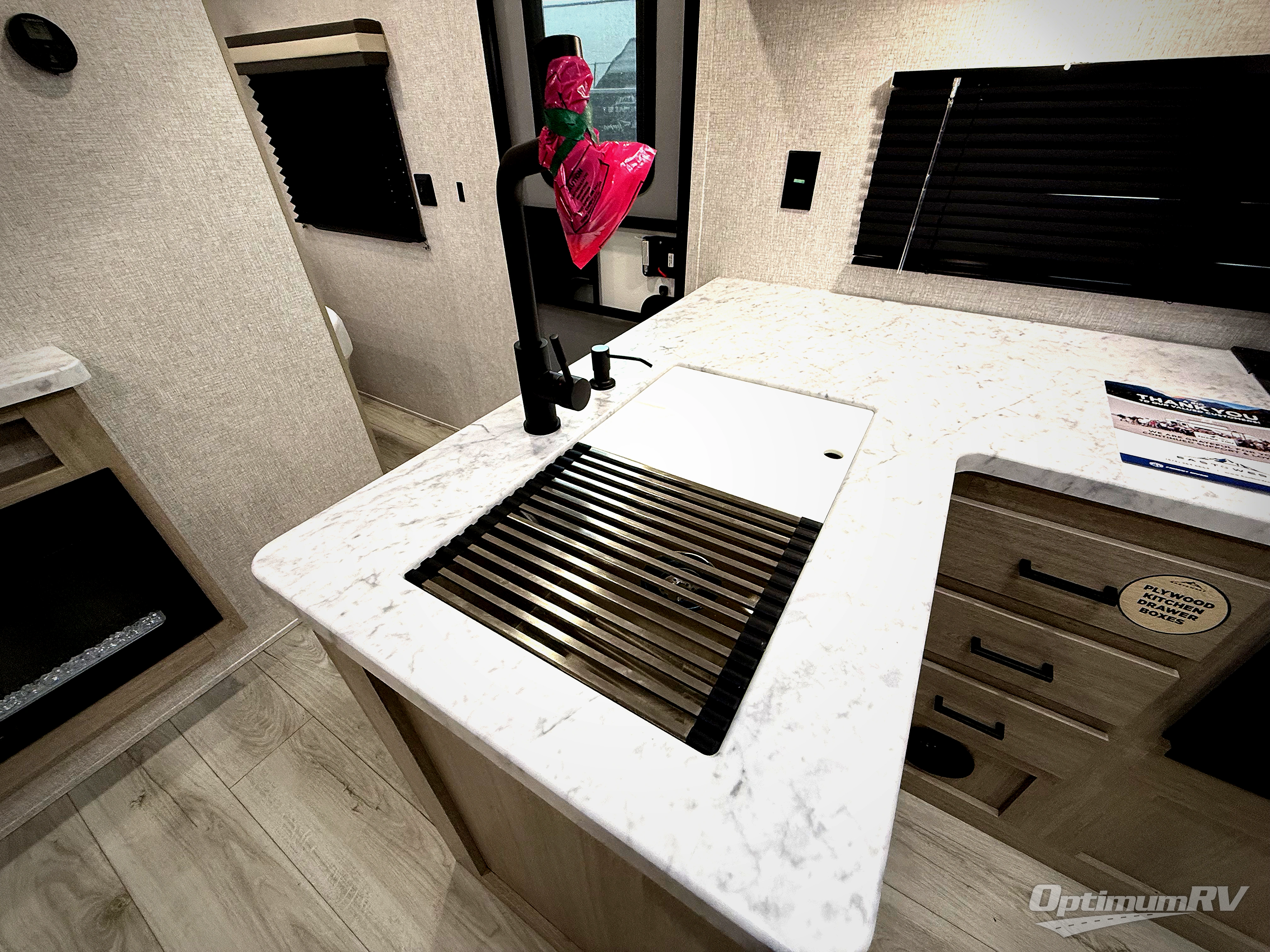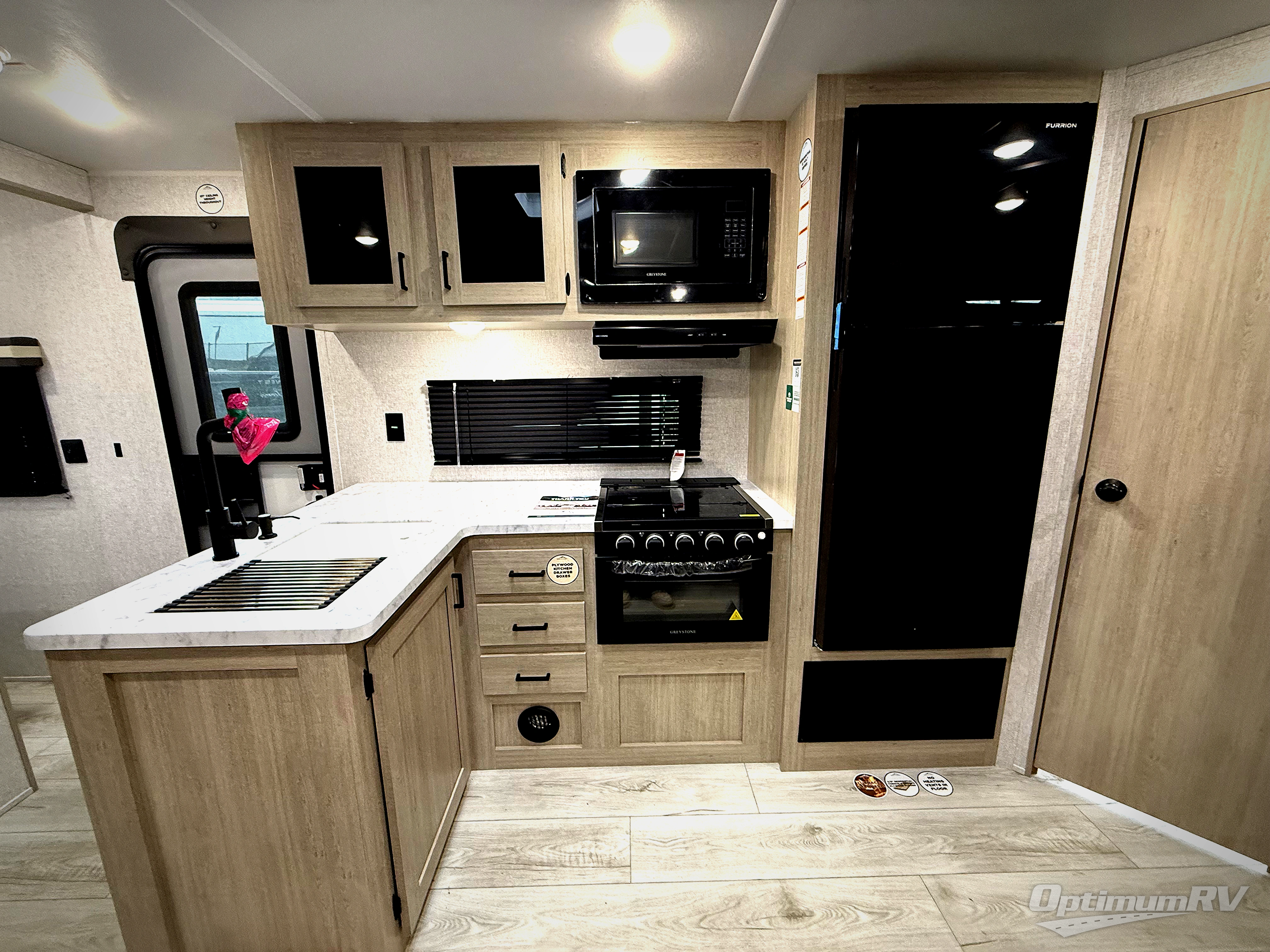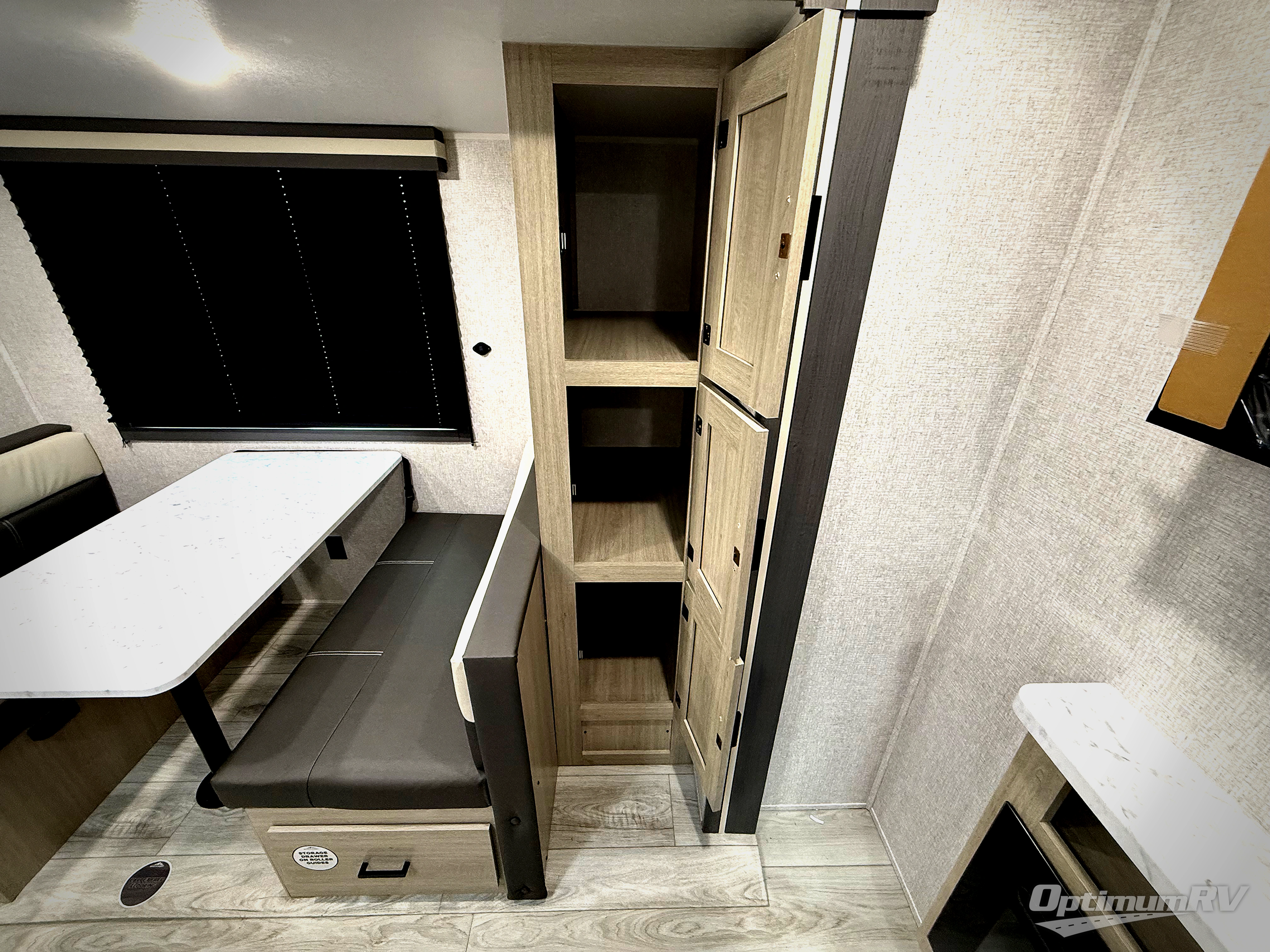 Head to the lake in this travel trailer with a large slide out for more space and comfort and additional sleeping space provided by the double-size bunks! Once you arrive, you can put out the 16' power awning, unload the pass-through storage, and make lunch on the outdoor kitchen with a pull-out griddle and refrigerator. The booth dinette inside can be used as dining space, and there is storage underneath here for added convenience. You will also find a full interior kitchen, and the full bath includes one of the dual entry doors for added convenience. When you're ready for some shut-eye, the king bed in the front private bedroom will feel just like home. There are also dual wardrobes and nightstands to keep your things tidy!