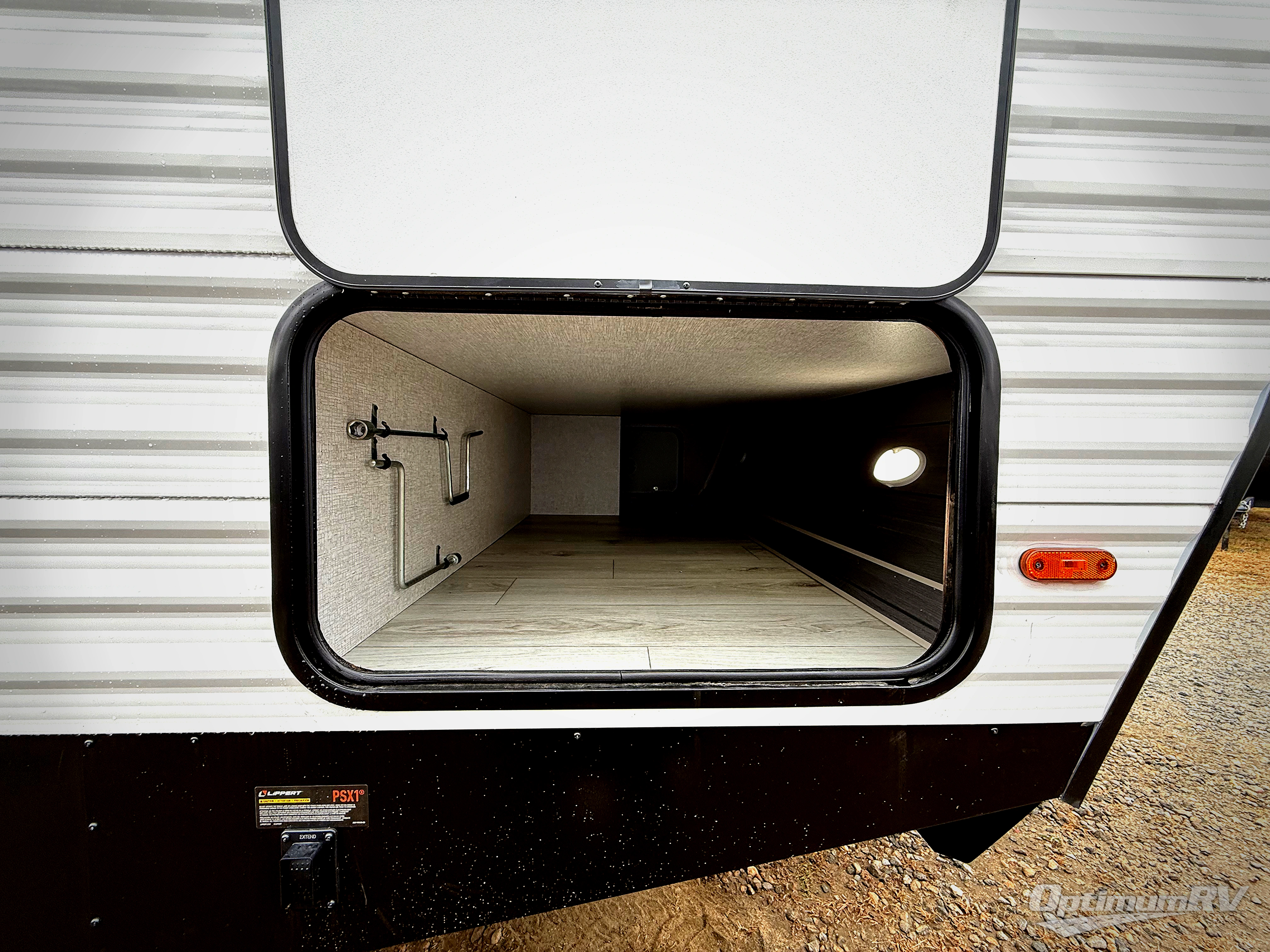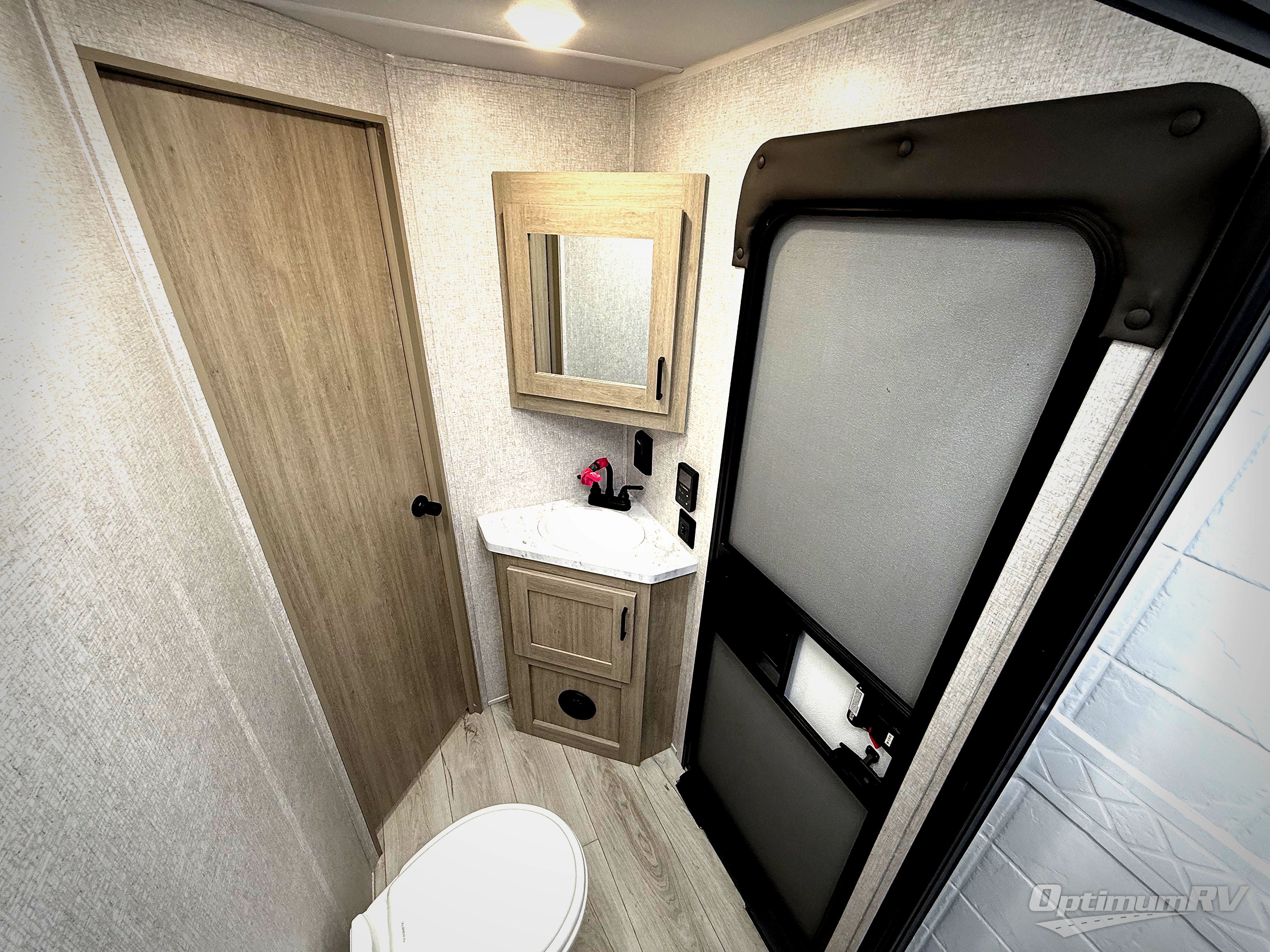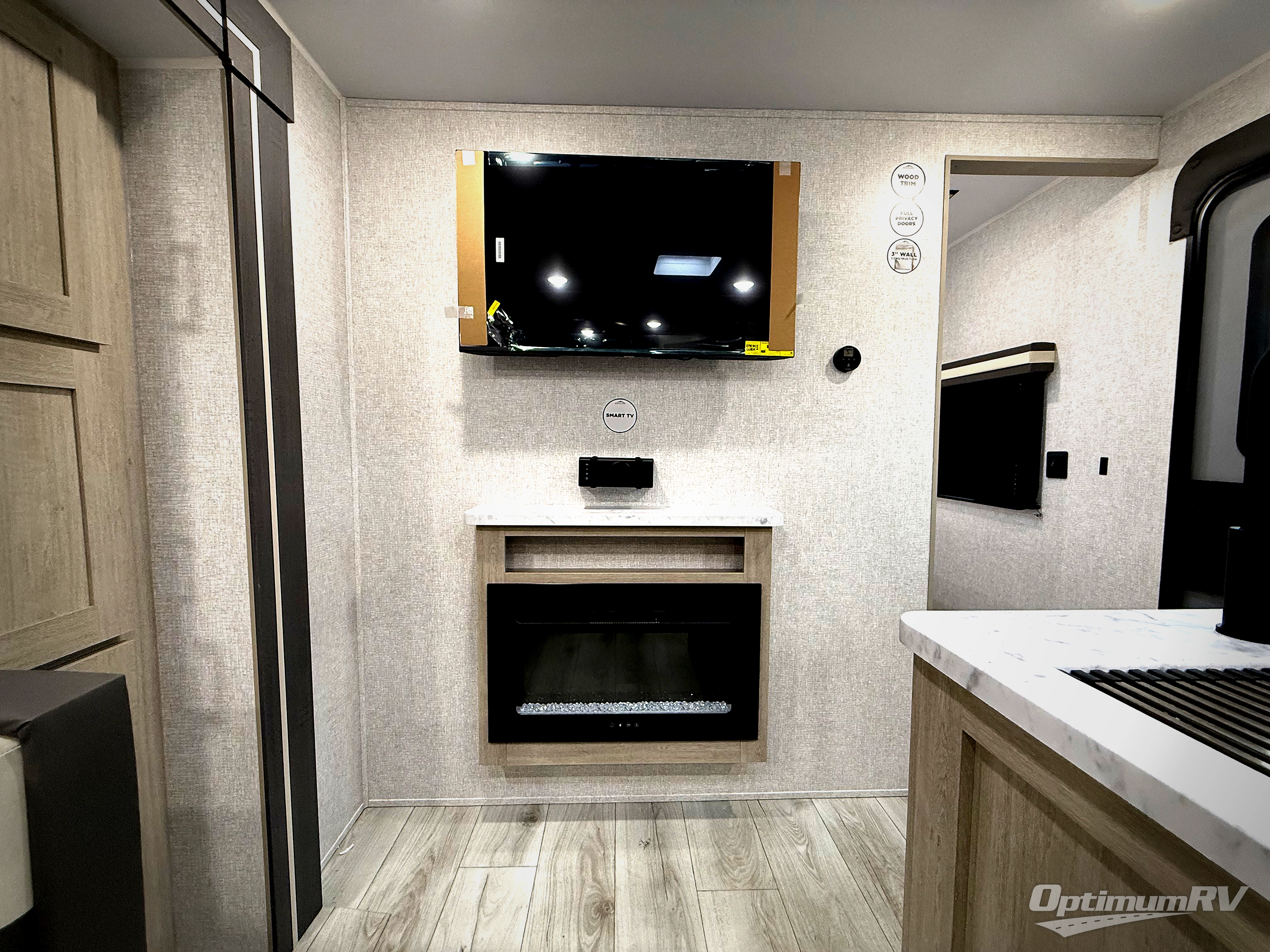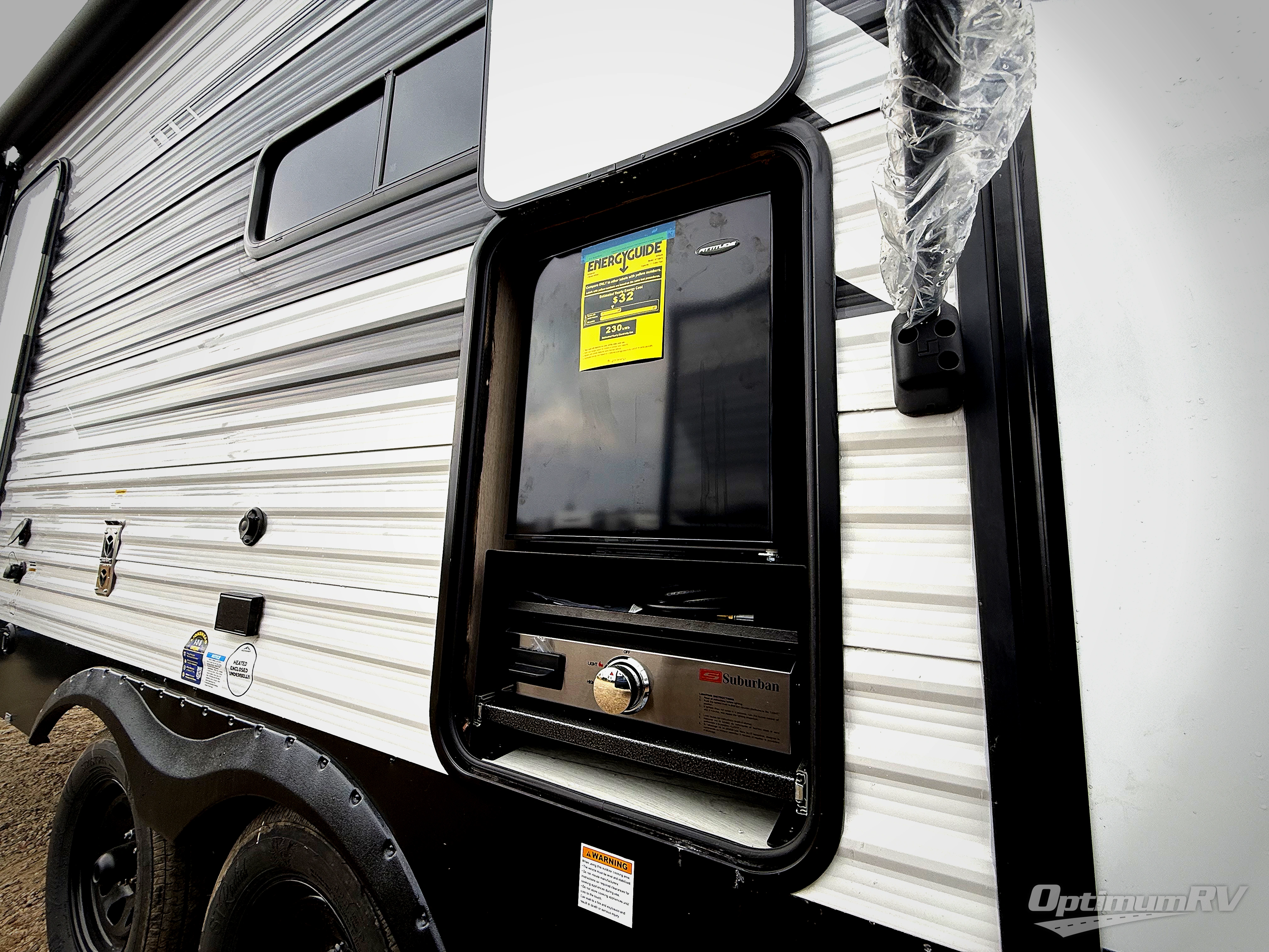 Head to the lake in this travel trailer with a large slide out for more space and comfort and additional sleeping space provided by the double-size bunks! Once you arrive, you can put out the 16' power awning, unload the pass-through storage, and make lunch on the outdoor kitchen with a pull-out griddle and refrigerator. The booth dinette inside can be used as dining space, and there is storage underneath here for added convenience. You will also find a full interior kitchen, and the full bath includes one of the dual entry doors for added convenience. When you're ready for some shut-eye, the king bed in the front private bedroom will feel just like home. There are also dual wardrobes and nightstands to keep your things tidy!