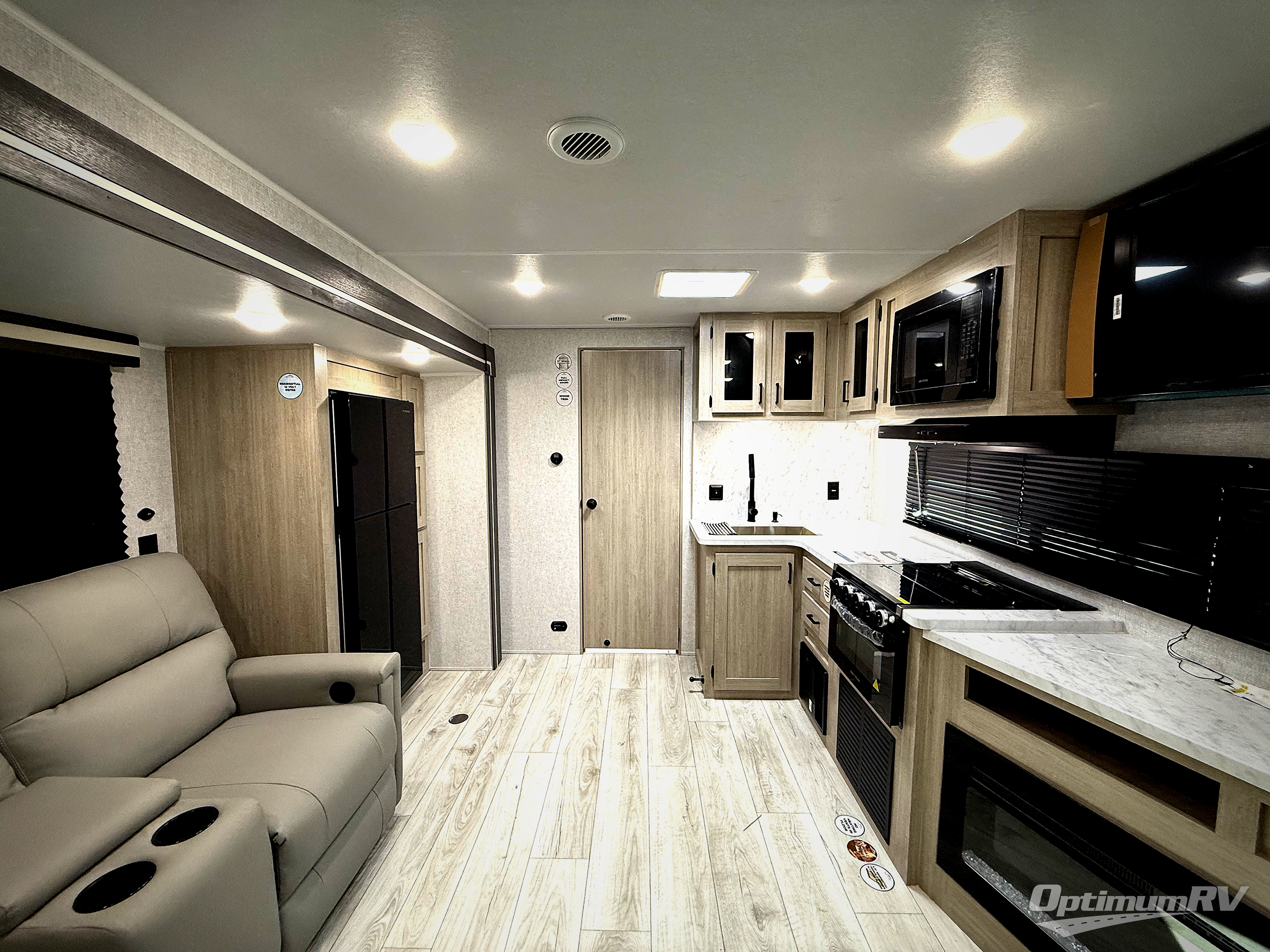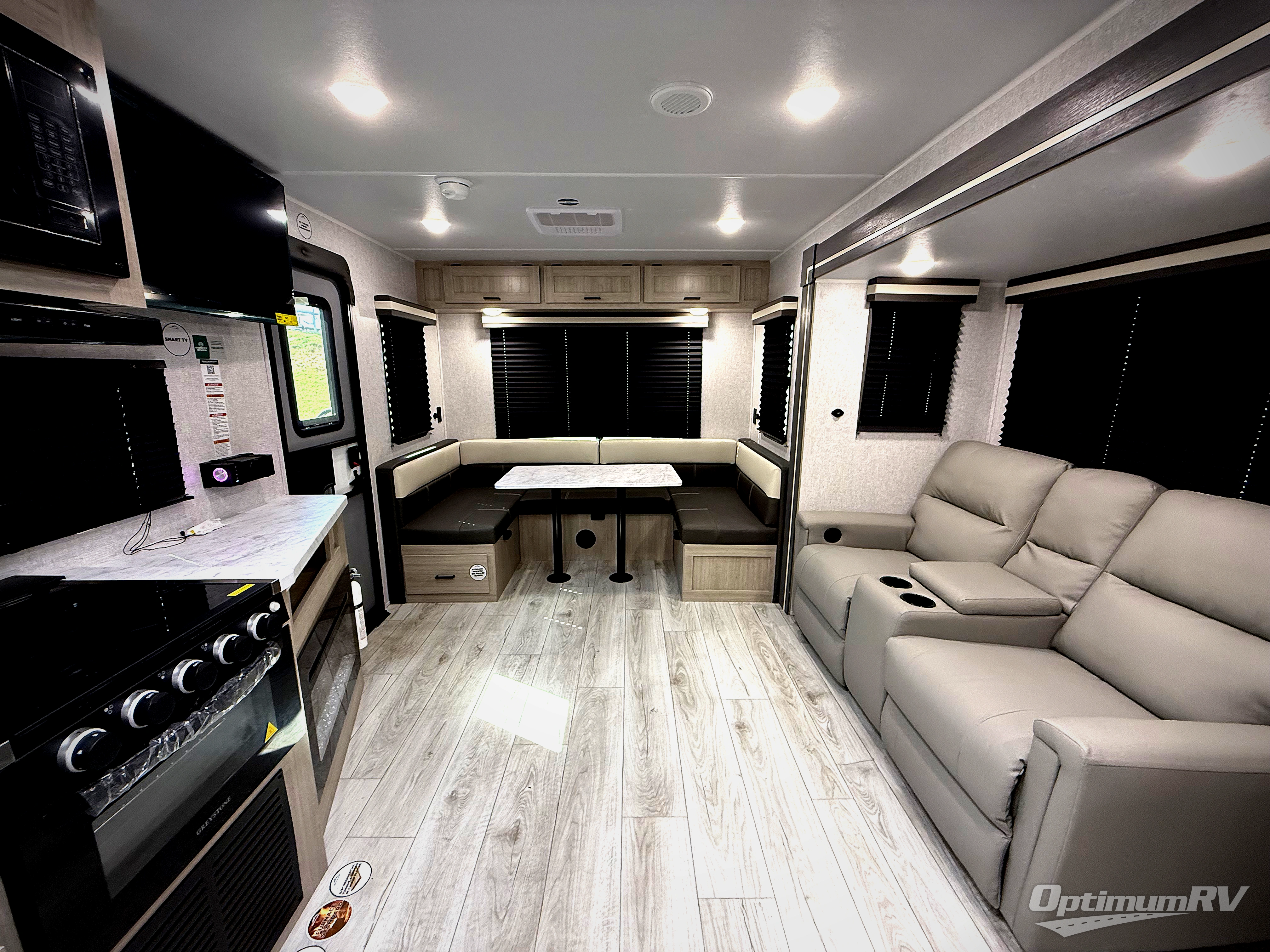 When you are wanting a little more interior space in your next travel trailer, take a look inside! This large slide out widens the main living space so you can easily make meals using full amenities without having to move for someone walking from the front bedroom and walk-through bath to the U-shaped dinette in the back. For sleeping, there is a king-size bed with storage on both sides at the very front of this unit giving you privacy from the rest, and even a private second entry/exit door from within the bedroom. You will find storage beneath the bed for larger items or extra blankets, plus a space saving sliding door. The U-shaped dinette and jackknife sofa offer comfortable seating as well as extra sleeping space for overnight guests, and the fireplace is just a nice feature to enjoy. On the outside, an 18' awning provides a large outdoor living area protected from the elements, and the oversized pass-through will house all of your exterior gear like lawn chairs, outdoor games and rugs, plus so much more!