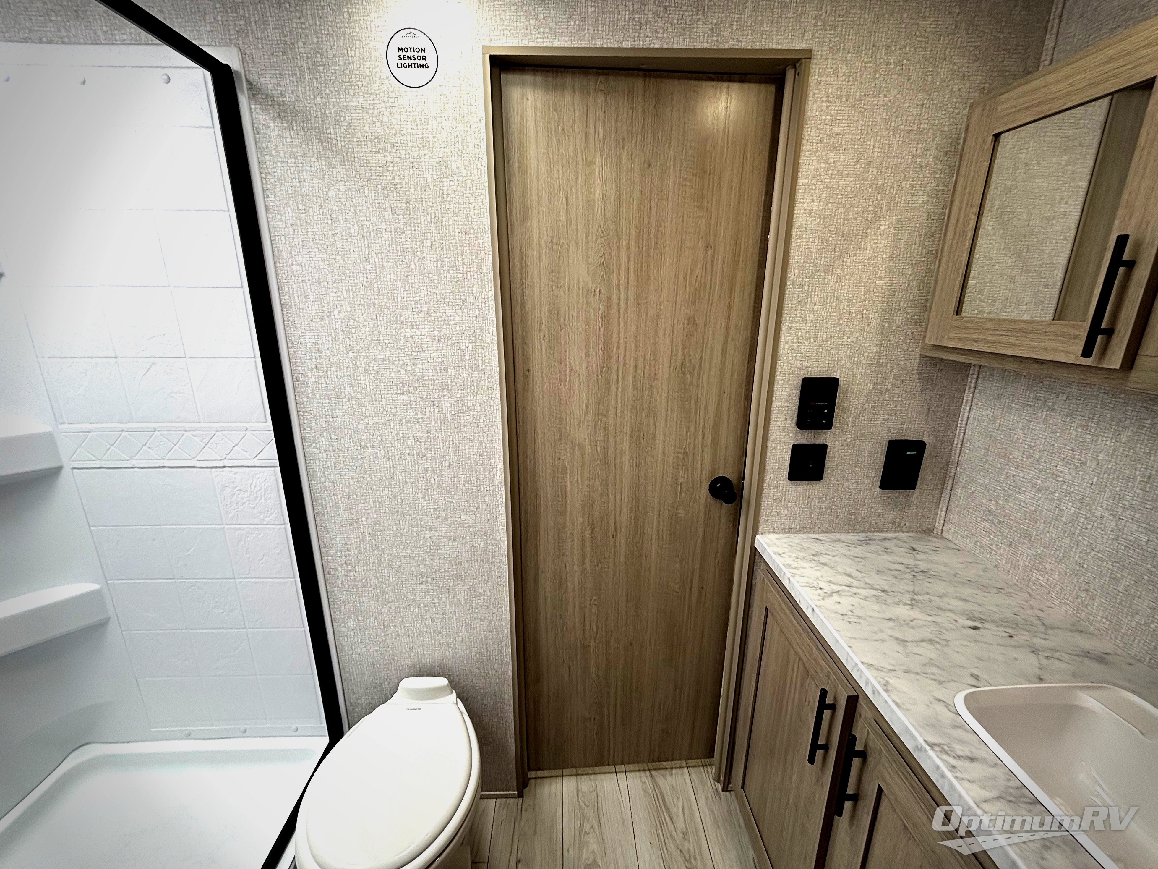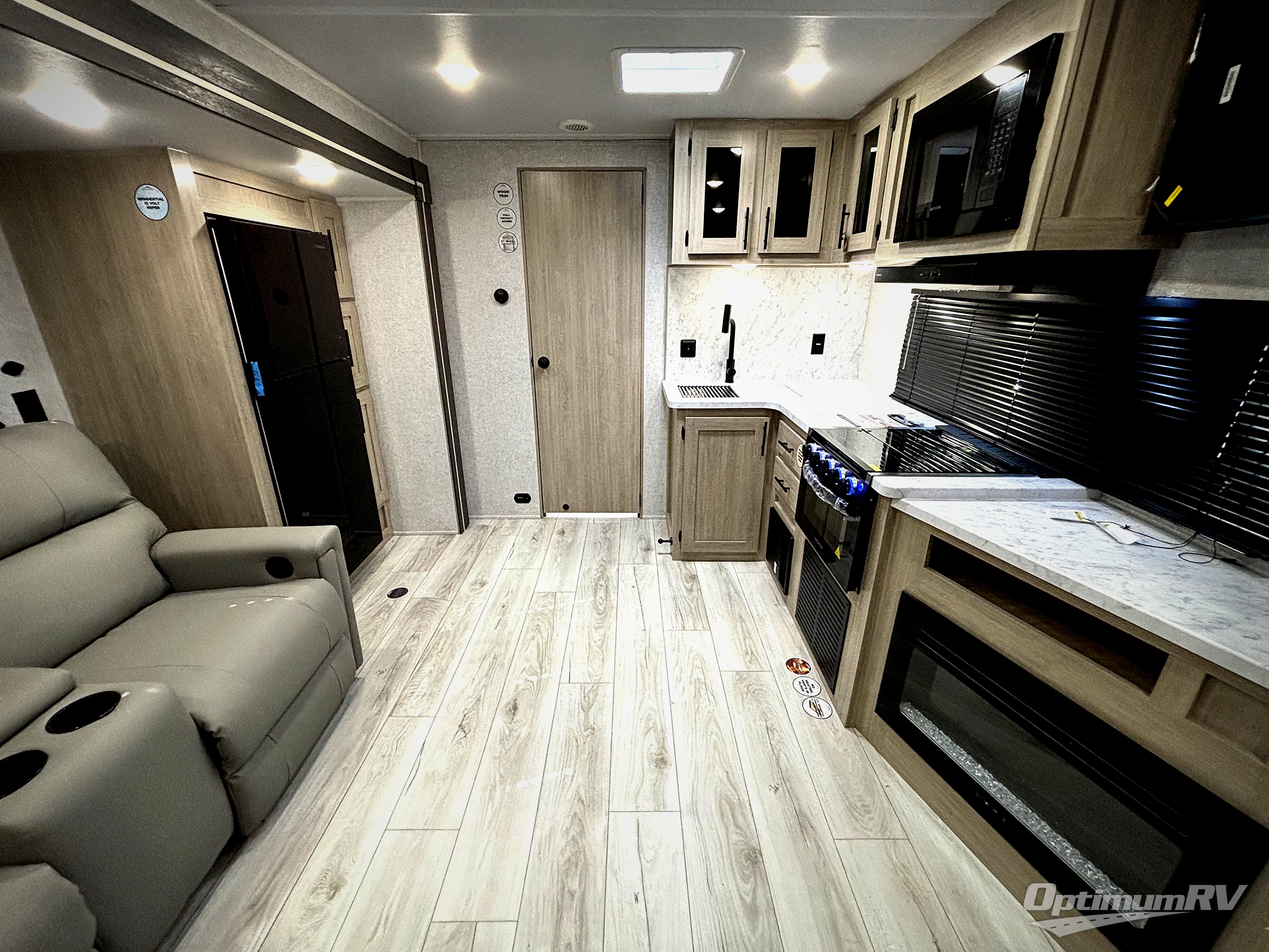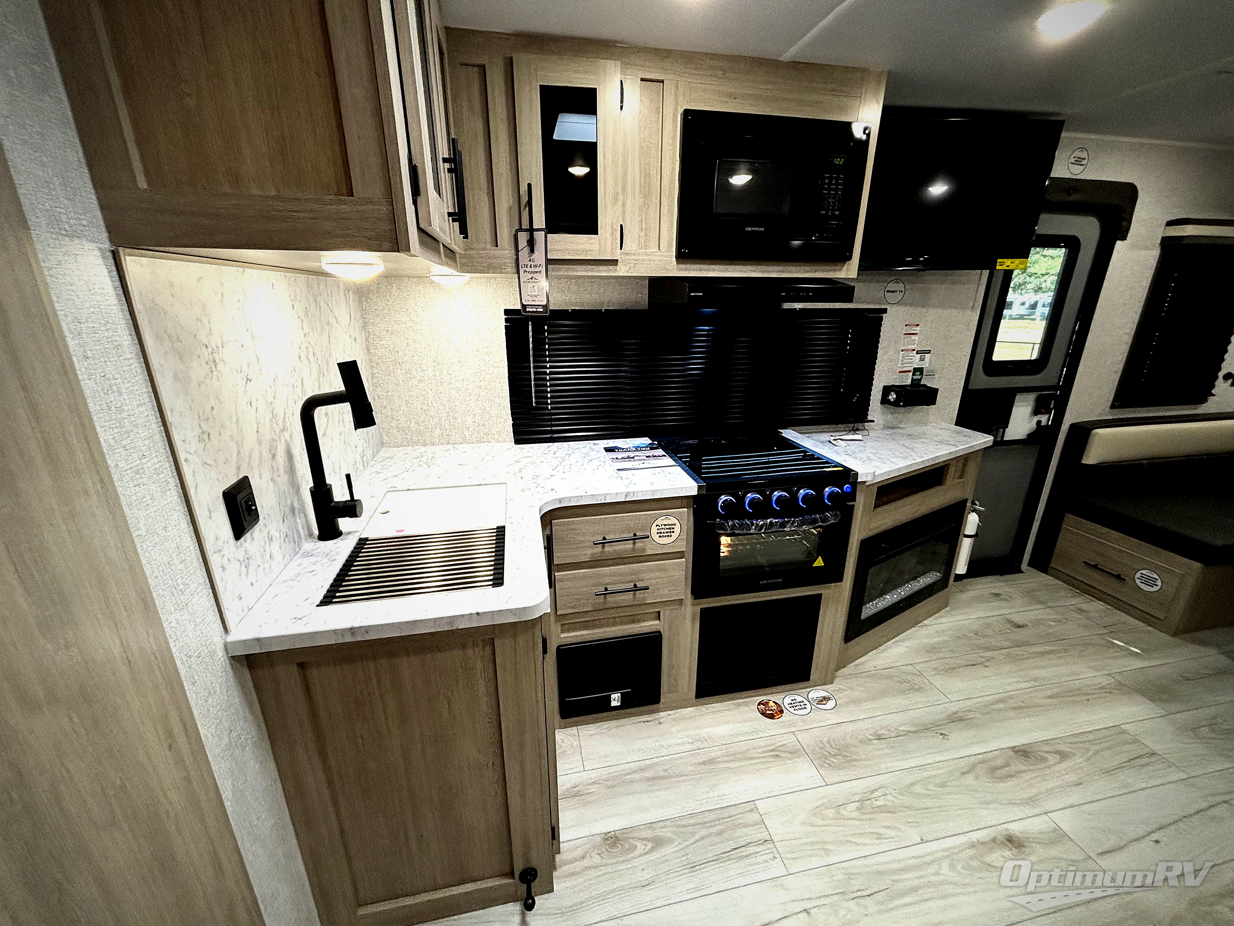 When you are wanting a little more interior space in your next travel trailer, take a look inside! This large slide out widens the main living space so you can easily make meals using full amenities without having to move for someone walking from the front bedroom and walk-through bath to the U-shaped dinette in the back. For sleeping, there is a king-size bed with storage on both sides at the very front of this unit giving you privacy from the rest, and even a private second entry/exit door from within the bedroom. You will find storage beneath the bed for larger items or extra blankets, plus a space saving sliding door. The U-shaped dinette and jackknife sofa offer comfortable seating as well as extra sleeping space for overnight guests, and the fireplace is just a nice feature to enjoy. On the outside, an 18' awning provides a large outdoor living area protected from the elements, and the oversized pass-through will house all of your exterior gear like lawn chairs, outdoor games and rugs, plus so much more!
