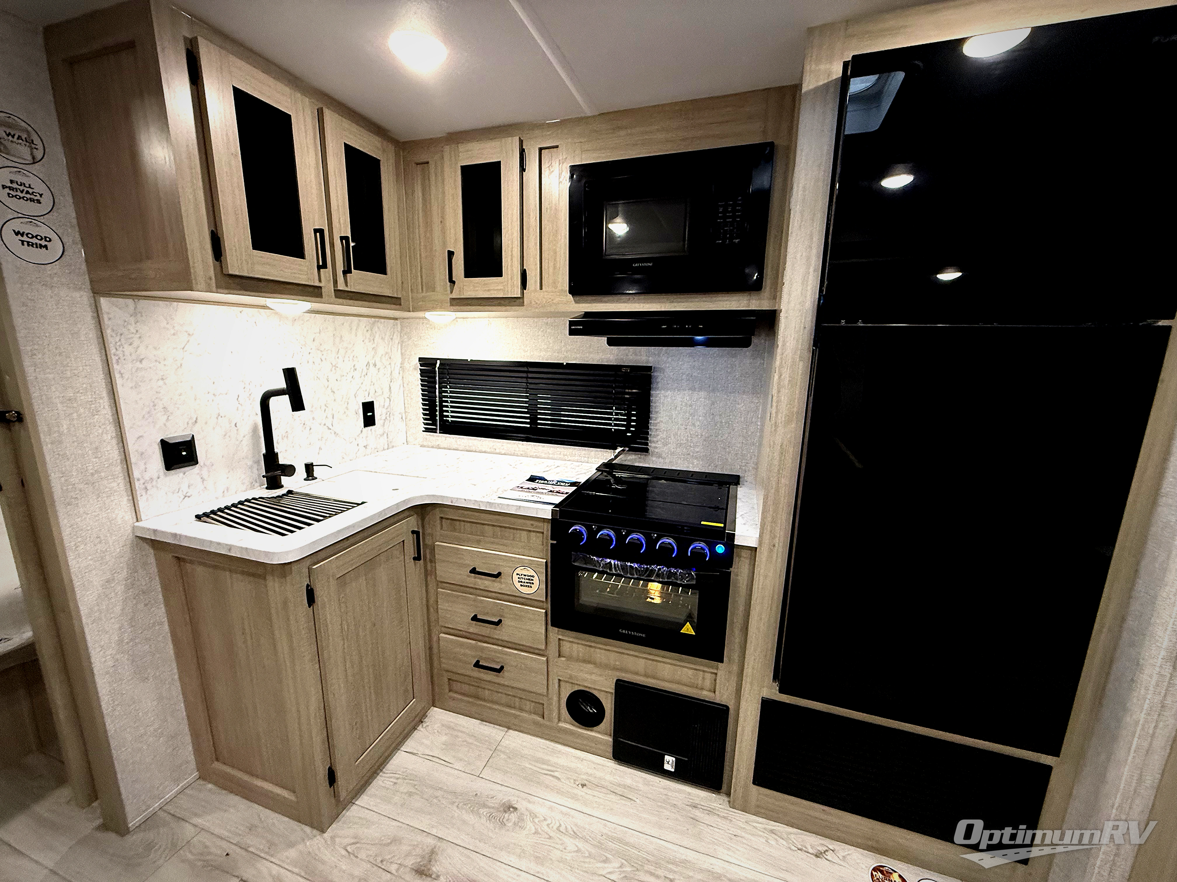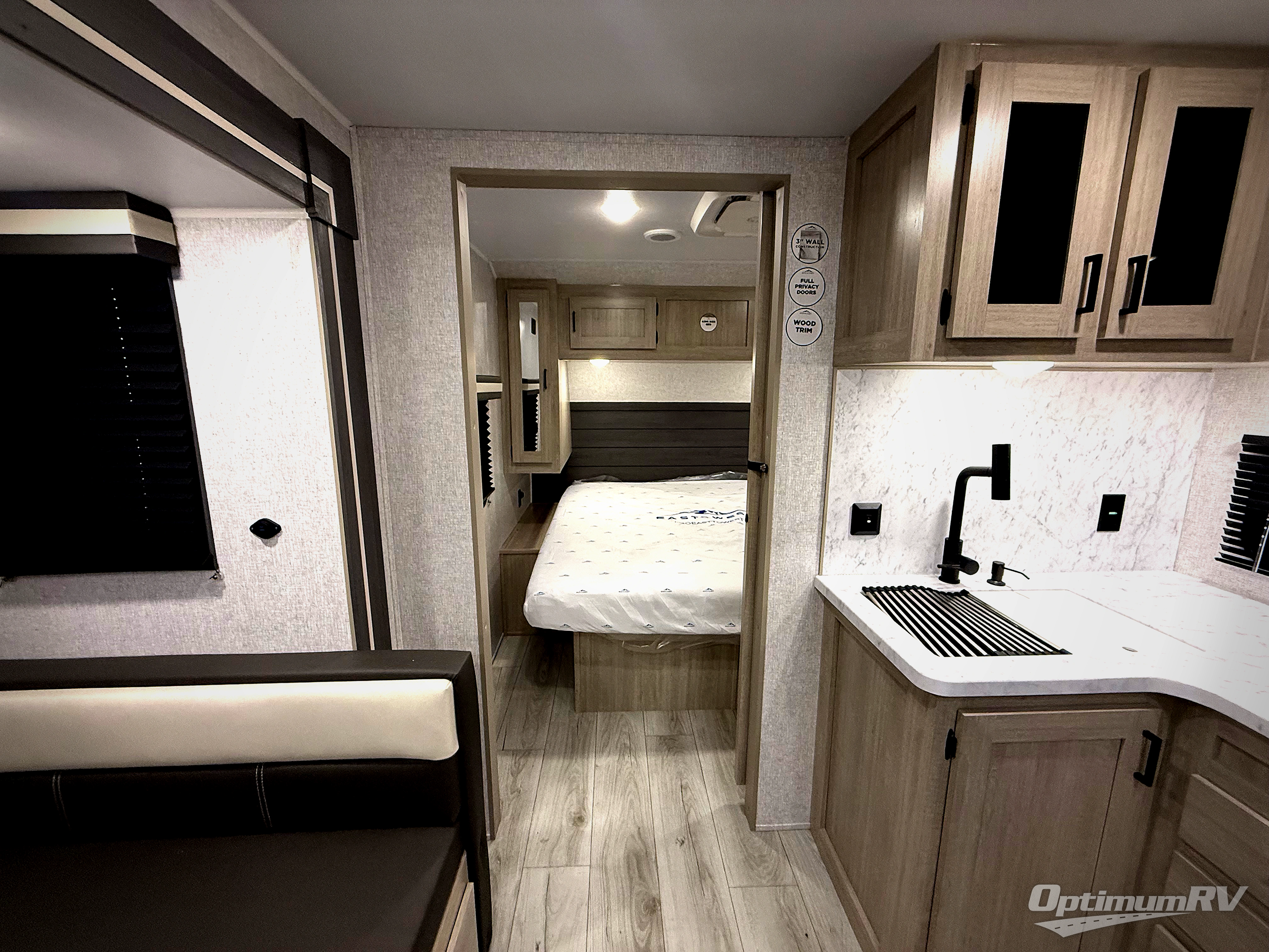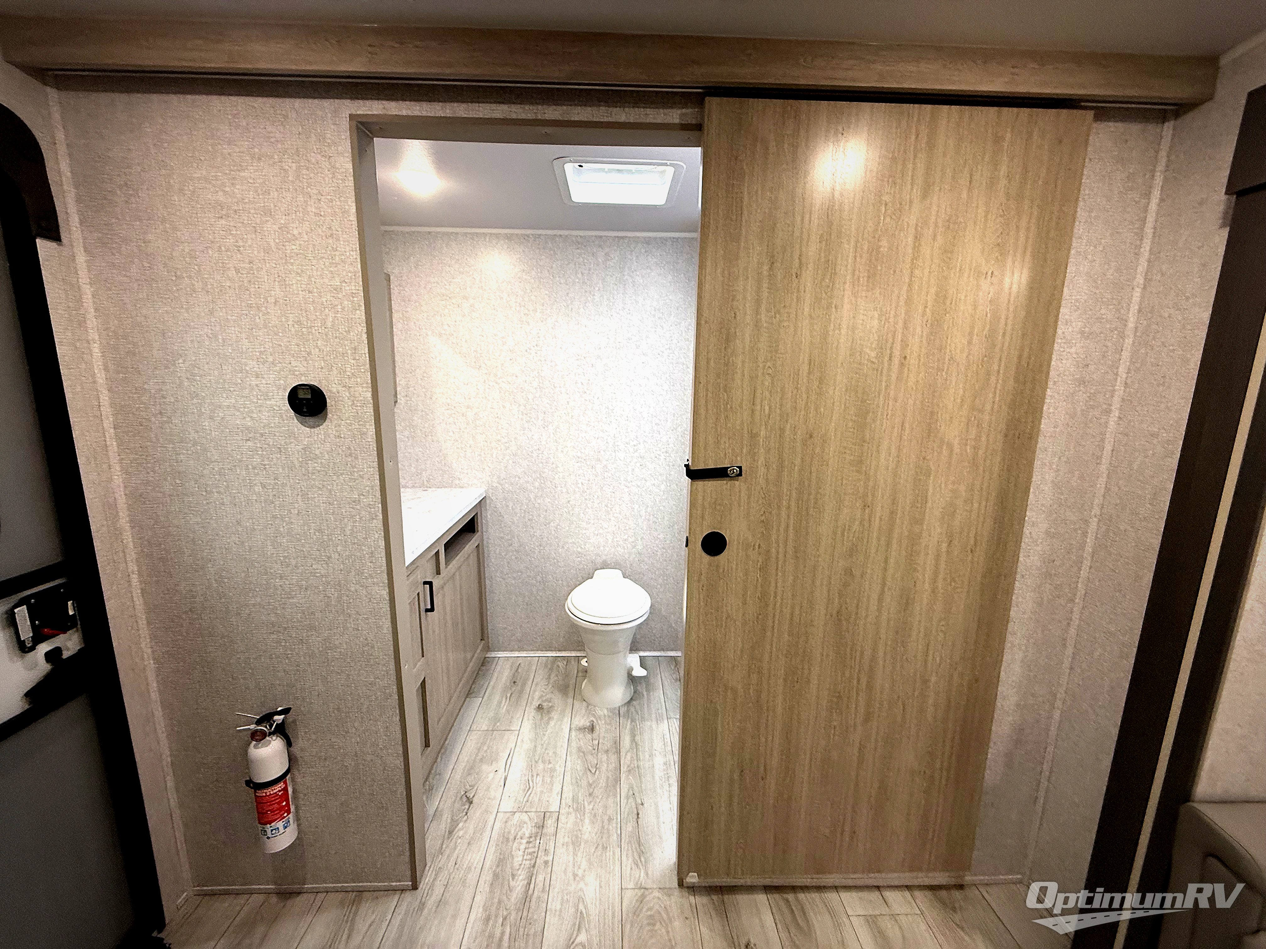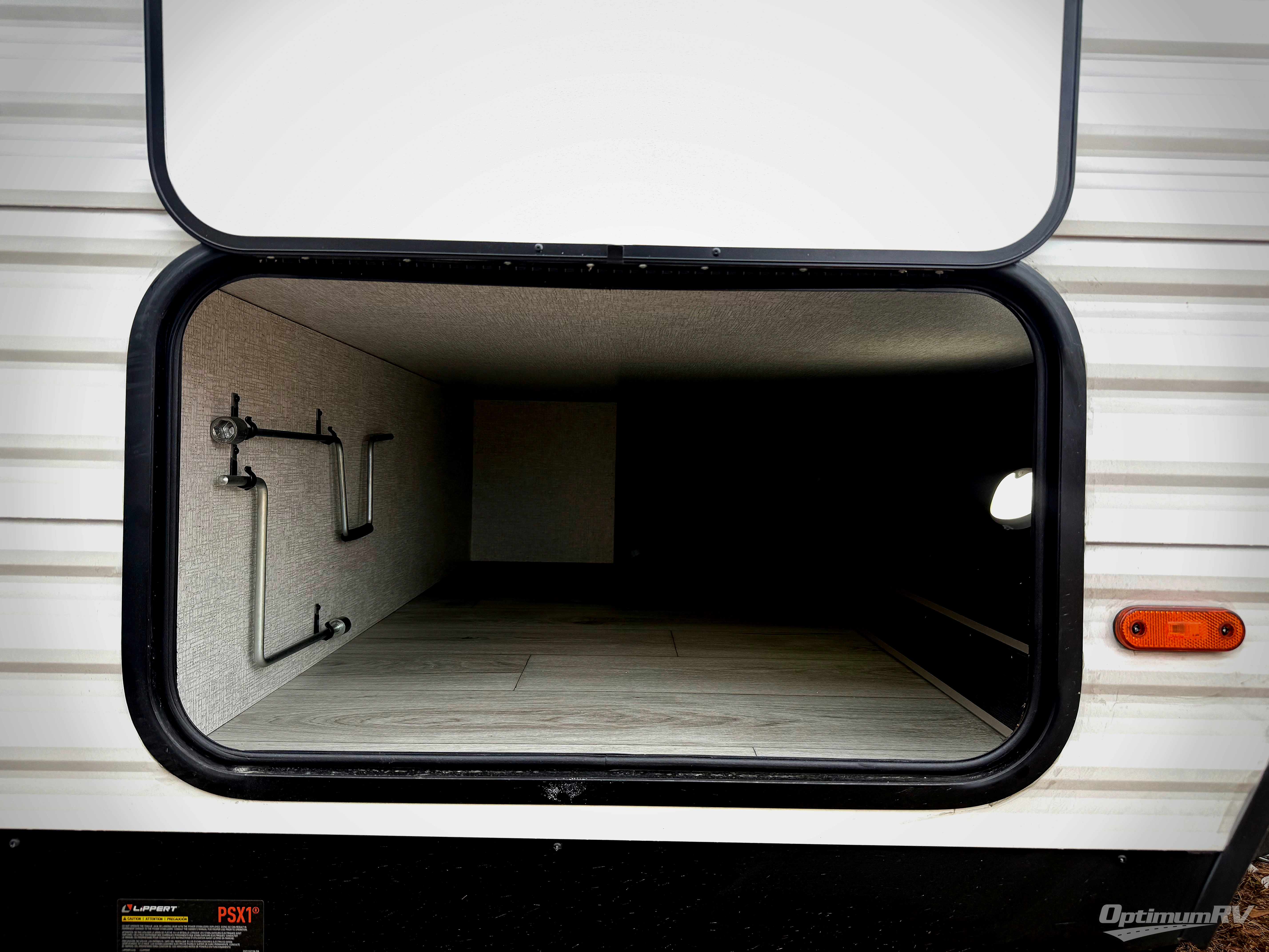 When you are wanting a little more interior space in your next travel trailer, take a look inside! This large slide out widens the center so you can easily make meals using full amenities without having to move for someone walking from the front private bedroom to the rear spacious bathroom. There is a king-size bed with storage on both sides, underneath and above, plus a space saving sliding door. The booth dinette and jiffy sofa offer comfortable seating as well as extra sleeping space for overnight guests. The fireplace is just a nice feature to enjoy, and the large pantry with washer/dryer prep gives you the option to make laundry day easier!