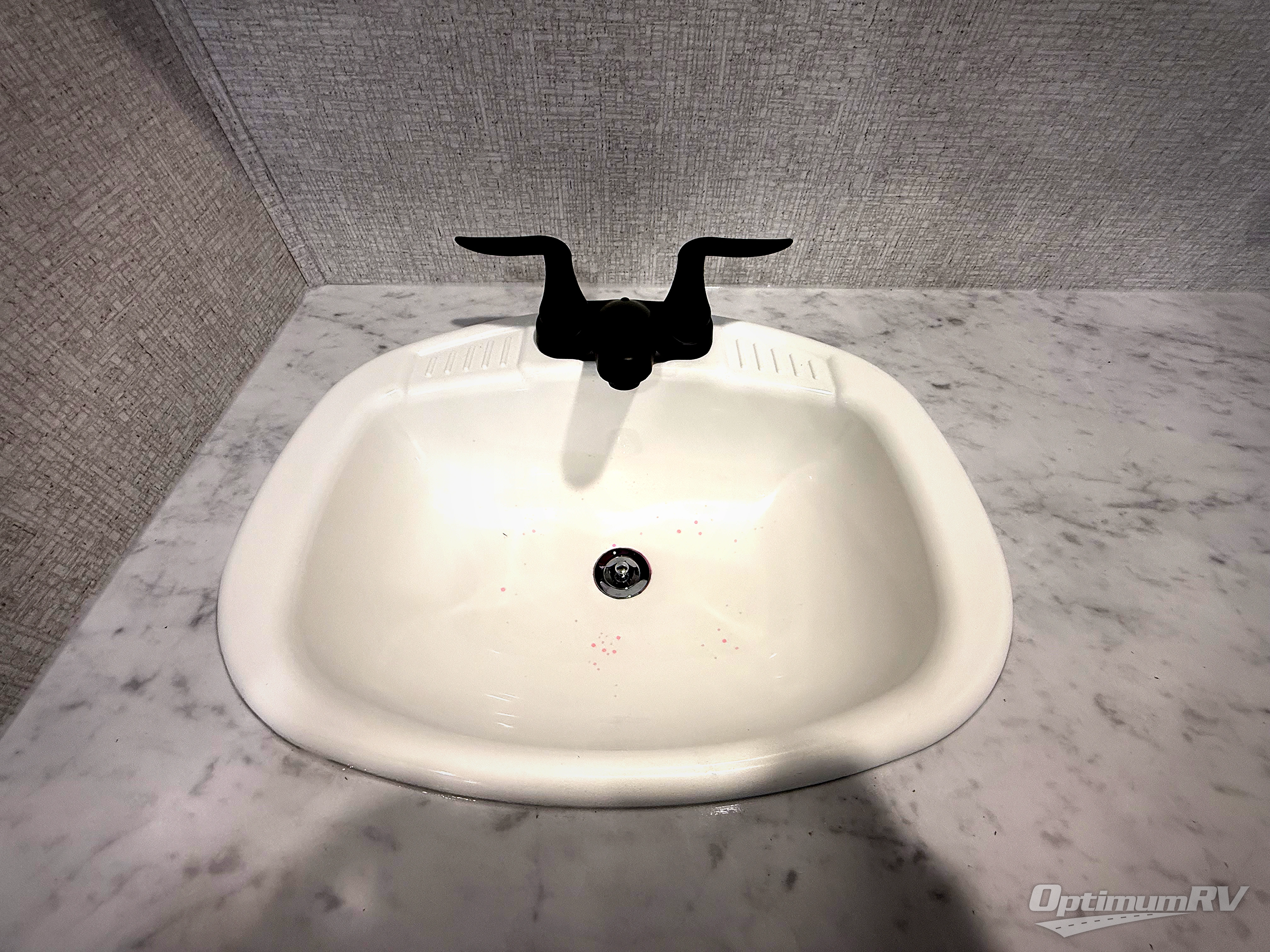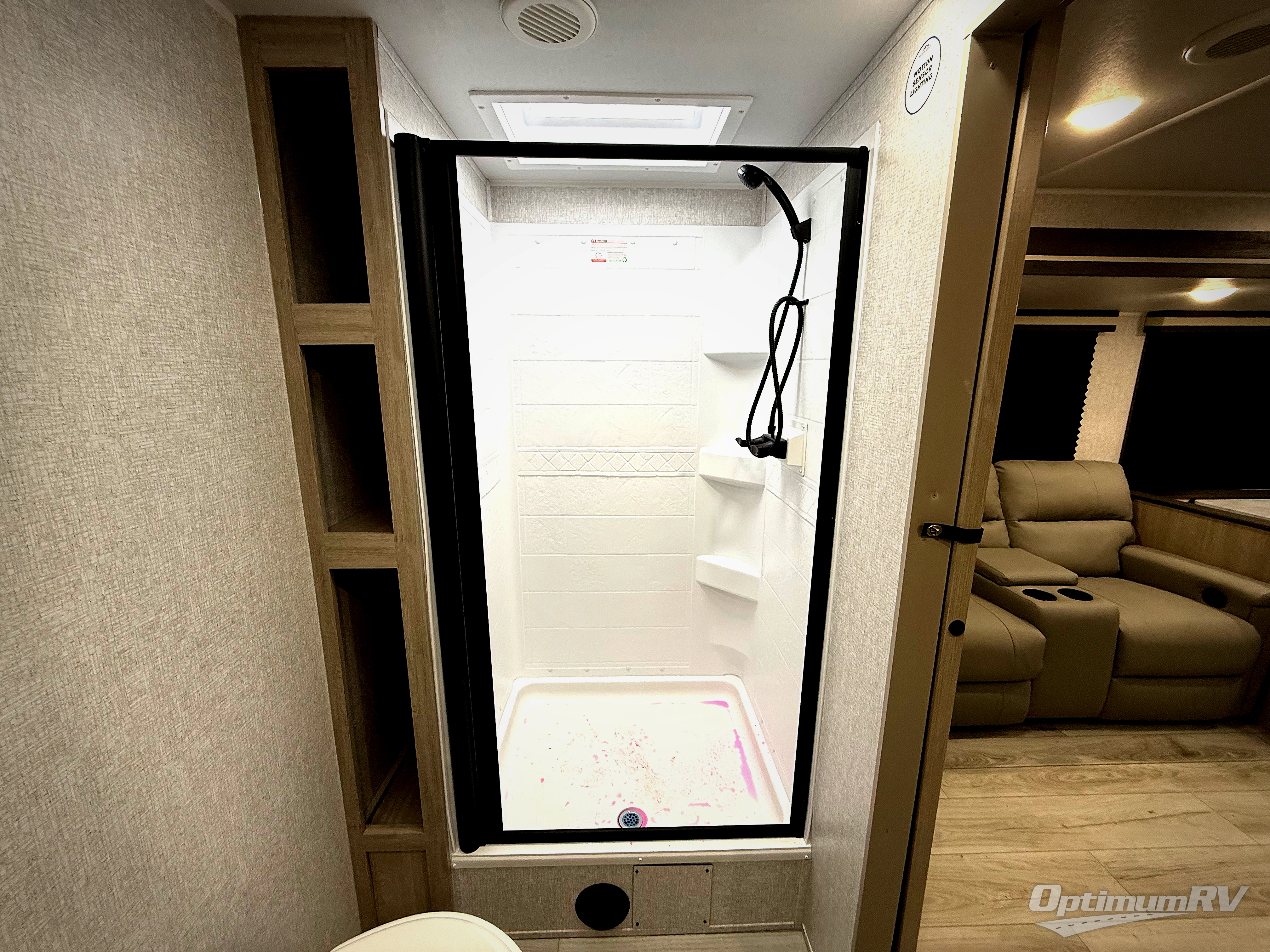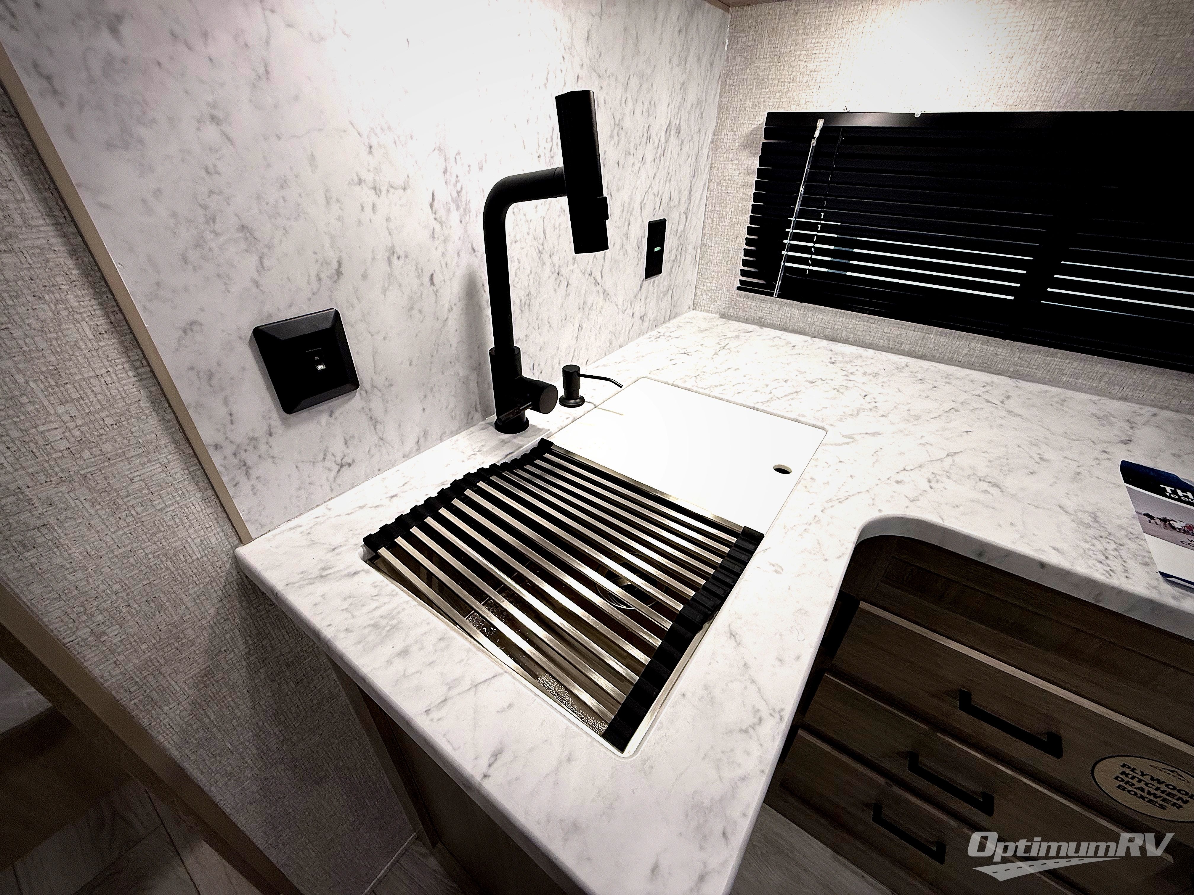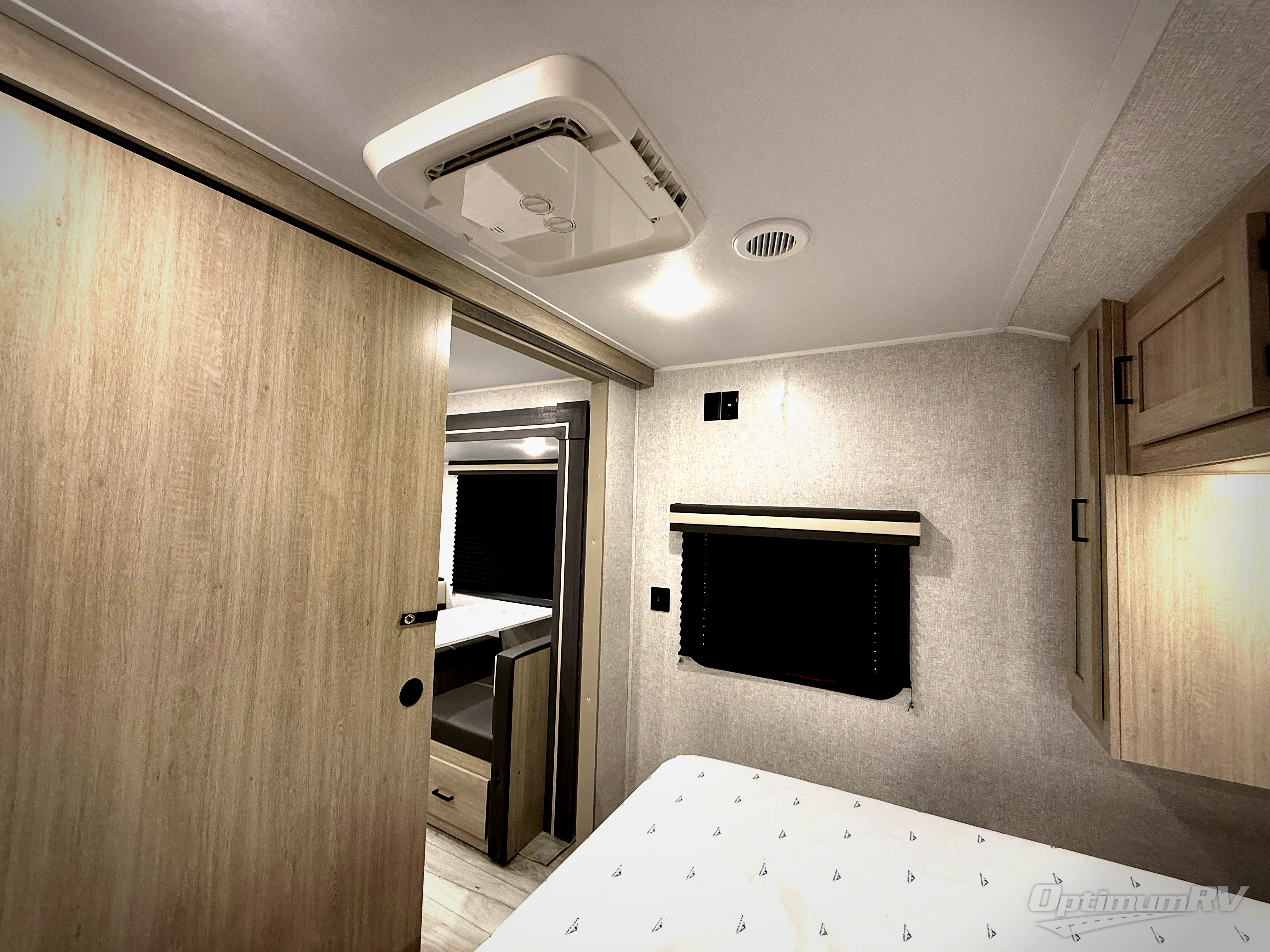 When you are wanting a little more interior space in your next travel trailer, take a look inside! This large slide out widens the center so you can easily make meals using full amenities without having to move for someone walking from the front private bedroom to the rear spacious bathroom. There is a king-size bed with storage on both sides, underneath and above, plus a space saving sliding door. The booth dinette and jiffy sofa offer comfortable seating as well as extra sleeping space for overnight guests. The fireplace is just a nice feature to enjoy, and the large pantry with washer/dryer prep gives you the option to make laundry day easier!
