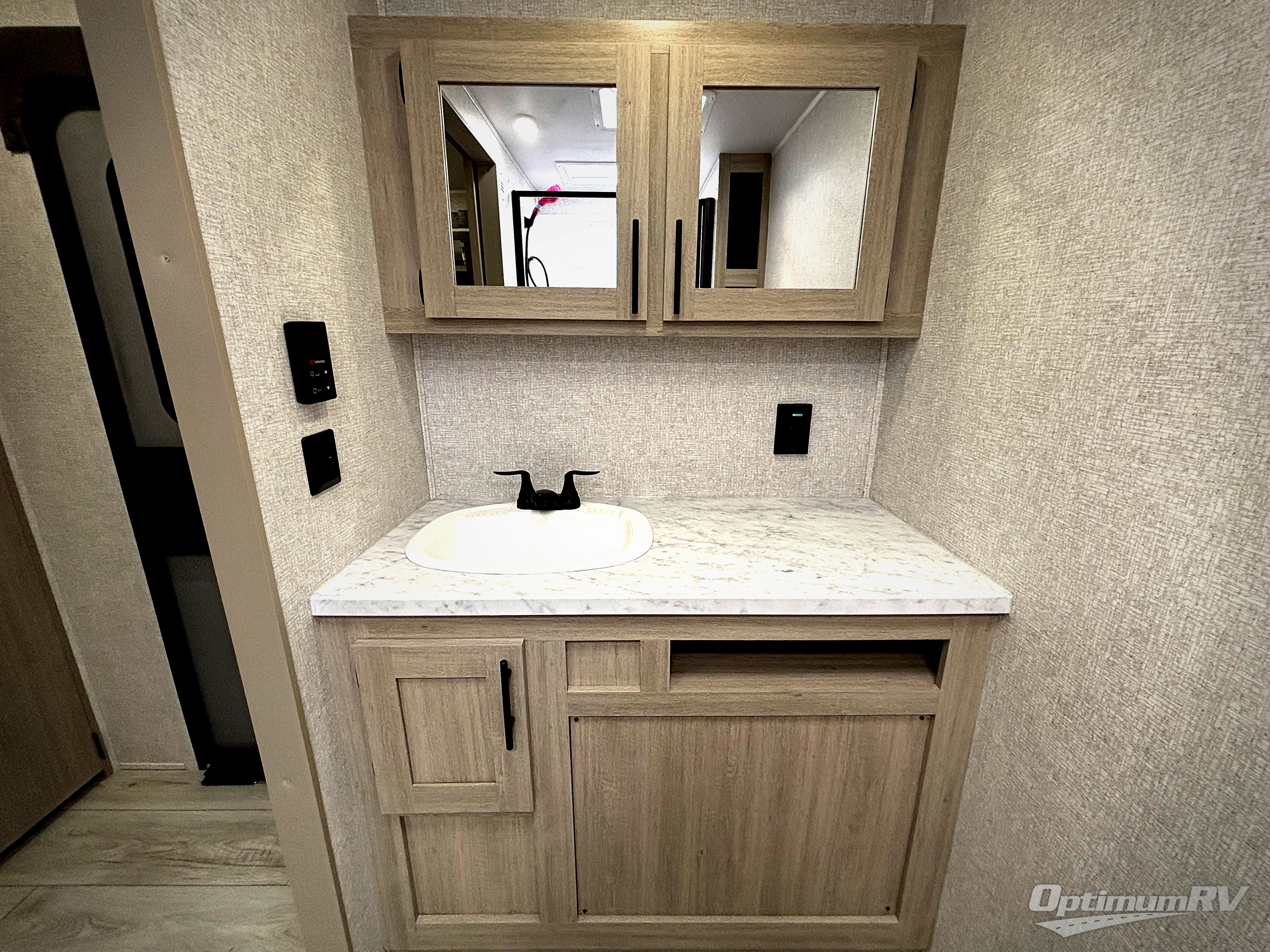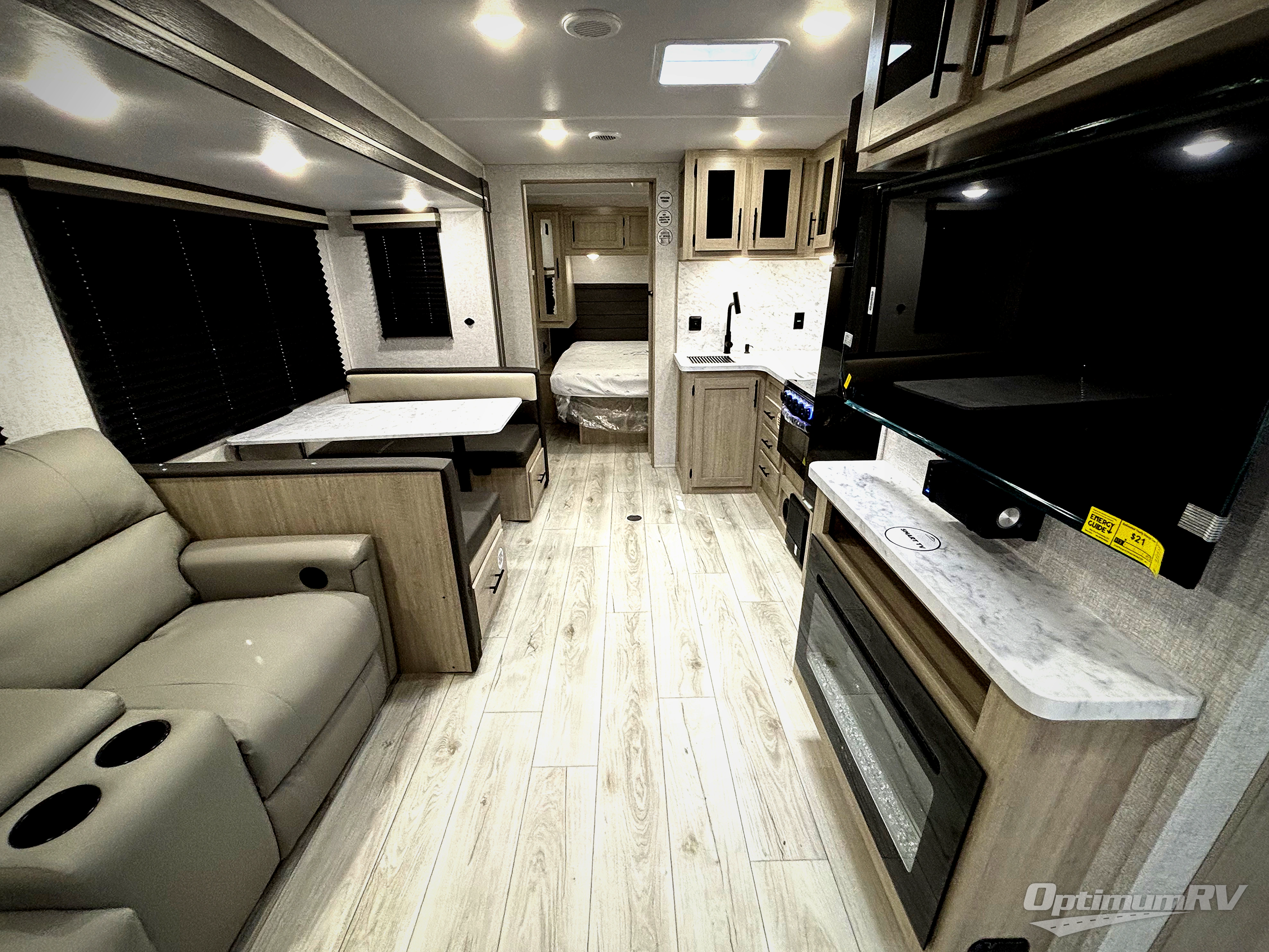 When you are wanting a little more interior space in your next travel trailer, take a look inside! This large slide out widens the center so you can easily make meals using full amenities without having to move for someone walking from the front private bedroom to the rear spacious bathroom. There is a king-size bed with storage on both sides, underneath and above, plus a space saving sliding door. The booth dinette and jiffy sofa offer comfortable seating as well as extra sleeping space for overnight guests. The fireplace is just a nice feature to enjoy, and the large pantry with washer/dryer prep gives you the option to make laundry day easier!