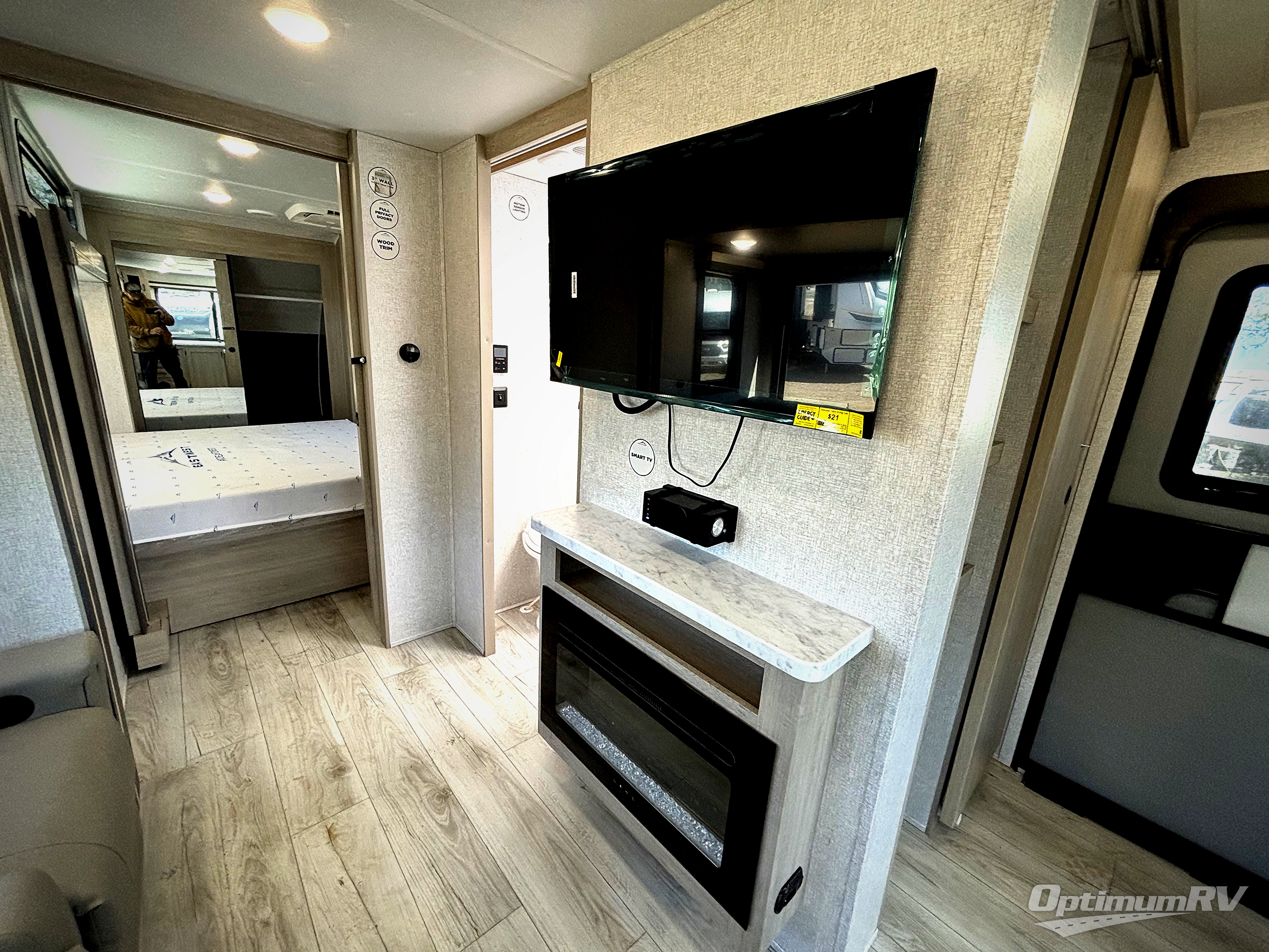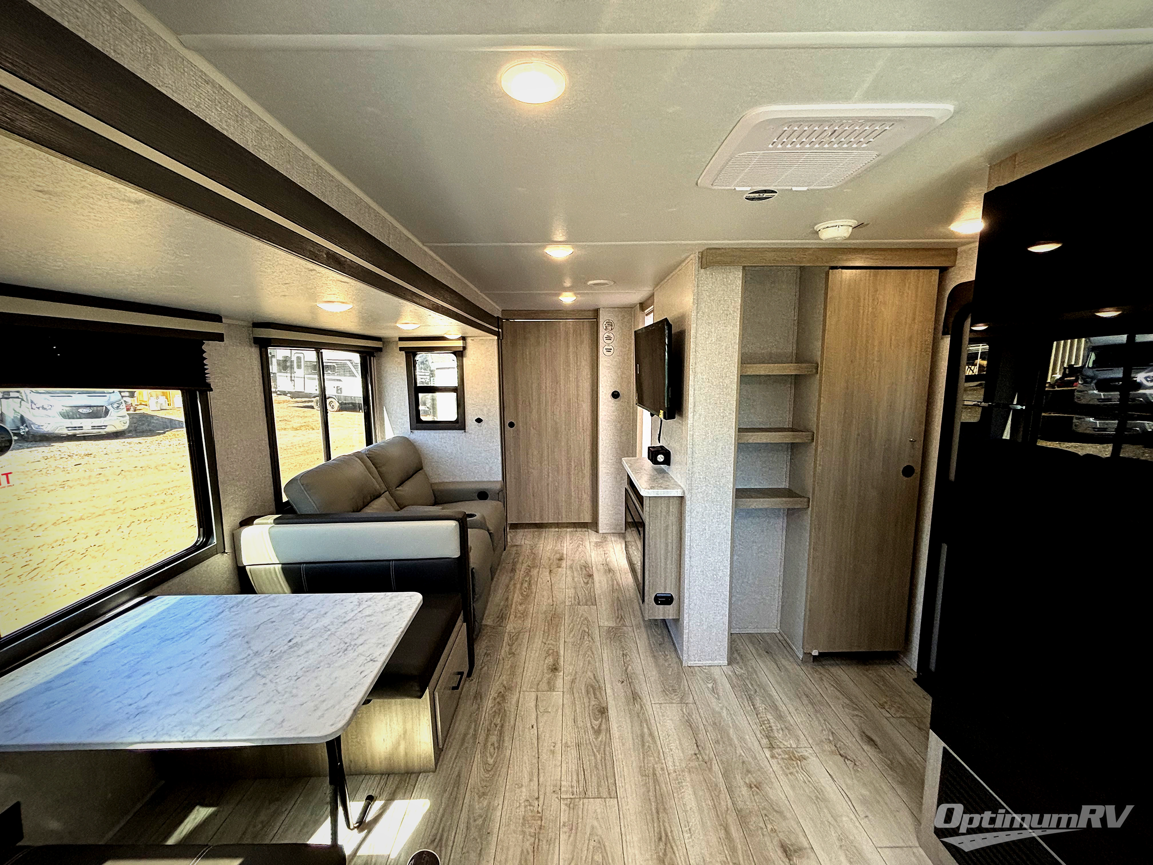 This travel trailer will feel just like home with its spacious interior and at-home comforts. Since there are dual entry doors, you can enter in through the front bedroom or the rear kitchen and living area. A king bed slide in the bedroom is sure to bring comfort, and there is a closet to keep your clothes wrinkle-free, plus washer and dryer prep. The second slide out is found in the living room, and here you can relax on the jiffy sofa or dine at the booth dinette. The chef of your group will love cooking in the rear kitchen, and there is generous counter space here to set out snacks. An entryway pantry and closet will provide additional storage for snacks, jackets, and more!