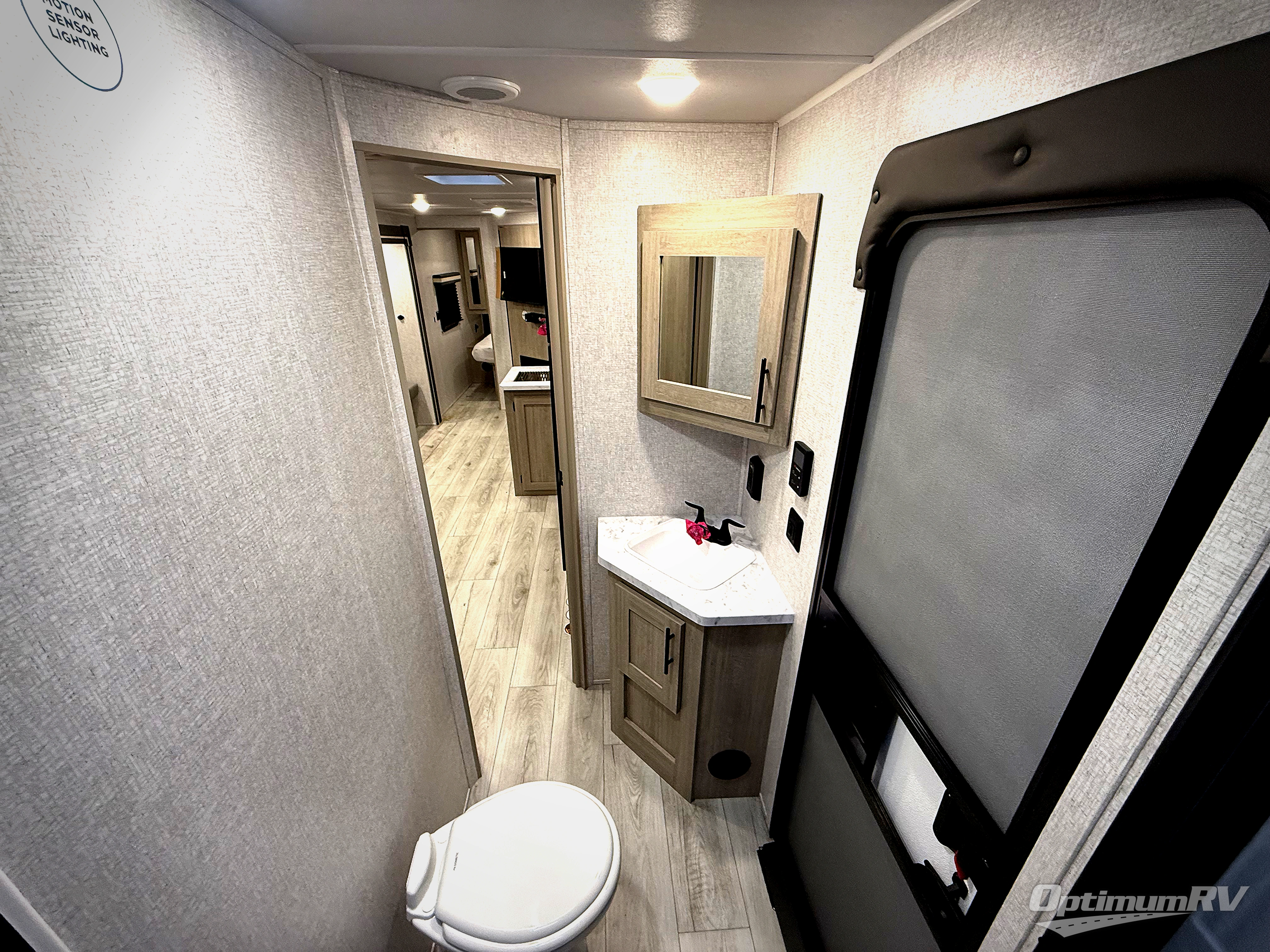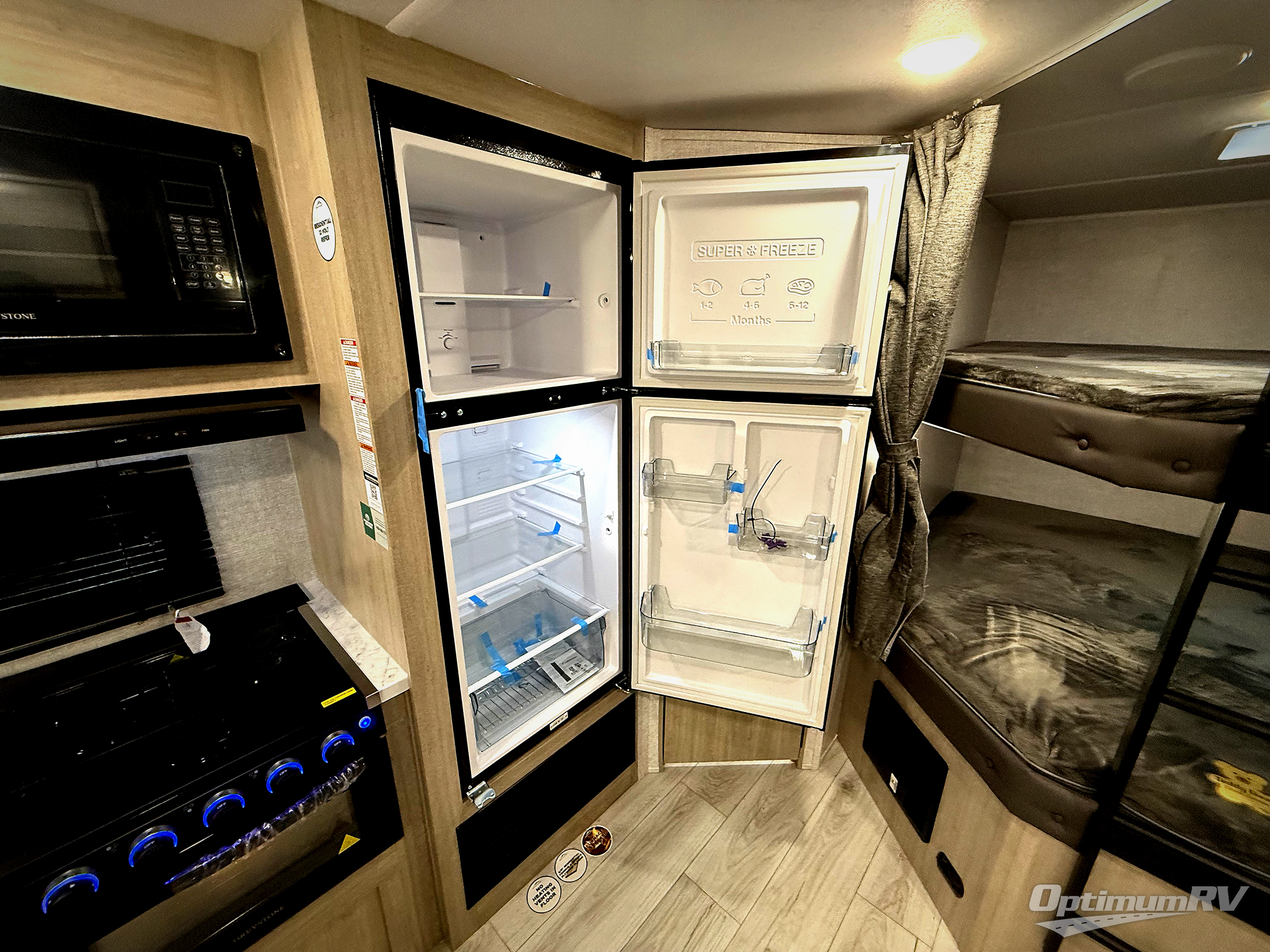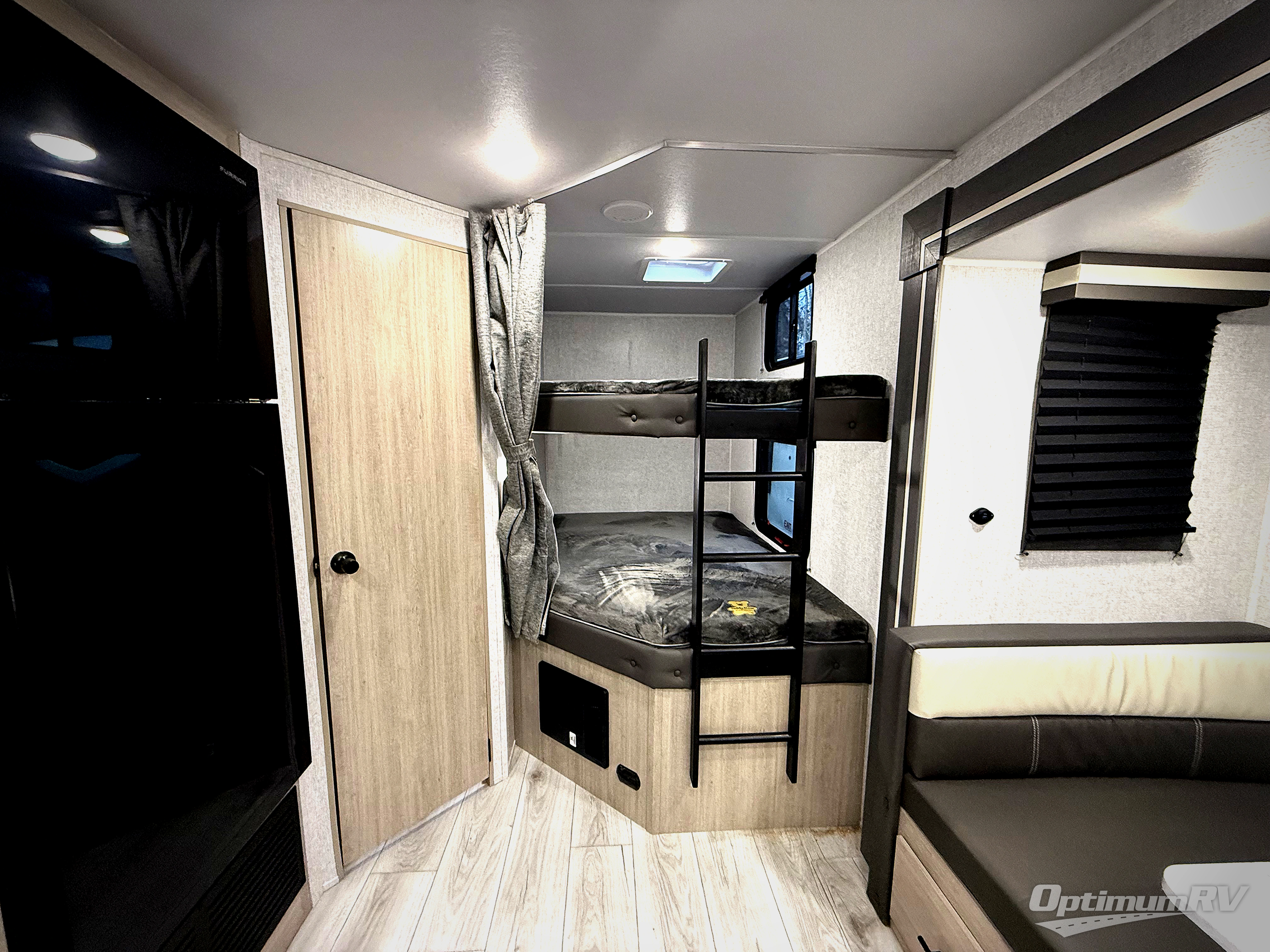 Pack your bags and hitch up this travel trailer for a fun family adventure! You will get a good night's rest on the front king bed in the front private bedroom, and the kids can sleep on the double bunk beds with storage. You could even transform the booth dinette with storage underneath it and the jiffy sofa which can be switched out for the optional theater seat or optional tri-fold sofa. The entertainment center has a fireplace for a cozy evening indoors and a hidden pantry behind it for all of your movie night snacks. With dual entry doors, it will be easy to enter and exit this unit especially from the rear corner bathroom which has one of the entry/exit doors to the unit. Enjoy cooking breakfast outside at the outdoor kitchen complete with a pull-out griddle and fridge!