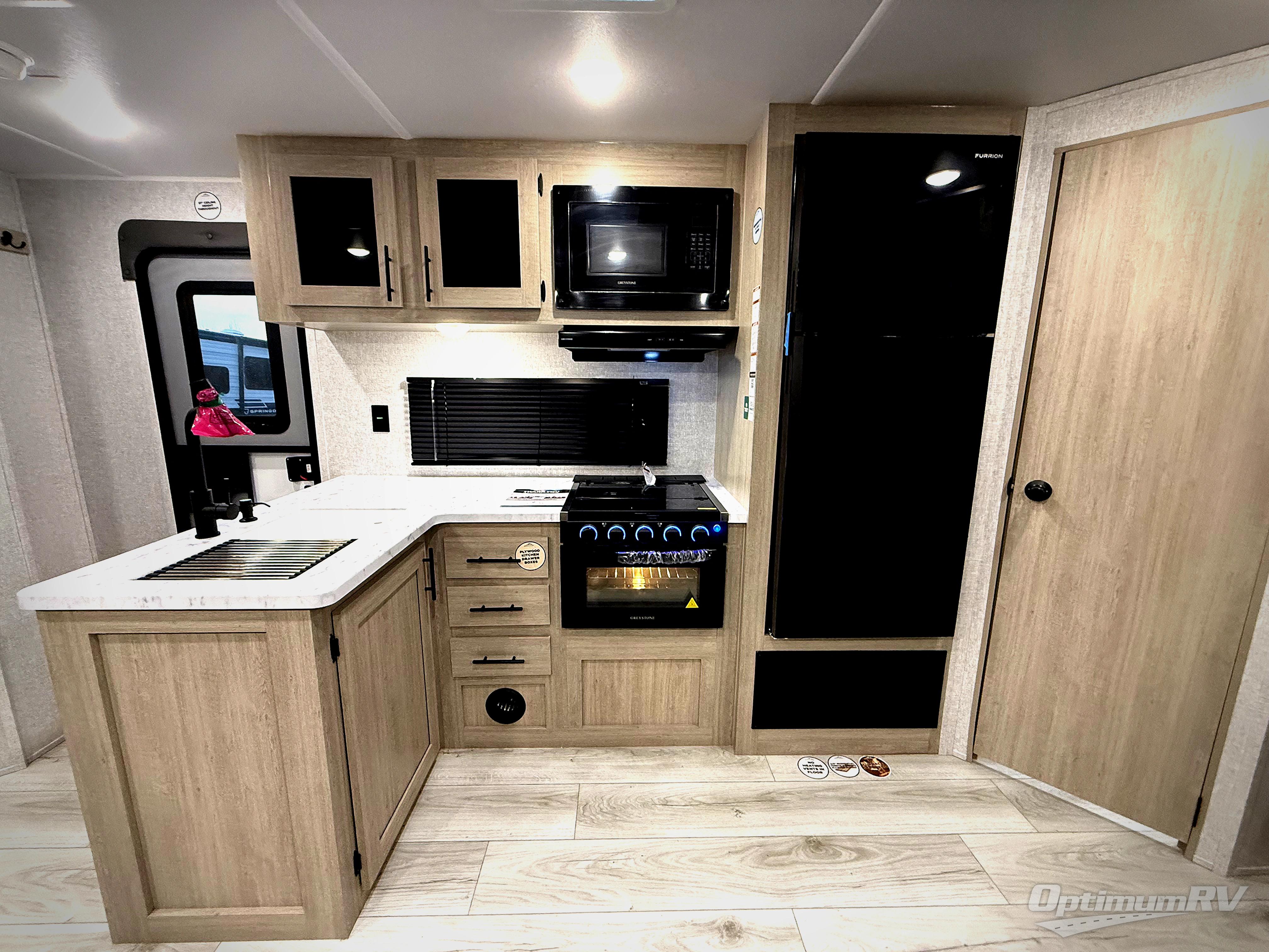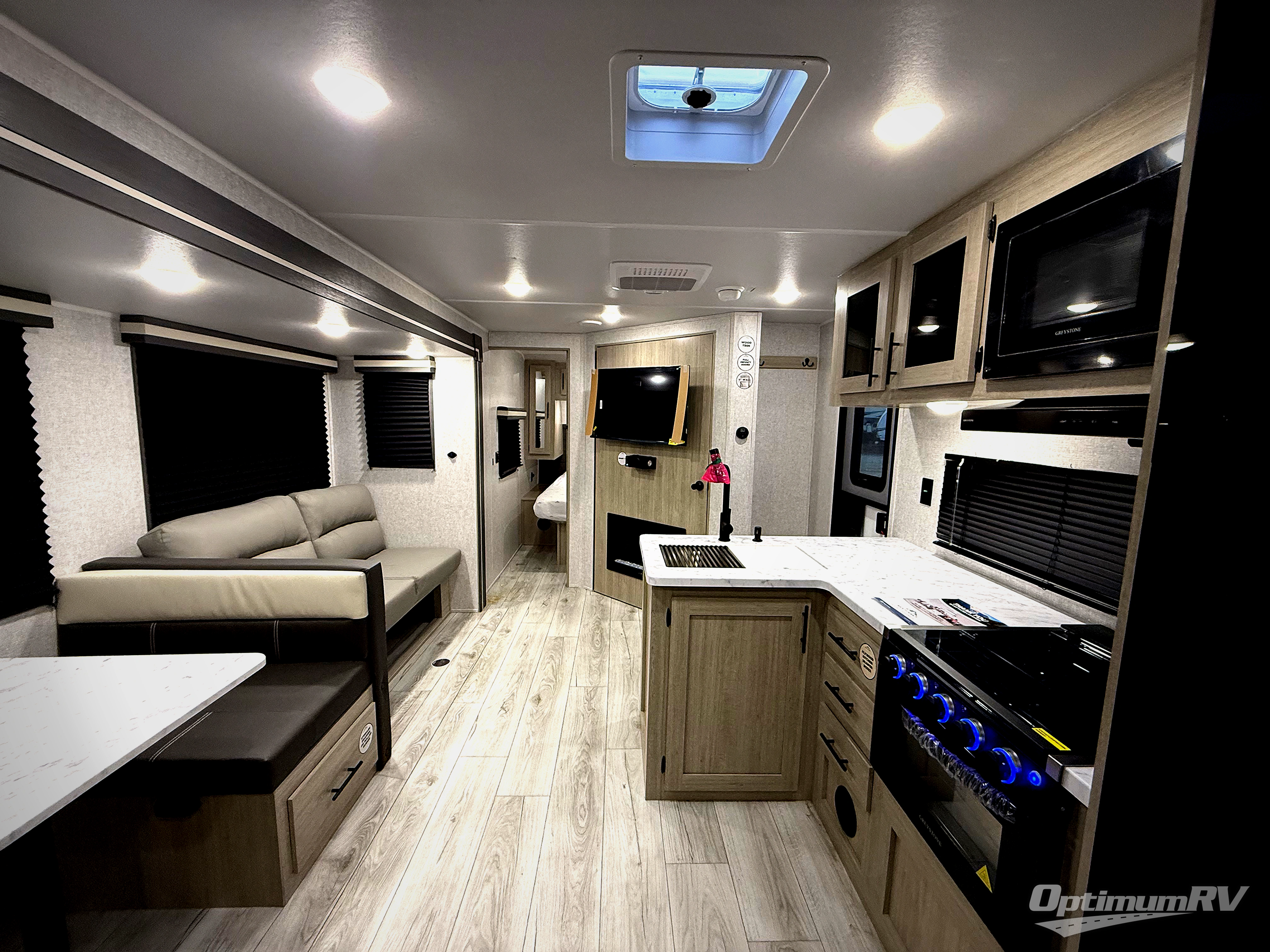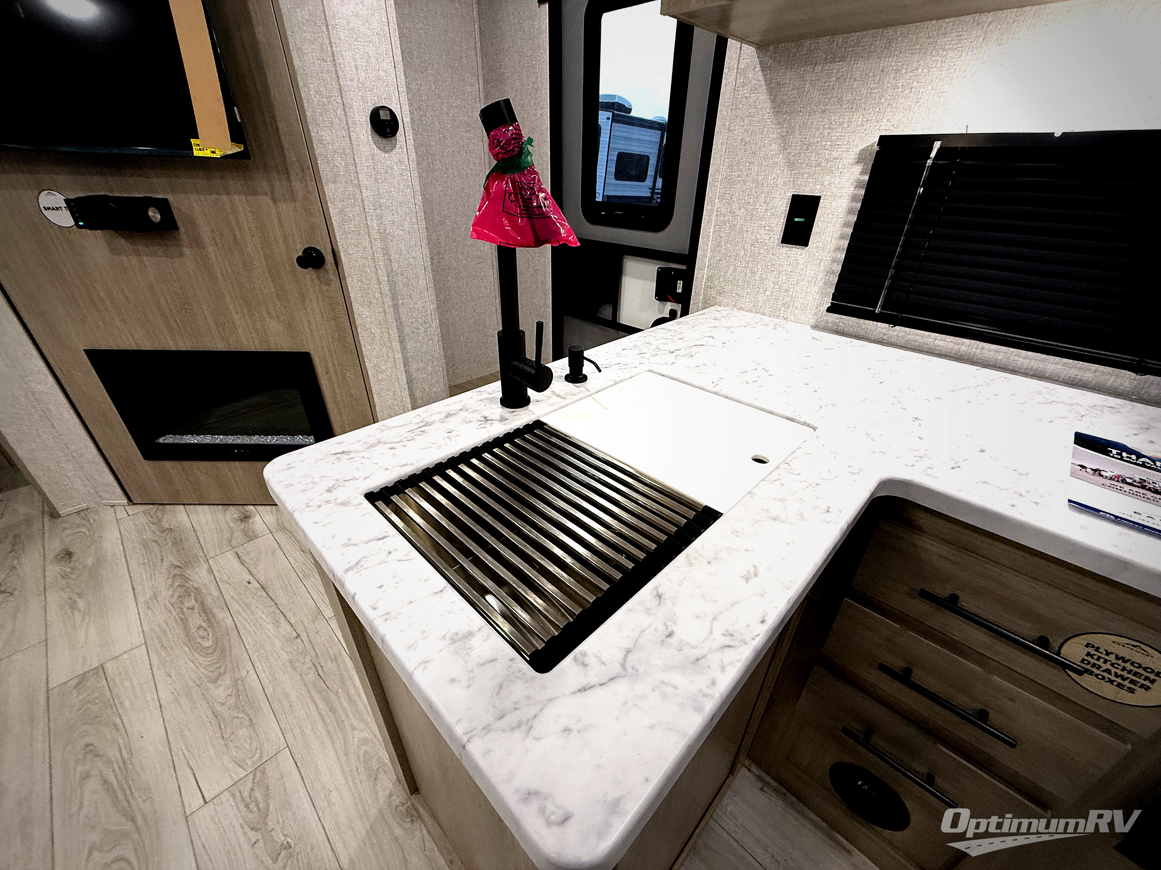 Pack your bags and hitch up this travel trailer for a fun family adventure! You will get a good night's rest on the front king bed in the front private bedroom, and the kids can sleep on the double bunk beds with storage. You could even transform the booth dinette with storage underneath it and the jiffy sofa which can be switched out for the optional theater seat or optional tri-fold sofa. The entertainment center has a fireplace for a cozy evening indoors and a hidden pantry behind it for all of your movie night snacks. With dual entry doors, it will be easy to enter and exit this unit especially from the rear corner bathroom which has one of the entry/exit doors to the unit. Enjoy cooking breakfast outside at the outdoor kitchen complete with a pull-out griddle and fridge!