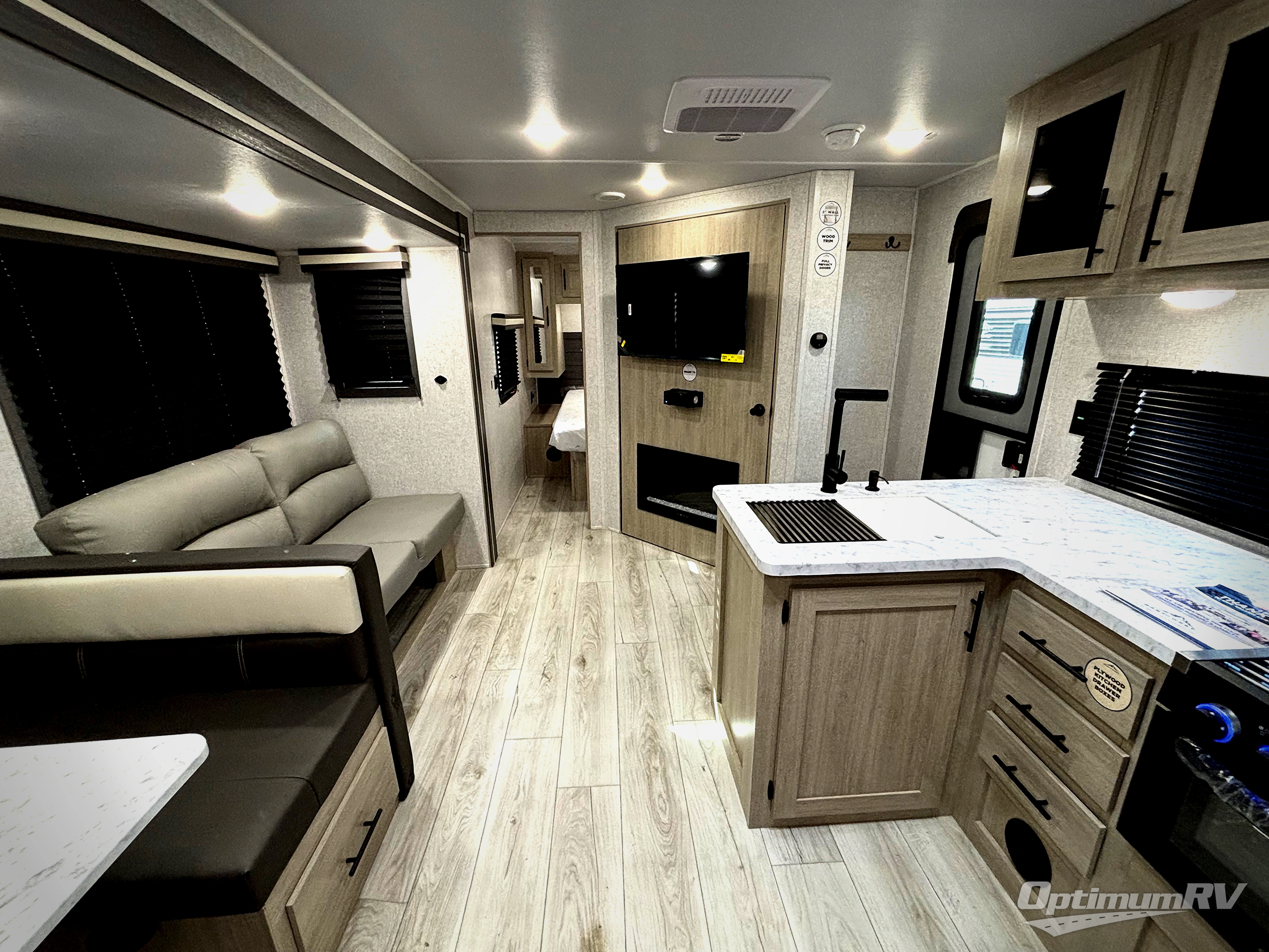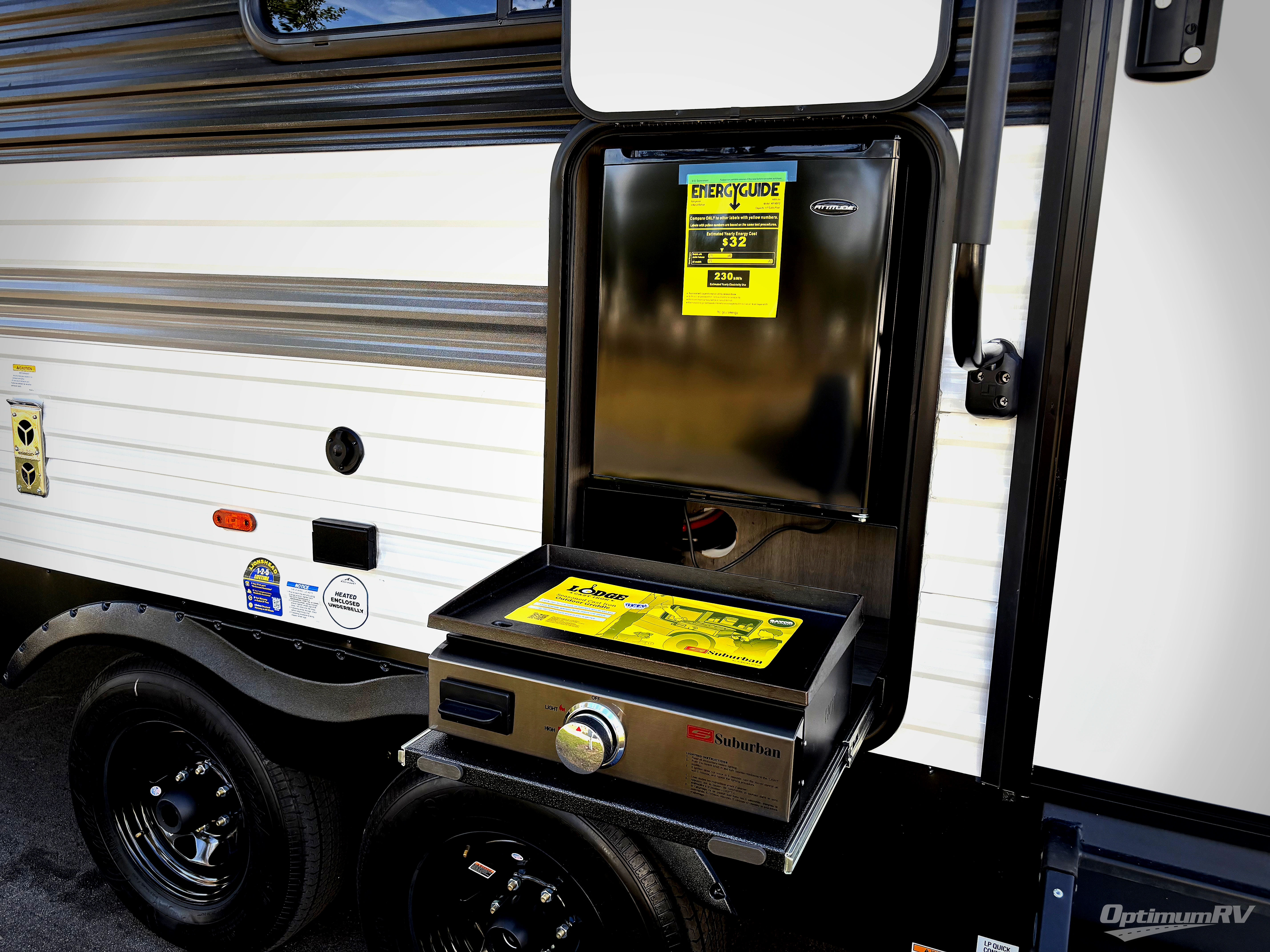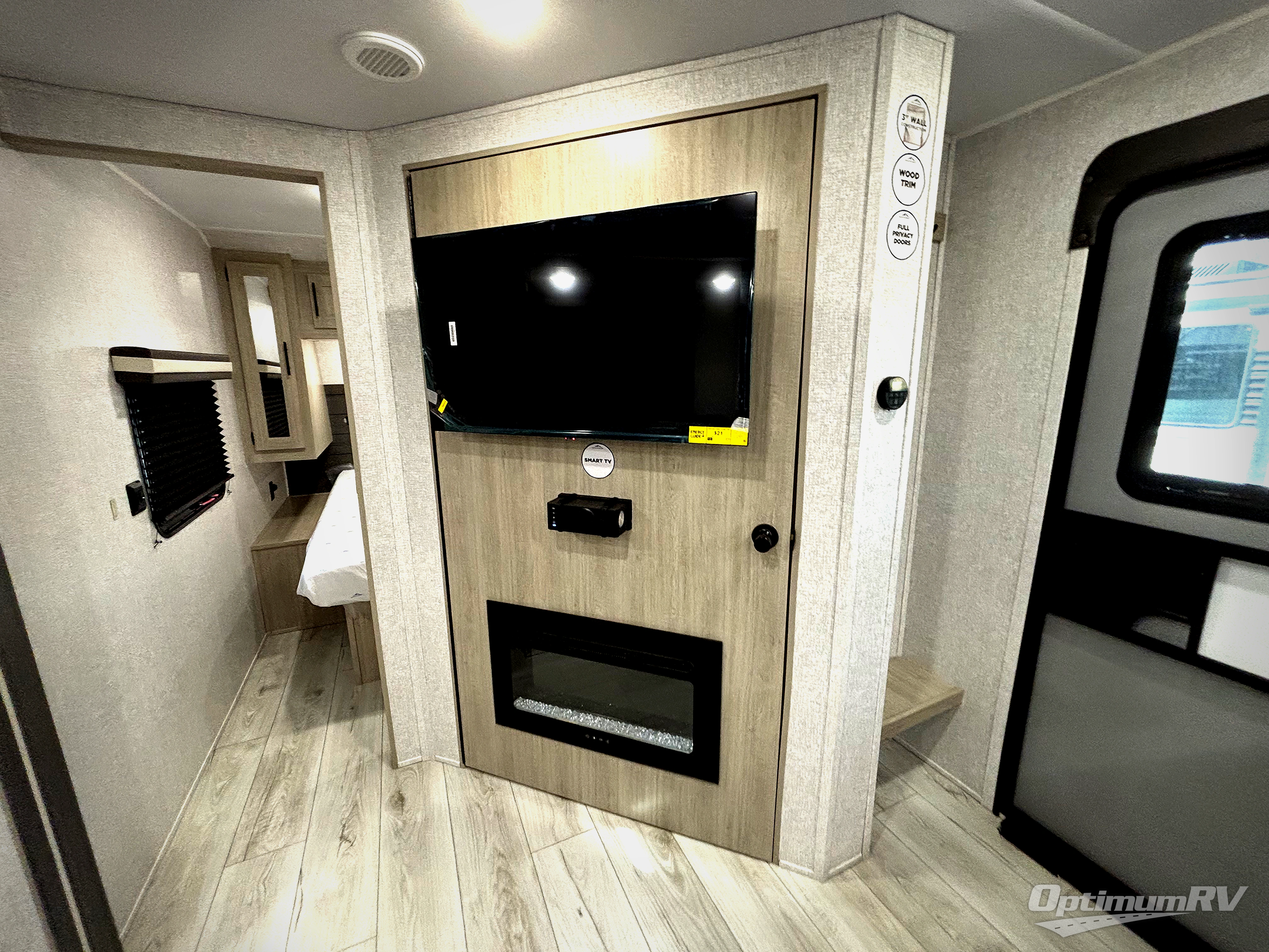 Pack your bags and hitch up this travel trailer for a fun family adventure! You will get a good night's rest on the front king bed in the front private bedroom, and the kids can sleep on the double bunk beds with storage. You could even transform the booth dinette with storage underneath it and the jiffy sofa which can be switched out for the optional theater seat or optional tri-fold sofa. The entertainment center has a fireplace for a cozy evening indoors and a hidden pantry behind it for all of your movie night snacks. With dual entry doors, it will be easy to enter and exit this unit especially from the rear corner bathroom which has one of the entry/exit doors to the unit. Enjoy cooking breakfast outside at the outdoor kitchen complete with a pull-out griddle and fridge!