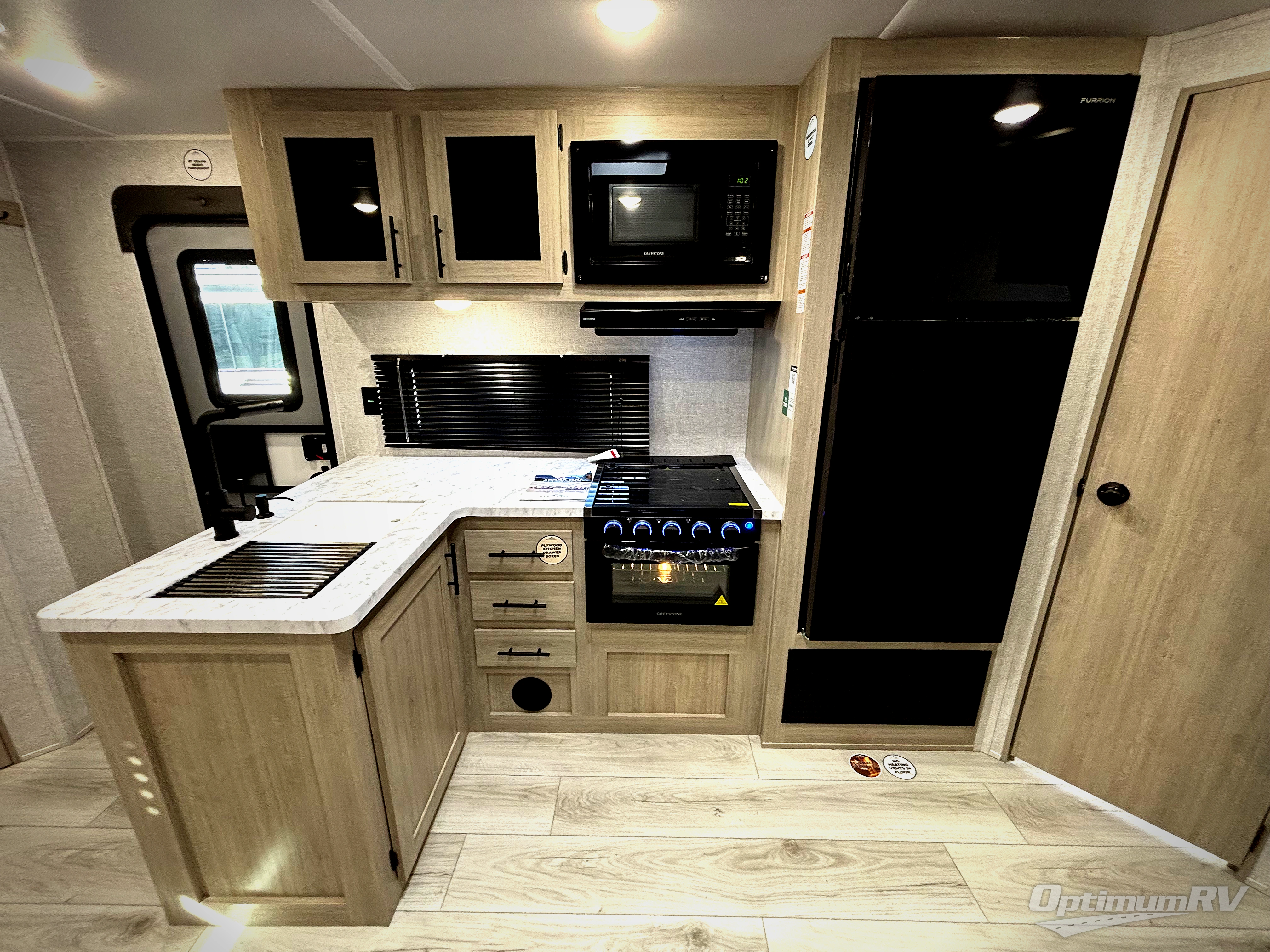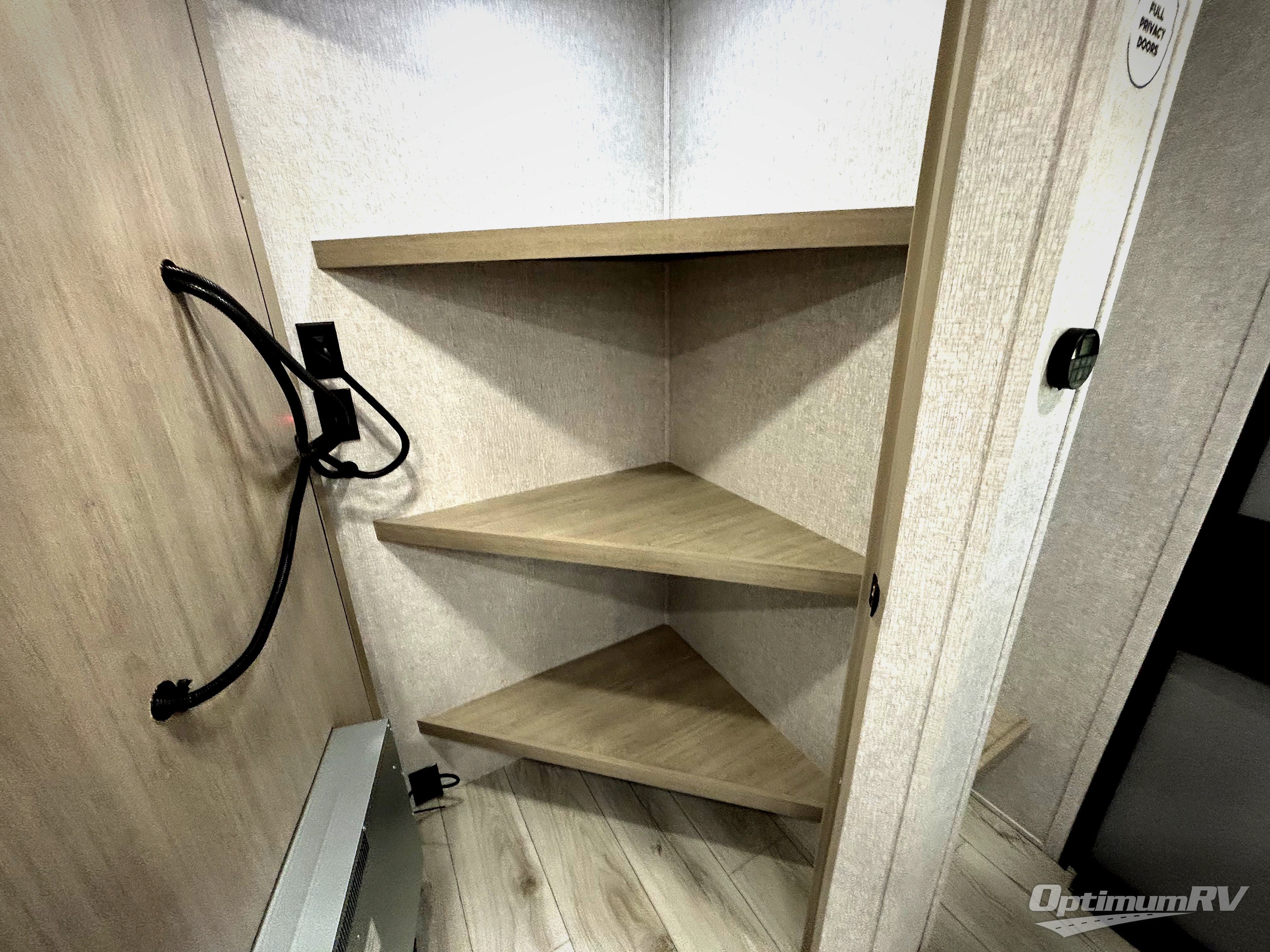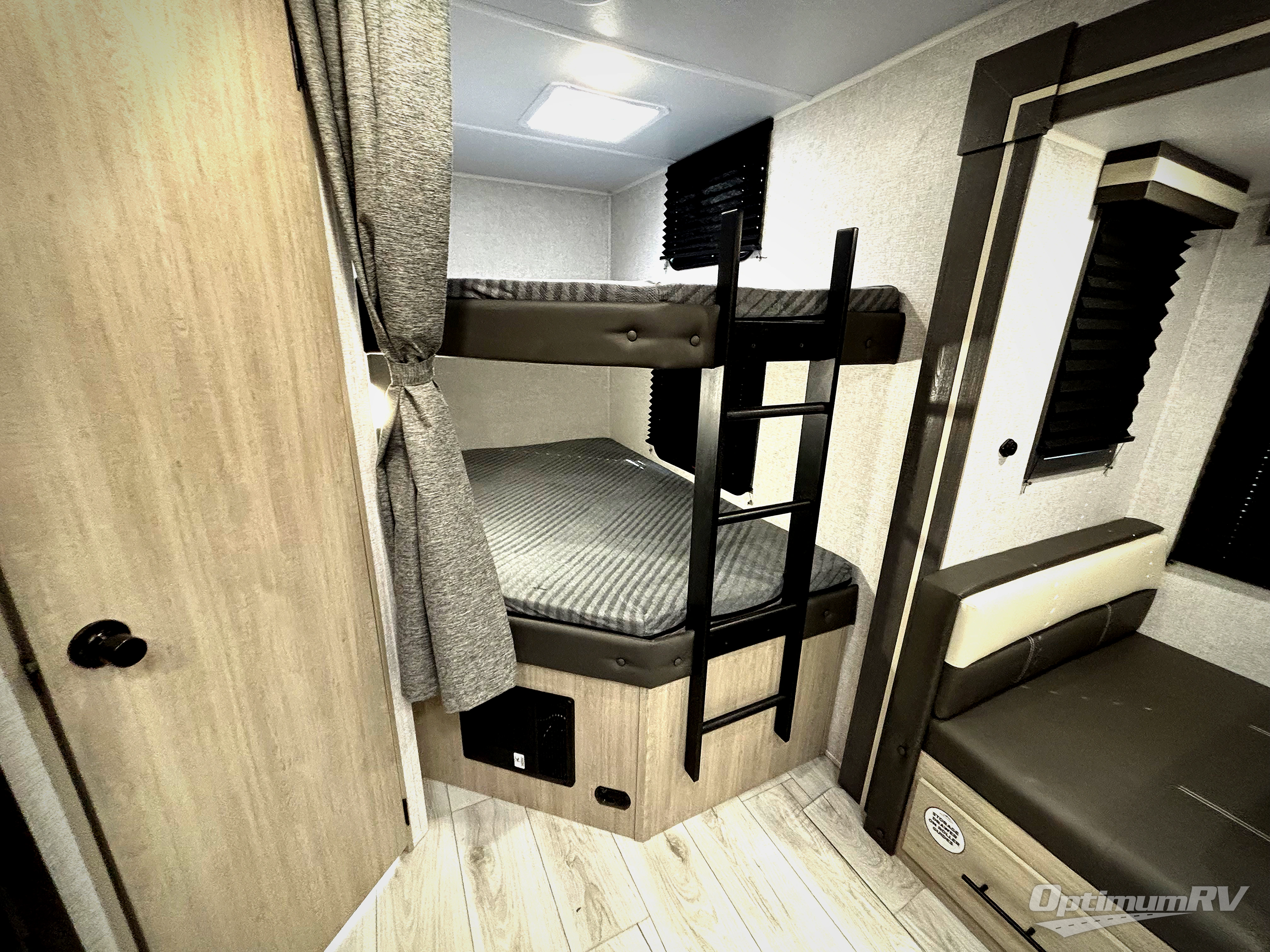 Pack your bags and hitch up this travel trailer for a fun family adventure! You will get a good night's rest on the front king bed in the front private bedroom, and the kids can sleep on the double bunk beds with storage. You could even transform the booth dinette with storage underneath it and the jiffy sofa which can be switched out for the optional theater seat or optional tri-fold sofa. The entertainment center has a fireplace for a cozy evening indoors and a hidden pantry behind it for all of your movie night snacks. With dual entry doors, it will be easy to enter and exit this unit especially from the rear corner bathroom which has one of the entry/exit doors to the unit. Enjoy cooking breakfast outside at the outdoor kitchen complete with a pull-out griddle and fridge!