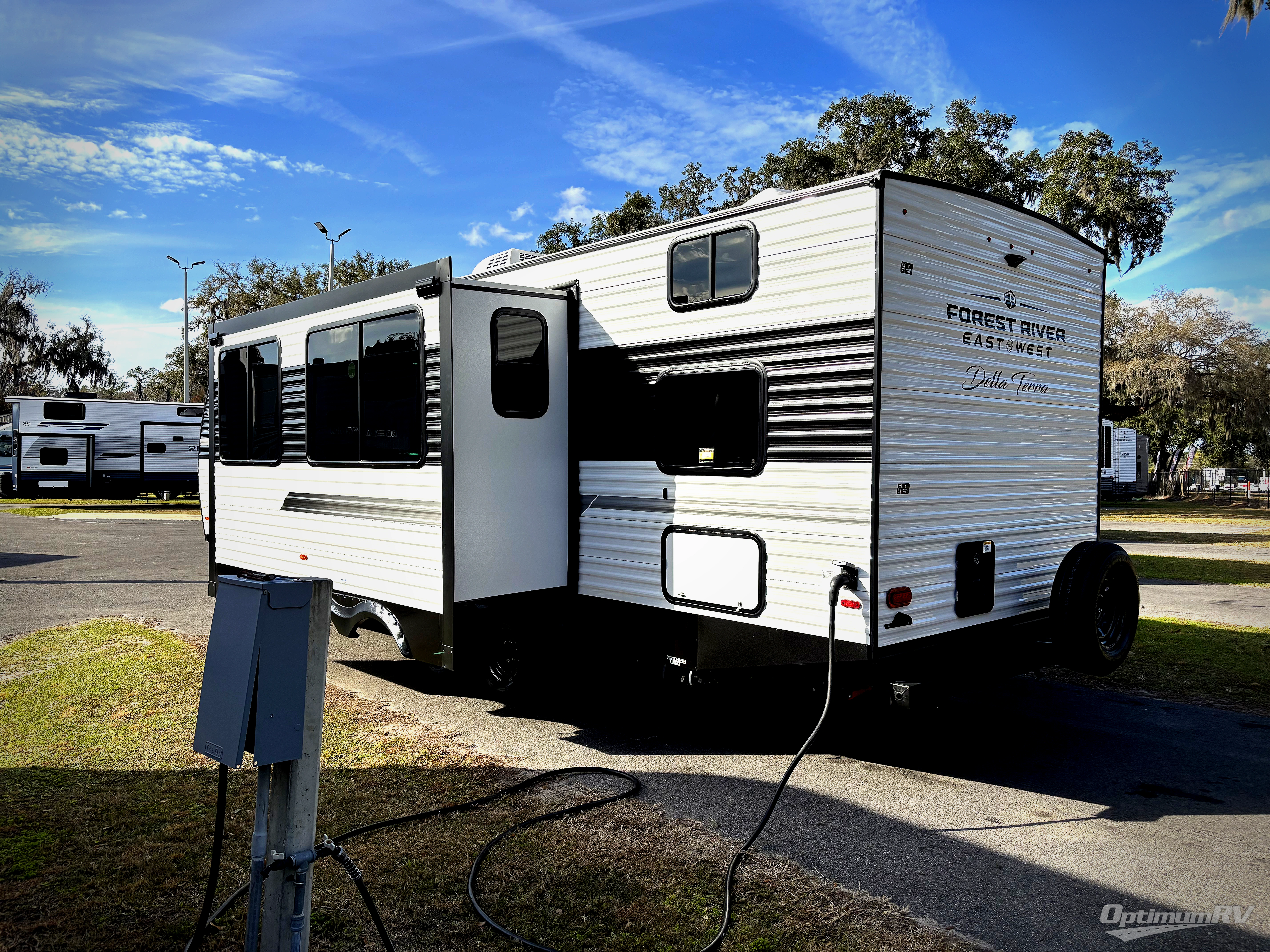 Each Della Terra travel trailer by EAST TO WEST is constructed with an enclosed and heated underbelly and enclosed holding tanks for added protection against the elements. There is also a power tongue jack with an LED light for easy set up and a power awning with LED lights you can rest under after you've unpacked. The Explore Comfort Package comes seamless pressed countertops, kitchen backsplash, window valance package with black night shades, and many more comforts. You will also appreciate the Adventure Outdoor Package with backup camera prep and solar prep, a tankless water heater, an RV grill quick disconnect, and a universal docking station with battery disconnect.