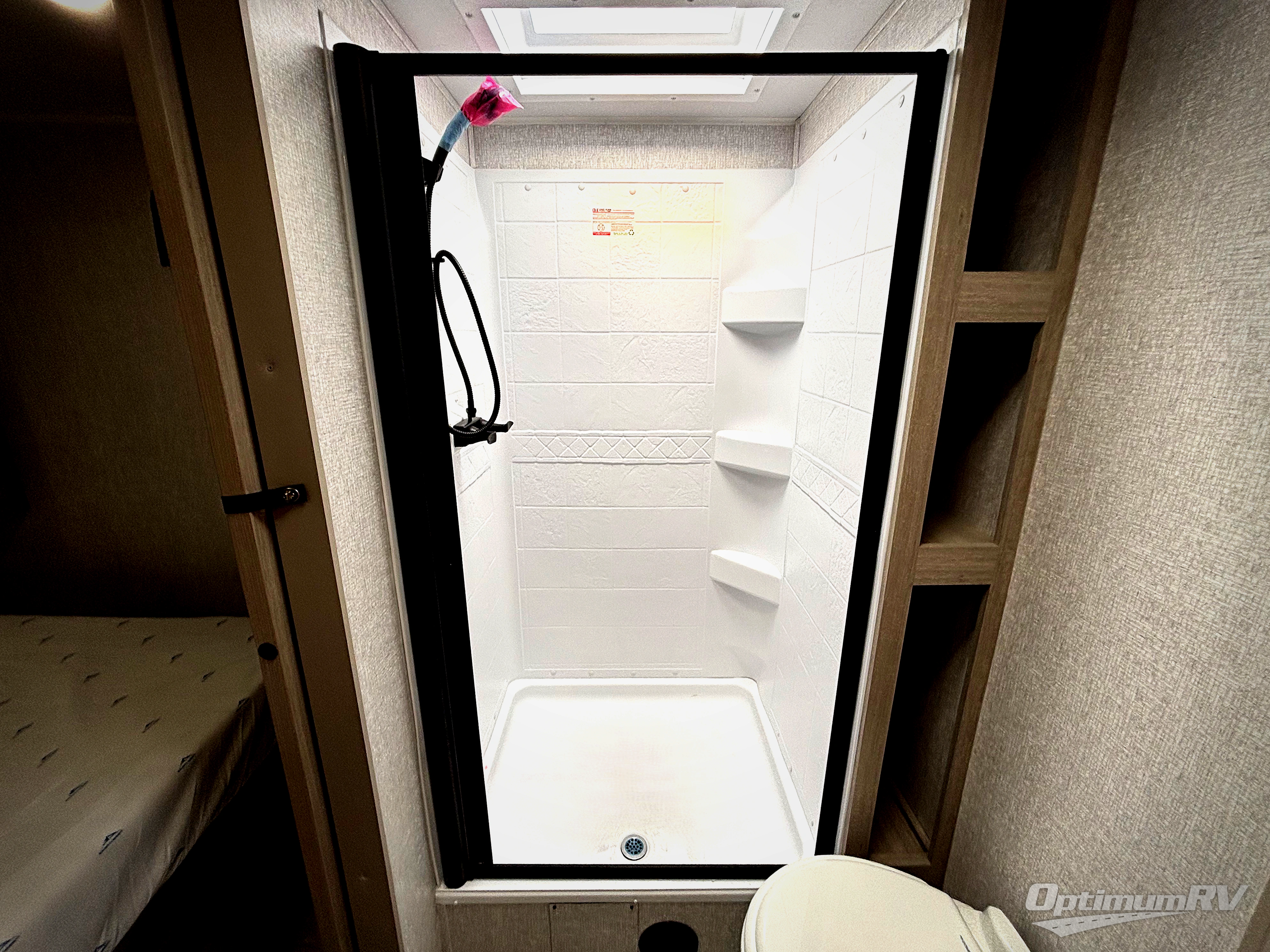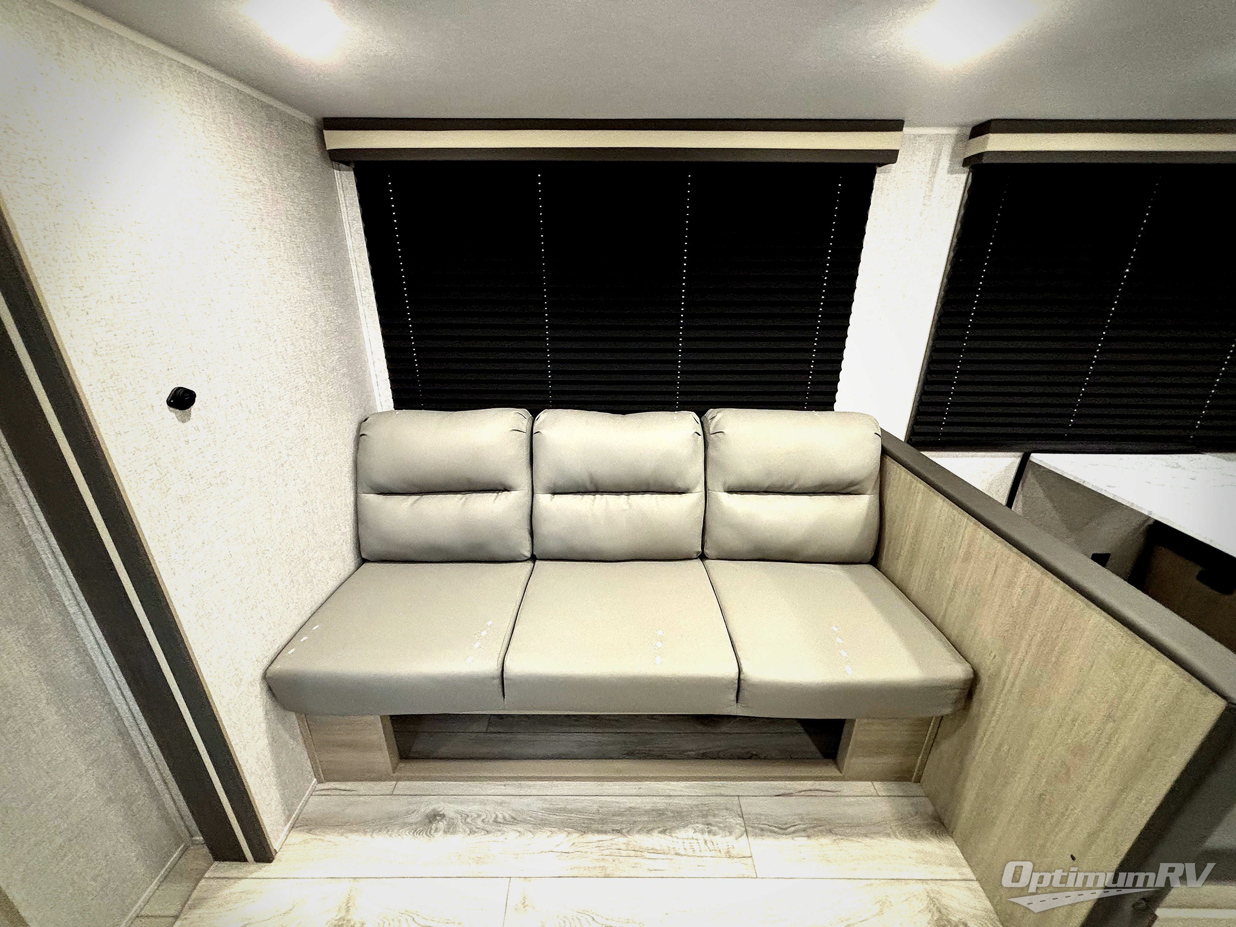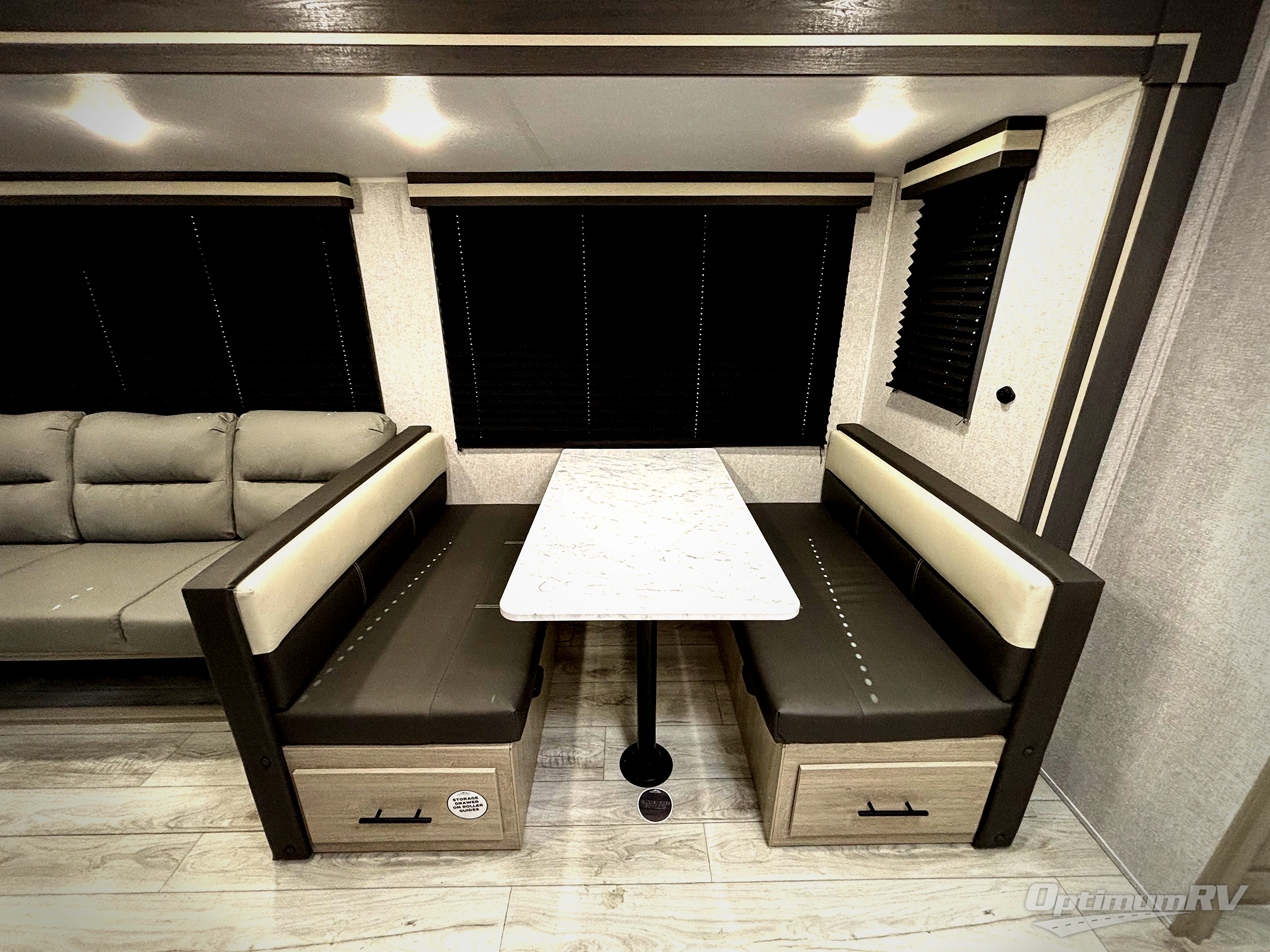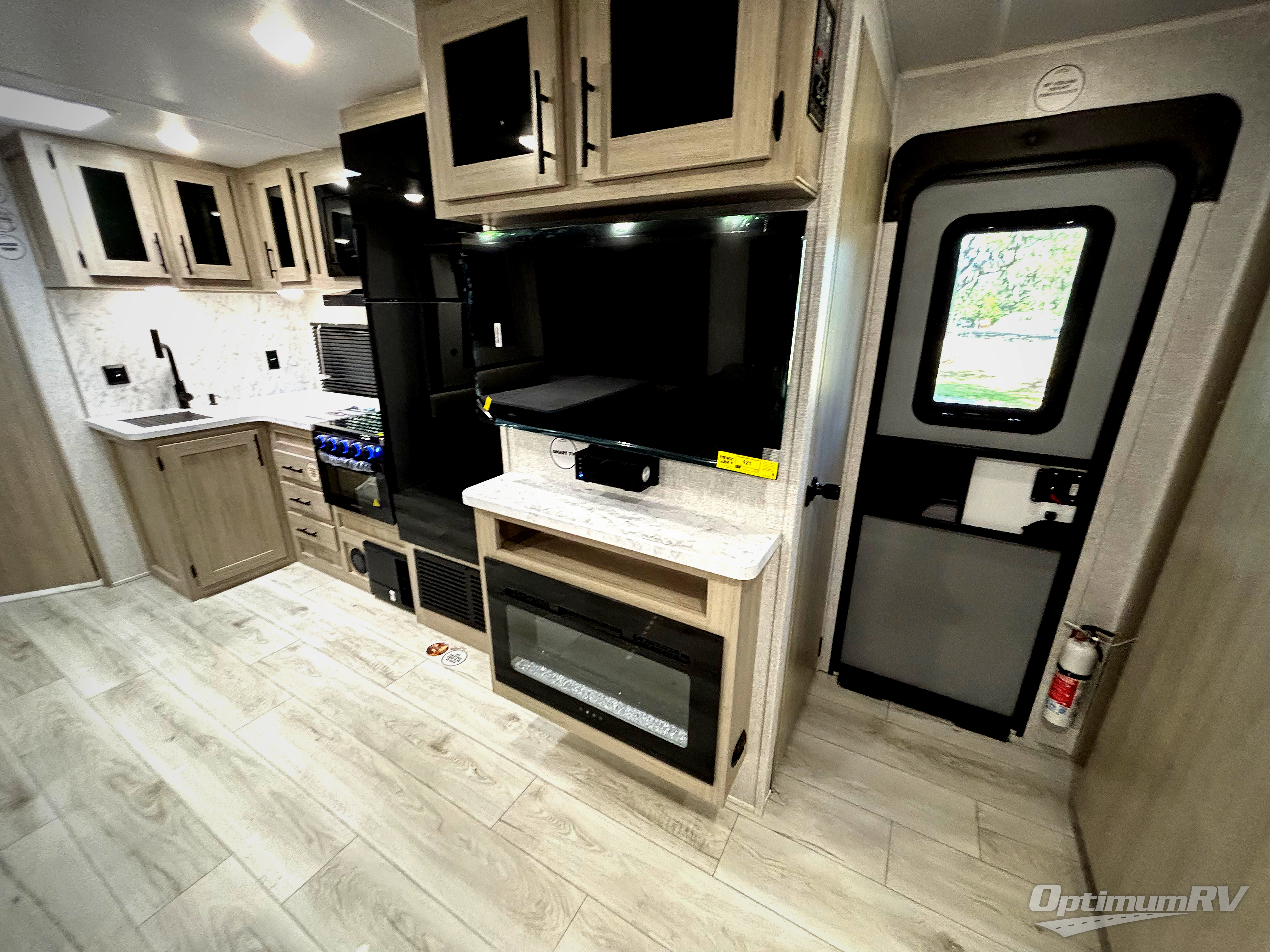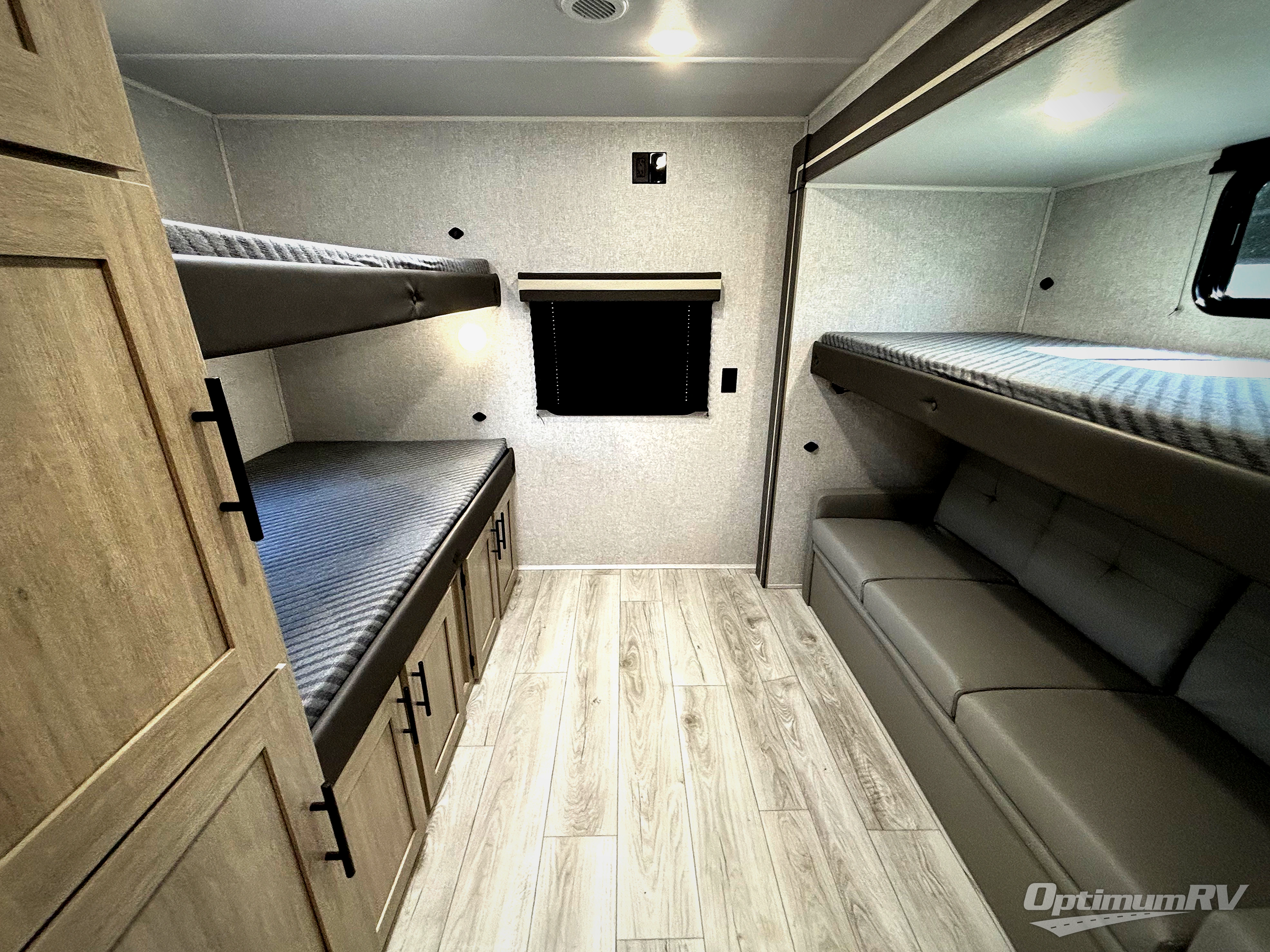 Head to the RV park for a long-weekend or week-long break from your everyday routine with this trailer at your favorite campsite. After setting up the two slide outs and the 15' power awning, you can relax inside on the jack knife sofa, dine at the oversized booth dinette or whip up a meal in the L-shaped kitchen. Everyone will enjoy the fireplace no matter what you are doing. The walk-through bathroom is super convenient, and the front bedroom allows you to live like royalty in privacy. The rear bunkhouse also offers privacy and includes three bunk beds and a sofa, plus storage. Your kids or guests will love having their own room. And the exterior offers an optional outdoor kitchen, an oversized pass-through storage for your larger gear like fishing poles, outdoor tables and bags of charcoal, plus there are two spray ports to easily rinse off dirty bikes, shoes and such.